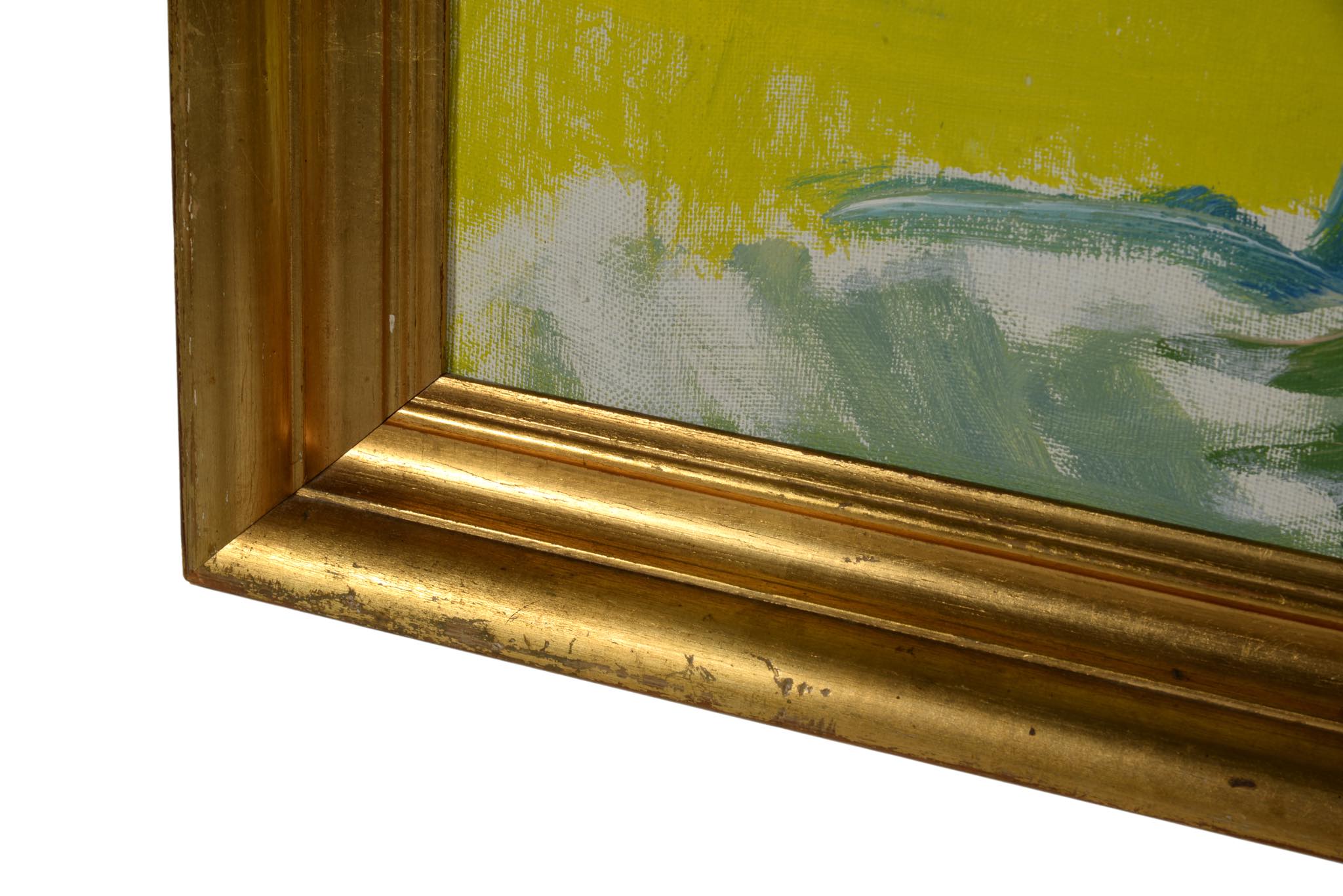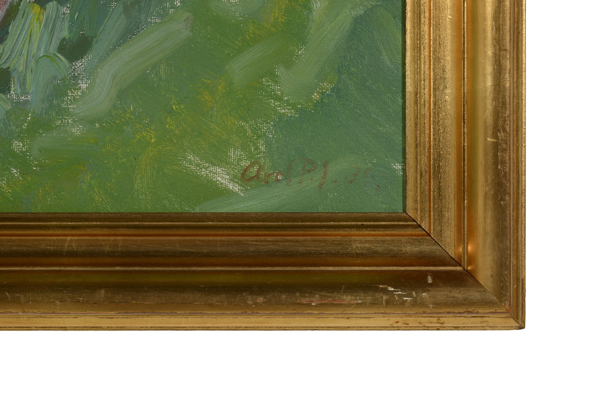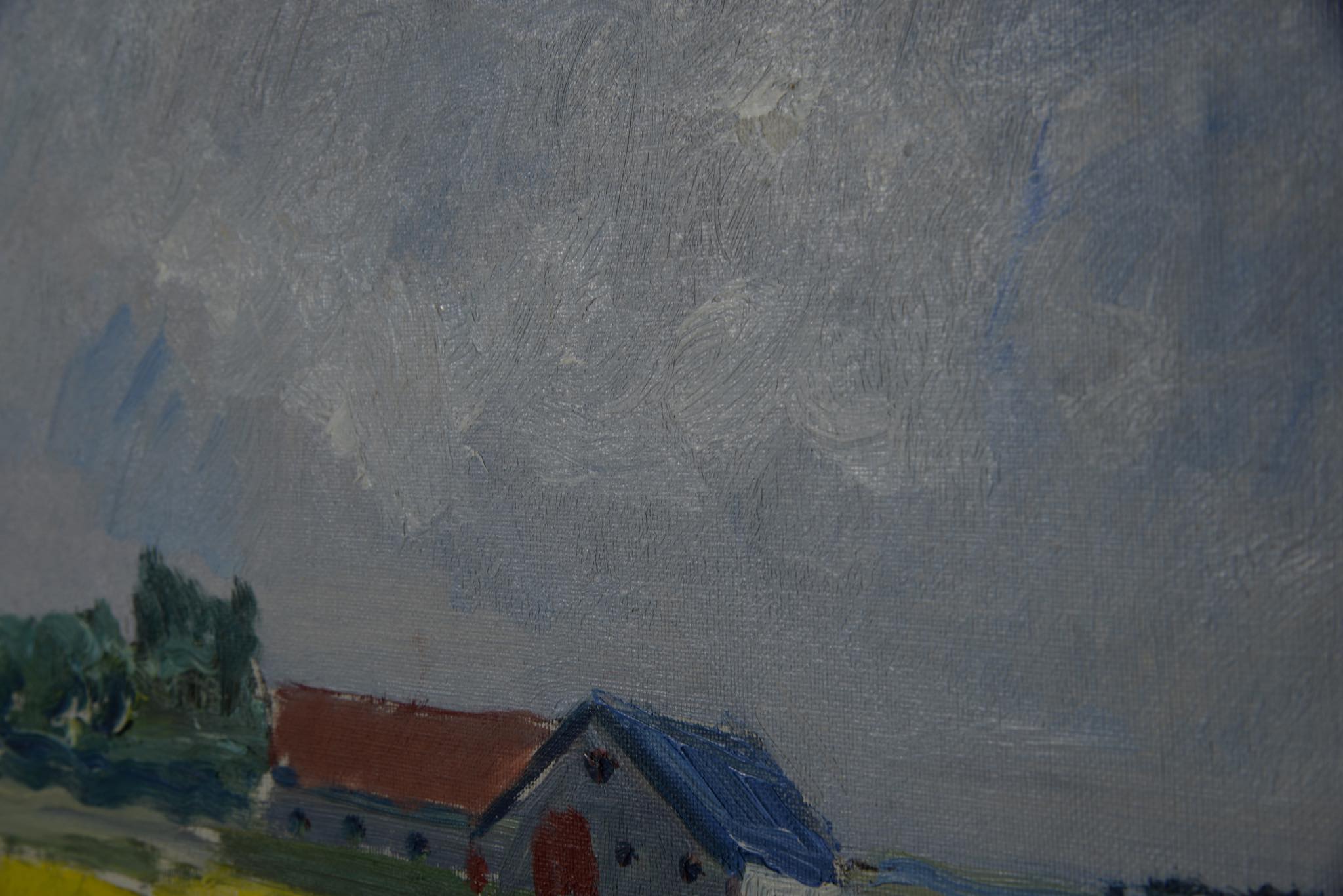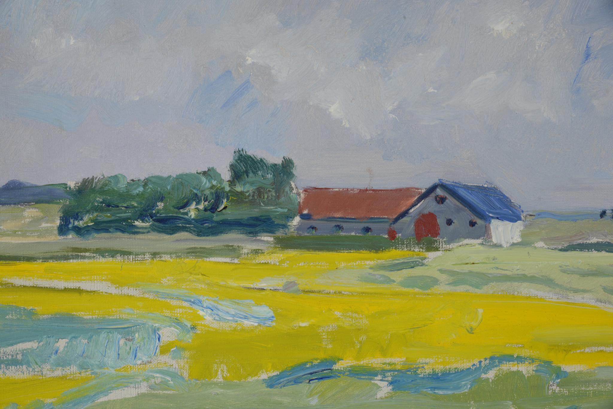 デンマークの画家、Axel Peder. Jensen/アクセル・P・イェンセンによる風景画、1938年に描かれた作品で、菜の花の咲き乱れる春の平野が描かれています。フレームはオリジナルのようで、小傷等含め古さは感じますが鑑賞の妨げにはならない程度です。
