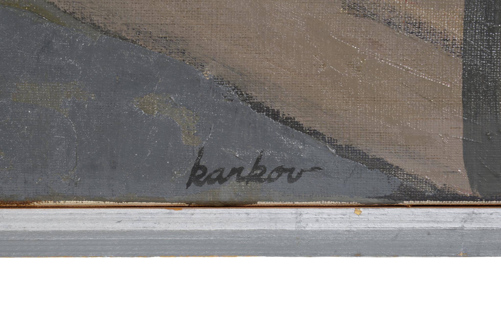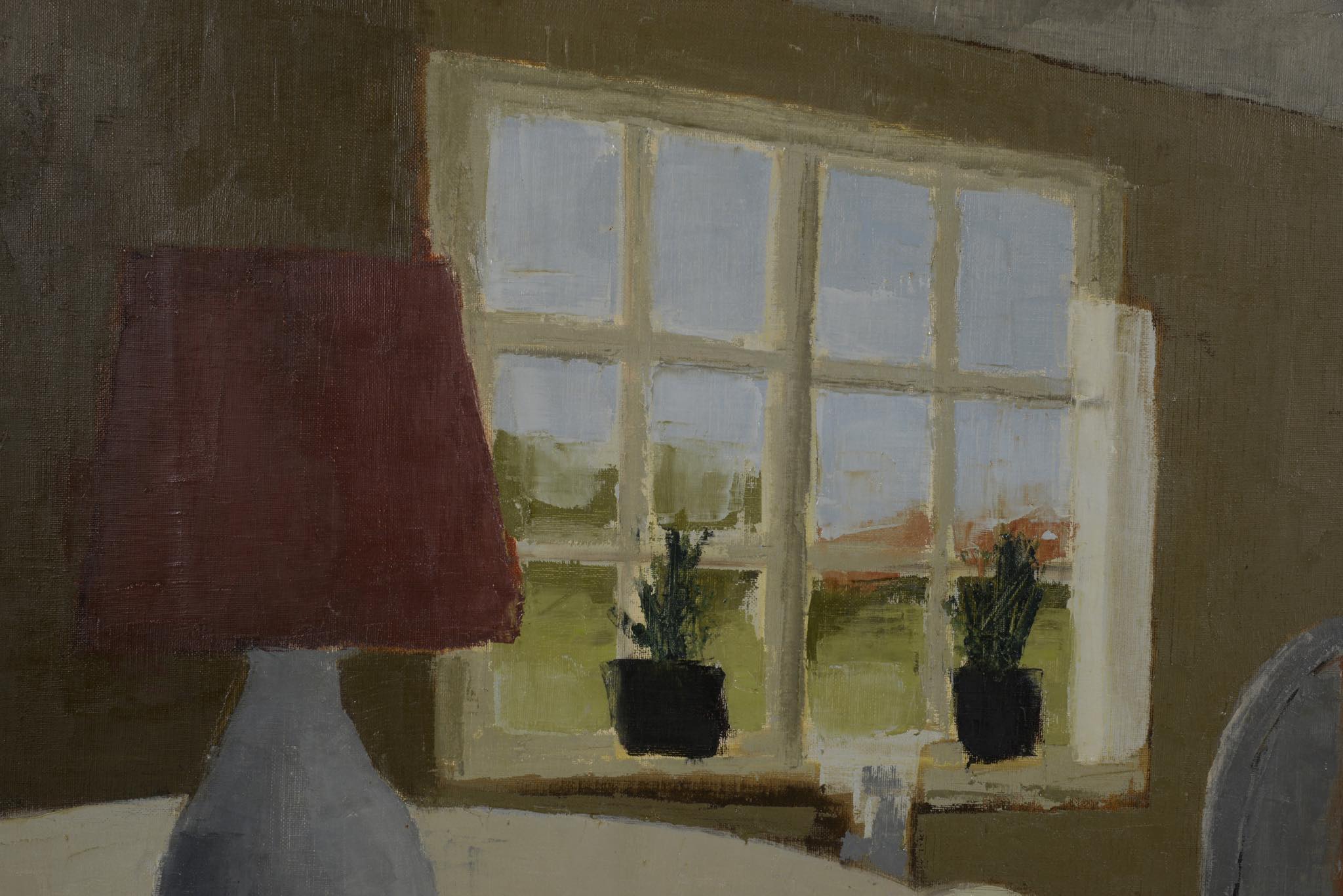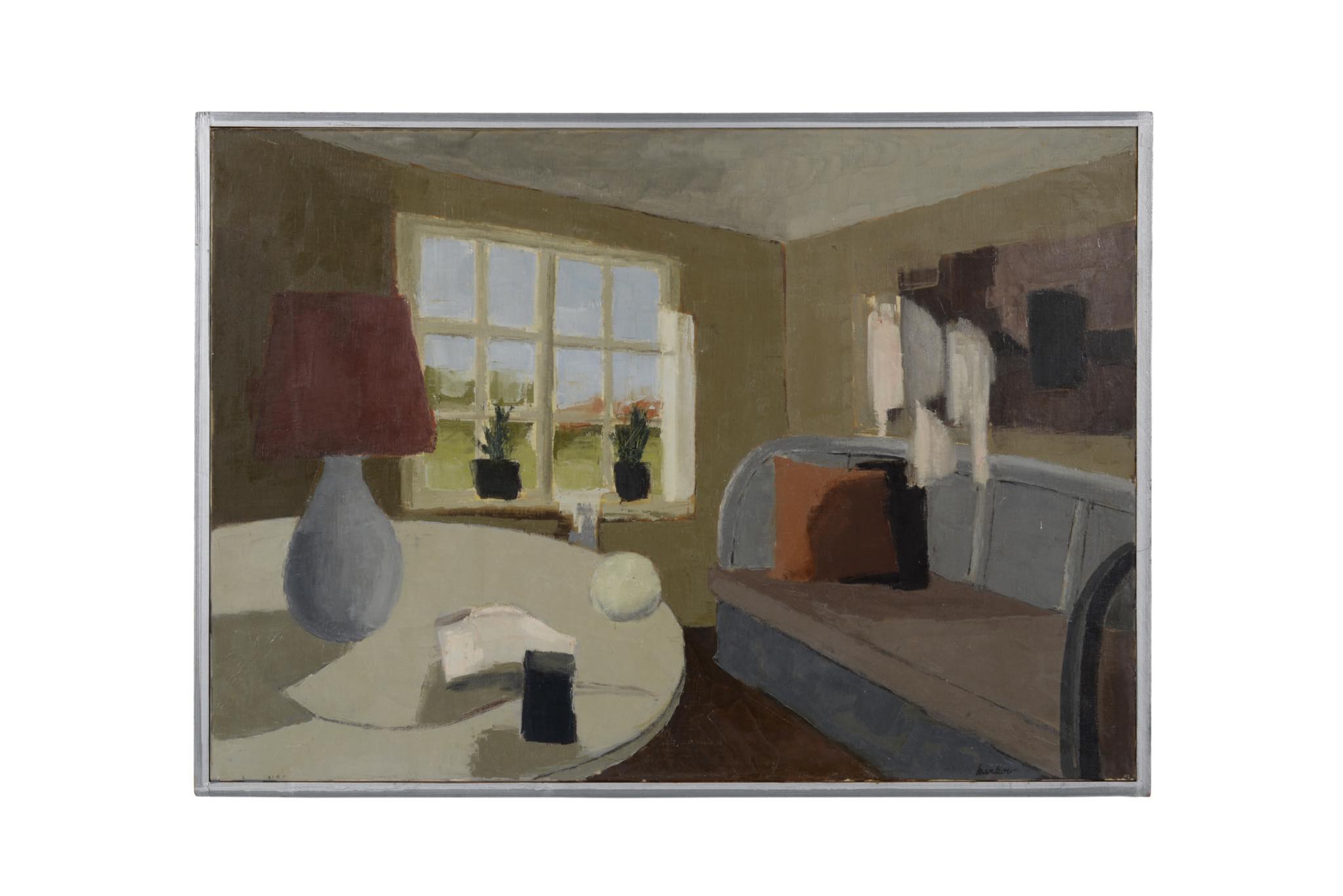 1919年生まれのデンマークの画家、Jens Christian Karkov/イェンス・カアコフによる油彩作品です。穏やかな好天の日の静かなリビングの様子を独自の表現で描いています。フレームもオリジナルのようで作家によるペイントと思われます。画面に当り傷がわずかに見られますがキャンバスの張りも良く綺麗な状態です。