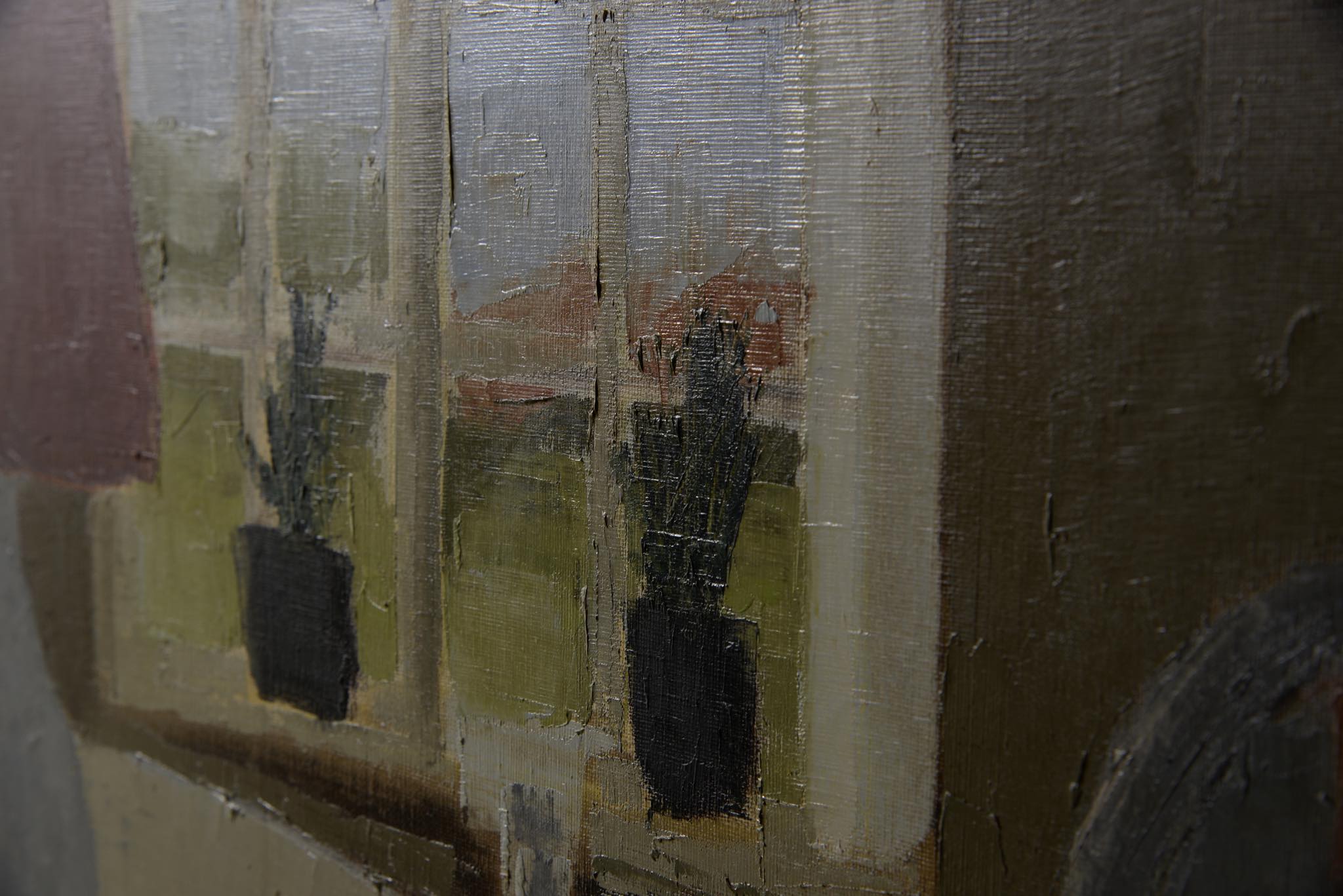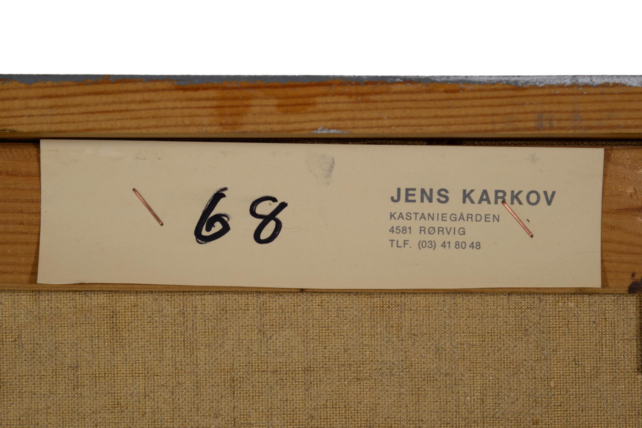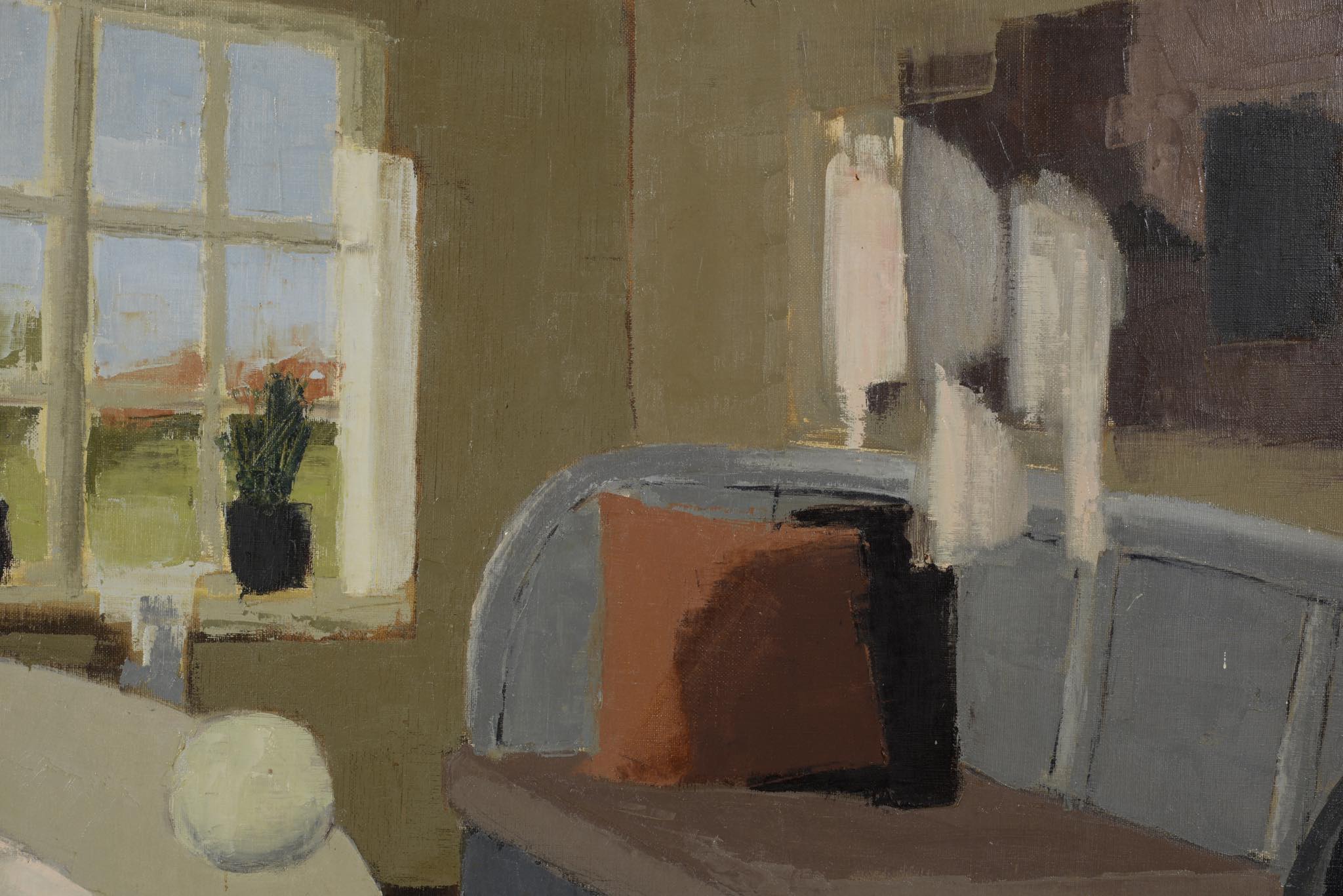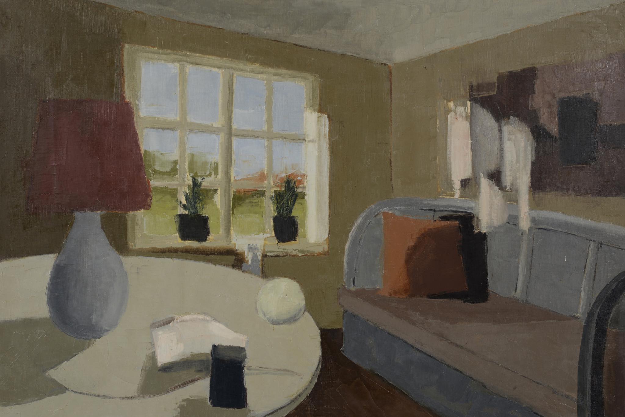 1919年生まれのデンマークの画家、Jens Christian Karkov/イェンス・カアコフによる油彩作品です。穏やかな好天の日の静かなリビングの様子を独自の表現で描いています。フレームもオリジナルのようで作家によるペイントと思われます。画面に当り傷がわずかに見られますがキャンバスの張りも良く綺麗な状態です。