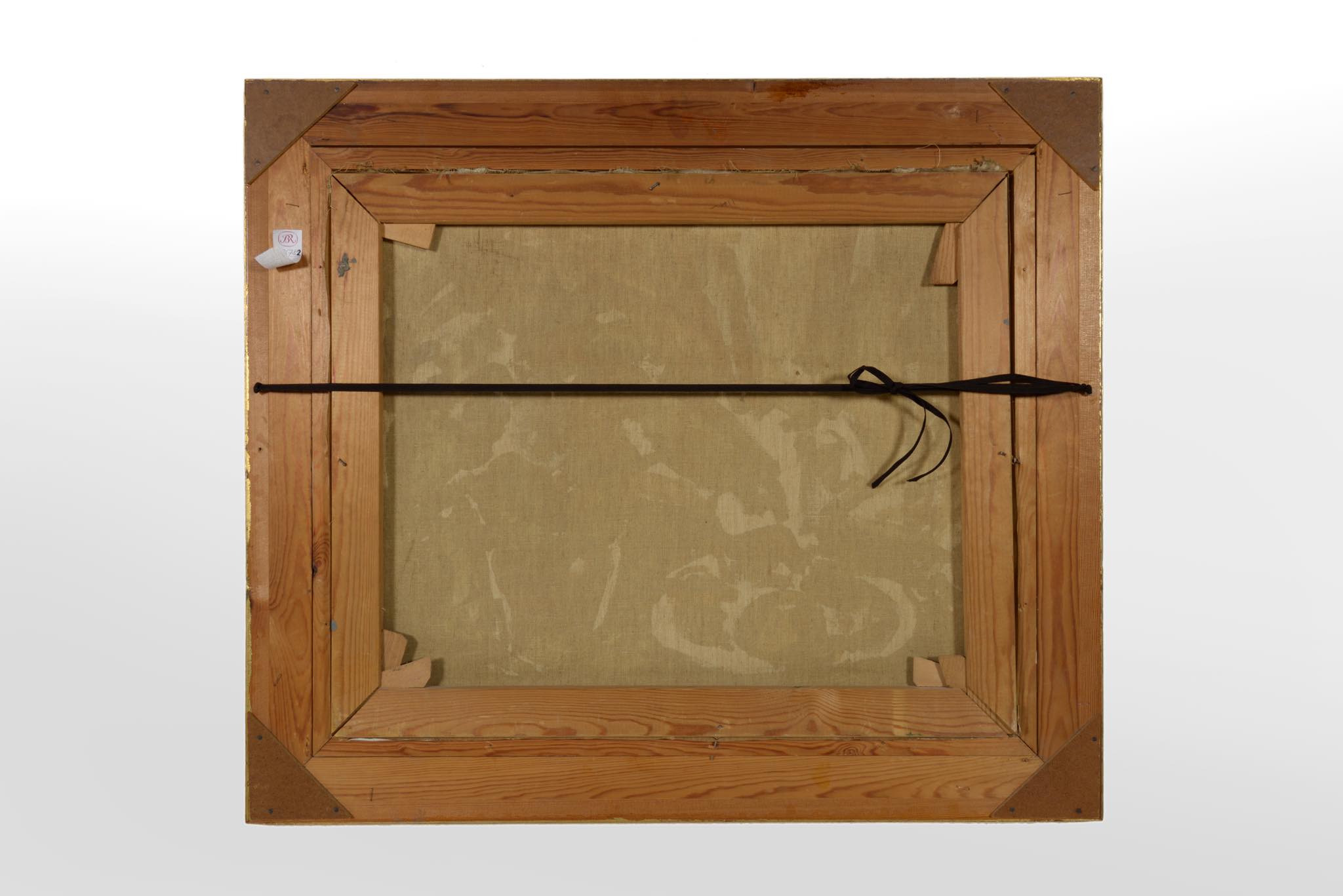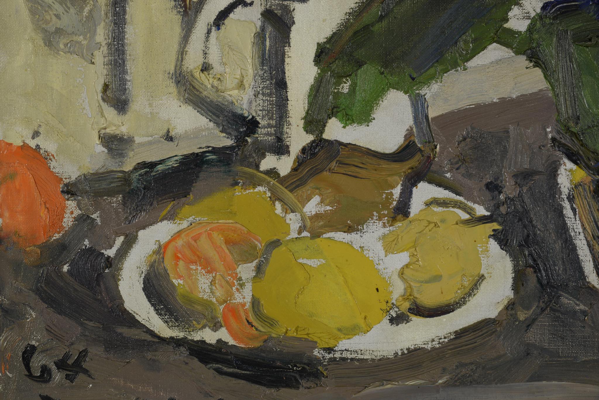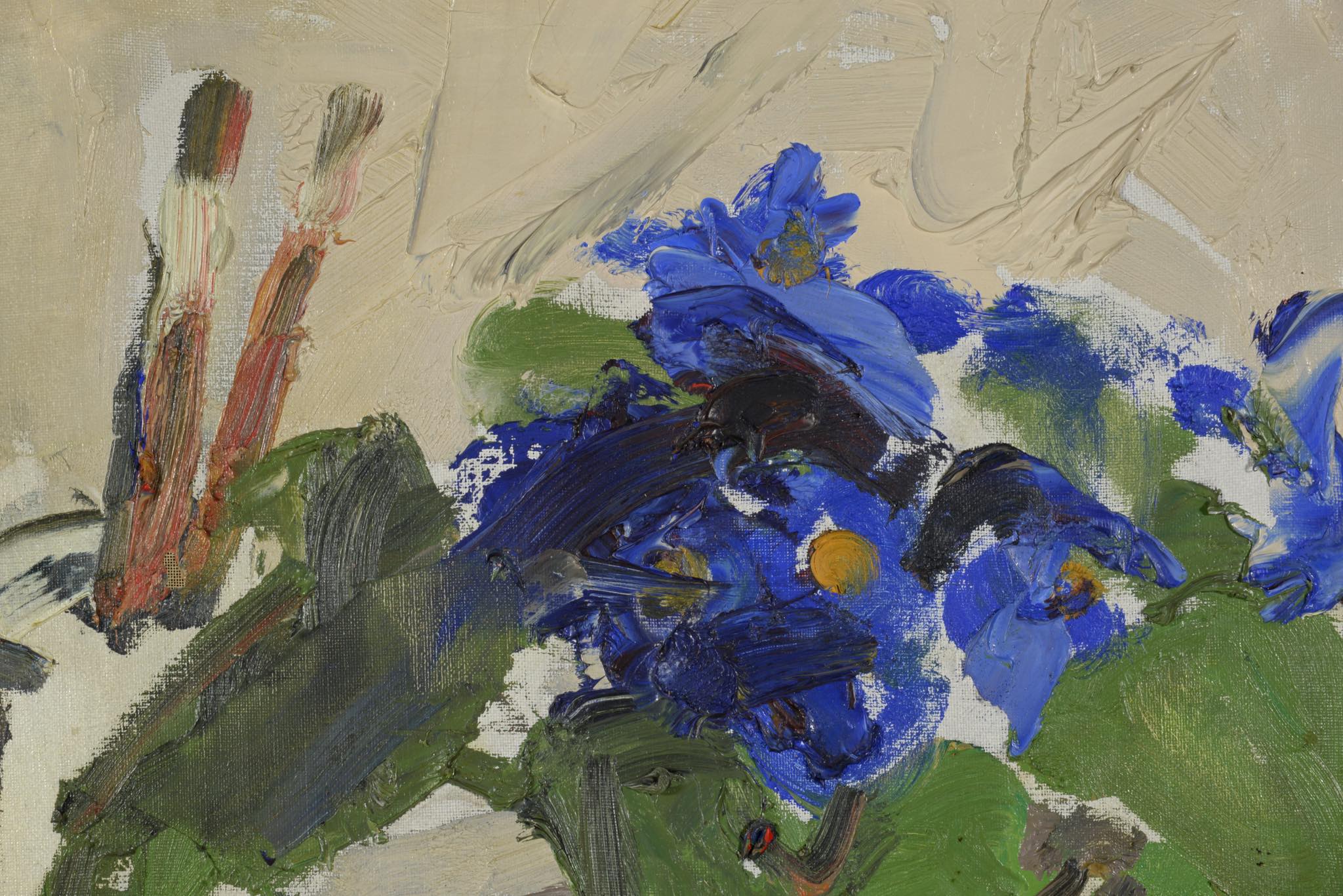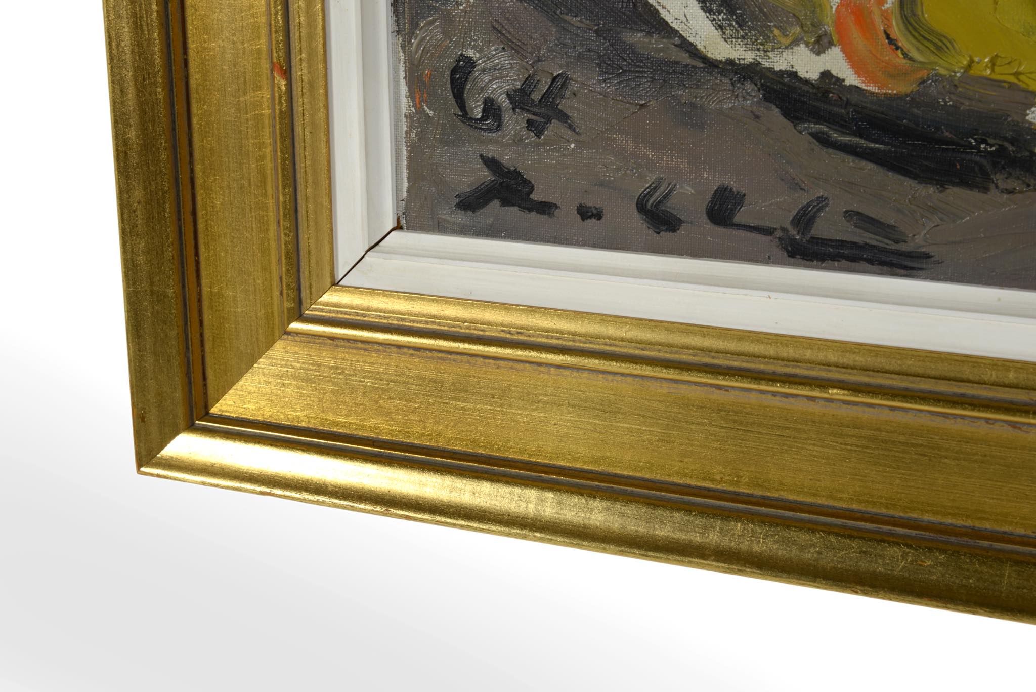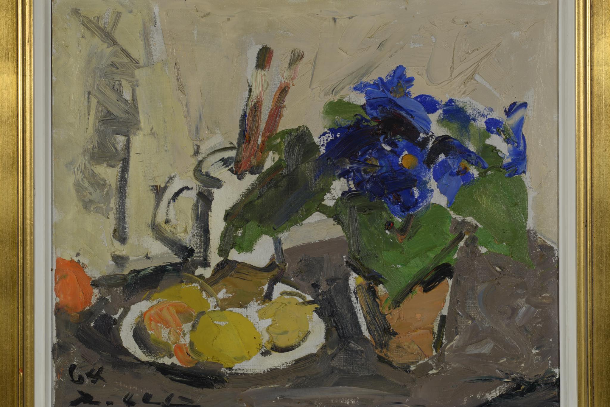 デンマークの画家、Børge Bokkenheuser/ボーエ・ボッケンホイザーによる静物画作品です。自身の部屋でしょうか。”ボリジ”と思われる卓上の花、果物、そしてピッチャーに投げ込まれた絵筆が描かれています。木製金箔のフレームはオリジナルのようです。