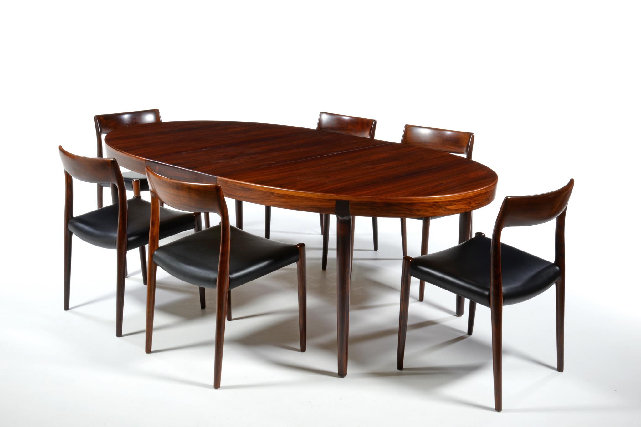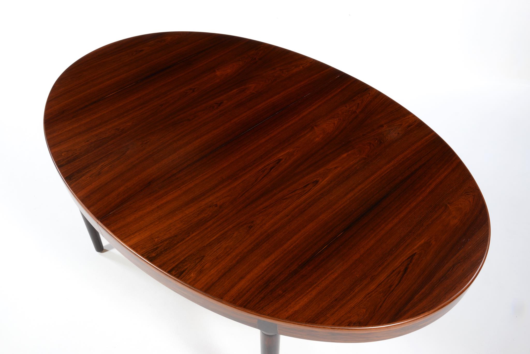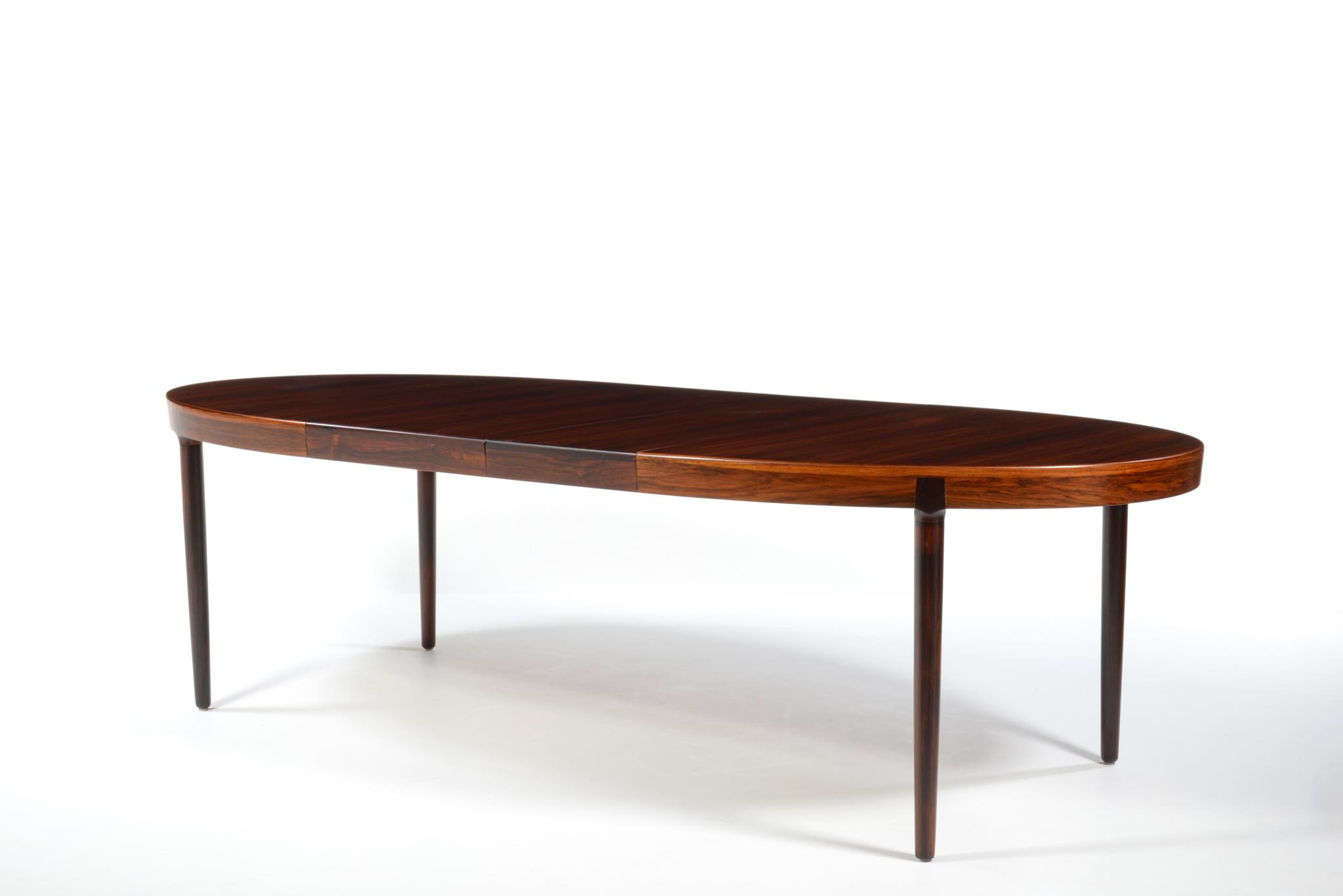 デンマークのデザイナー、Harry Østergaard/ハリー・オスタゴーによるダイニングテーブルです。1960年代頃に作られたものでしょう。珍しいオーバル(楕円形)のテーブルで、エクステンションリーフは2枚(2サイズ)付属し、最大で256センチまで天板を拡張することができます。