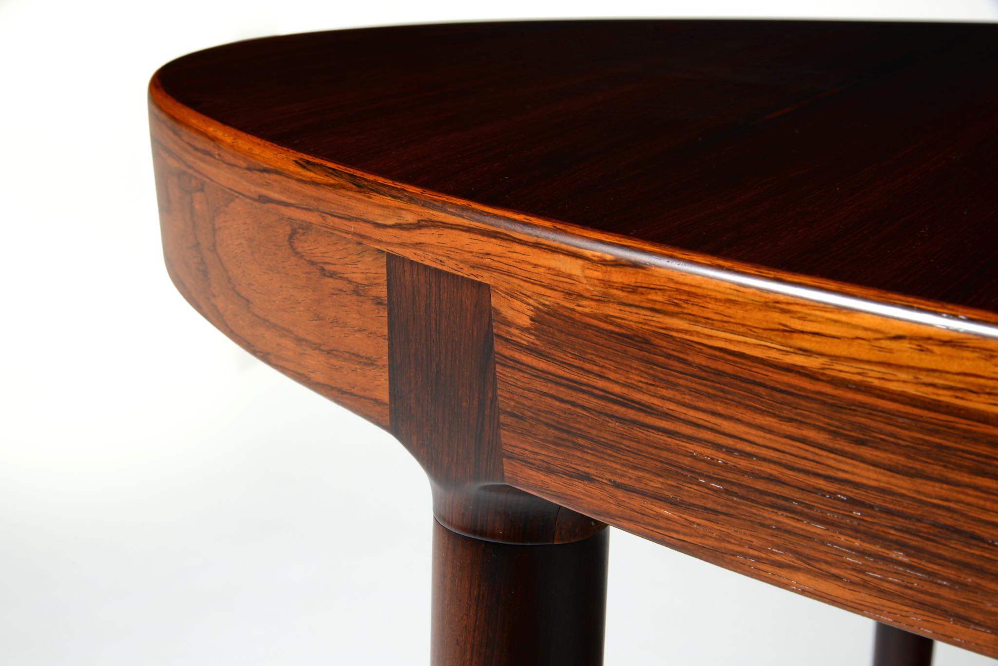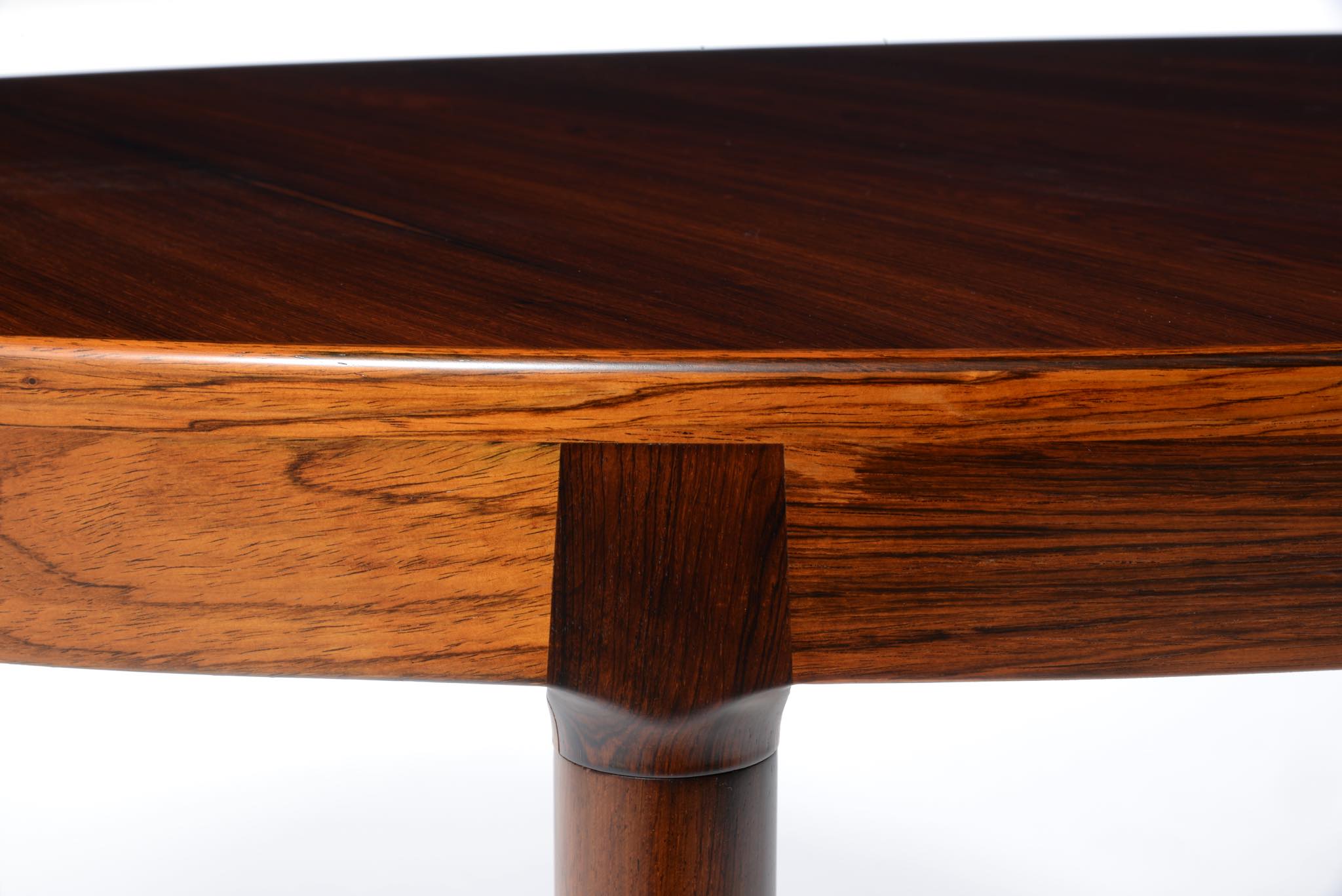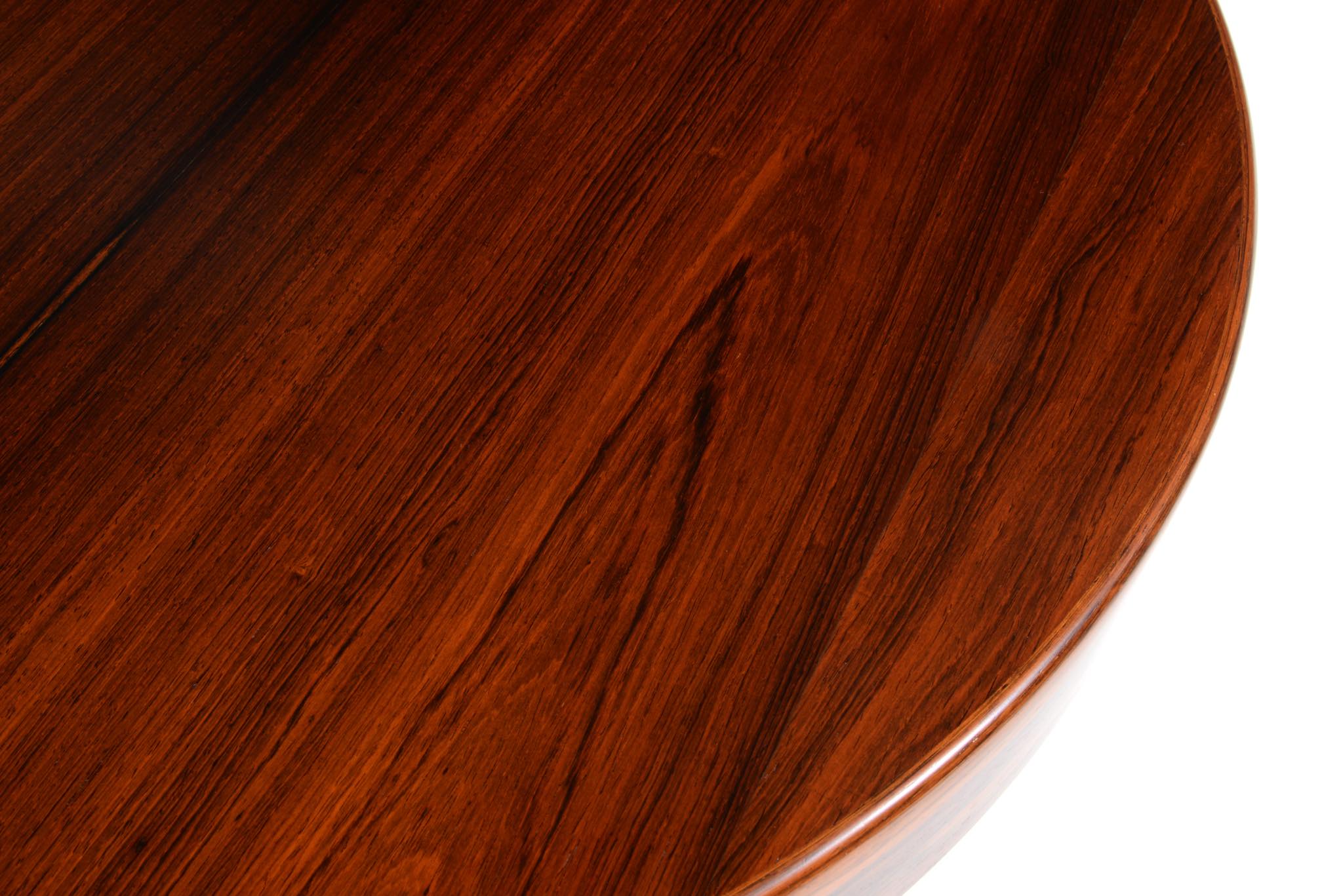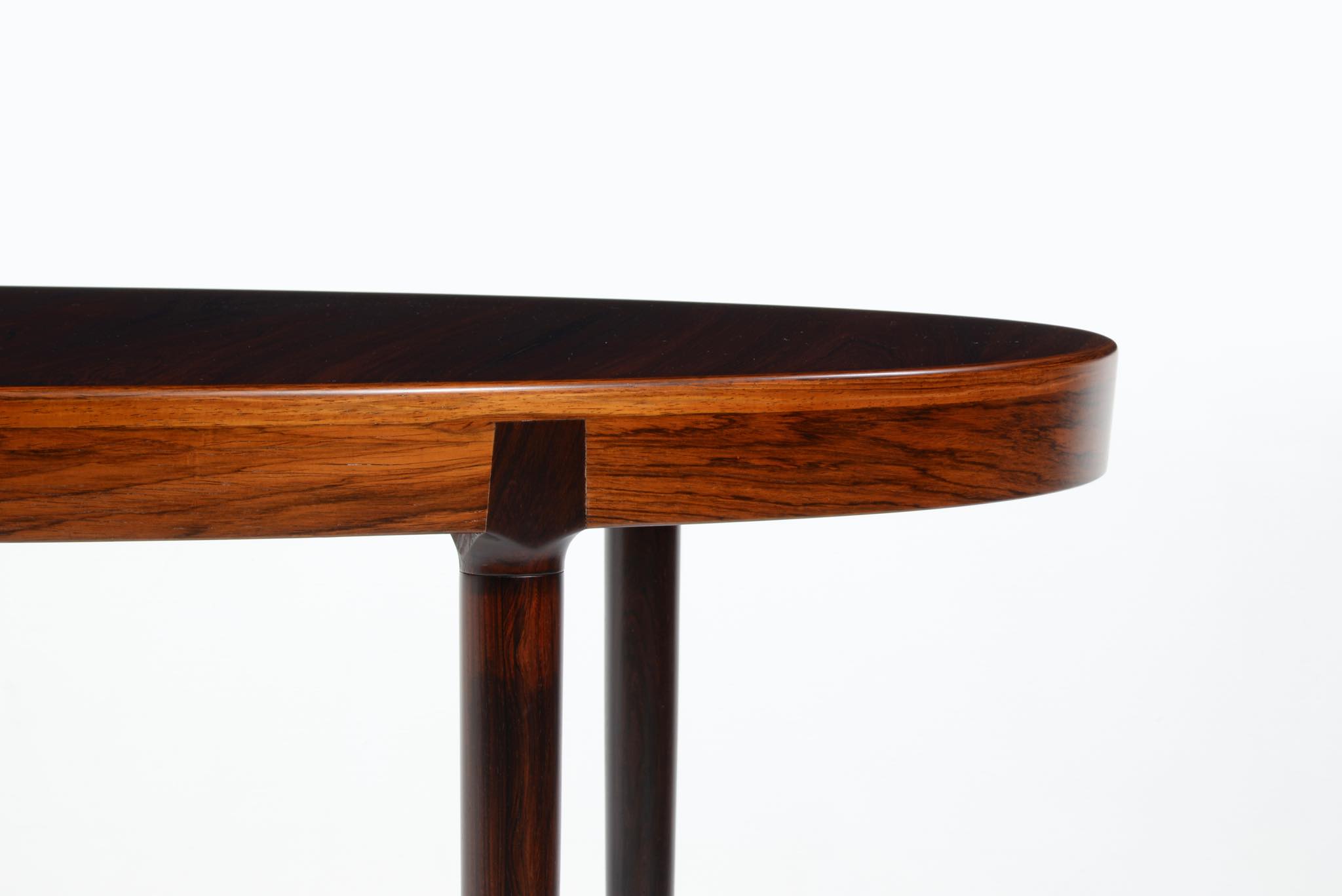 デンマークのデザイナー、Harry Østergaard/ハリー・オスタゴーによるダイニングテーブルです。1960年代頃に作られたものでしょう。珍しいオーバル(楕円形)のテーブルで、エクステンションリーフは2枚(2サイズ)付属し、最大で256センチまで天板を拡張することができます。