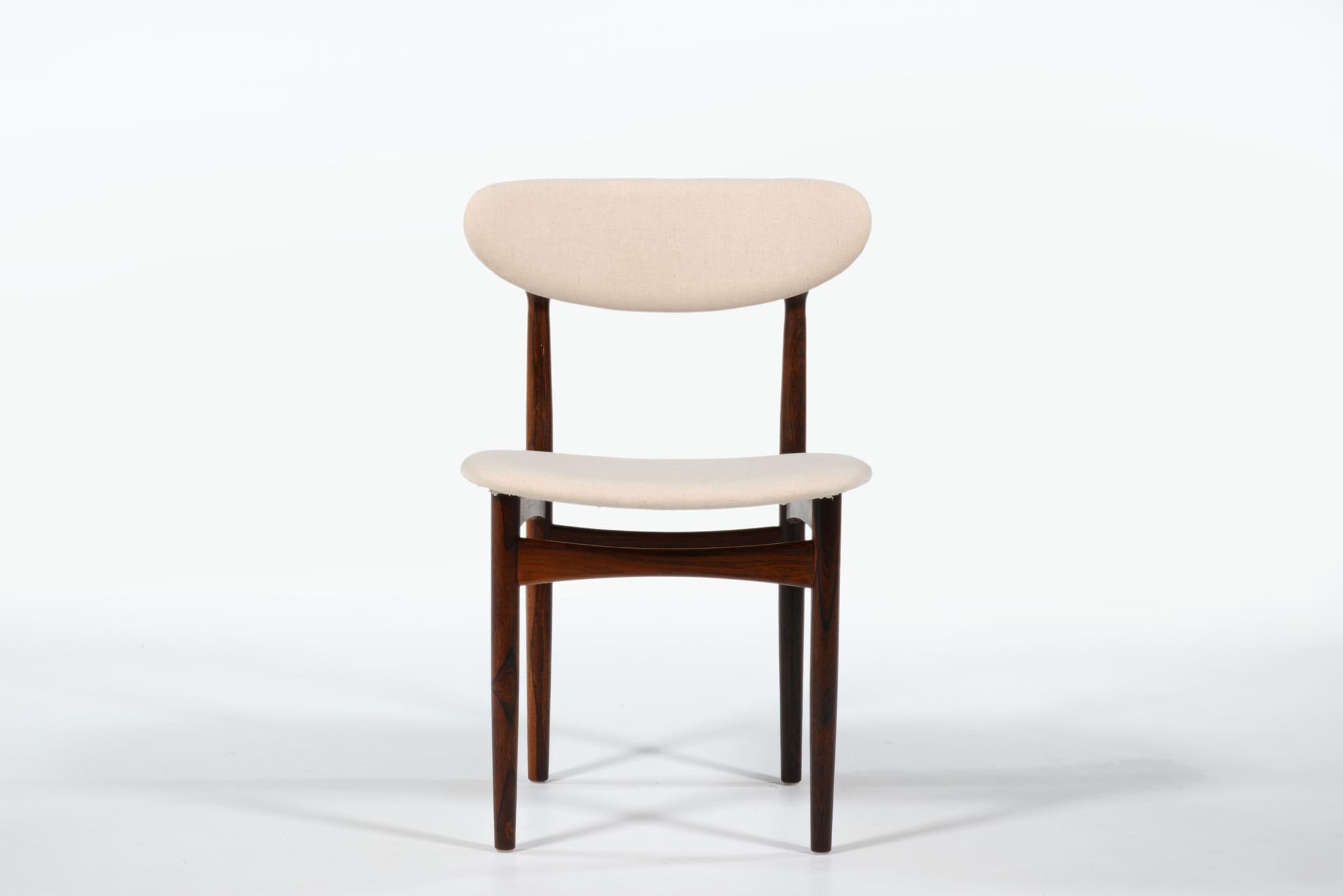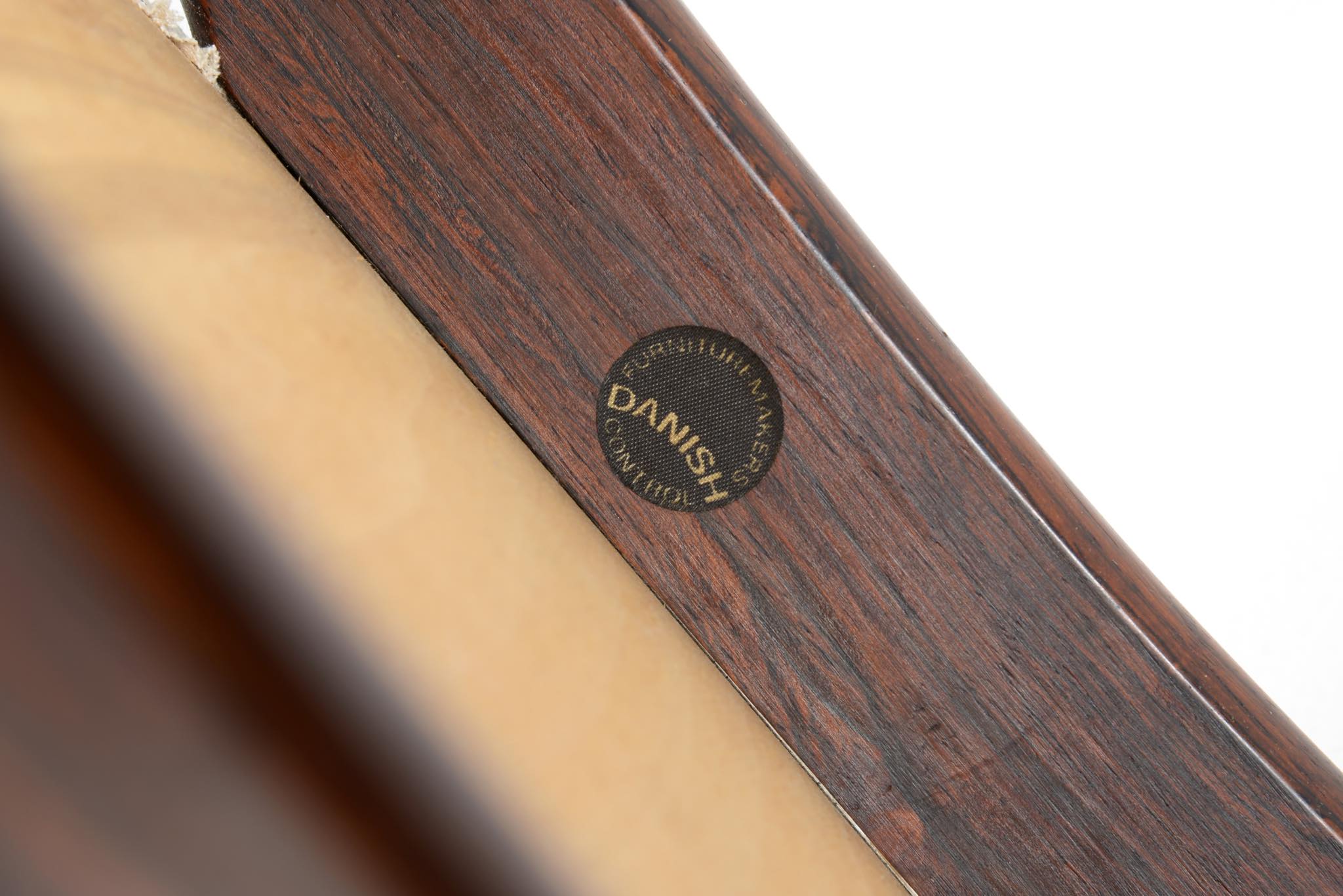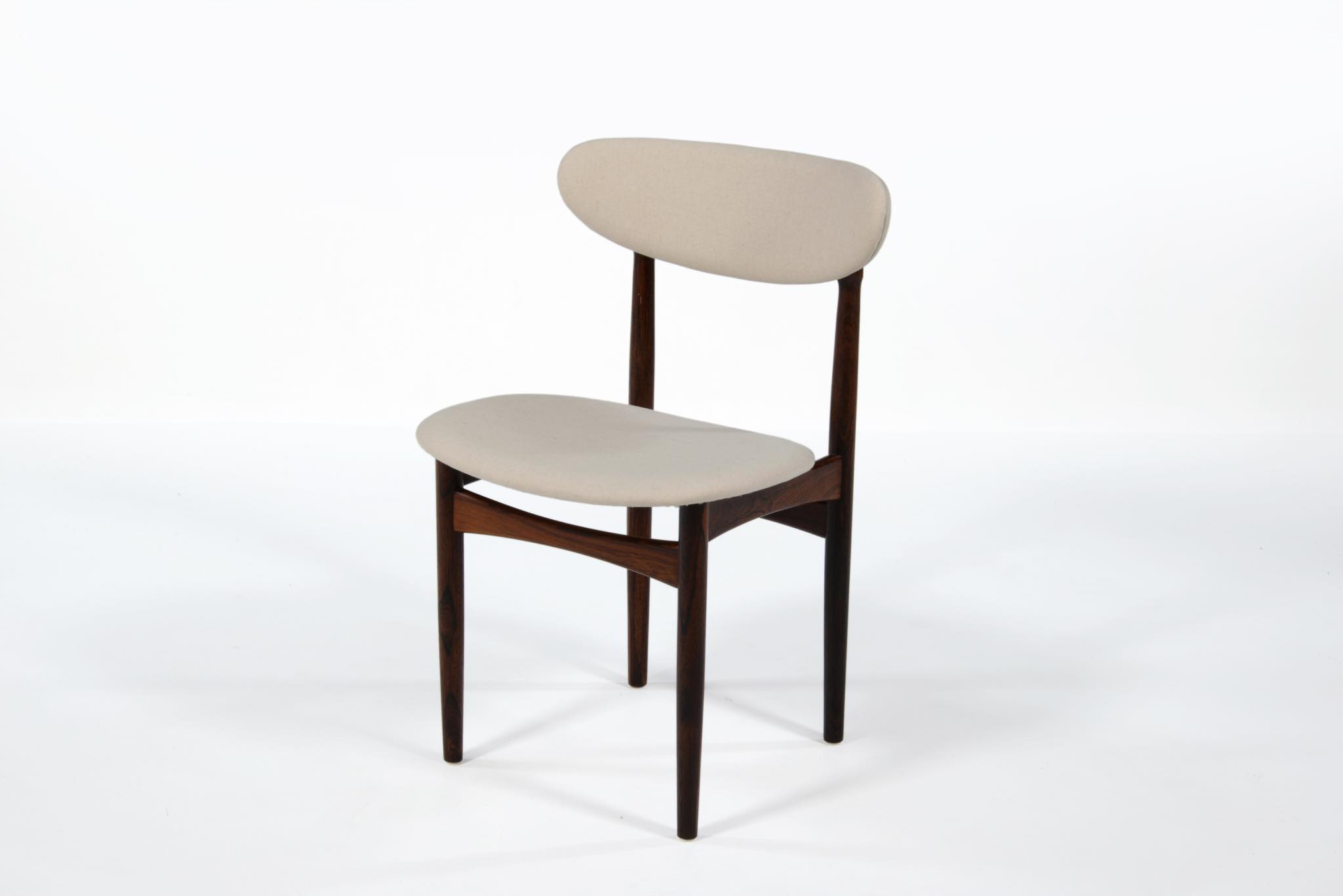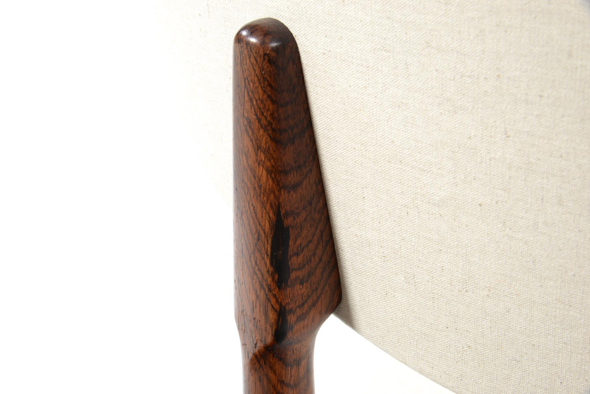 デザイナーやメーカーなど判っておりませんが、デンマークの家具工房で作られたダイニングチェアで、”Danish Furniture Makers Quality Control” (デンマークの家具組合発行による品質保証のスタンプ) が記されています。1960年代頃に作られたものでしょう。良質なローズウッド材が用いられており、座りやすく、背あたりの良い張り包みの笠木が特徴の椅子です。ファブリックは現在仮張りの状態ですので、お好きな生地や皮革をお選び頂けます。