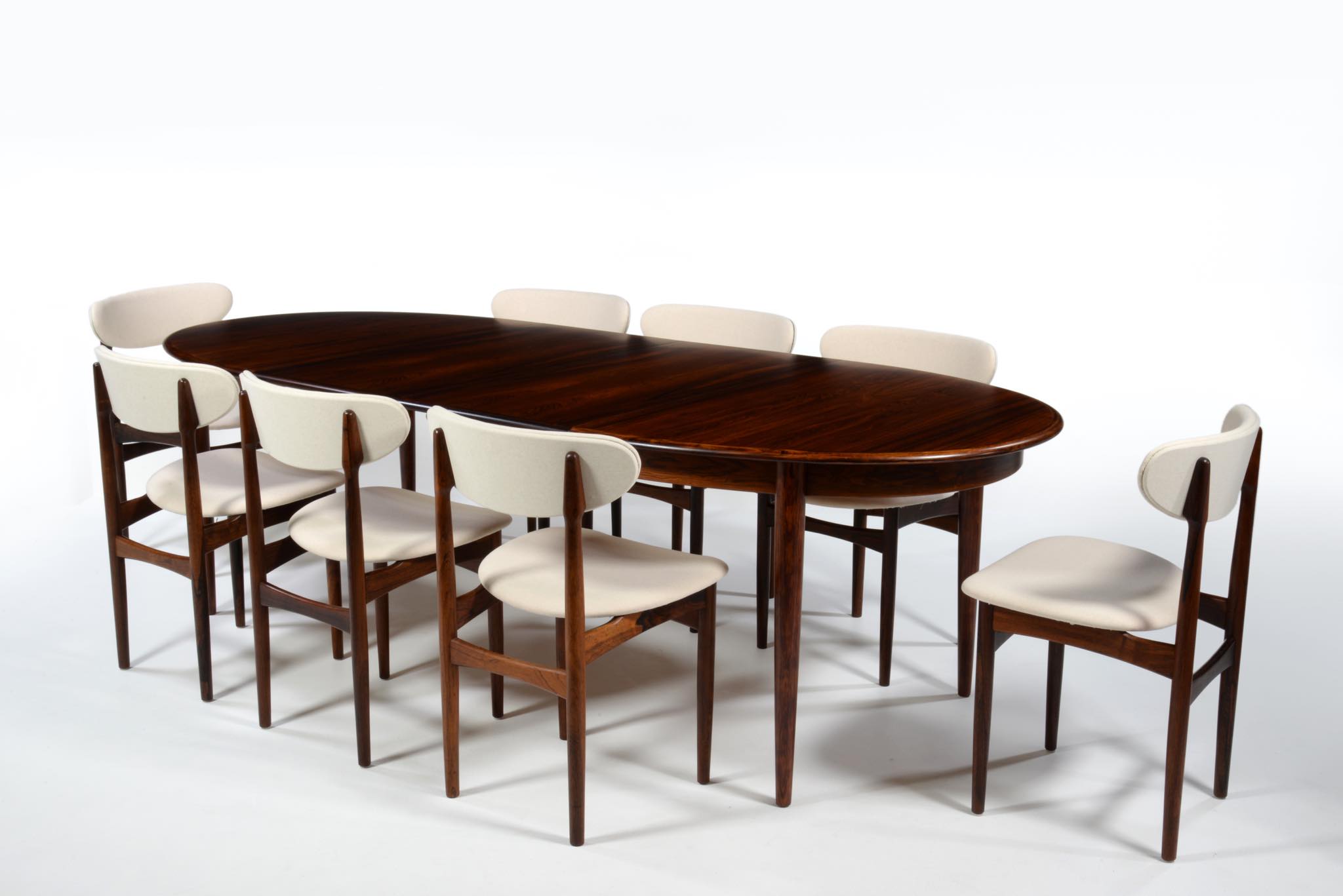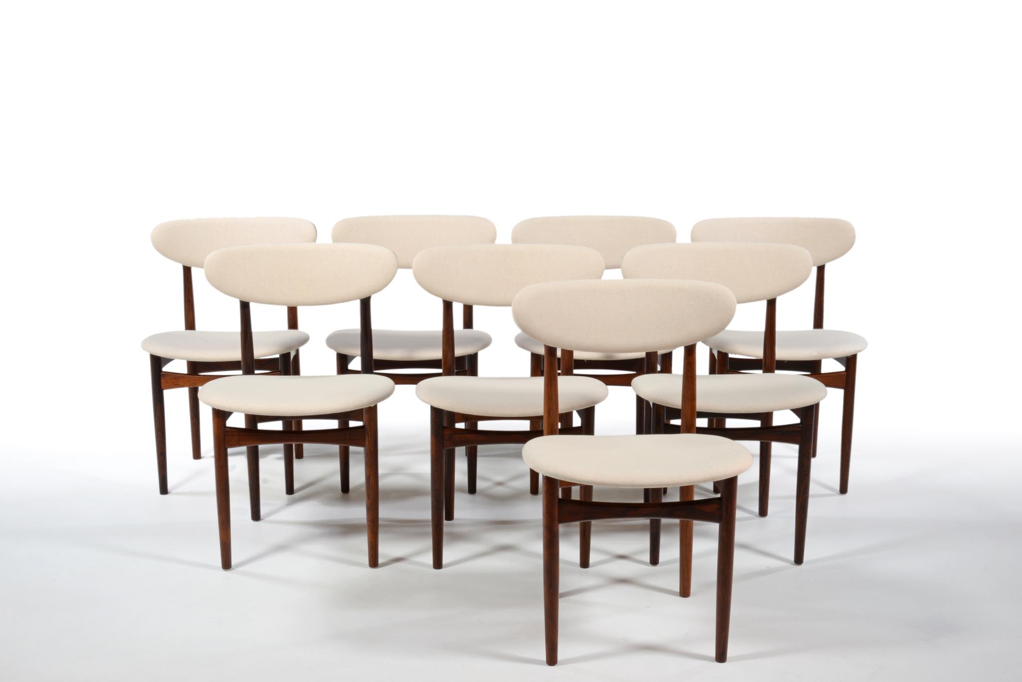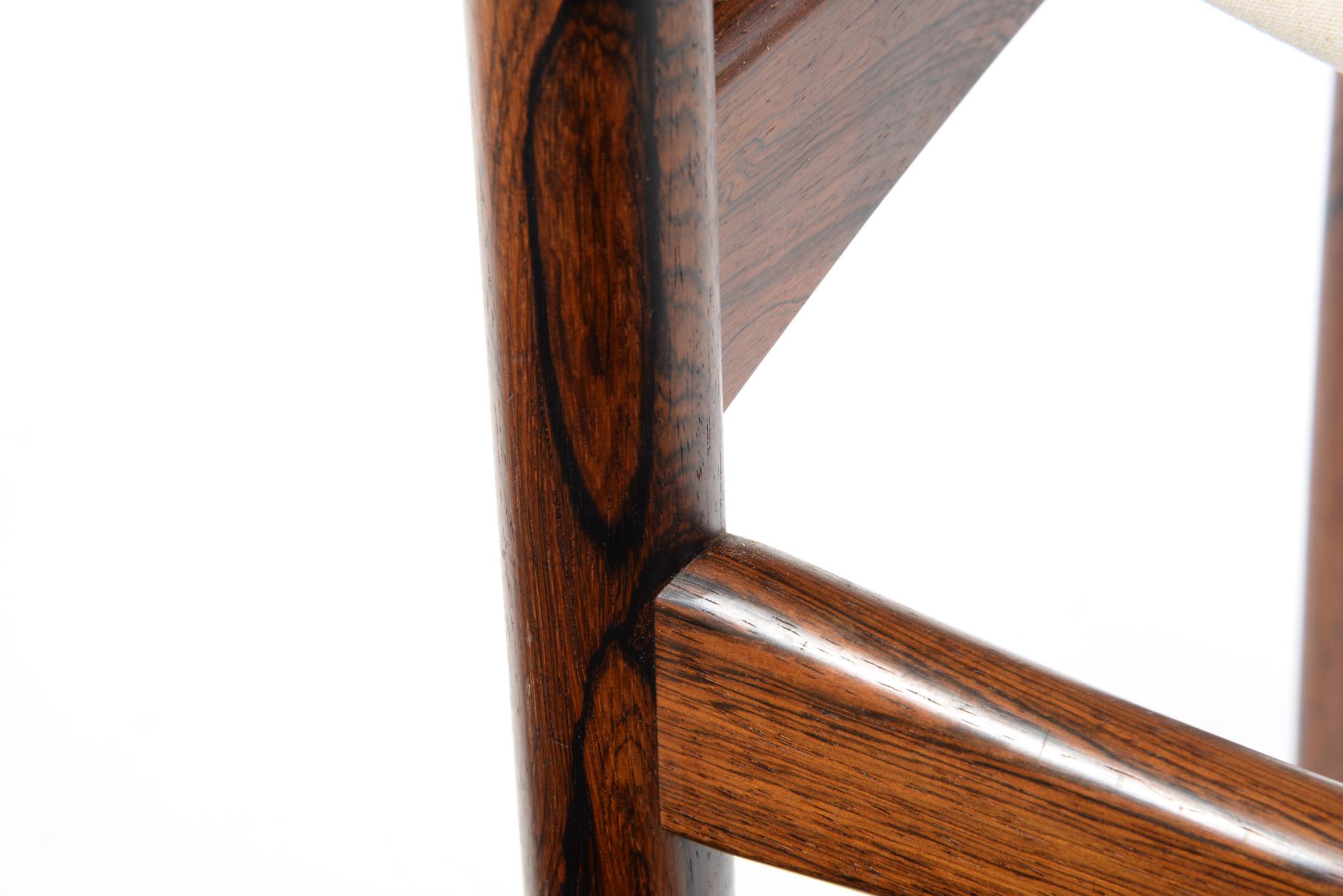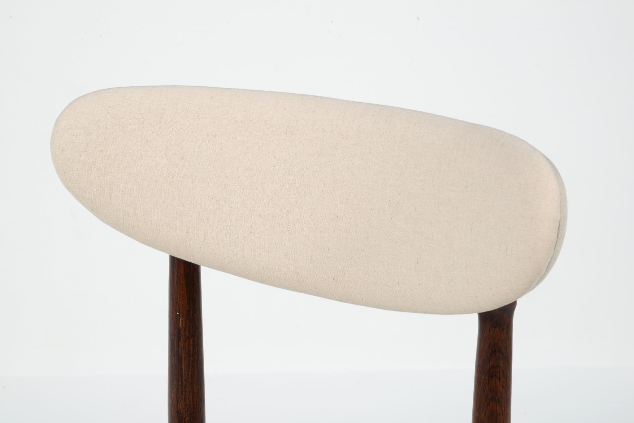 デザイナーやメーカーなど判っておりませんが、デンマークの家具工房で作られたダイニングチェアで、”Danish Furniture Makers Quality Control” (デンマークの家具組合発行による品質保証のスタンプ) が記されています。1960年代頃に作られたものでしょう。良質なローズウッド材が用いられており、座りやすく、背あたりの良い張り包みの笠木が特徴の椅子です。ファブリックは現在仮張りの状態ですので、お好きな生地や皮革をお選び頂けます。
