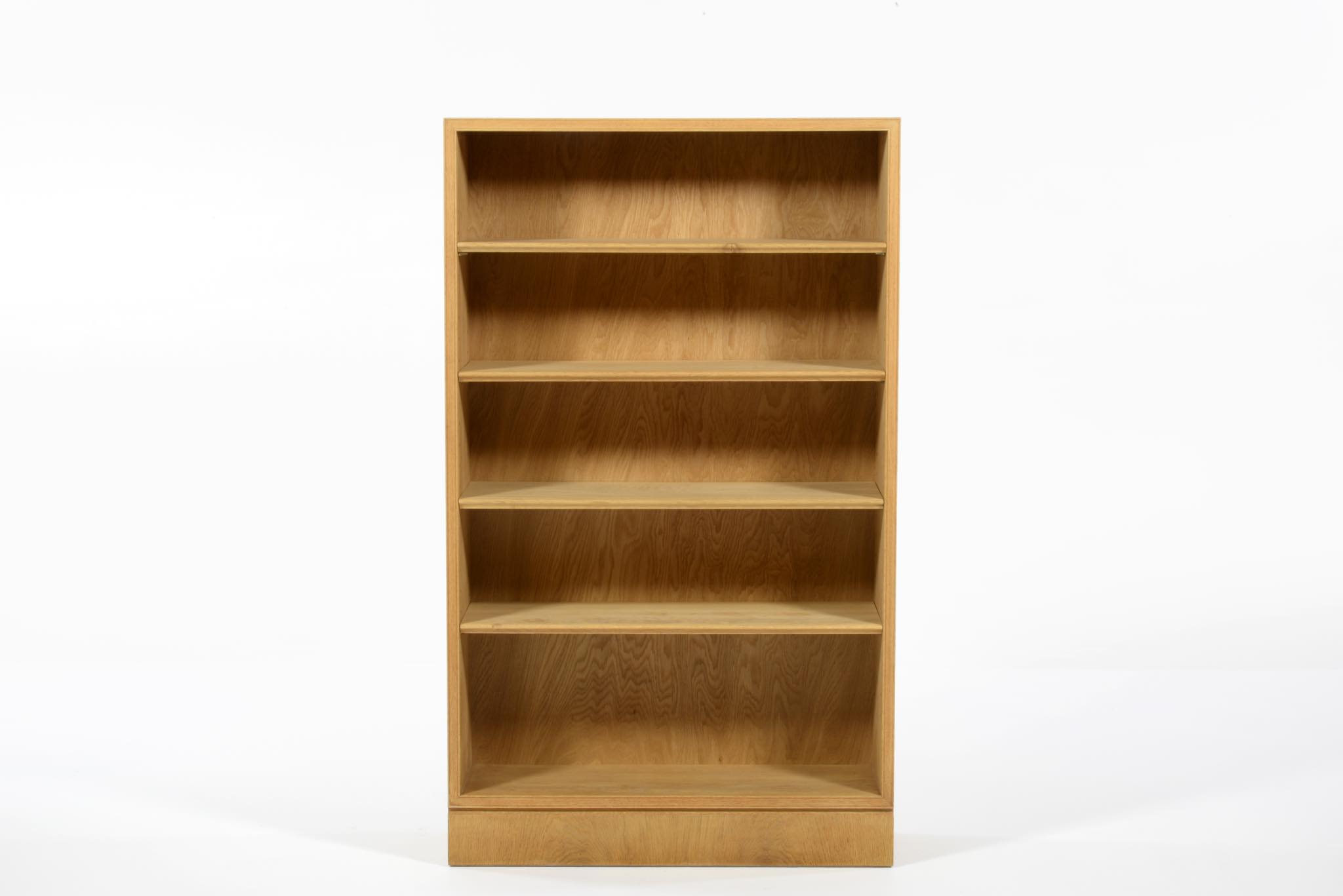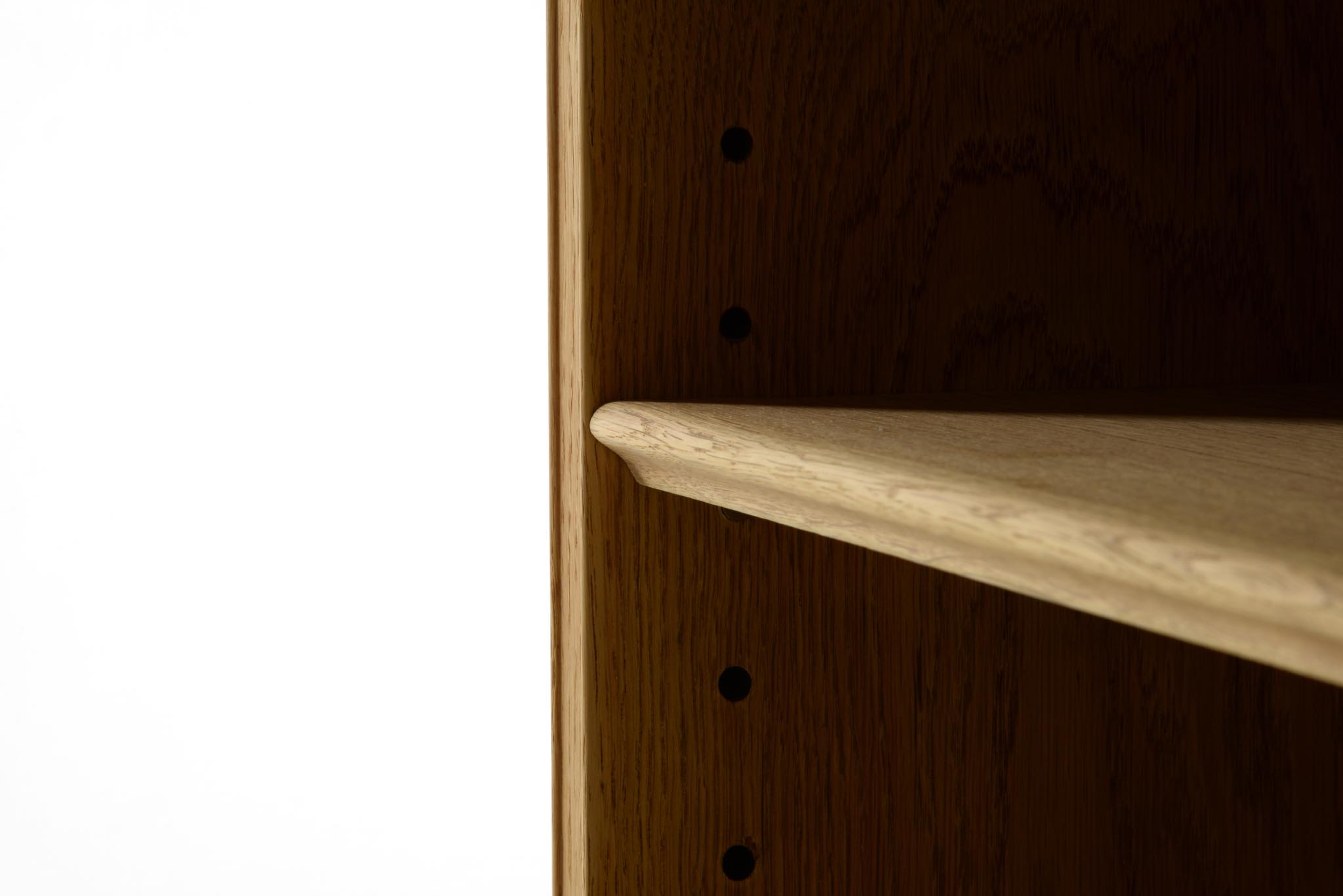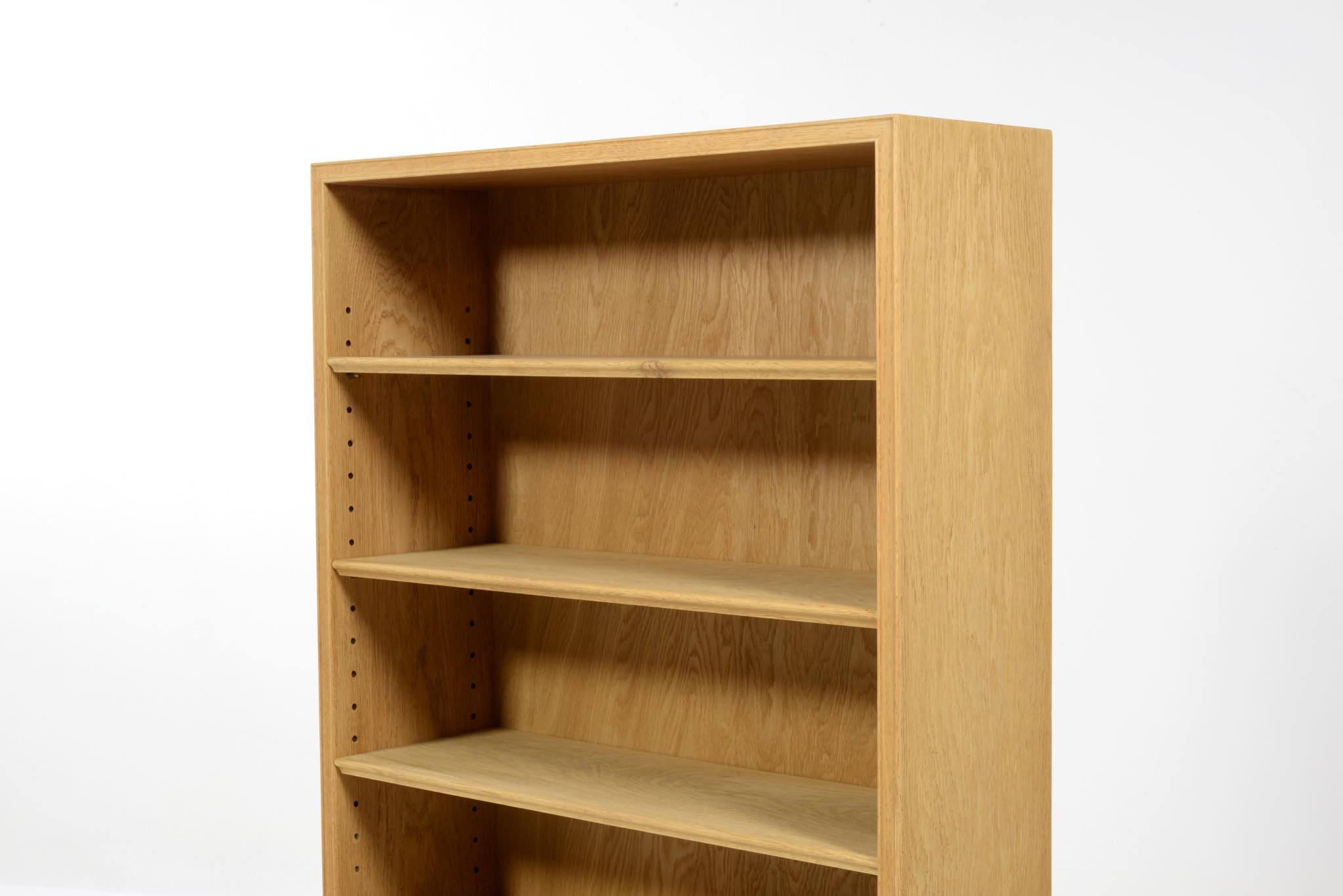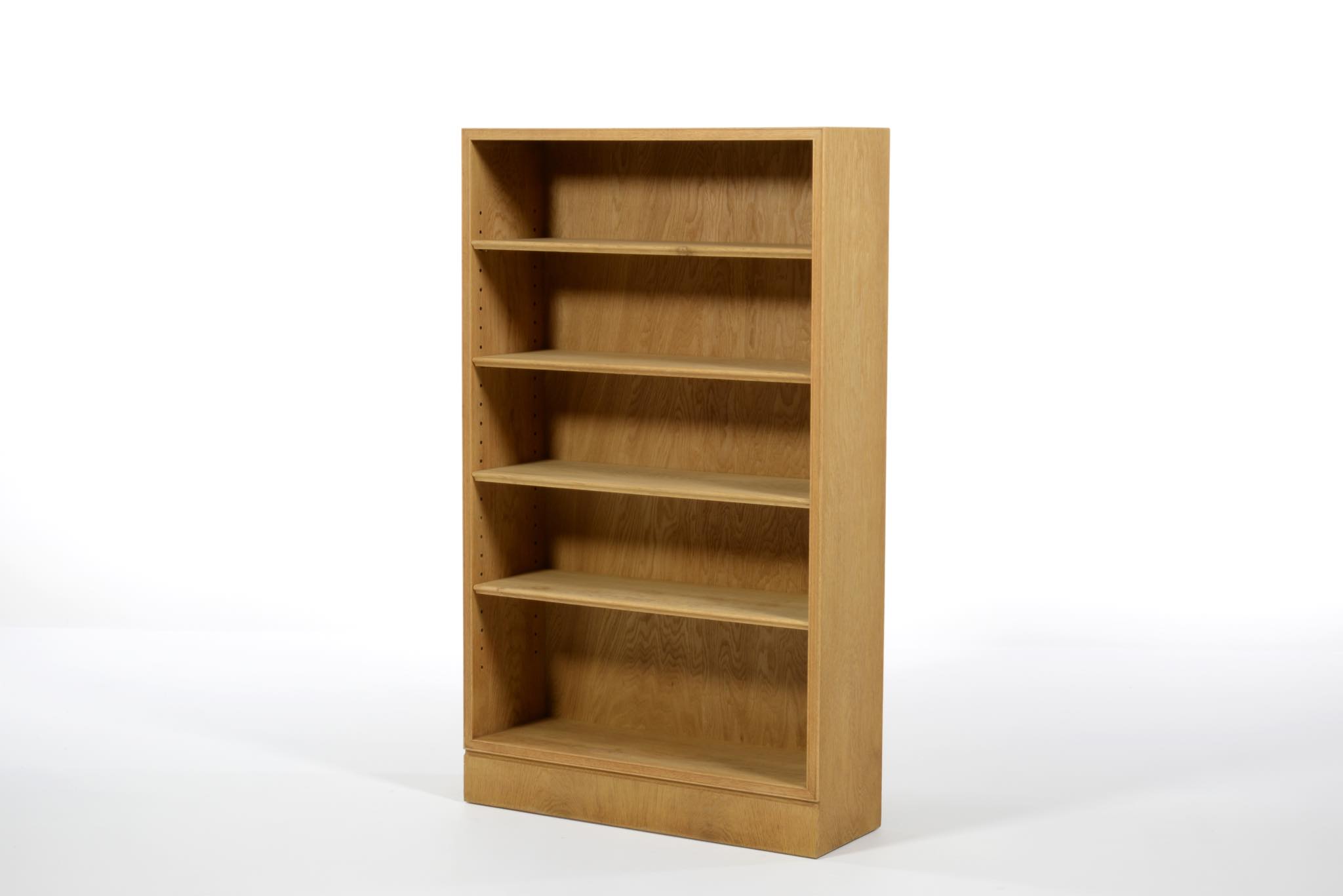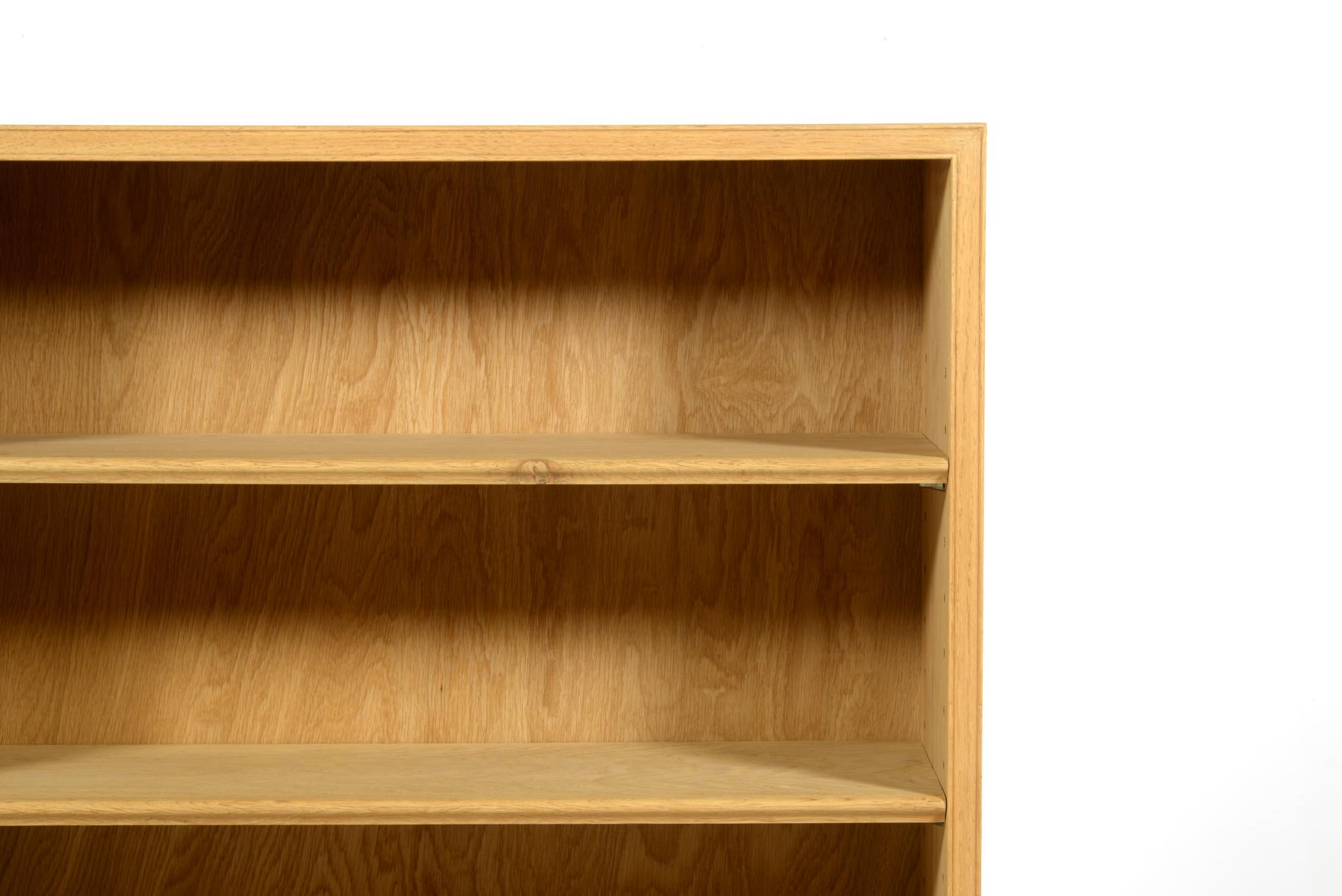 20世紀デンマーク家具デザインの礎を築いた家具デザイナーでキャビネットメーカーのFrits Henningsen/フリッツ・ヘニングセンによるブックシェルフ、縦長タイプです。オーク材を用いたもので、1940年代頃の製作品と思われます。当時、このシリーズはマホガニーやローズウッドでも作られており、小ぶりなサイズ感が人気を博していたようです。オークの表面に経年による古色が見られましたが、大きく斑が見られたため、洗浄し、ソープ仕上げを施しました。古色は落ち、真っ新のような雰囲気になりました。本体のオーク材は天然木のようで、その木目文様は現代のオーク材には見られない野趣溢れる雰囲気です。本体の一部に呼び継ぎ補修を施しています。背板はダメージが見られたため、新たにオーク材の突き板で張り替えております。