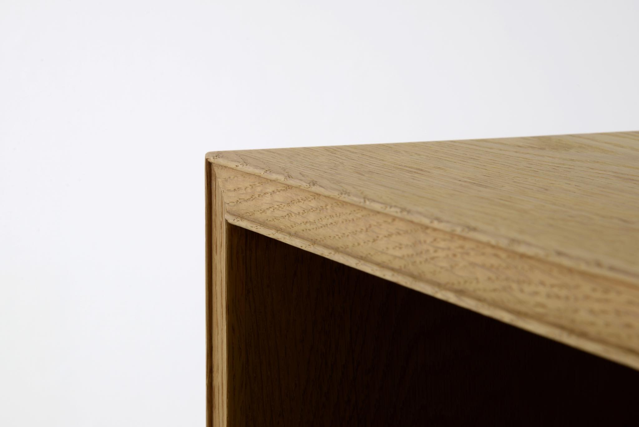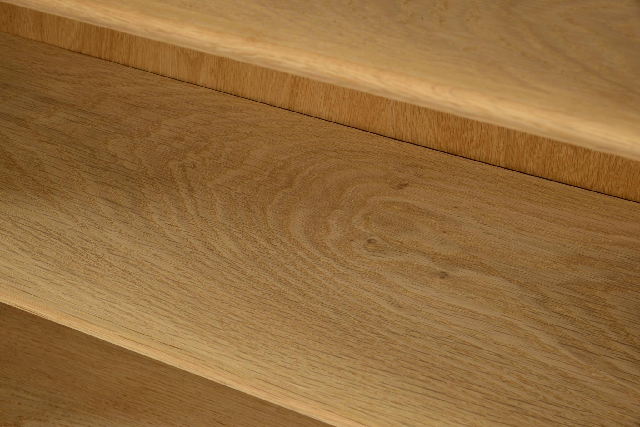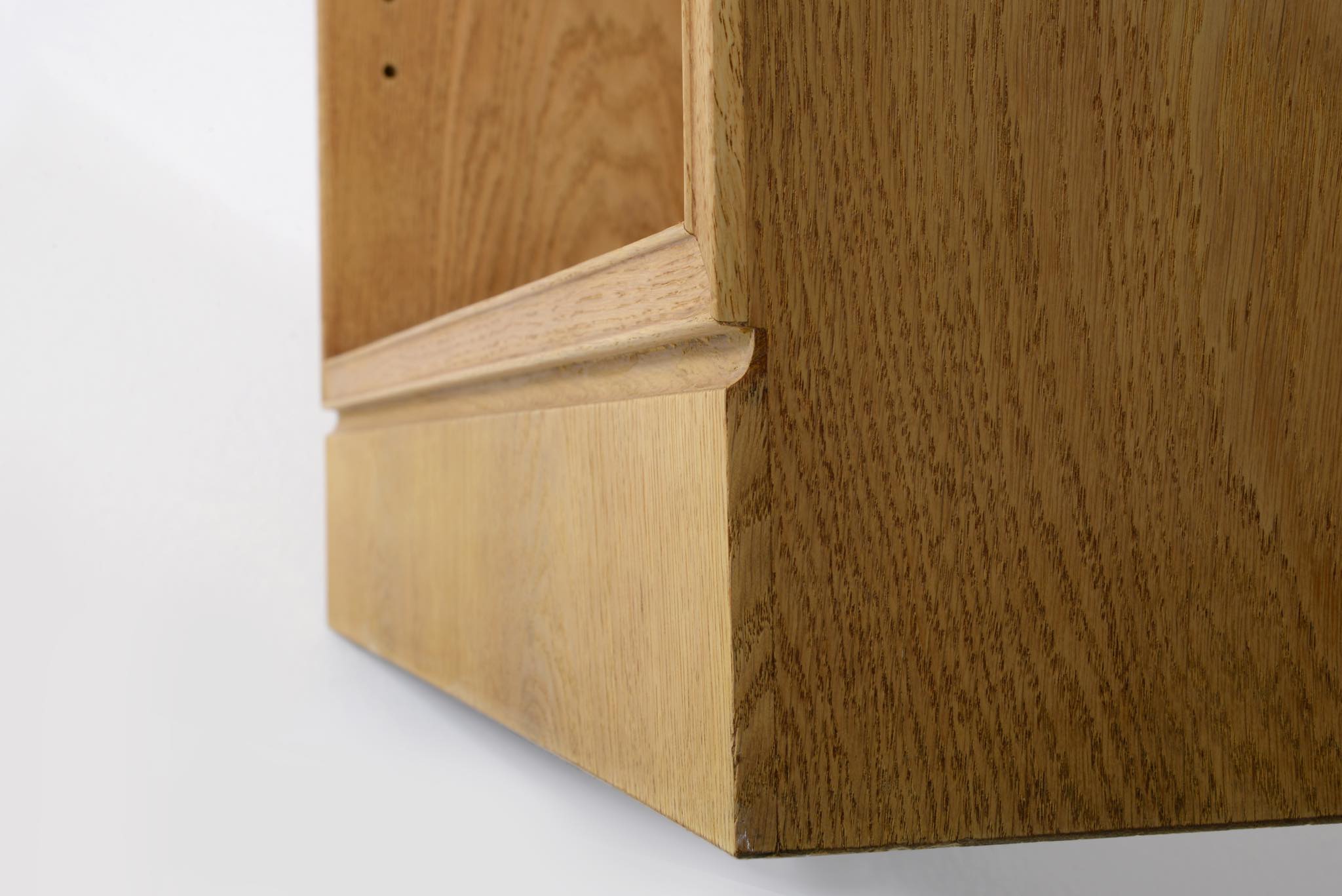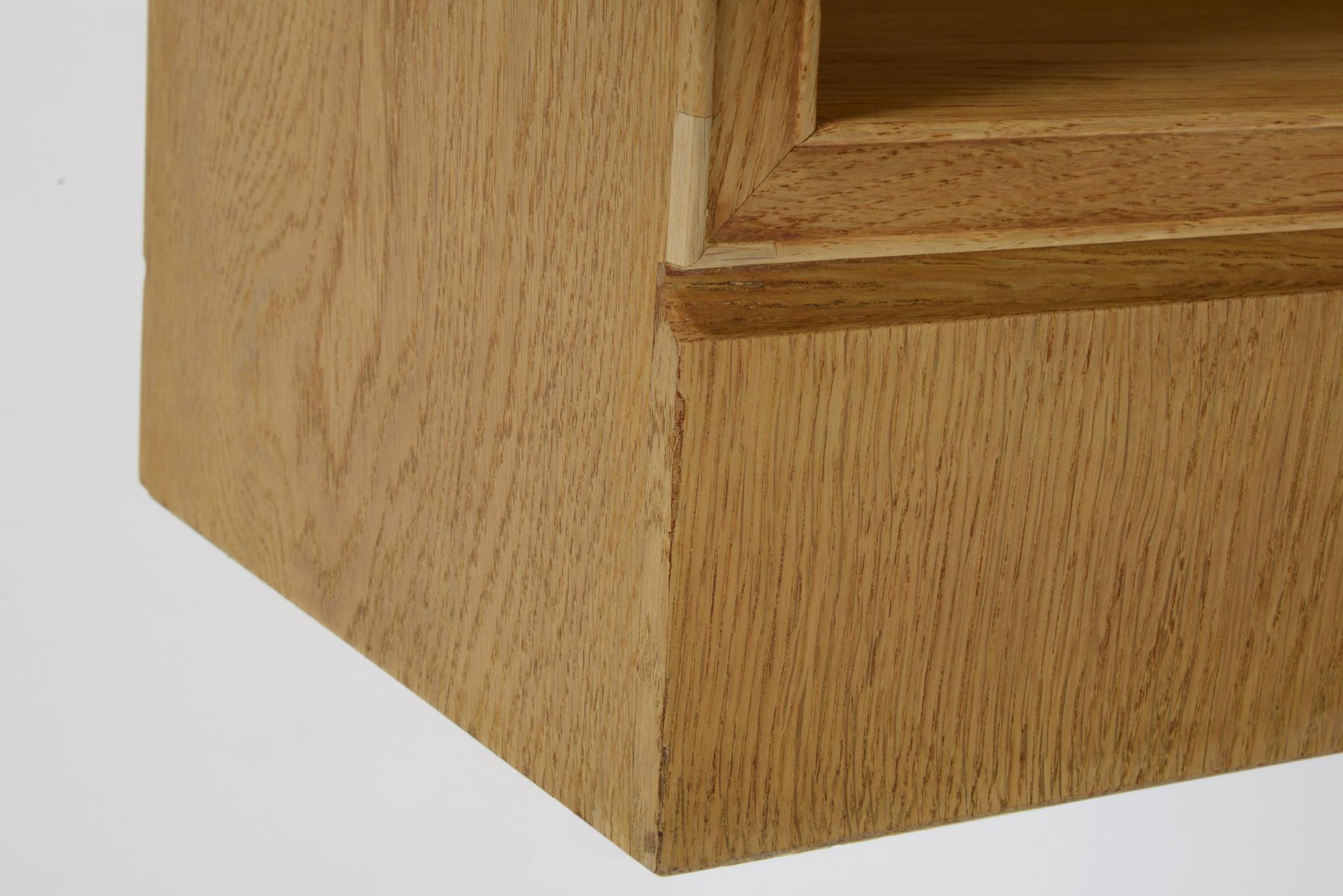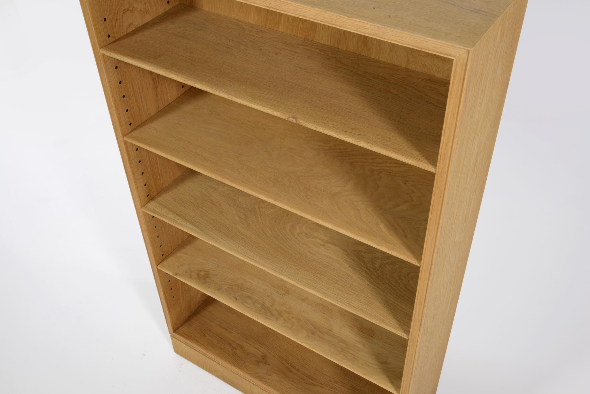20世紀デンマーク家具デザインの礎を築いた家具デザイナーでキャビネットメーカーのFrits Henningsen/フリッツ・ヘニングセンによるブックシェルフ、縦長タイプです。オーク材を用いたもので、1940年代頃の製作品と思われます。当時、このシリーズはマホガニーやローズウッドでも作られており、小ぶりなサイズ感が人気を博していたようです。オークの表面に経年による古色が見られましたが、大きく斑が見られたため、洗浄し、ソープ仕上げを施しました。古色は落ち、真っ新のような雰囲気になりました。本体のオーク材は天然木のようで、その木目文様は現代のオーク材には見られない野趣溢れる雰囲気です。本体の一部に呼び継ぎ補修を施しています。背板はダメージが見られたため、新たにオーク材の突き板で張り替えております。