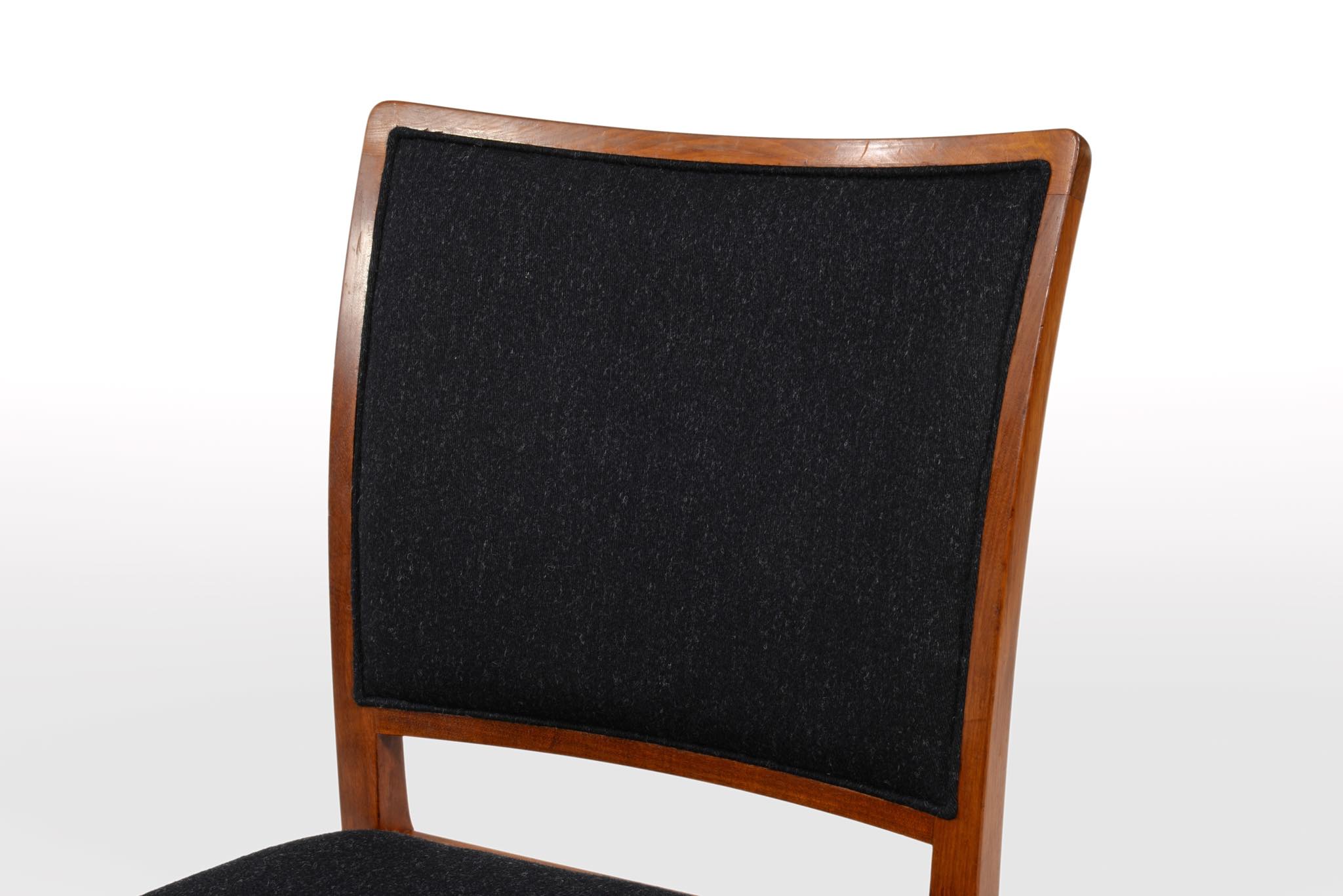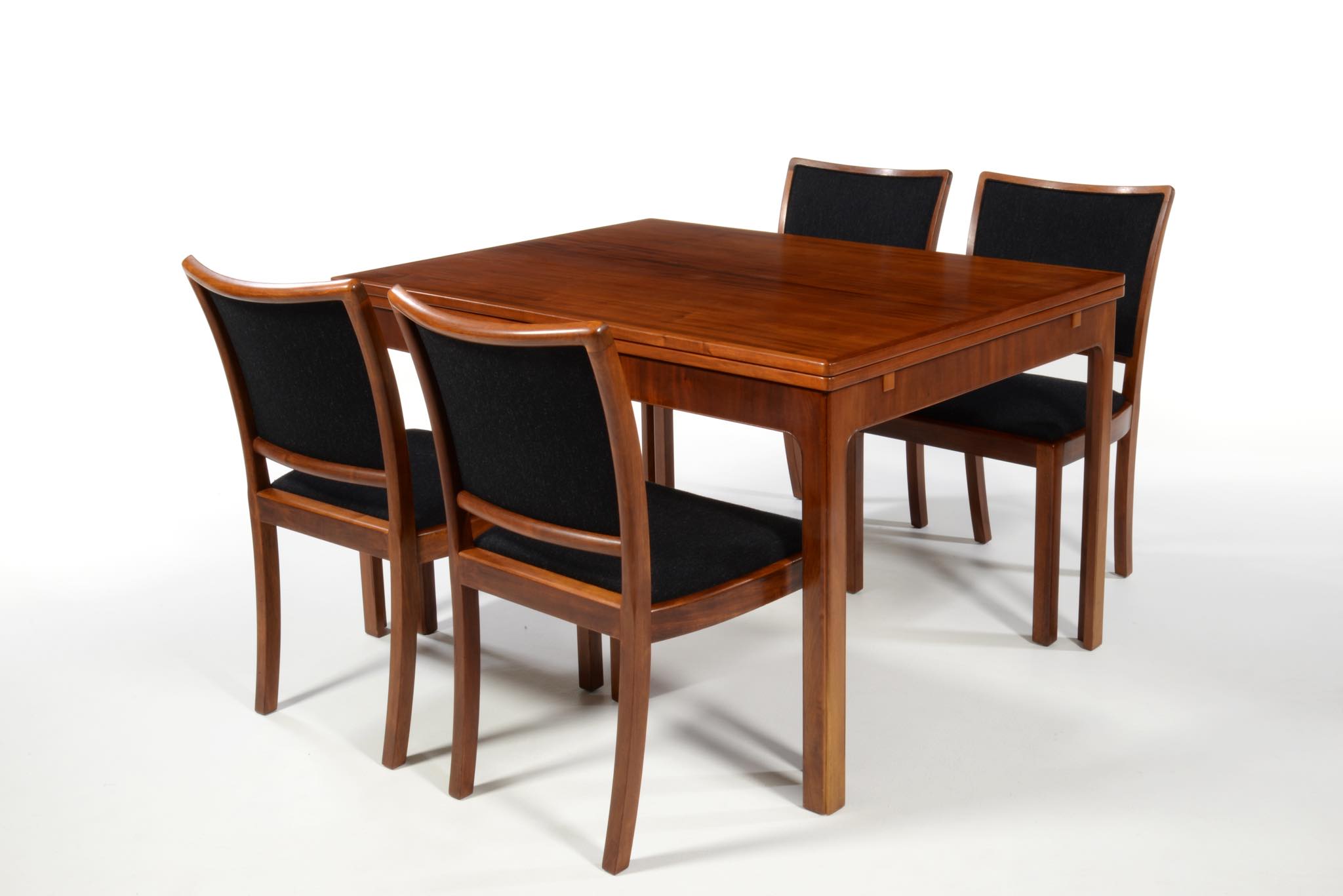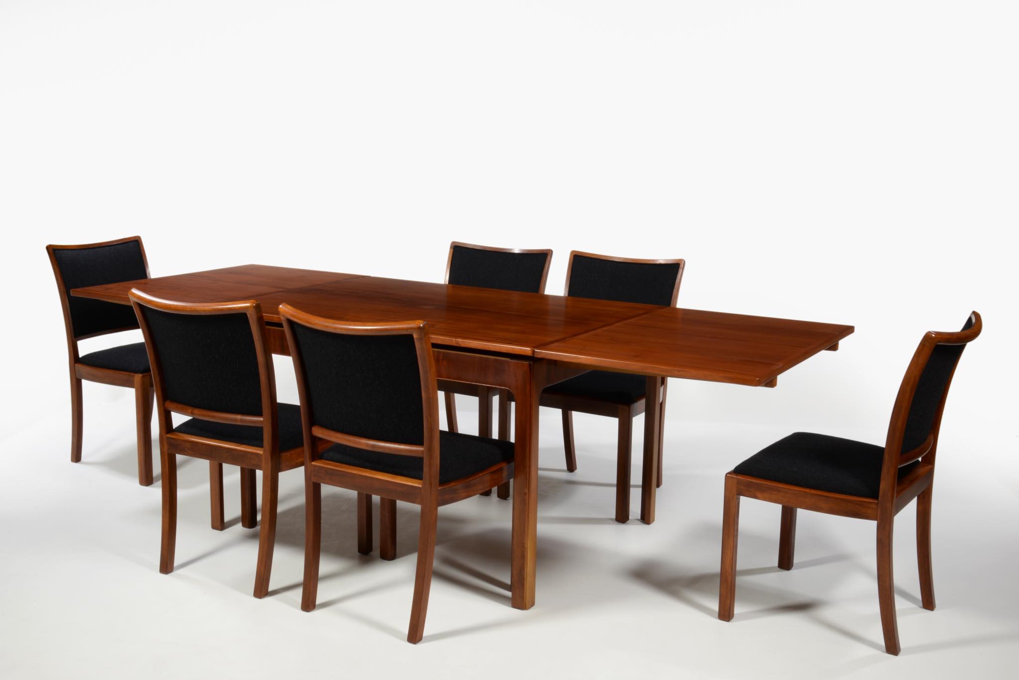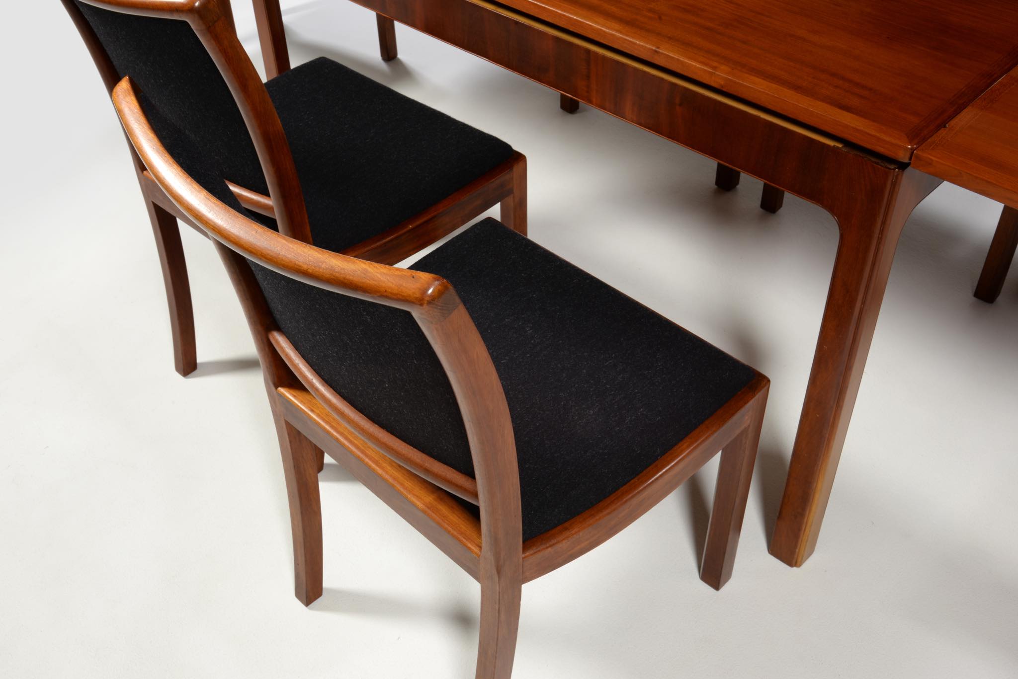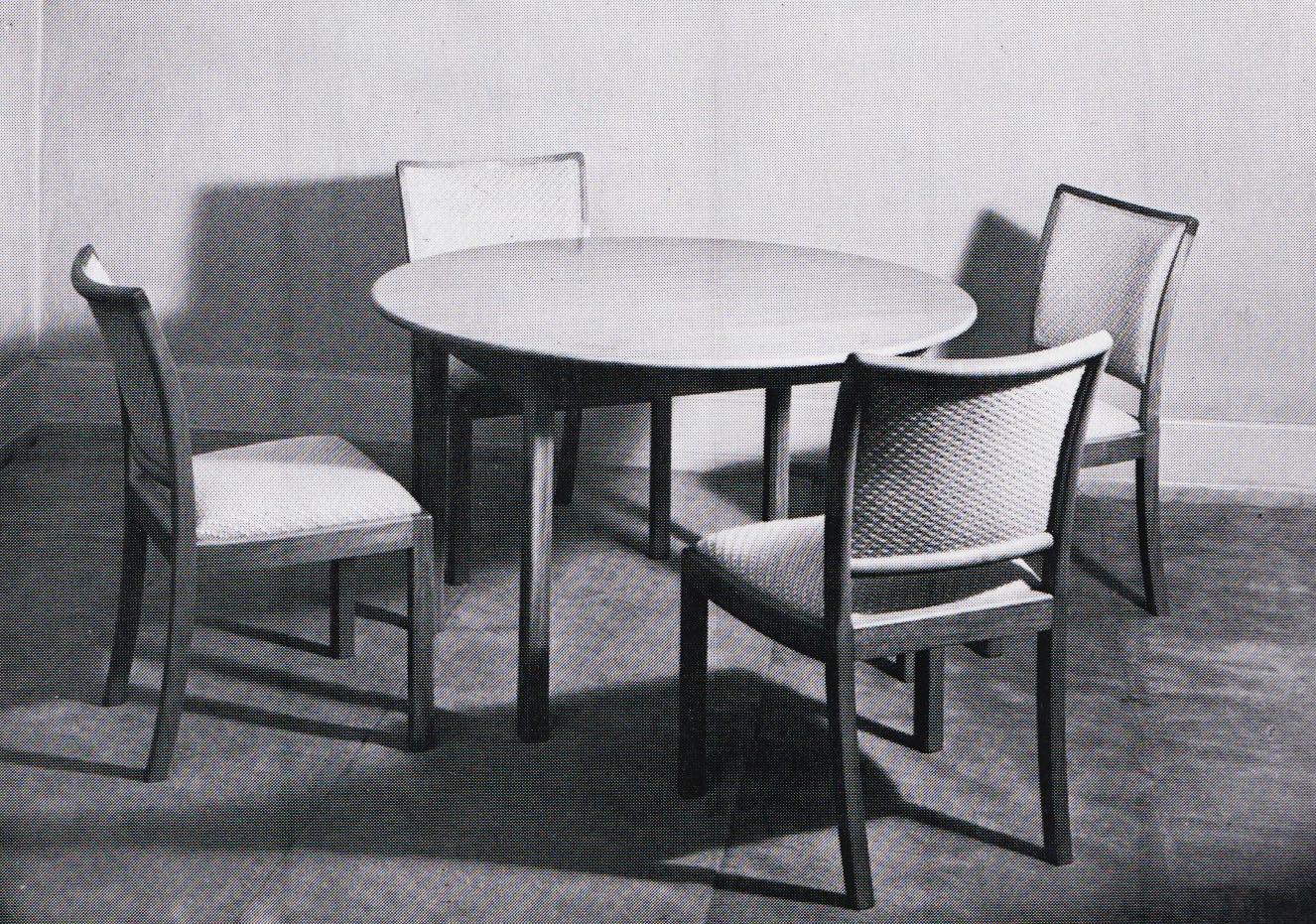 デンマークの名匠、Jacob Kjær/ヤコブ・ケアによってデザインされたダイニングセットです。テーブルは1933年に行われた展示会(Københavns Snedkerlaugs Møbeludstillinger)にアクセル・サルトのボウルとともに出品され、椅子は1936年の同展示会に出品された記録があります。クラシックな趣を全体に残しつつ、モダンな要素を取り入れた、ダニッシュモダン黎明期の作品で、末尾に掲載しております当時の展示風景は、部屋の寸法やレイアウトなどヤコブ・ケア自身によるものです。素材には惜しみなくキューバンマホガニーが用いられ、天板部分に現れた流れるような独自の木目文様はとても優雅な雰囲気です。