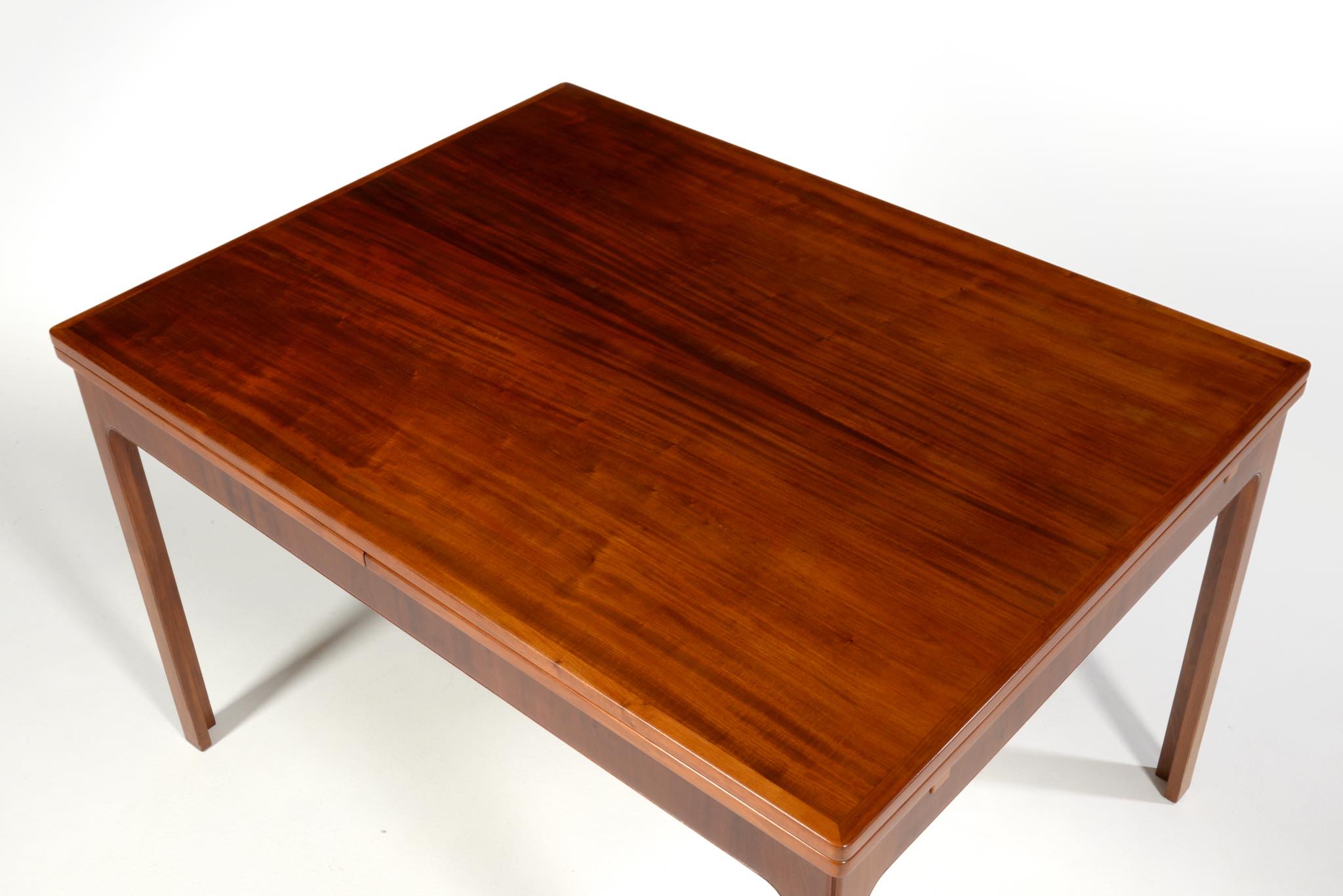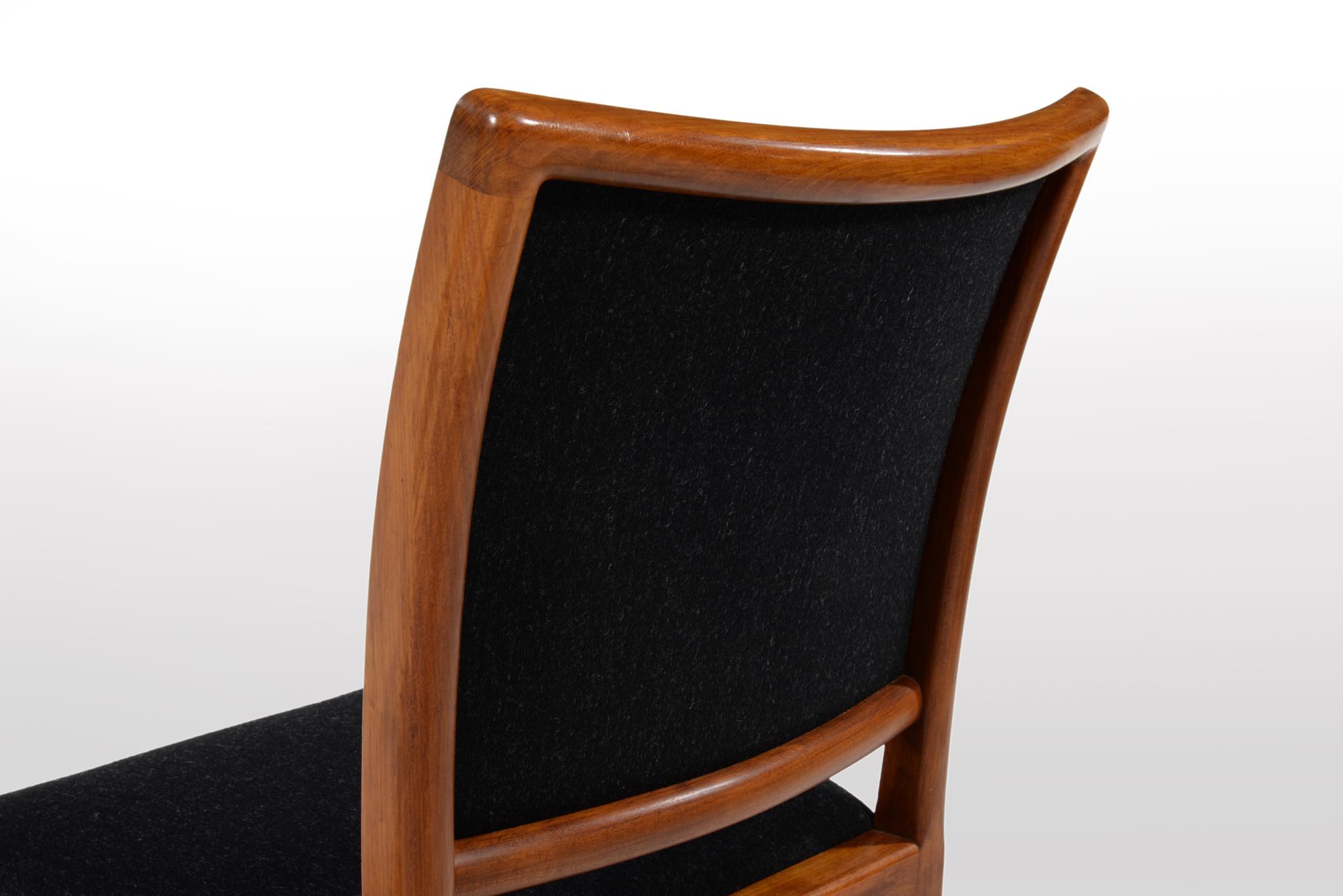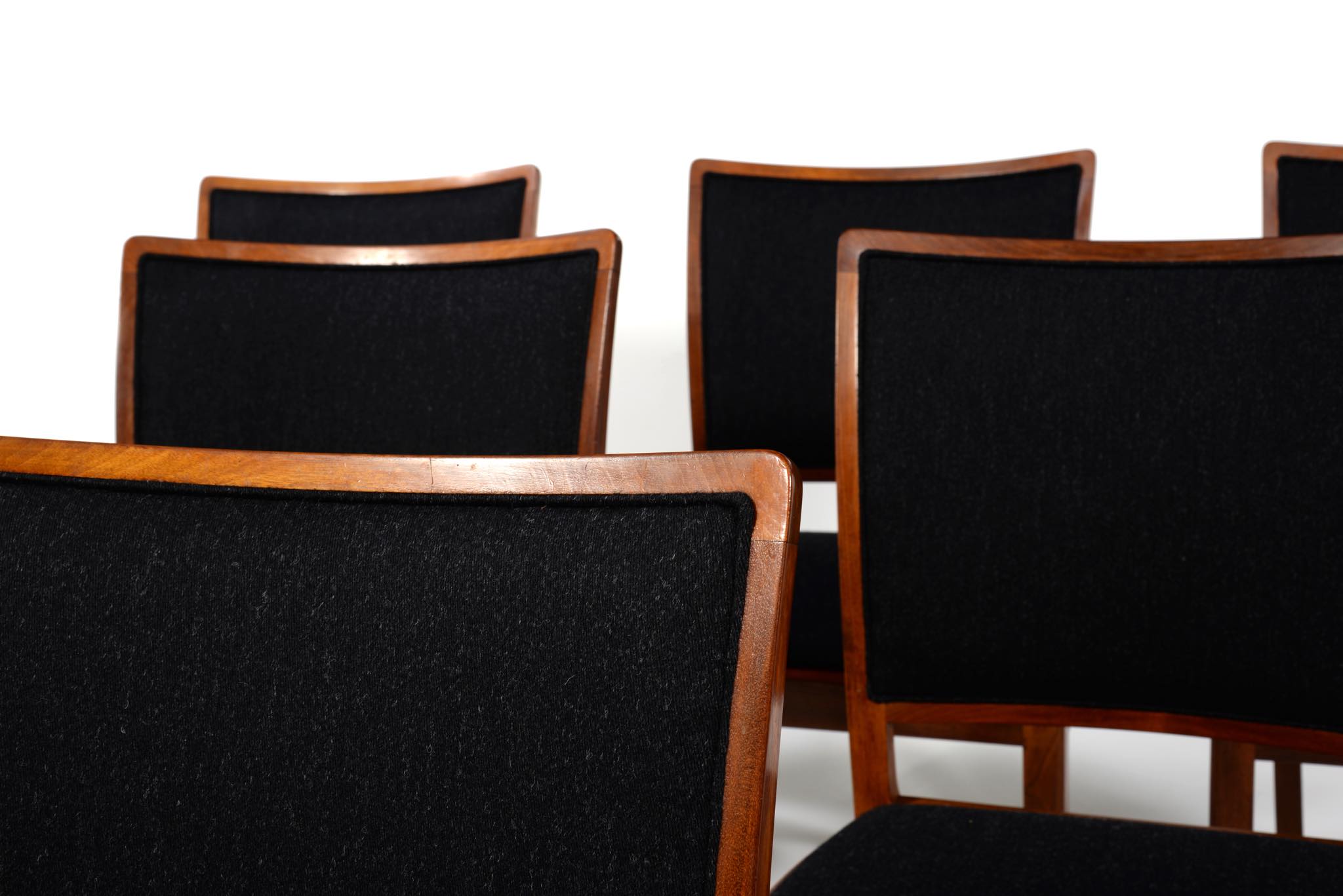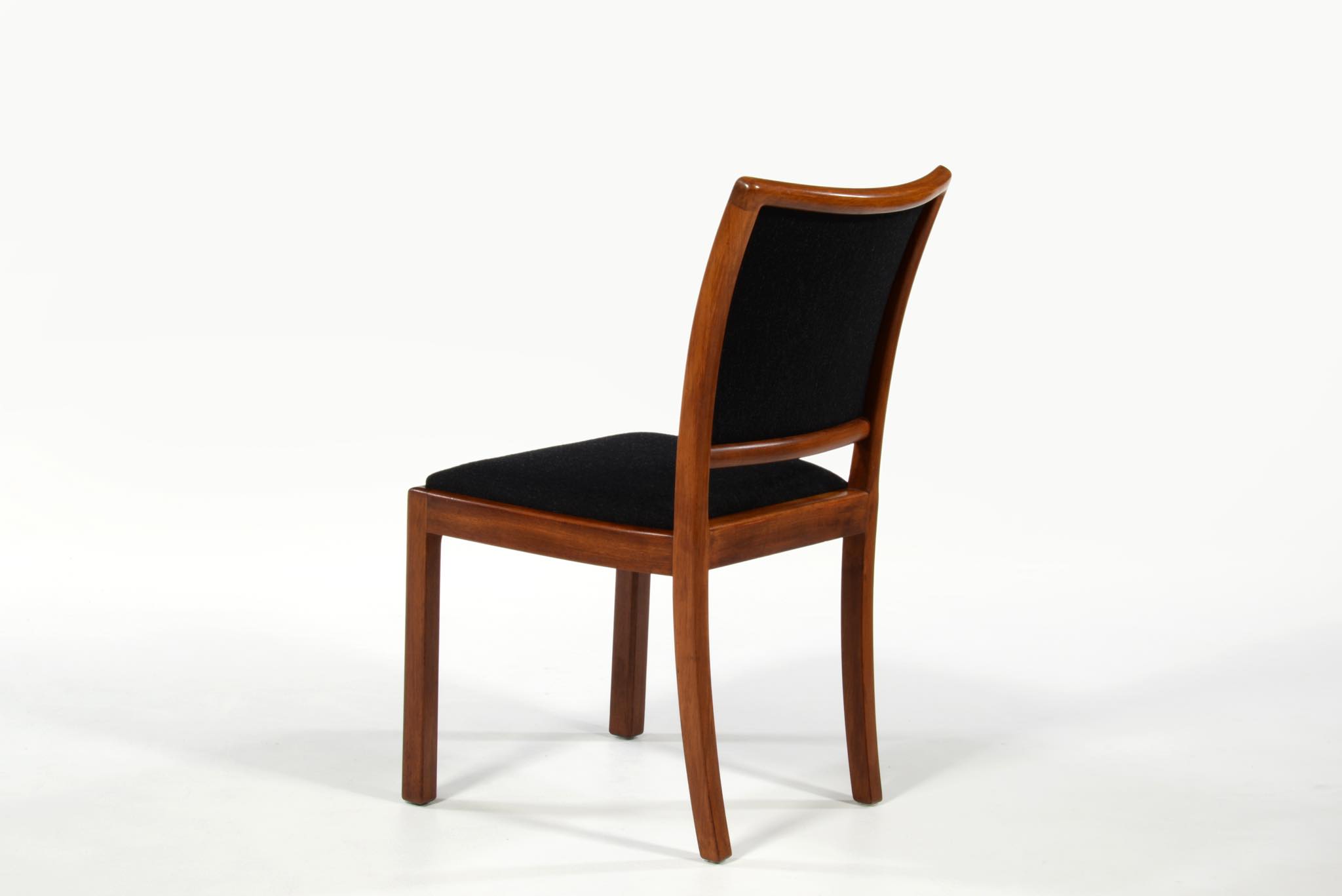 デンマークの名匠、Jacob Kjær/ヤコブ・ケアによってデザインされたダイニングセットです。テーブルは1933年に行われた展示会(Københavns Snedkerlaugs Møbeludstillinger)にアクセル・サルトのボウルとともに出品され、椅子は1936年の同展示会に出品された記録があります。クラシックな趣を全体に残しつつ、モダンな要素を取り入れた、ダニッシュモダン黎明期の作品で、末尾に掲載しております当時の展示風景は、部屋の寸法やレイアウトなどヤコブ・ケア自身によるものです。素材には惜しみなくキューバンマホガニーが用いられ、天板部分に現れた流れるような独自の木目文様はとても優雅な雰囲気です。