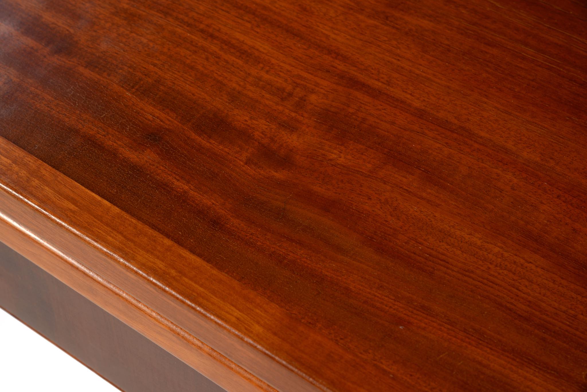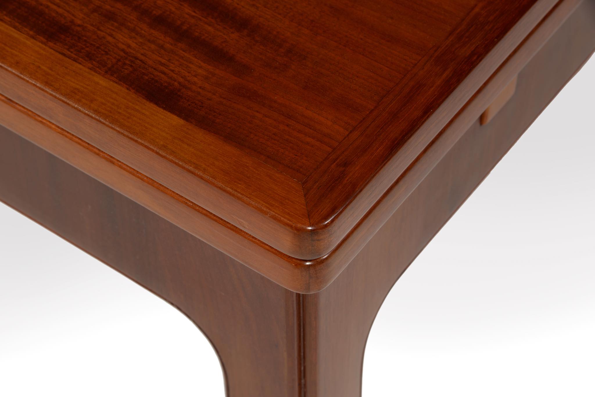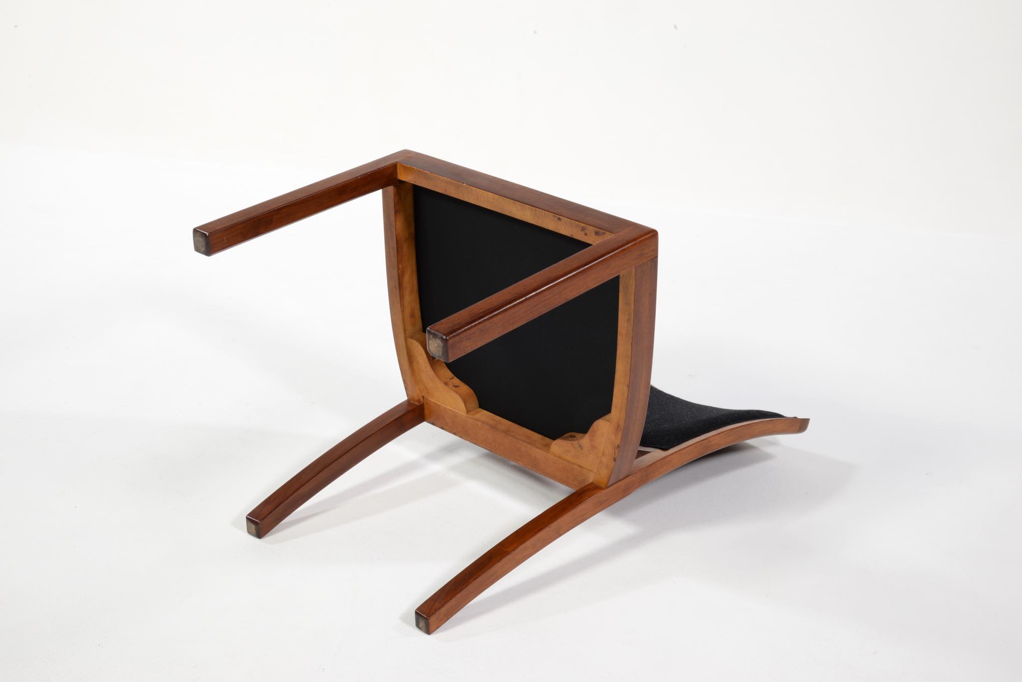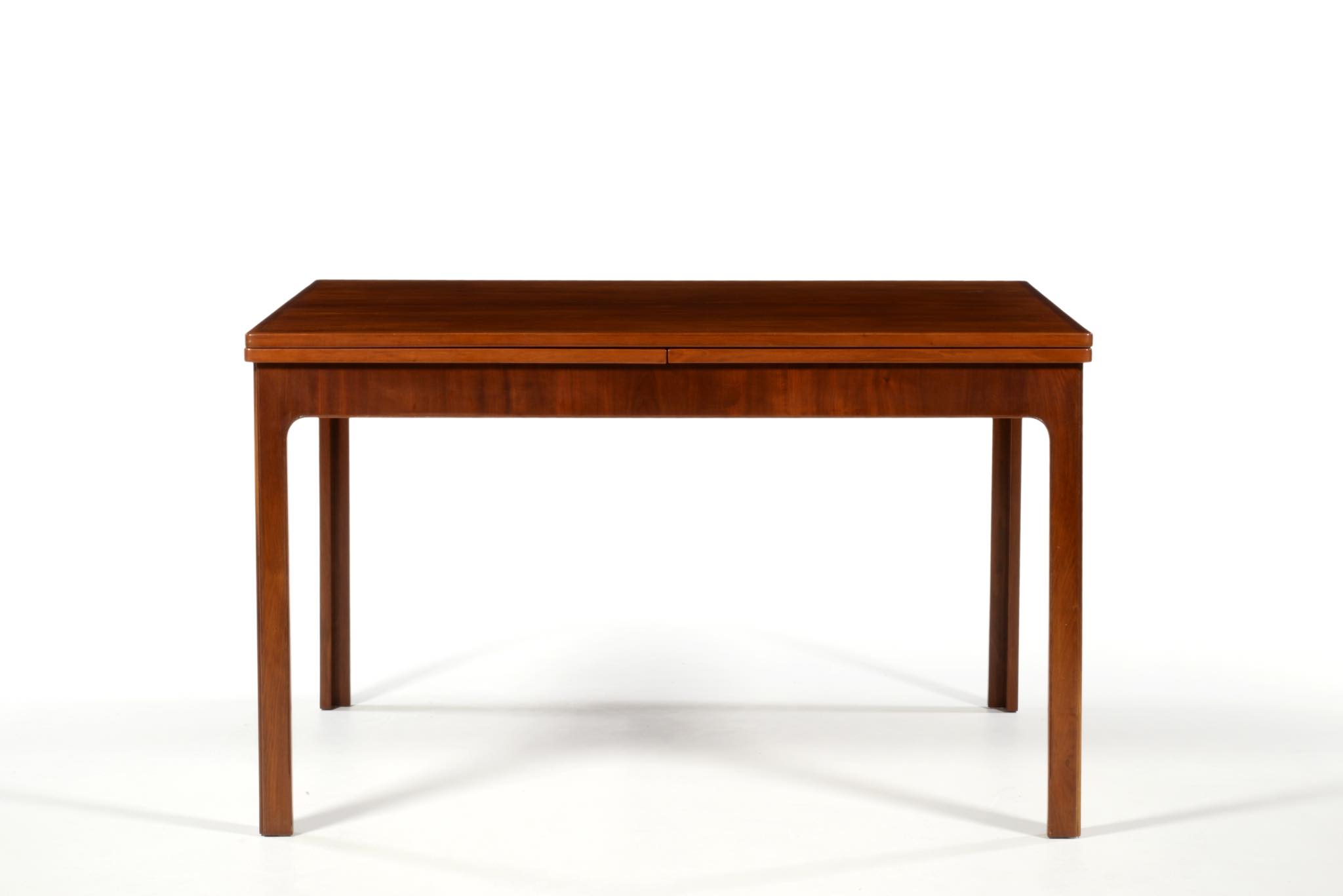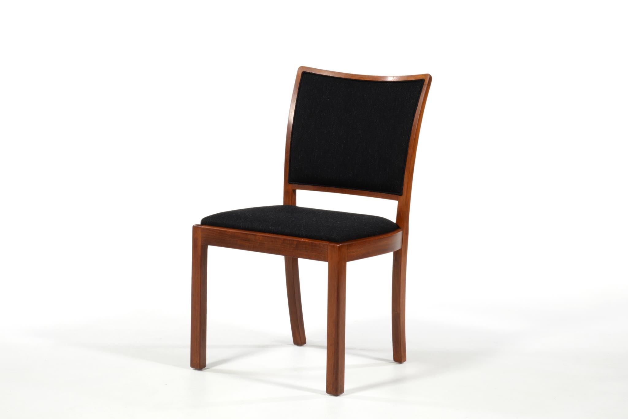 デンマークの名匠、Jacob Kjær/ヤコブ・ケアによってデザインされたダイニングセットです。テーブルは1933年に行われた展示会(Københavns Snedkerlaugs Møbeludstillinger)にアクセル・サルトのボウルとともに出品され、椅子は1936年の同展示会に出品された記録があります。クラシックな趣を全体に残しつつ、モダンな要素を取り入れた、ダニッシュモダン黎明期の作品で、末尾に掲載しております当時の展示風景は、部屋の寸法やレイアウトなどヤコブ・ケア自身によるものです。素材には惜しみなくキューバンマホガニーが用いられ、天板部分に現れた流れるような独自の木目文様はとても優雅な雰囲気です。