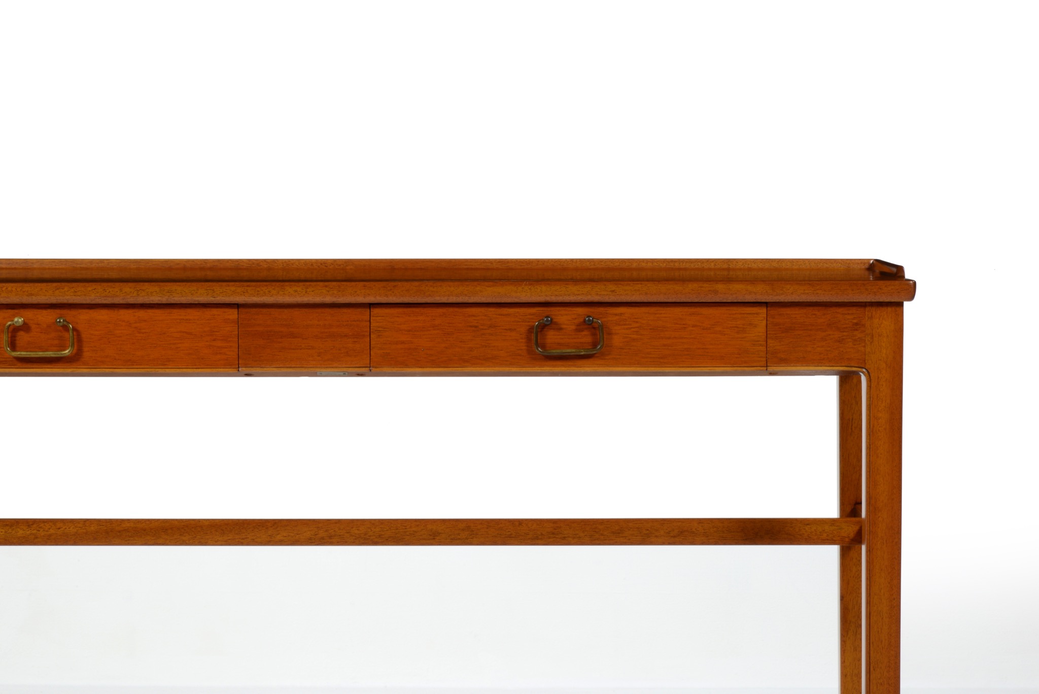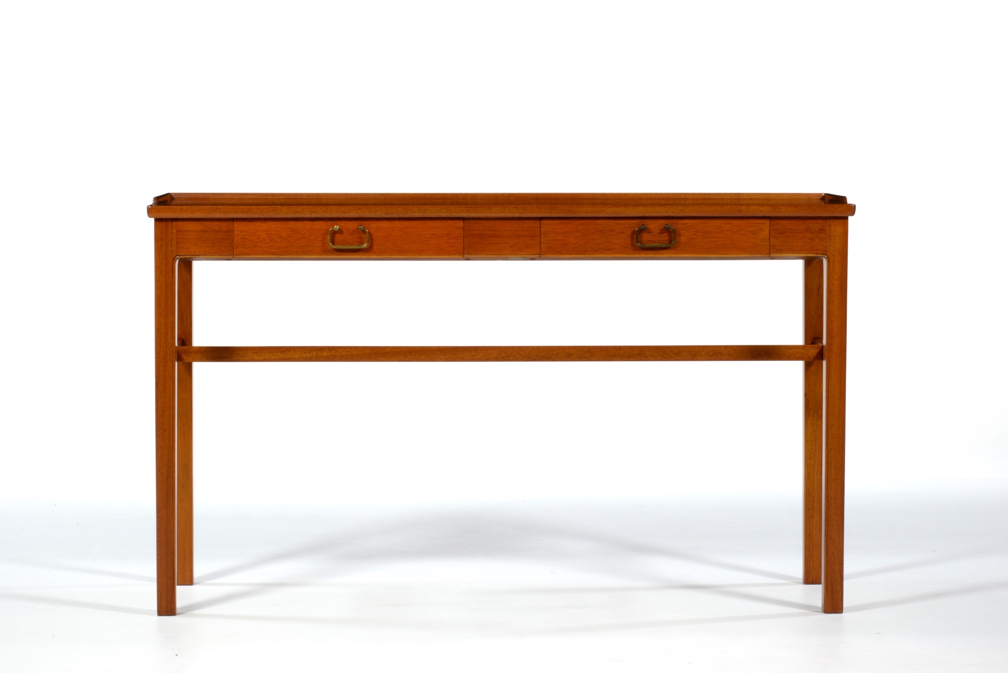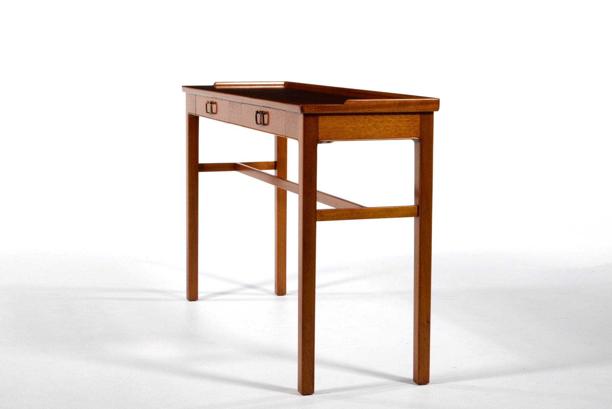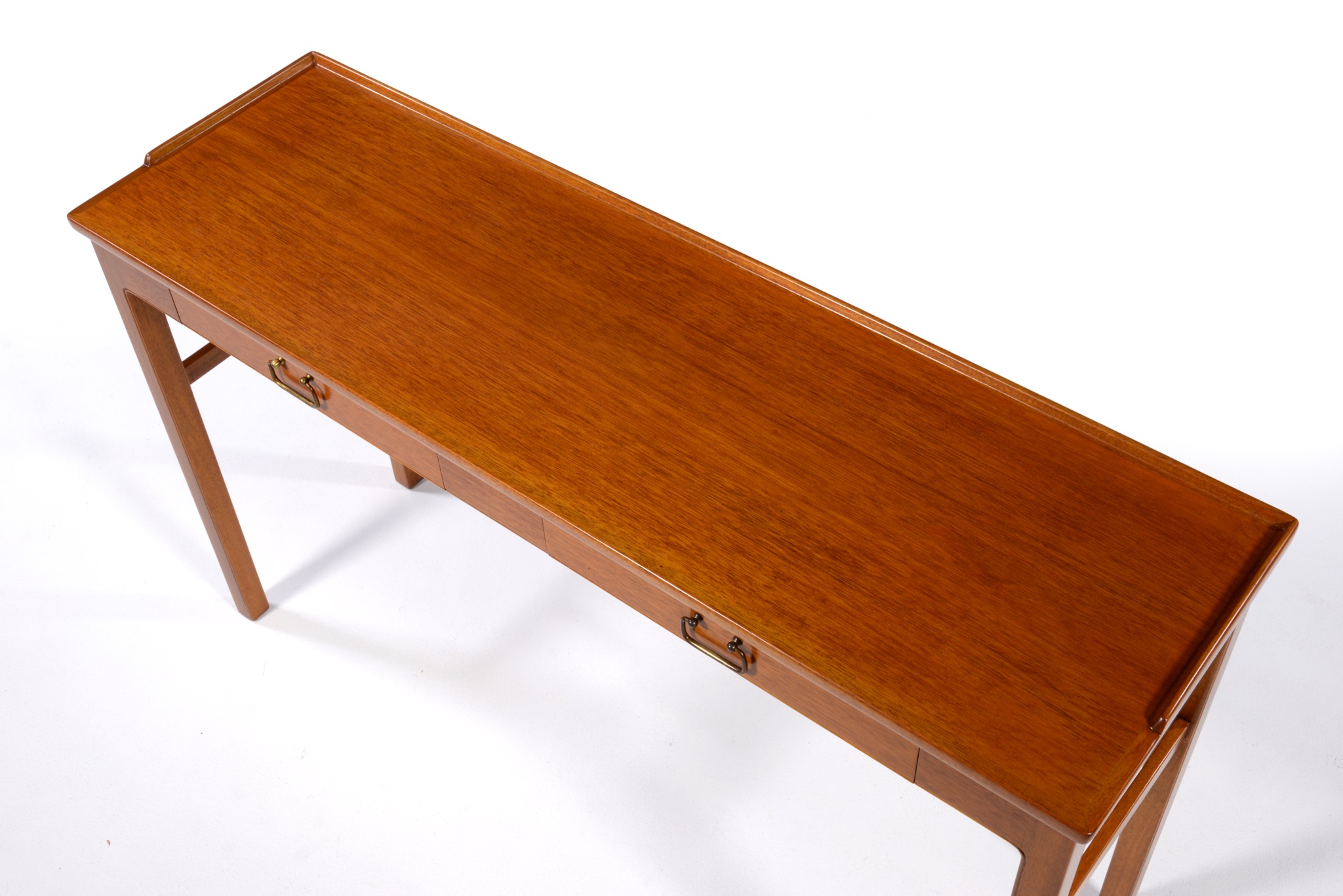 1940〜50年代のデンマークで作られたコンソールテーブルです。デザイナーや工房などは分かっておりませんが、丁寧に作られたもので、マホガニーの本体に真鍮の引手が備わりクラシックな趣です。奥行きが浅く、動線の確保にも有利です。背面に付けられたプレートの意味は分かっておりません。