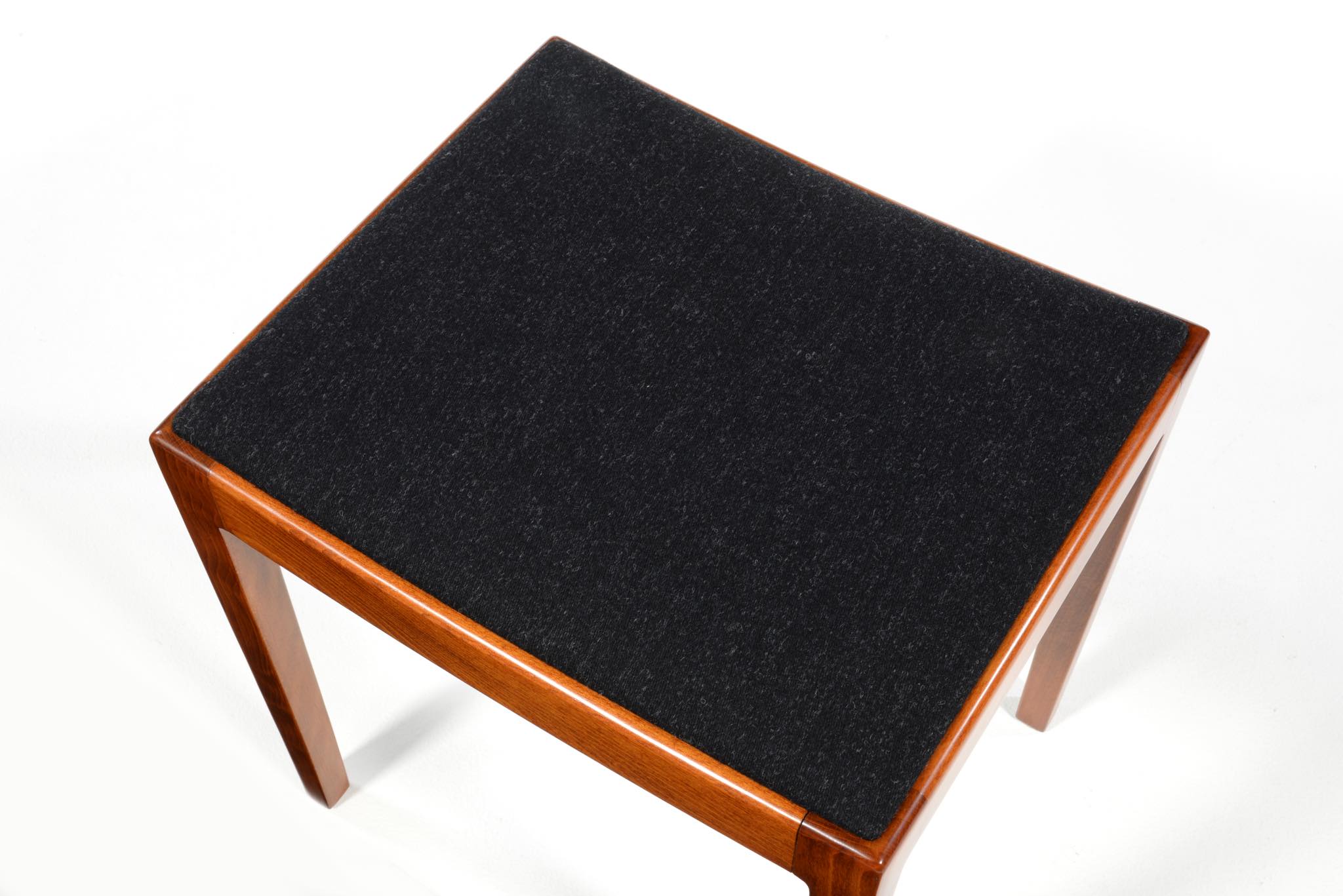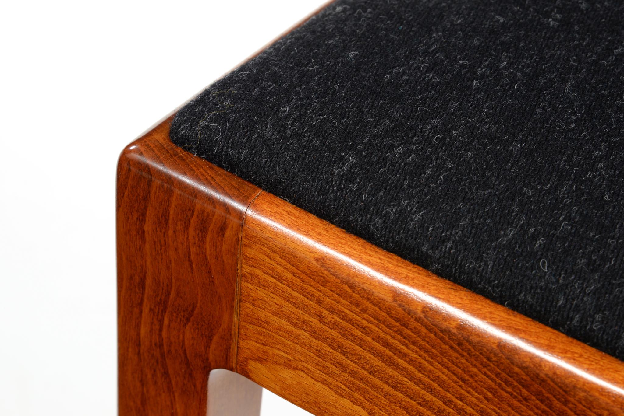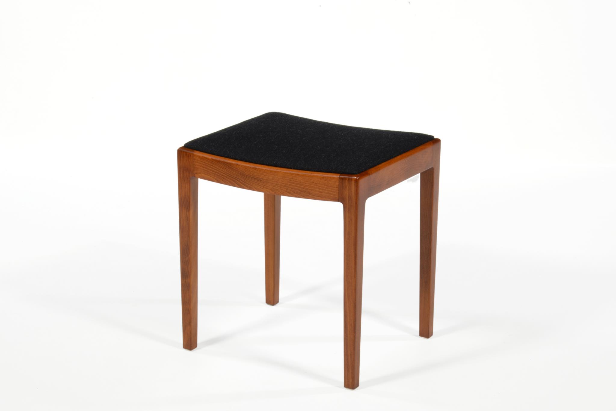 アルネ・ヤコブセンのプロダクトを手掛ける家具メーカーとして知られるフリッツ・ハンセン社によるスツールです。こちらはヤコブセンと関わる以前、1940年代頃に作られたものでしょう。予備のダイニングチェアとしてお使いいただくような高さです。古いファブリックは傷みがあったため、新たに黒色のキエルルップで張り替えました。ステインドビーチ材との相性は良いようで、色調の減り張りが現れました。