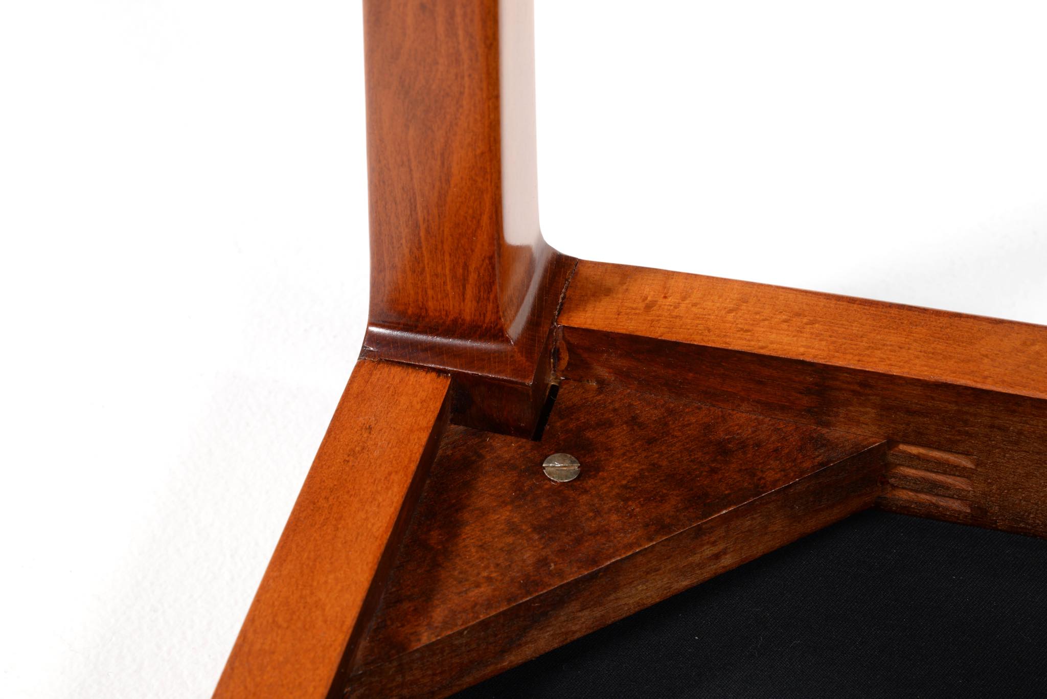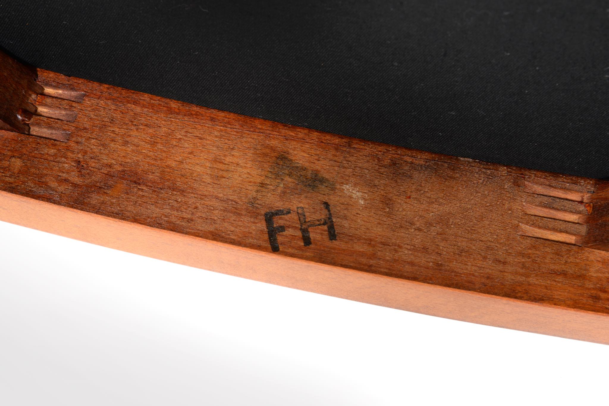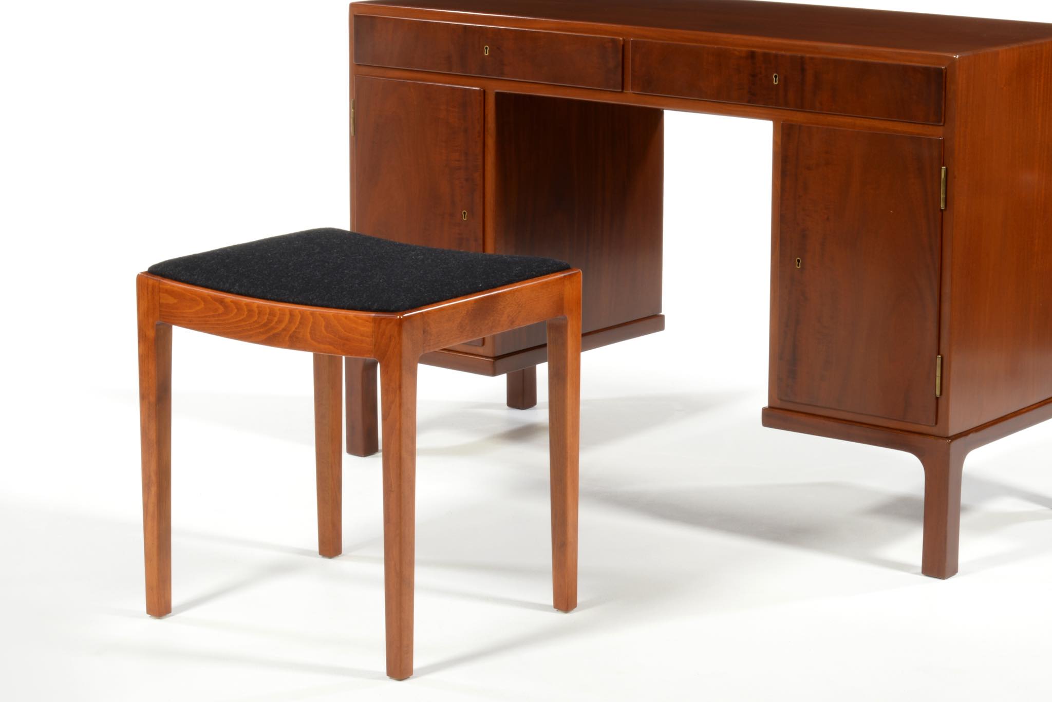 アルネ・ヤコブセンのプロダクトを手掛ける家具メーカーとして知られるフリッツ・ハンセン社によるスツールです。こちらはヤコブセンと関わる以前、1940年代頃に作られたものでしょう。予備のダイニングチェアとしてお使いいただくような高さです。古いファブリックは傷みがあったため、新たに黒色のキエルルップで張り替えました。ステインドビーチ材との相性は良いようで、色調の減り張りが現れました。