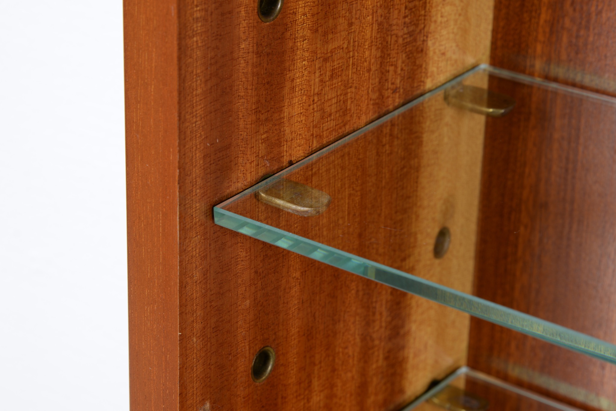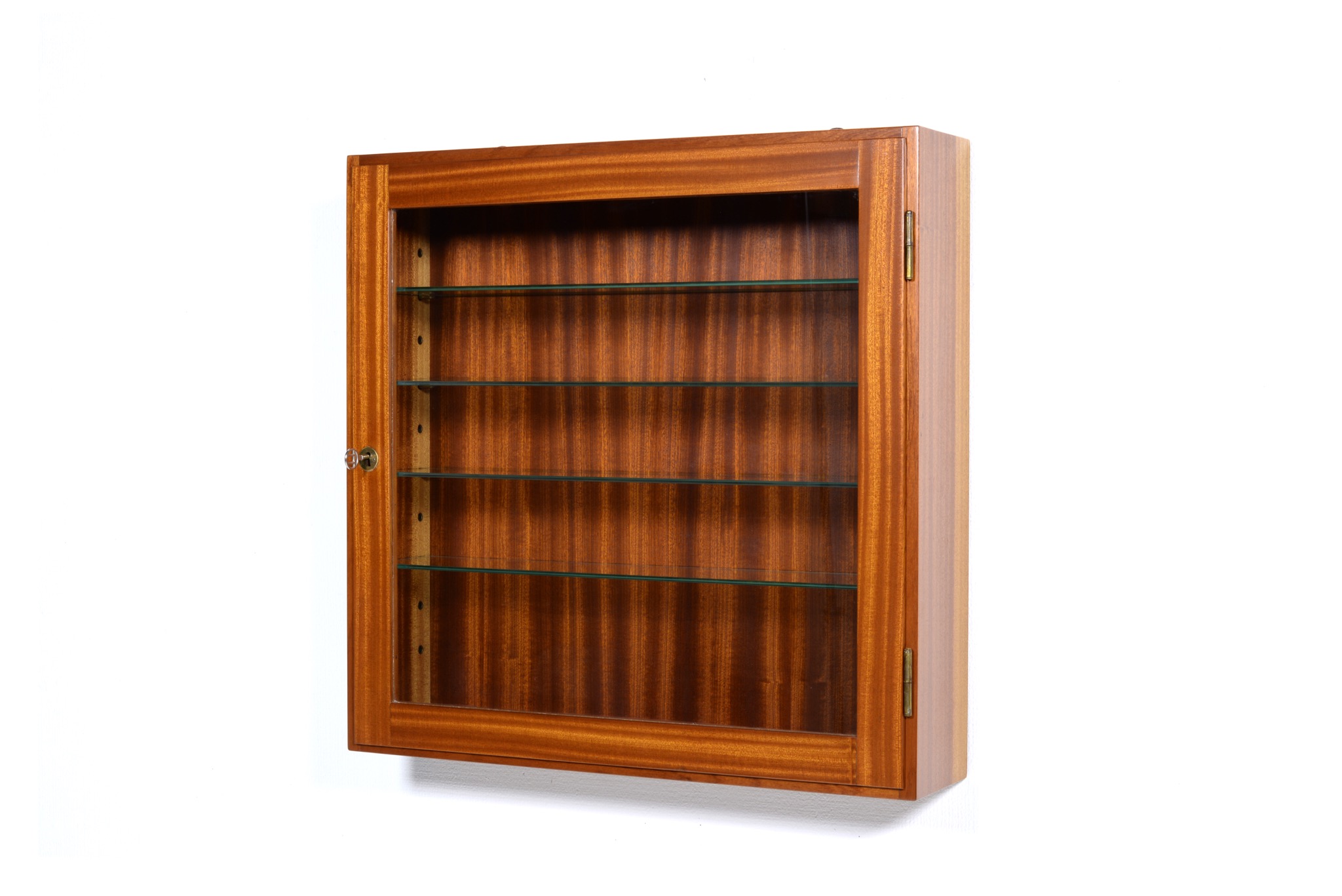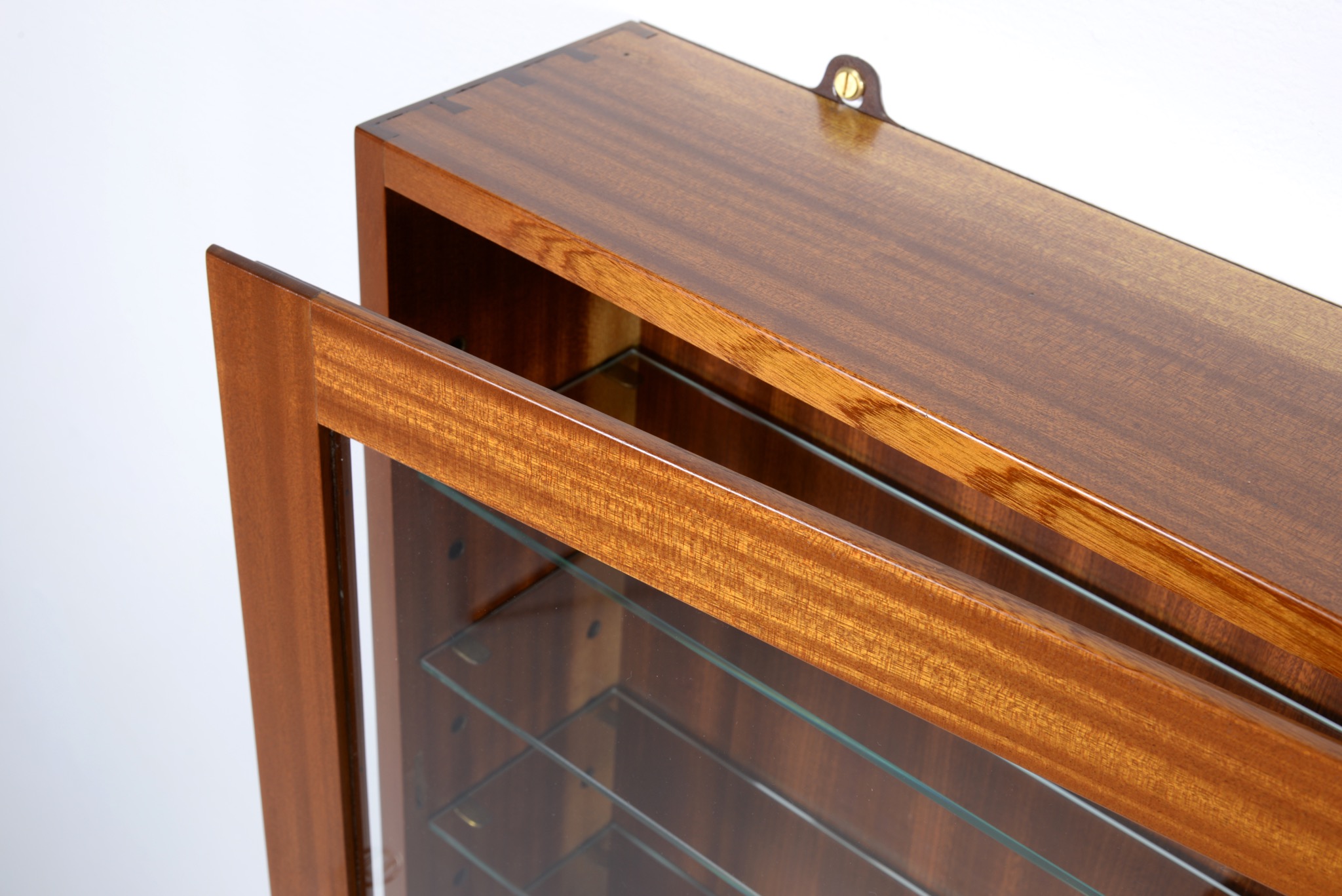 無垢のマホガニーを用いた壁掛け用キュリオケースです。工房などは分かっておりませんが、丁寧に作られたもので、1950年代頃に作られたものでしょう。ガラスの棚板は新たに作りました。壁付けの方法は二種類ございますので詳しくはお問い合わせください。