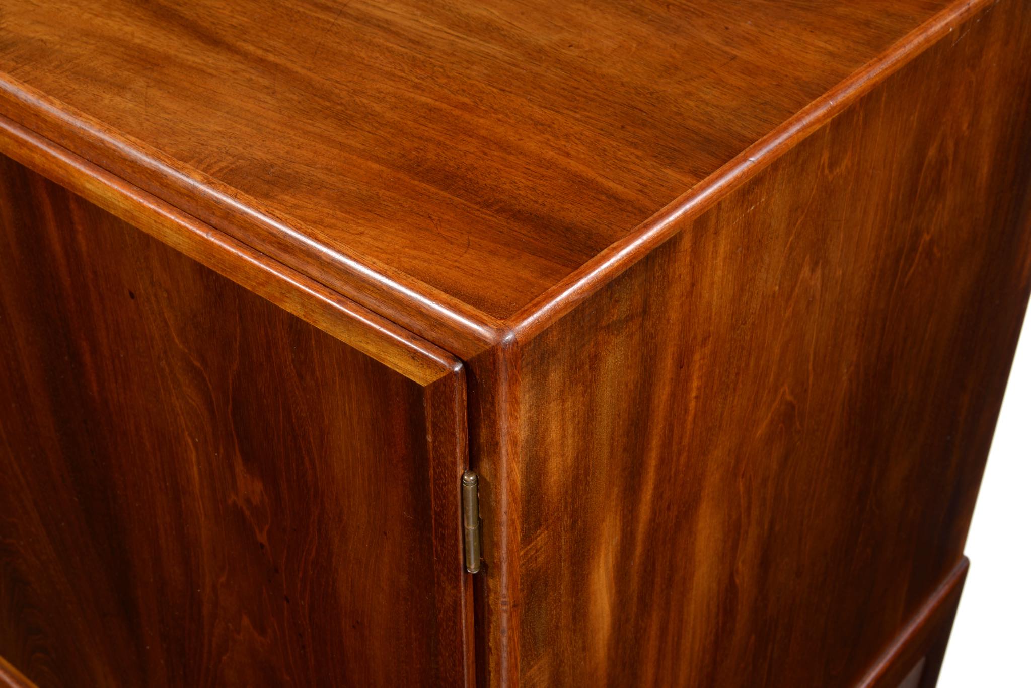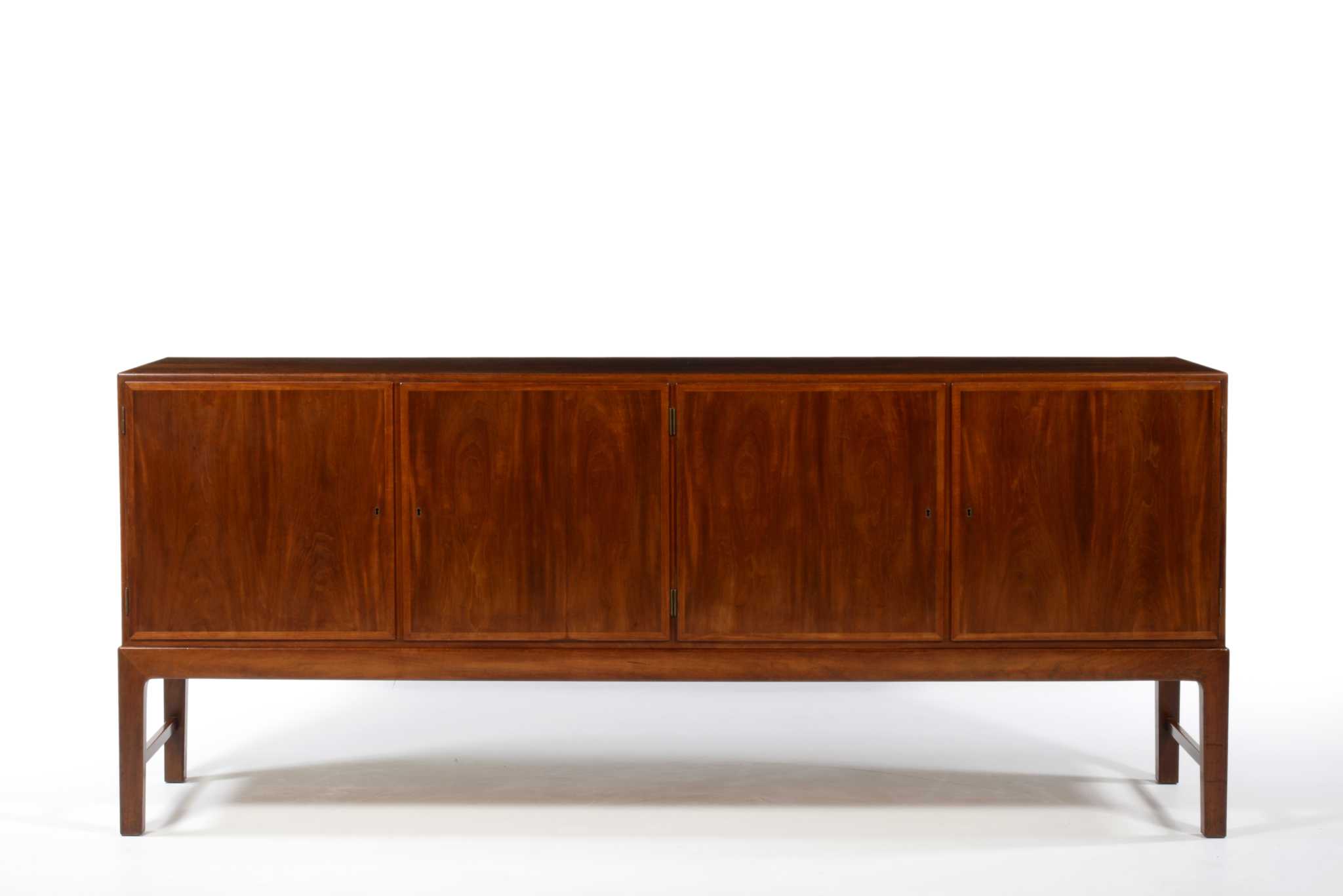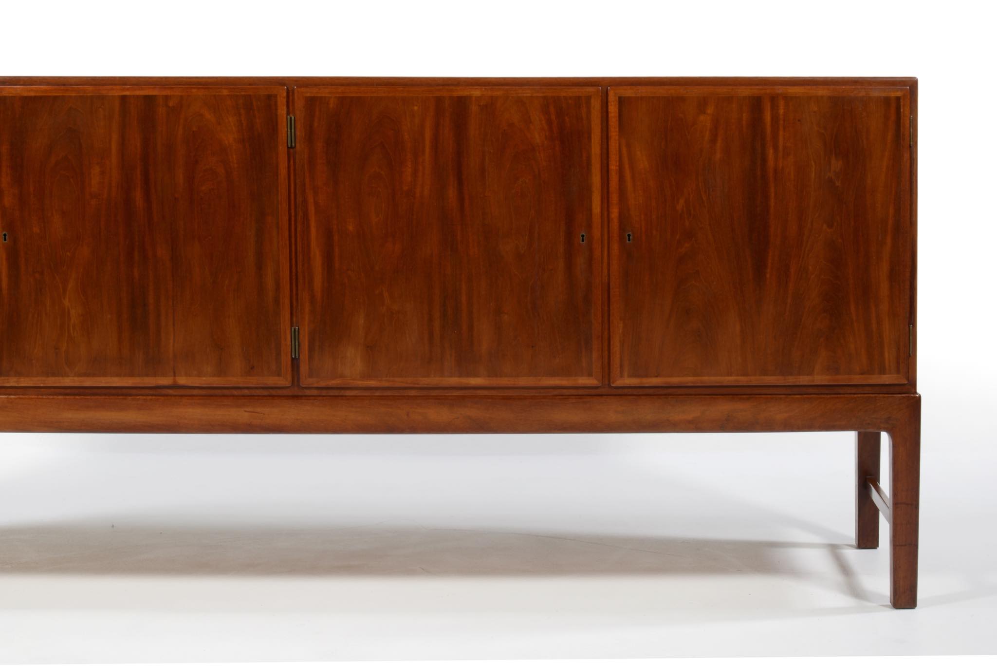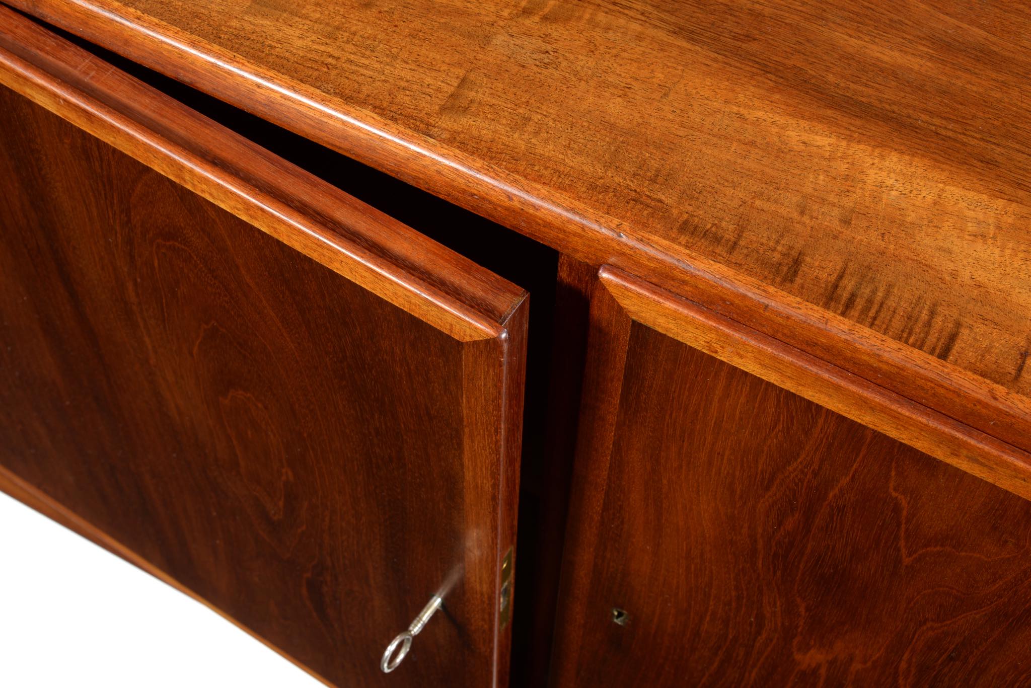 デンマークの家具工房にて作られたサイドボードキャビネットです。後掲のカップボードと同じ工房で作られたもので、1940年代頃の製作品でしょう。材はマホガニーと思われます。収納力があり、しっかりとした作りのものです。内部の棚板は取り外すことは可能ですが、位置を変えることができません。ご購入時であれば当店にて棚板位置を調整することも可能ですので、ご希望の際にはお申し付けください。天板などにわずかな擦り傷などが見られますが、きれいな状態です。