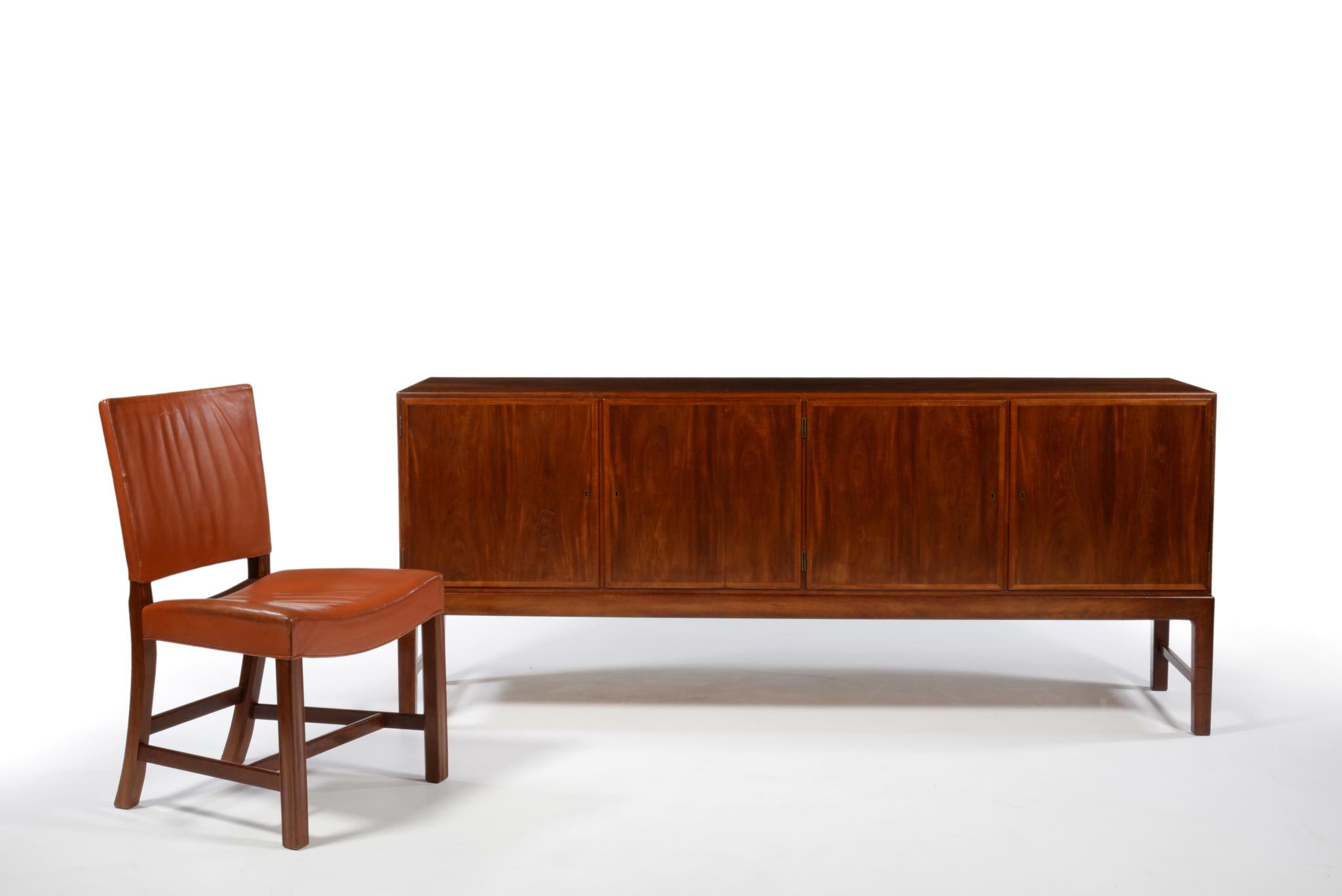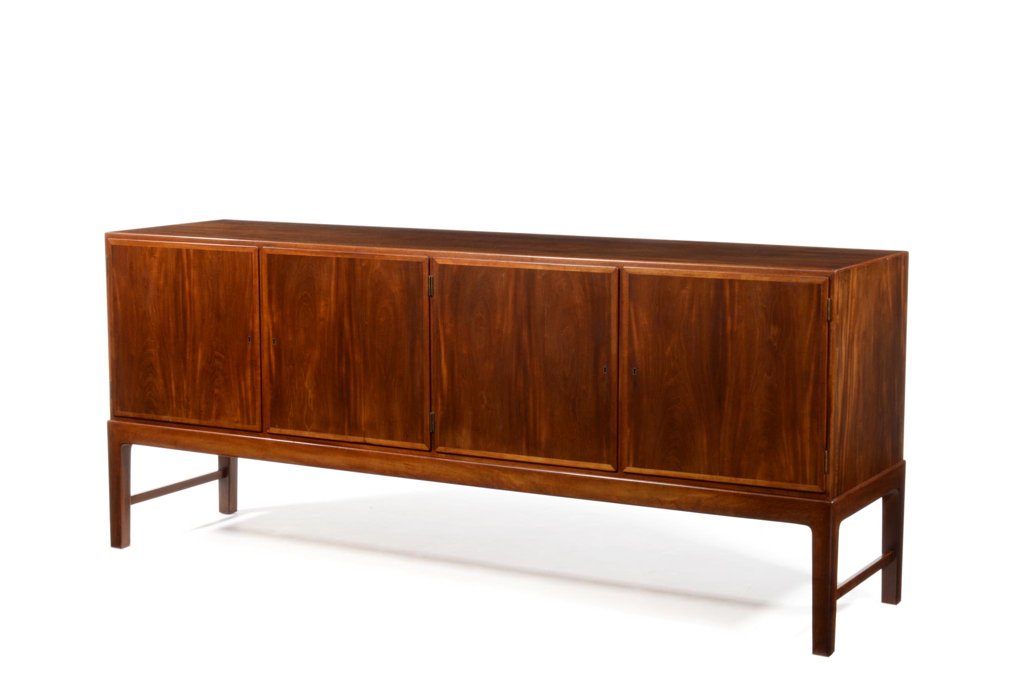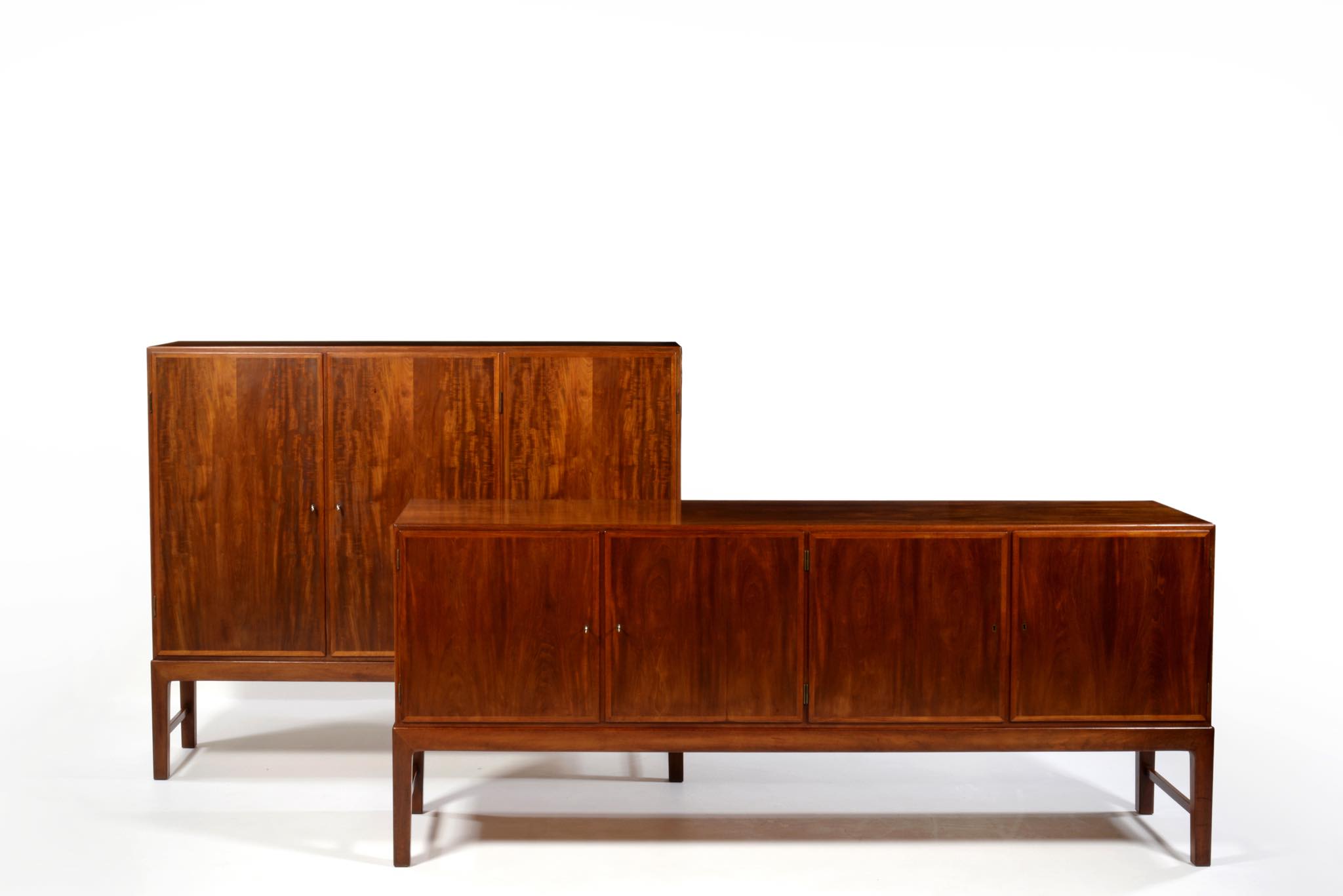 デンマークの家具工房にて作られたサイドボードキャビネットです。後掲のカップボードと同じ工房で作られたもので、1940年代頃の製作品でしょう。材はマホガニーと思われます。収納力があり、しっかりとした作りのものです。内部の棚板は取り外すことは可能ですが、位置を変えることができません。ご購入時であれば当店にて棚板位置を調整することも可能ですので、ご希望の際にはお申し付けください。天板などにわずかな擦り傷などが見られますが、きれいな状態です。