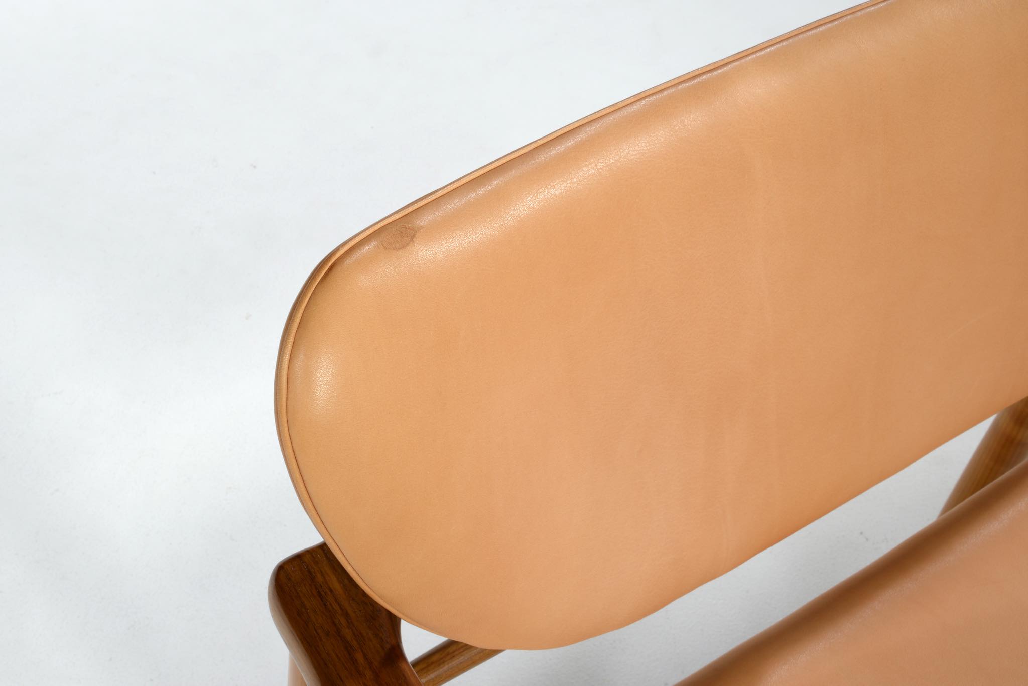デンマークを代表するデザイナー、Finn Juhl/フィン・ユールによる、1948年発表のセッティです。こちらは後年にフィン・ユール作品を手がけた名工、ニルス・ロス・アナセンによるもので、1980~90年代頃に作られたものでしょう。フレームはウォルナットとチェリー材のコンビネーションで、木質の特徴が際立っています。シートの皮革はオリジナルのようで、若干の傷や染みが見られますが、概ねきれいな状態です。