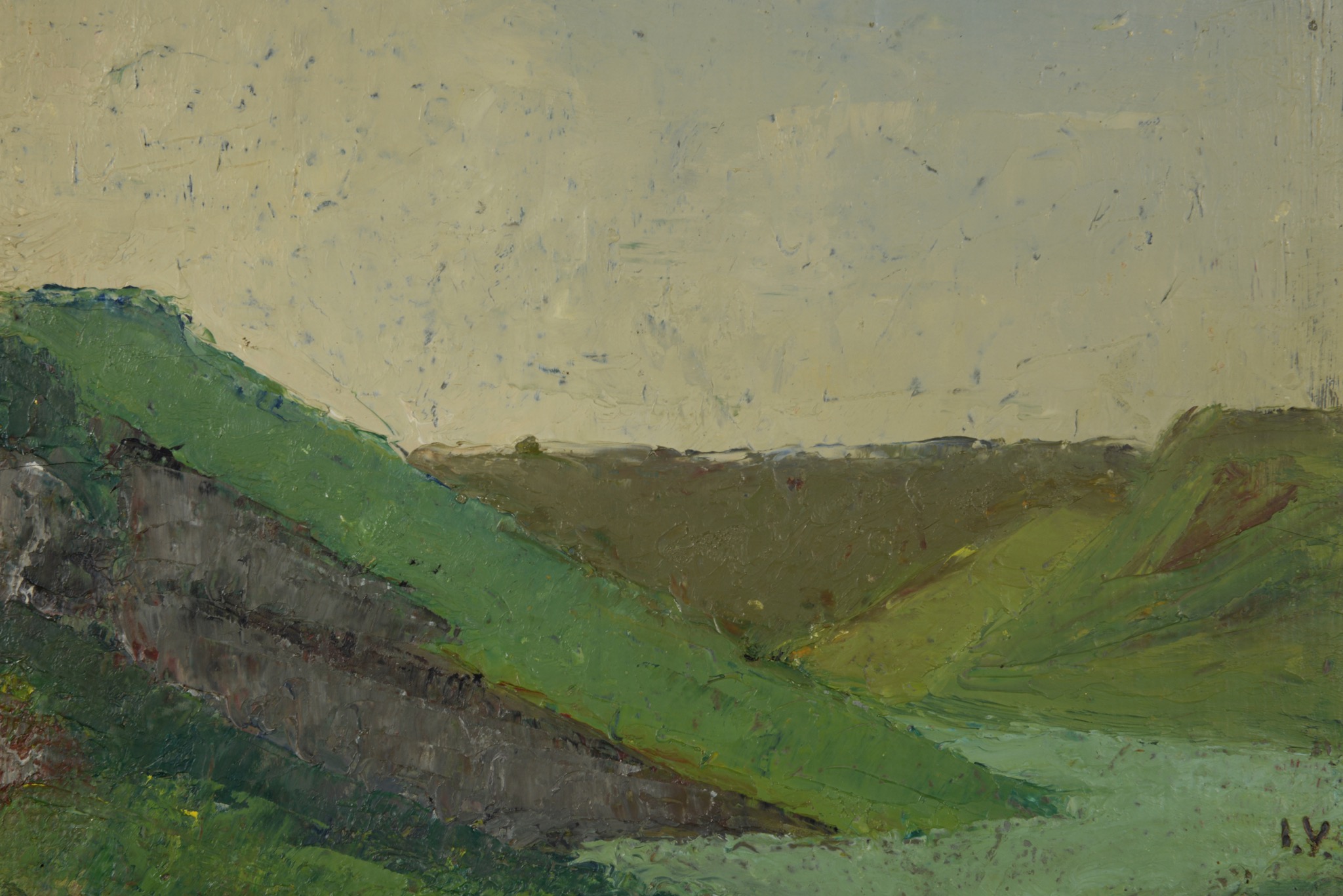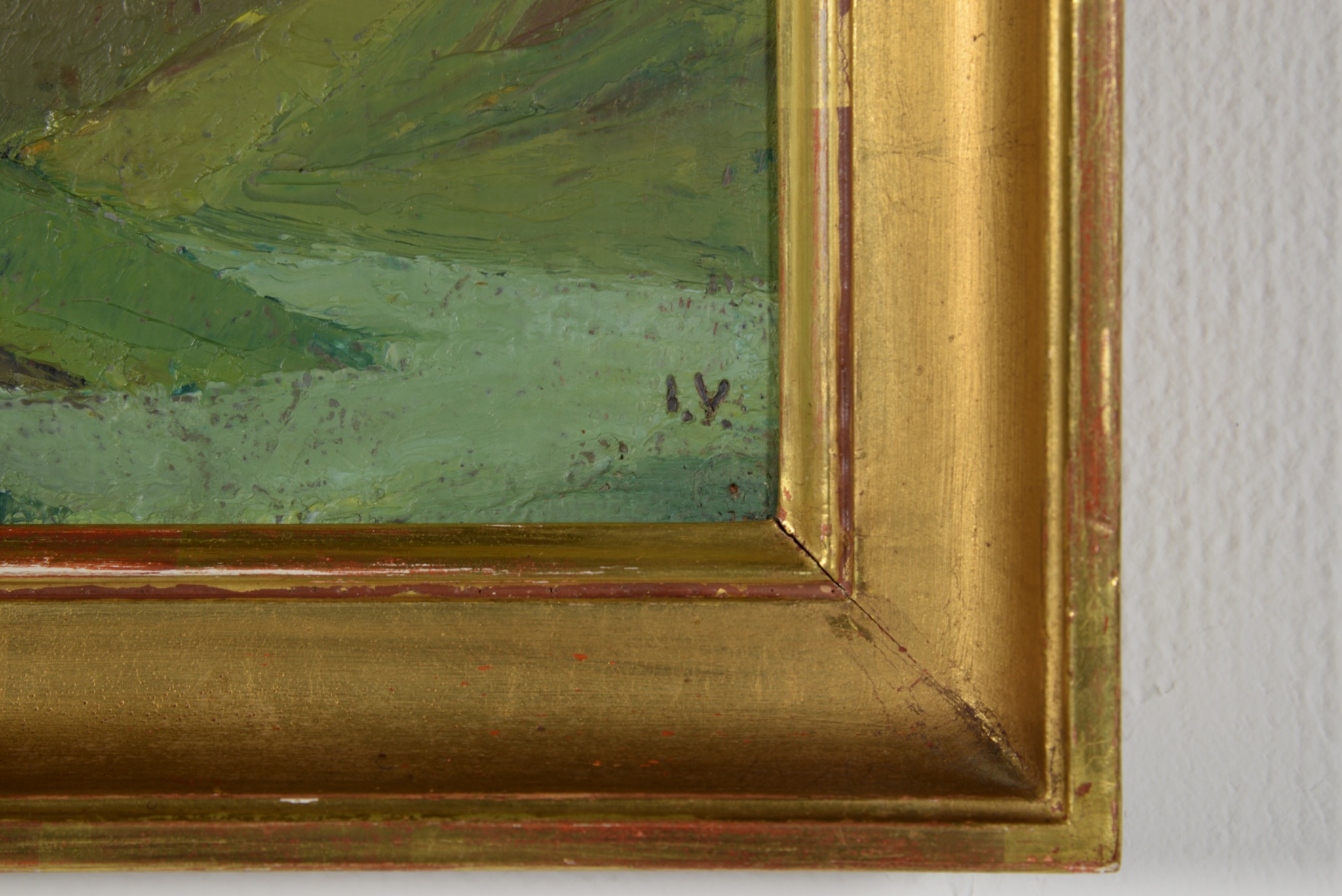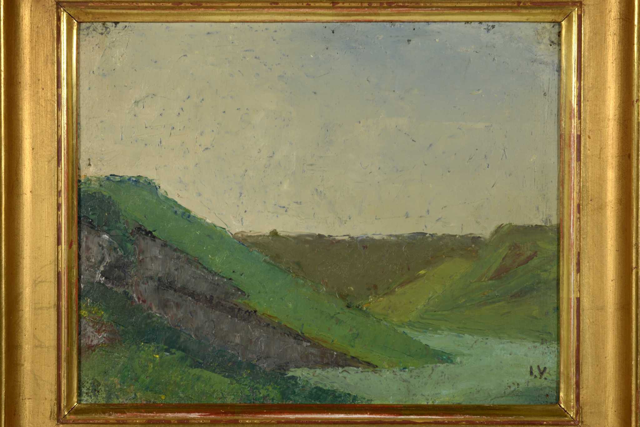 デンマークの画家、イェッペ・ヴォンティリウスによる風景画油彩作品です。これまであまり見たことのない小振りなサイズ感のもので、雲の多い日の丘陵地帯が描かれています。フレームはオリジナルのようで、金箔が全体を引き締めています。コンディションは良好です。