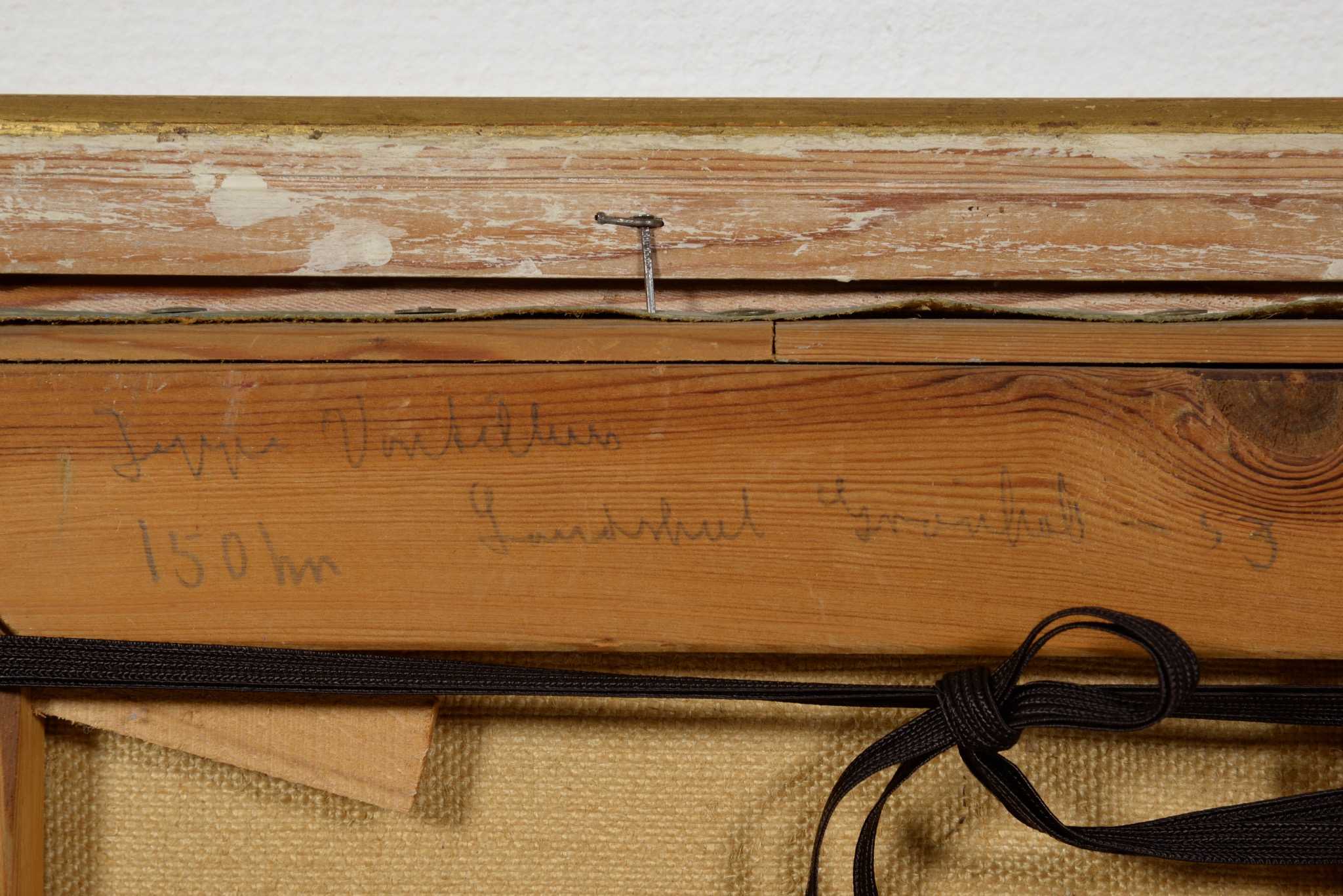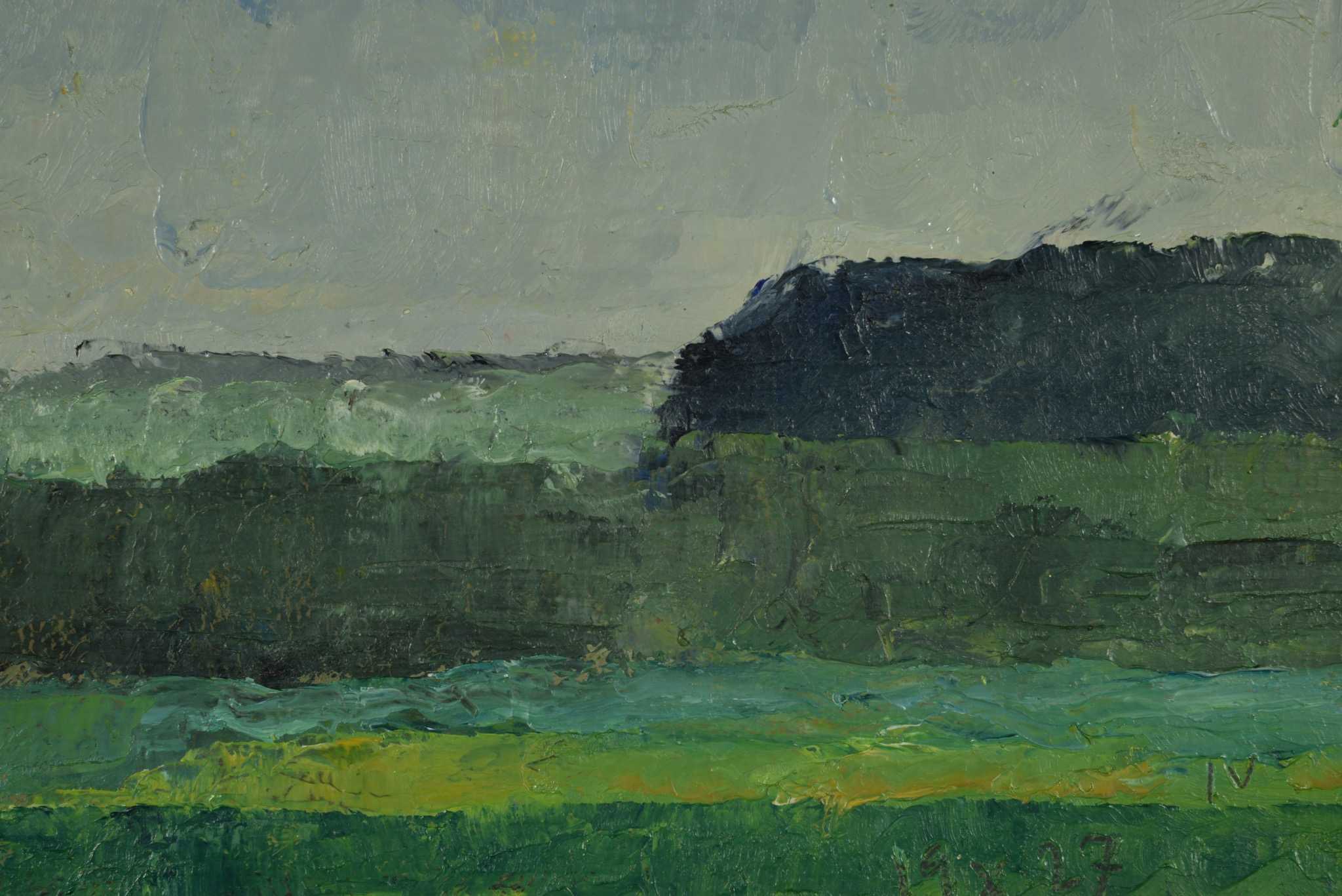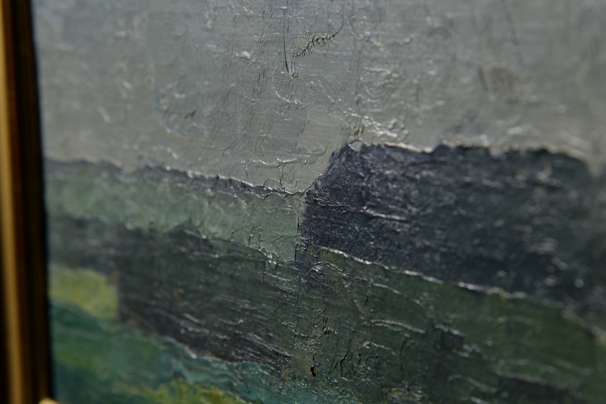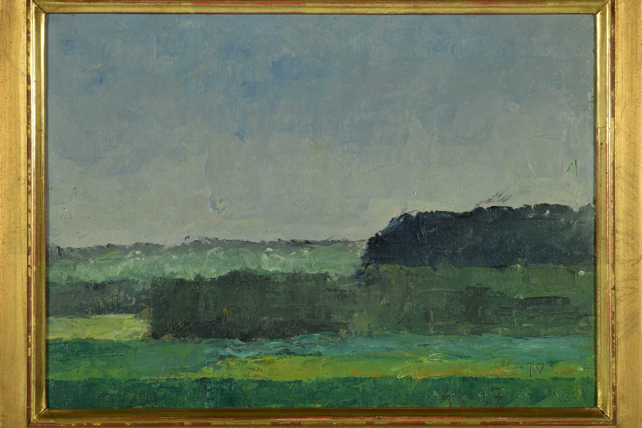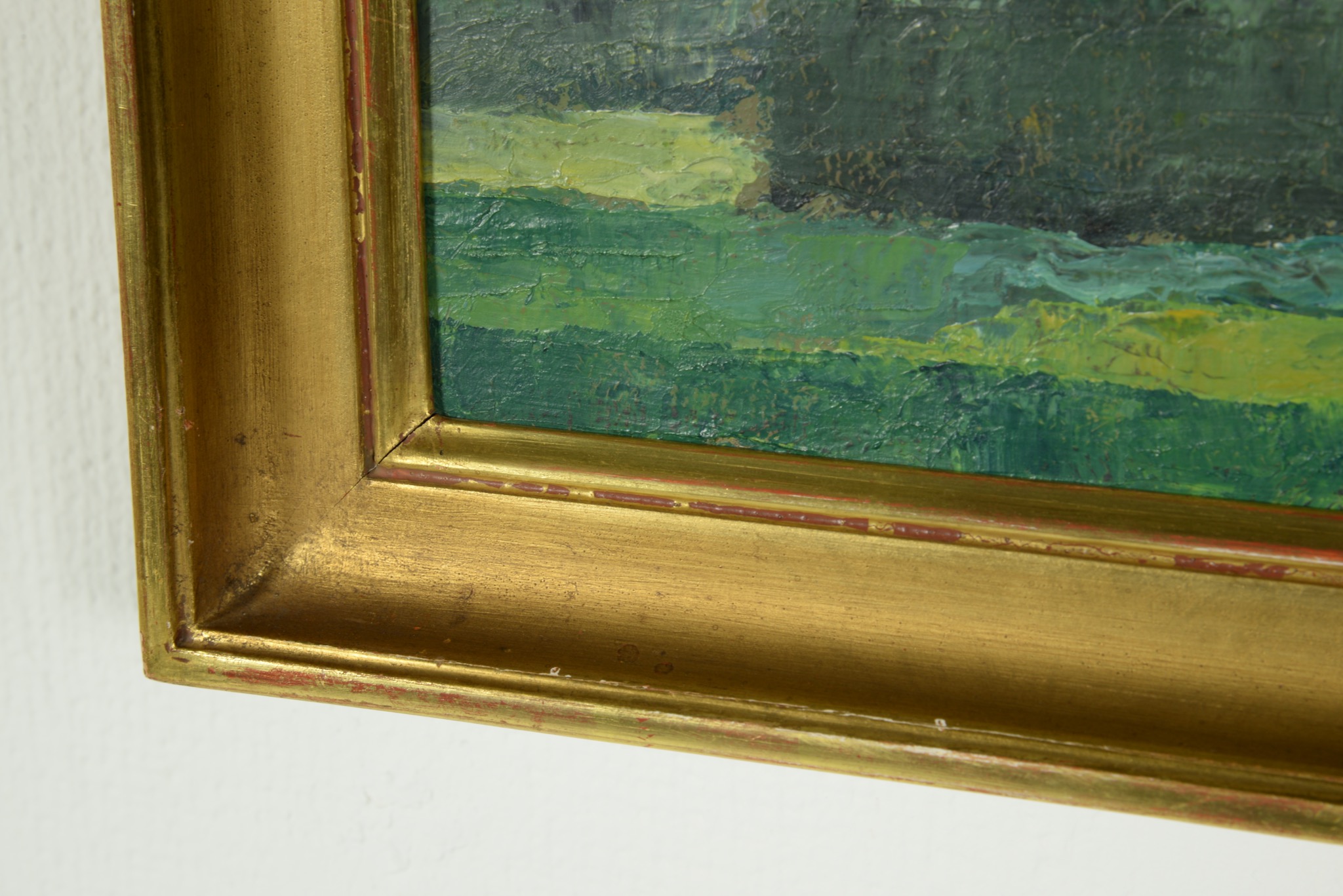 デンマークの画家、イェッペ・ヴォンティリウスによる風景画油彩作品です。これまであまり見たことのない小振りなサイズ感のもので、青々とした草原が描かれています。画面に描かれた「19x27」はキャンバスのサイズのようですが、描き込んだ理由はわかりません。フレームはオリジナルのようで、箔の金彩と風景の濃緑がマッチしています。コンディションは良好です。