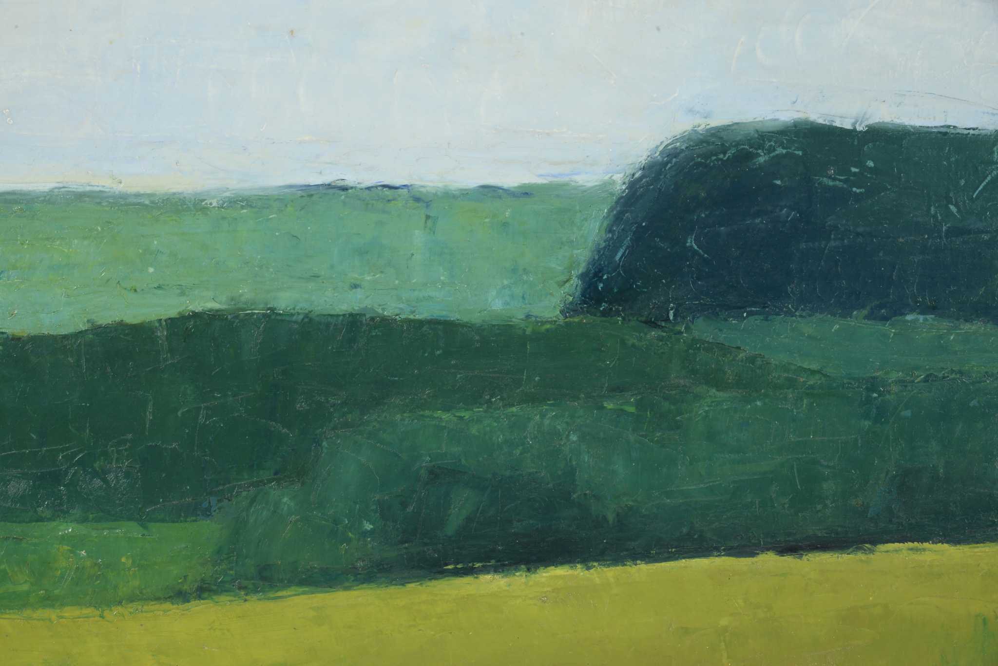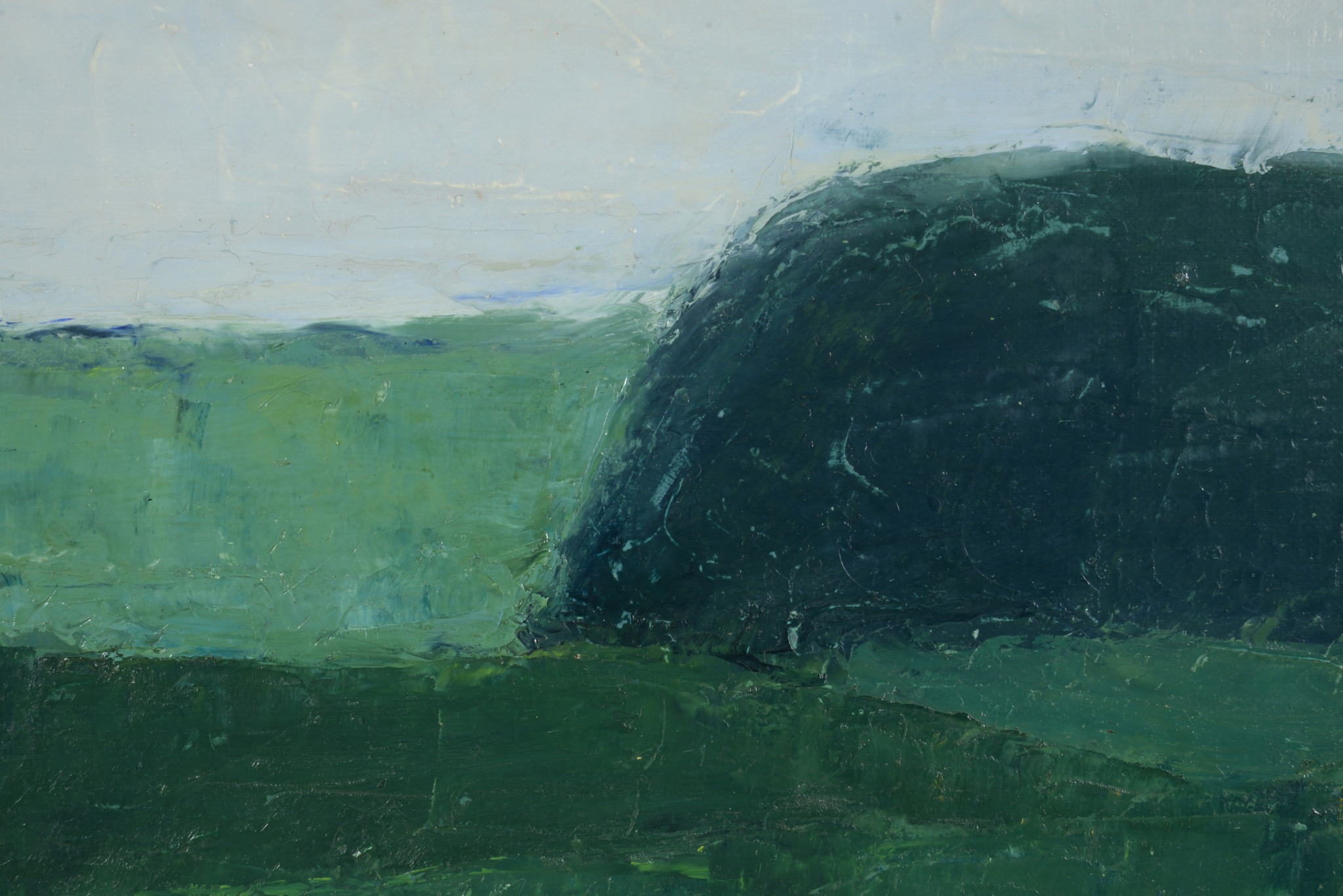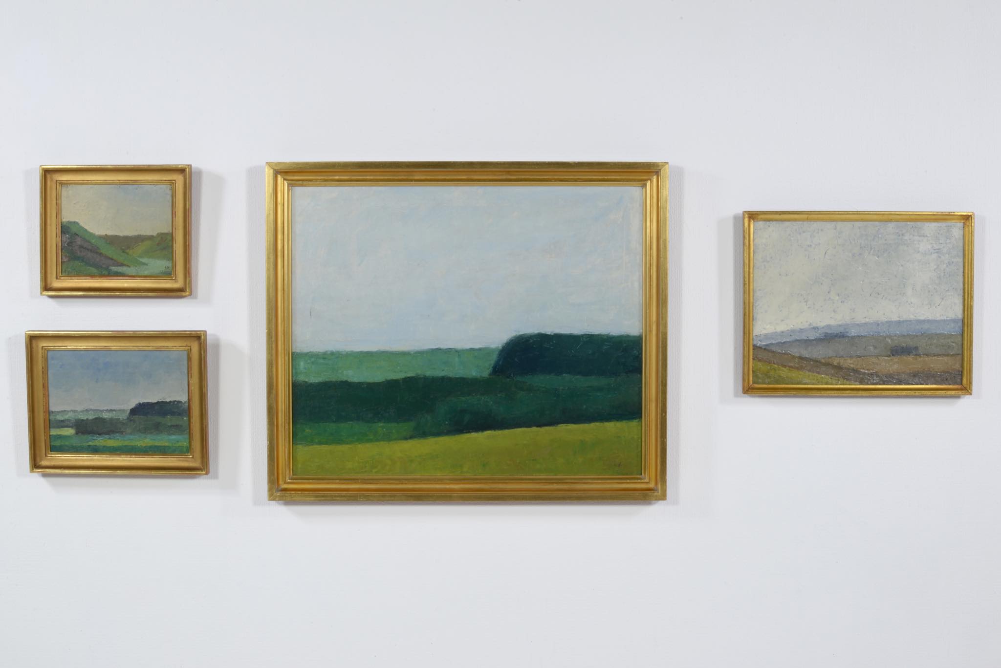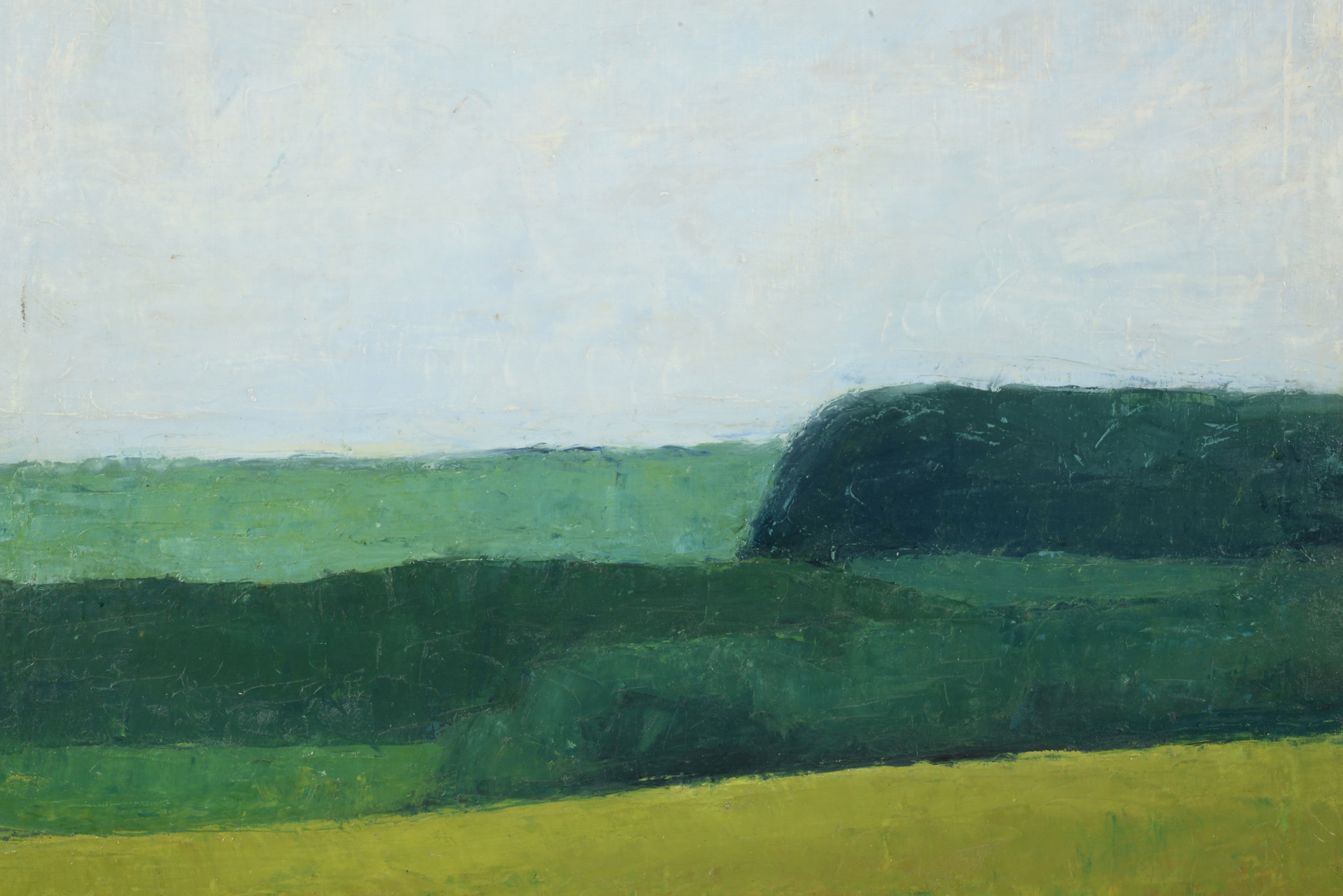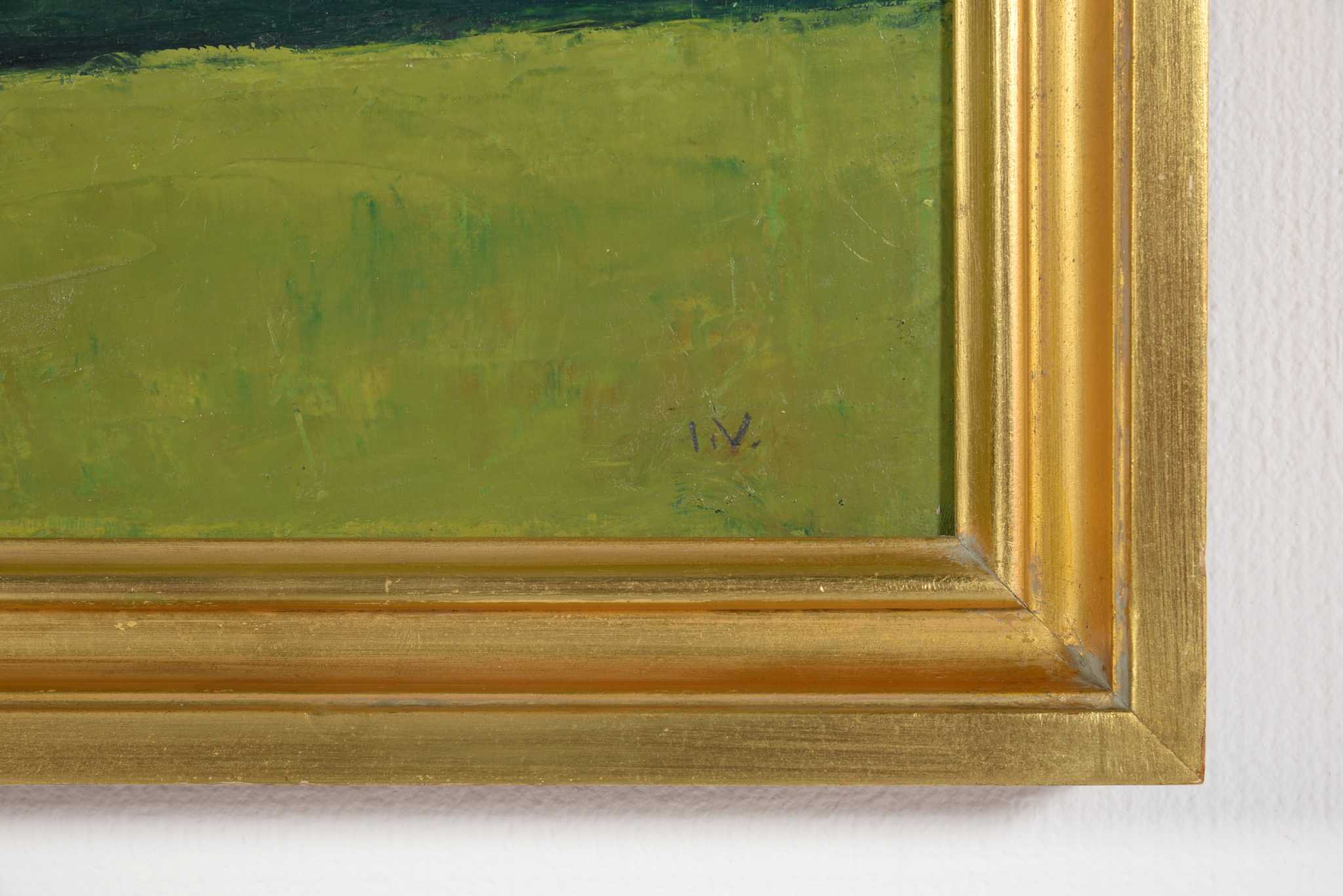 デンマークの画家、イェッペ・ヴォンティリウスによる風景画油彩作品です。青々とした季節の広大な農村地帯が描かれており、春の湿った大気感を感じる作品です。手前には散る頃の菜の花が描かれているようです。IVの風景画としては大ぶりなサイズ感の作品で、1957年の美術展に出展された記録があり、かつては司祭の所有だったようですが、詳しいことはわかりません。箔のフレームには小傷など見られます。キャンバスの張りに問題はなく、作品自体は良い状態です。