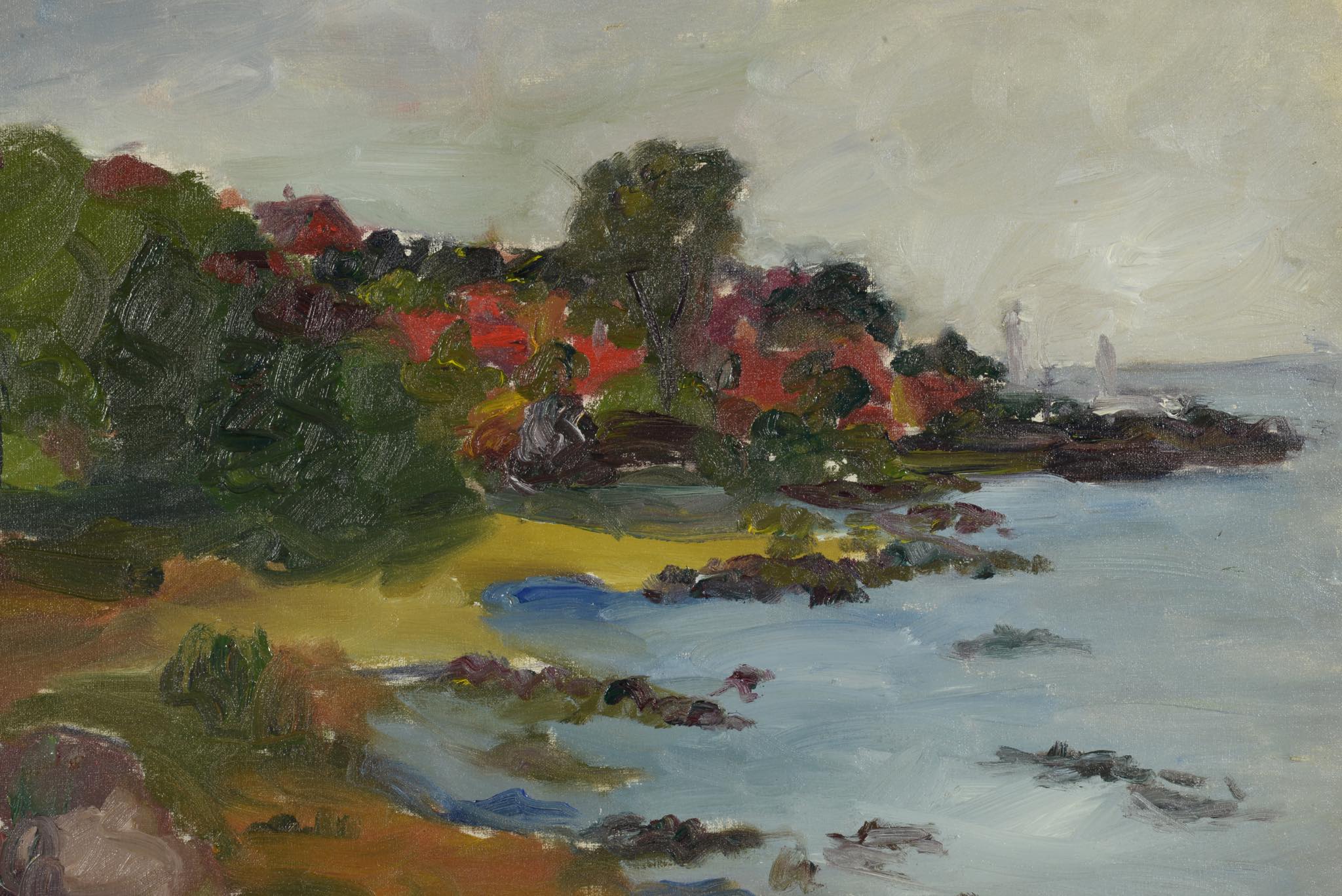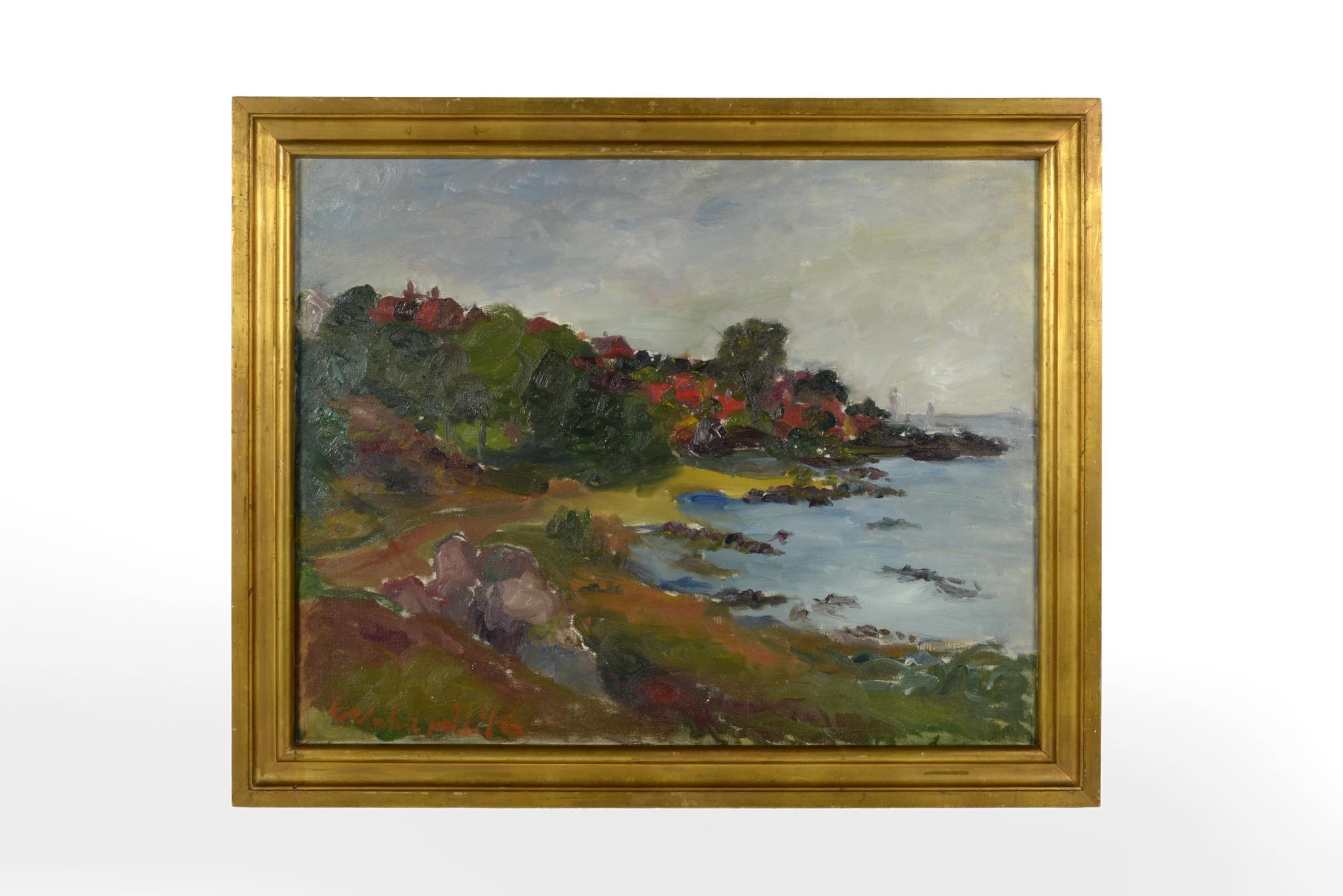 デンマークの風景画家、Eckhardt Johnsen/エックハルト・ヨンセンによる風景画油彩作品です。1946年に描かれた作品で、デンマークのボーンホルム島の海岸沿いを描いています。フレームはオリジナルのようで、それなりに経年感が見られますが、目立ったダメージはありません。フレームを変える事でまた印象も異なるでしょう。