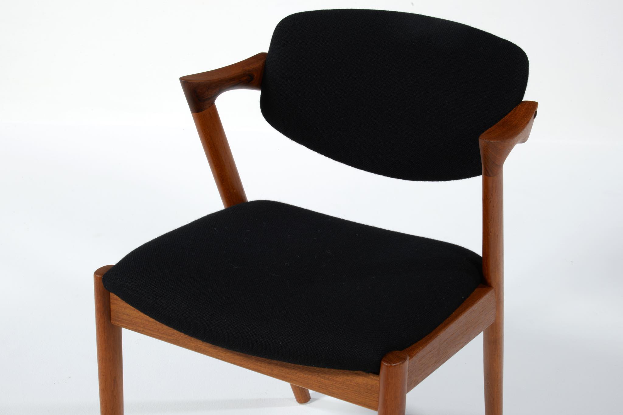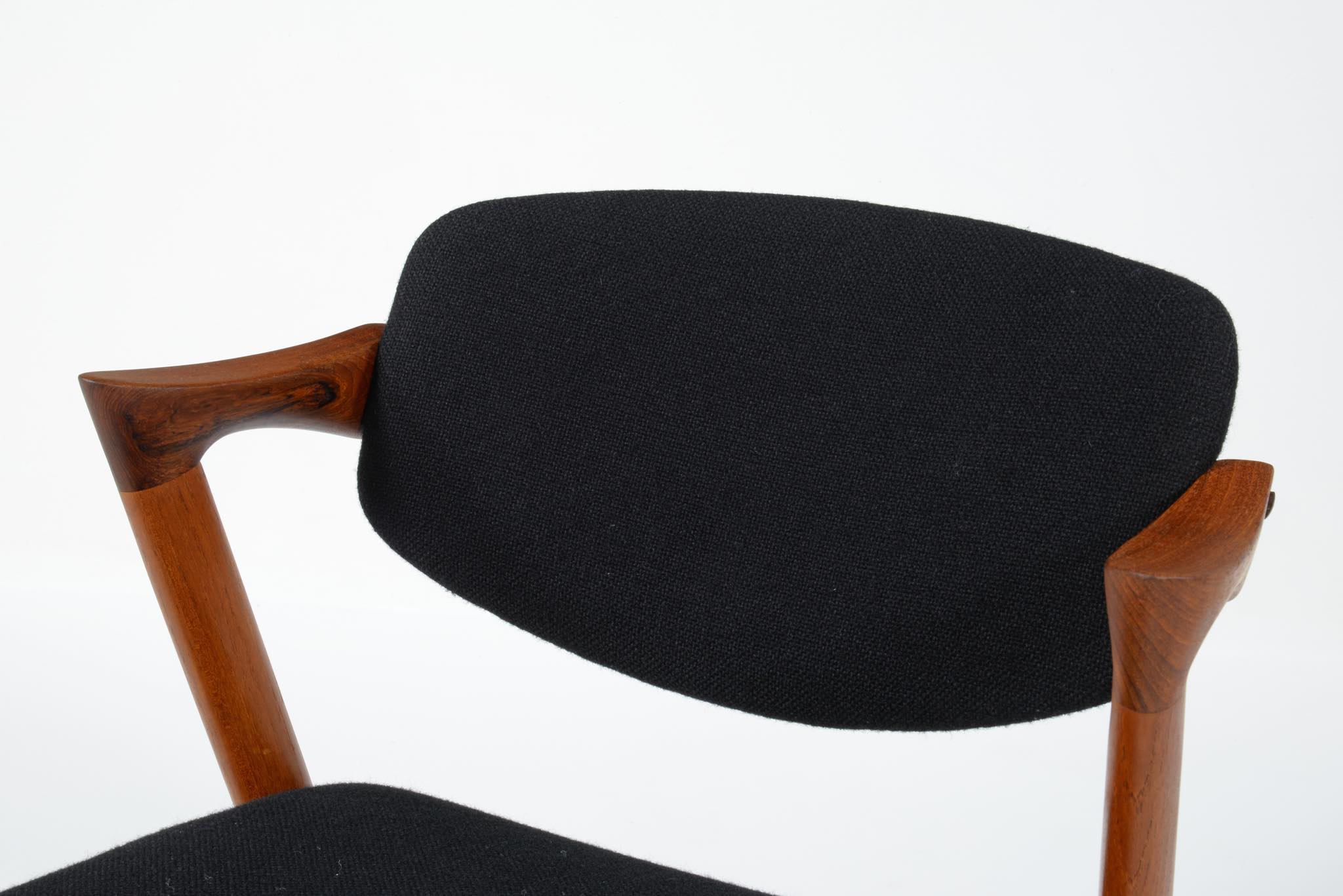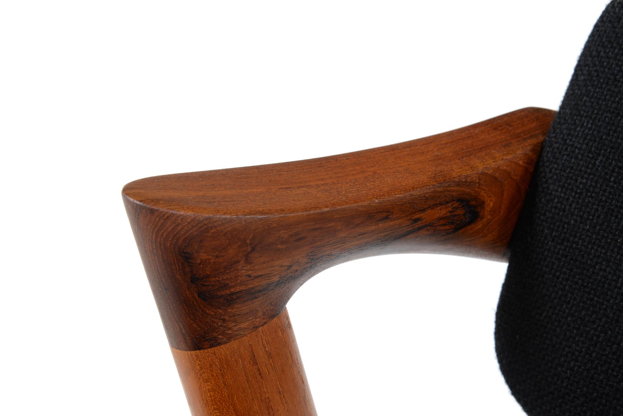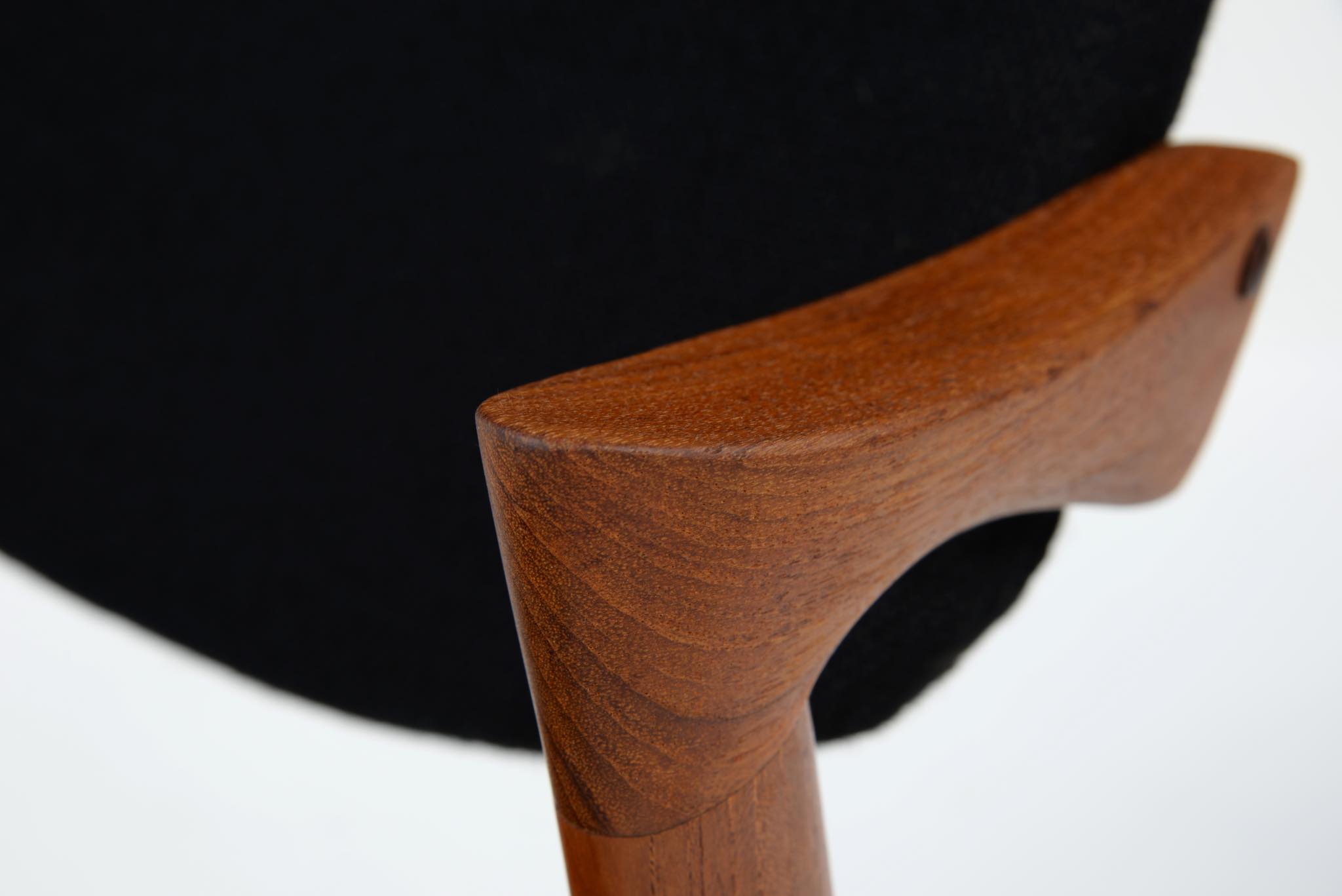 デンマークの家具デザイナー、Kai Kristiansen/カイ・クリスチャンセンによる名作椅子 ”no.42” チーク材です。座る人の姿勢に合わせて可動する背もたれと、立ち上がりやすい小さな肘掛け”ハーフアーム”が特徴の椅子です。シートは買い付けの時点で黒色のウールファブリックが張られておりますが、最近デンマークにて張り替えられたようで、傷みなどなく状態は良いようです。専門職によって生地と内部ウレタンに洗浄水を潜らせるというクリーニングを施しました。張り替えも可能ですのでご相談ください。