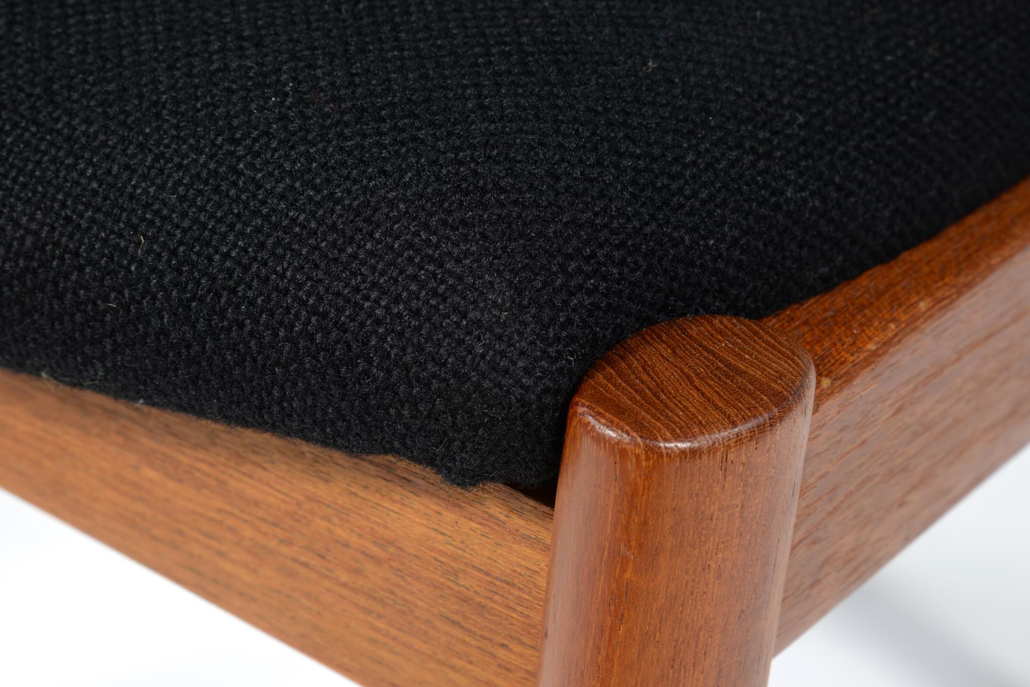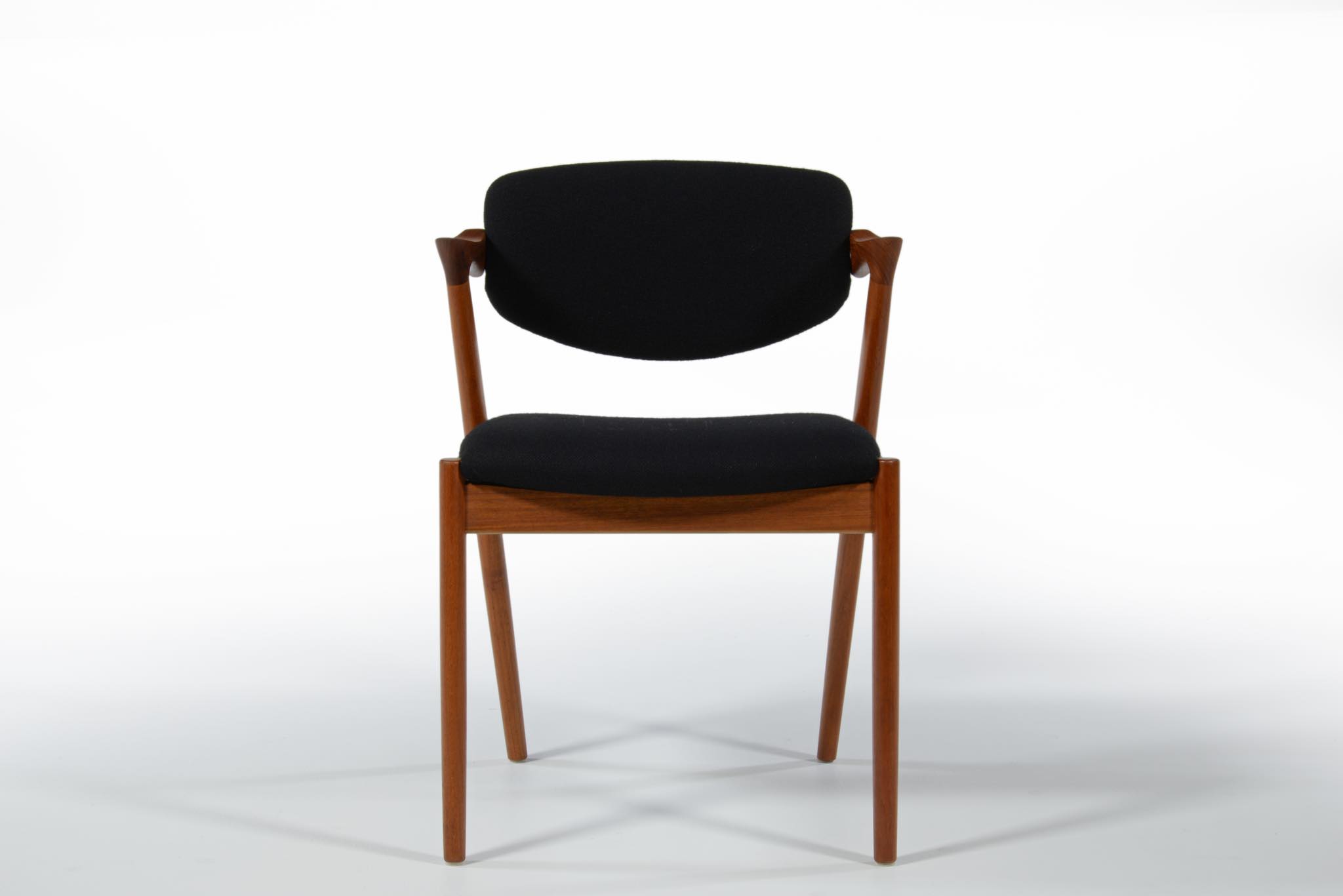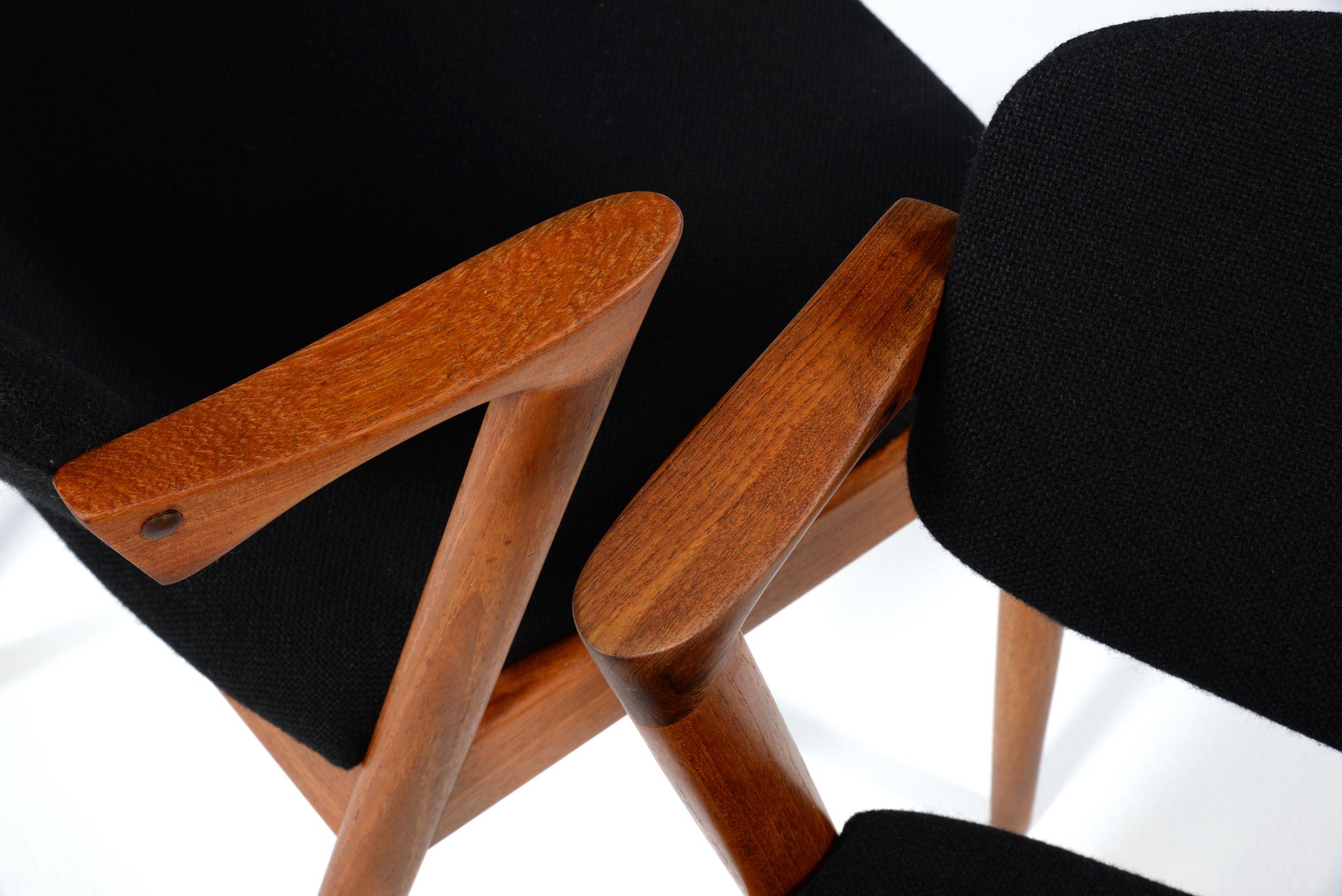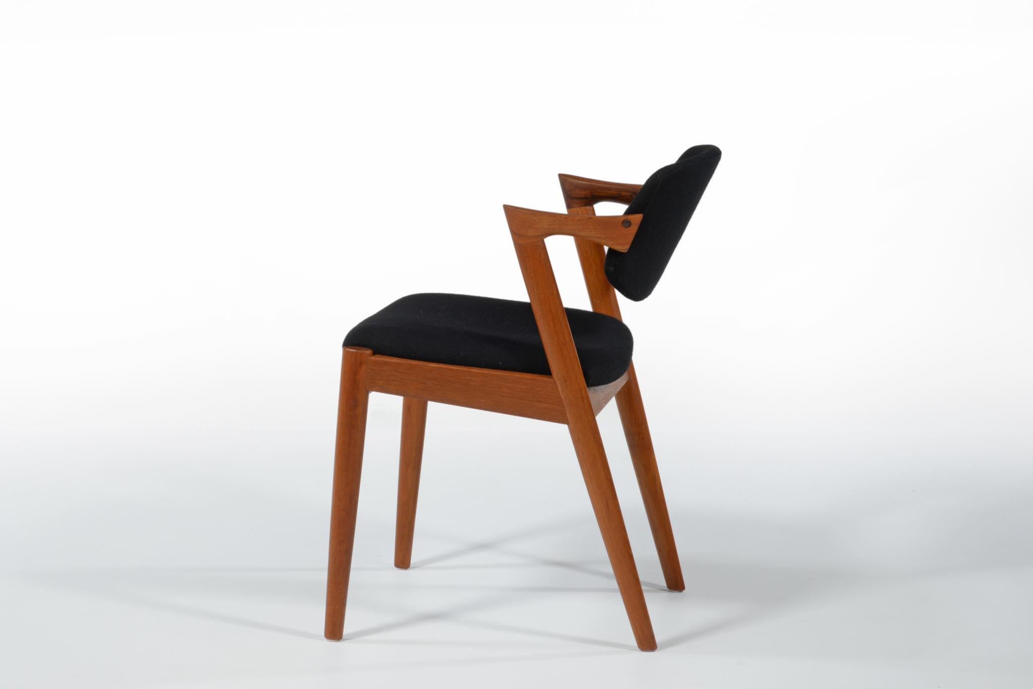 デンマークの家具デザイナー、Kai Kristiansen/カイ・クリスチャンセンによる名作椅子 ”no.42” チーク材です。座る人の姿勢に合わせて可動する背もたれと、立ち上がりやすい小さな肘掛け”ハーフアーム”が特徴の椅子です。シートは買い付けの時点で黒色のウールファブリックが張られておりますが、最近デンマークにて張り替えられたようで、傷みなどなく状態は良いようです。専門職によって生地と内部ウレタンに洗浄水を潜らせるというクリーニングを施しました。張り替えも可能ですのでご相談ください。