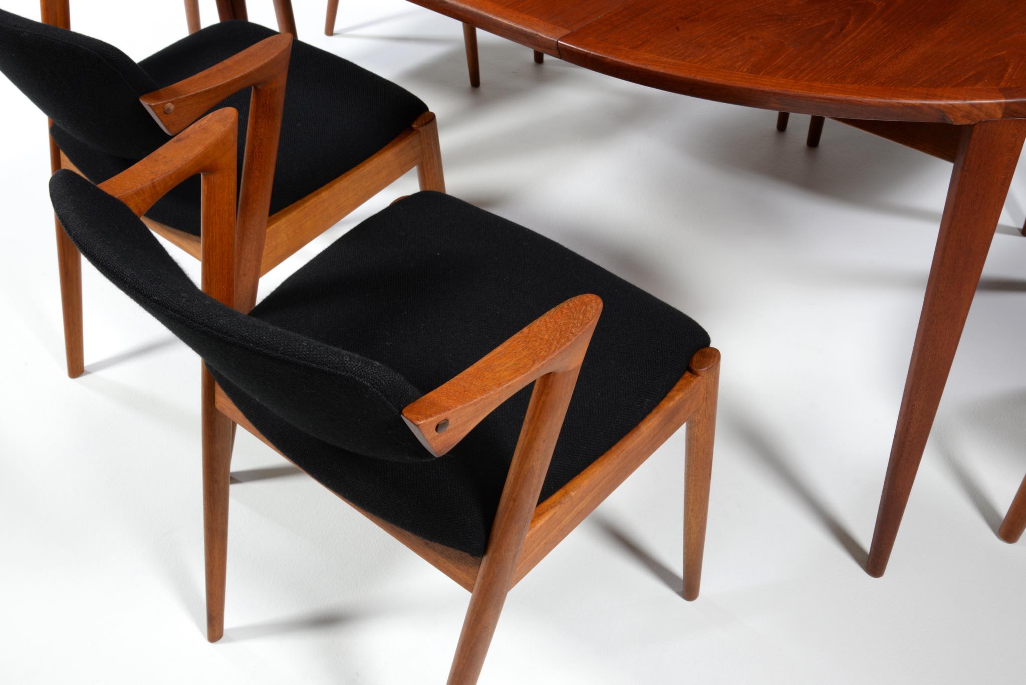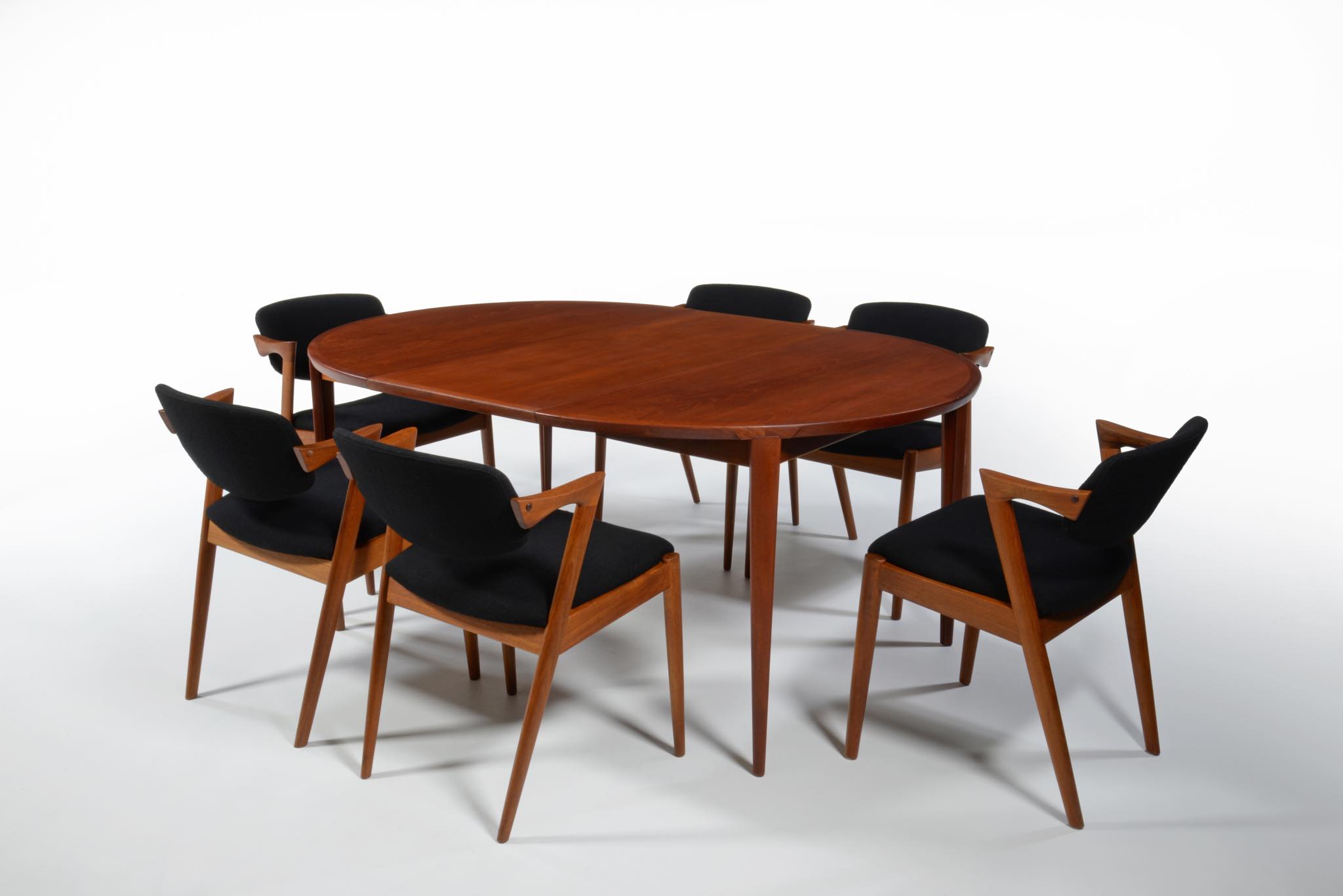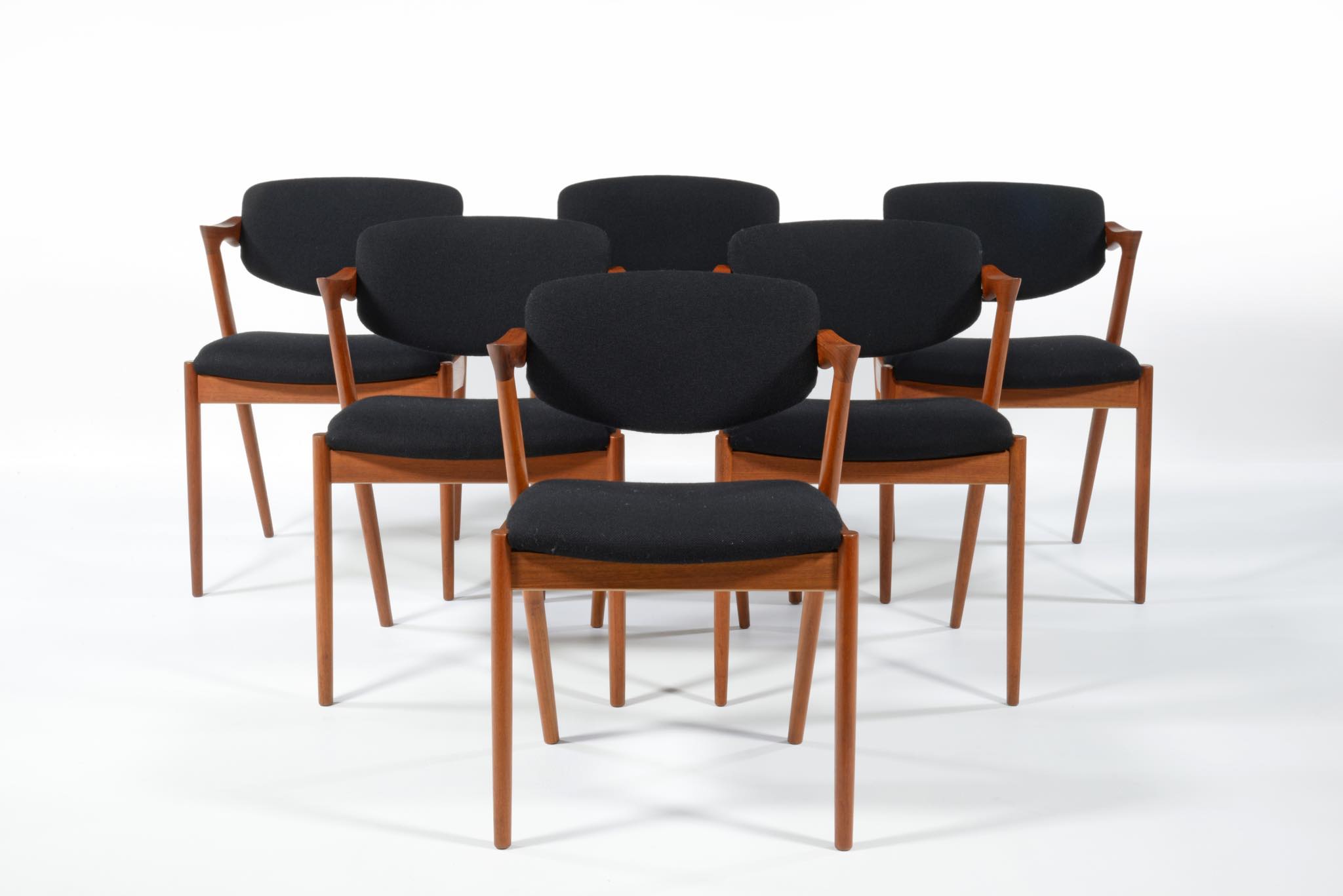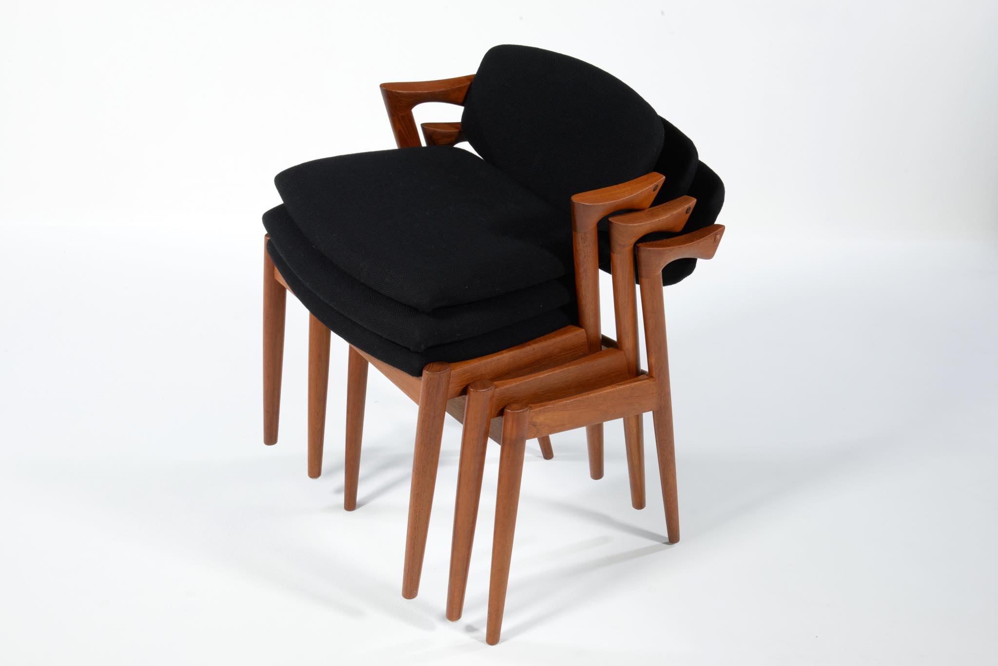 デンマークの家具デザイナー、Kai Kristiansen/カイ・クリスチャンセンによる名作椅子 ”no.42” チーク材です。座る人の姿勢に合わせて可動する背もたれと、立ち上がりやすい小さな肘掛け”ハーフアーム”が特徴の椅子です。シートは買い付けの時点で黒色のウールファブリックが張られておりますが、最近デンマークにて張り替えられたようで、傷みなどなく状態は良いようです。専門職によって生地と内部ウレタンに洗浄水を潜らせるというクリーニングを施しました。張り替えも可能ですのでご相談ください。