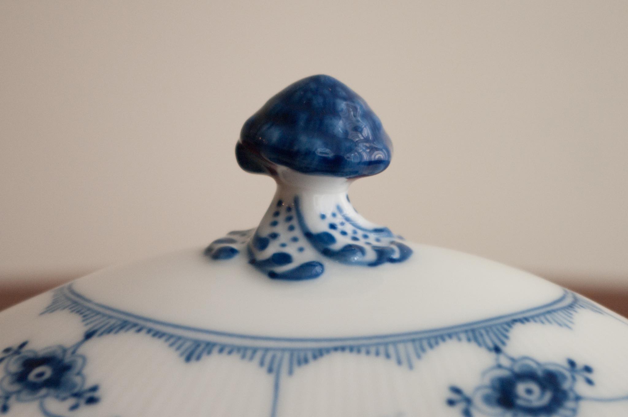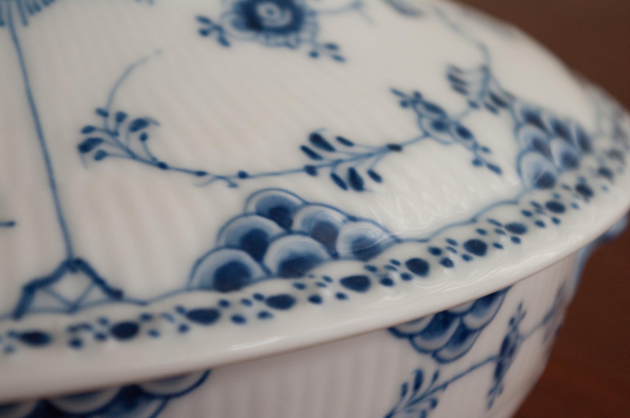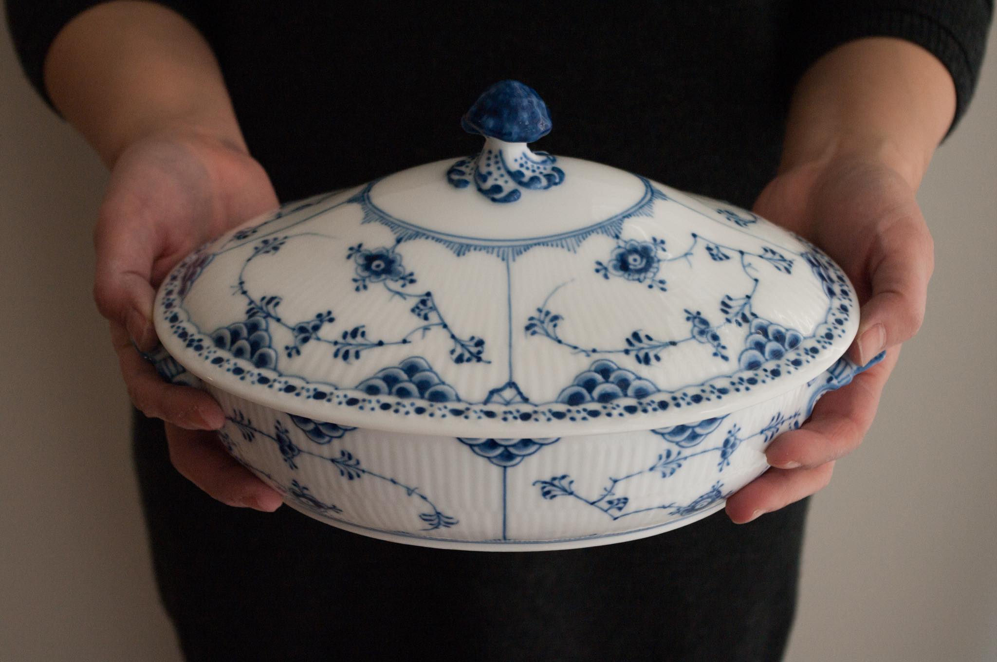 Royal Copenhagen/ロイヤル・コペンハーゲン窯、Blue fluted/ブルーフルーテッドシリーズ、Half lace/ハーフレースのチューリンで、1922~34年の間に焼成されたものです。小ぶりなサイズ感で、華麗な雰囲気でありながらレースの繊細な模様が相まって可愛らしさも合わせもっています。オブジェとして飾りたくなる佇まいです。