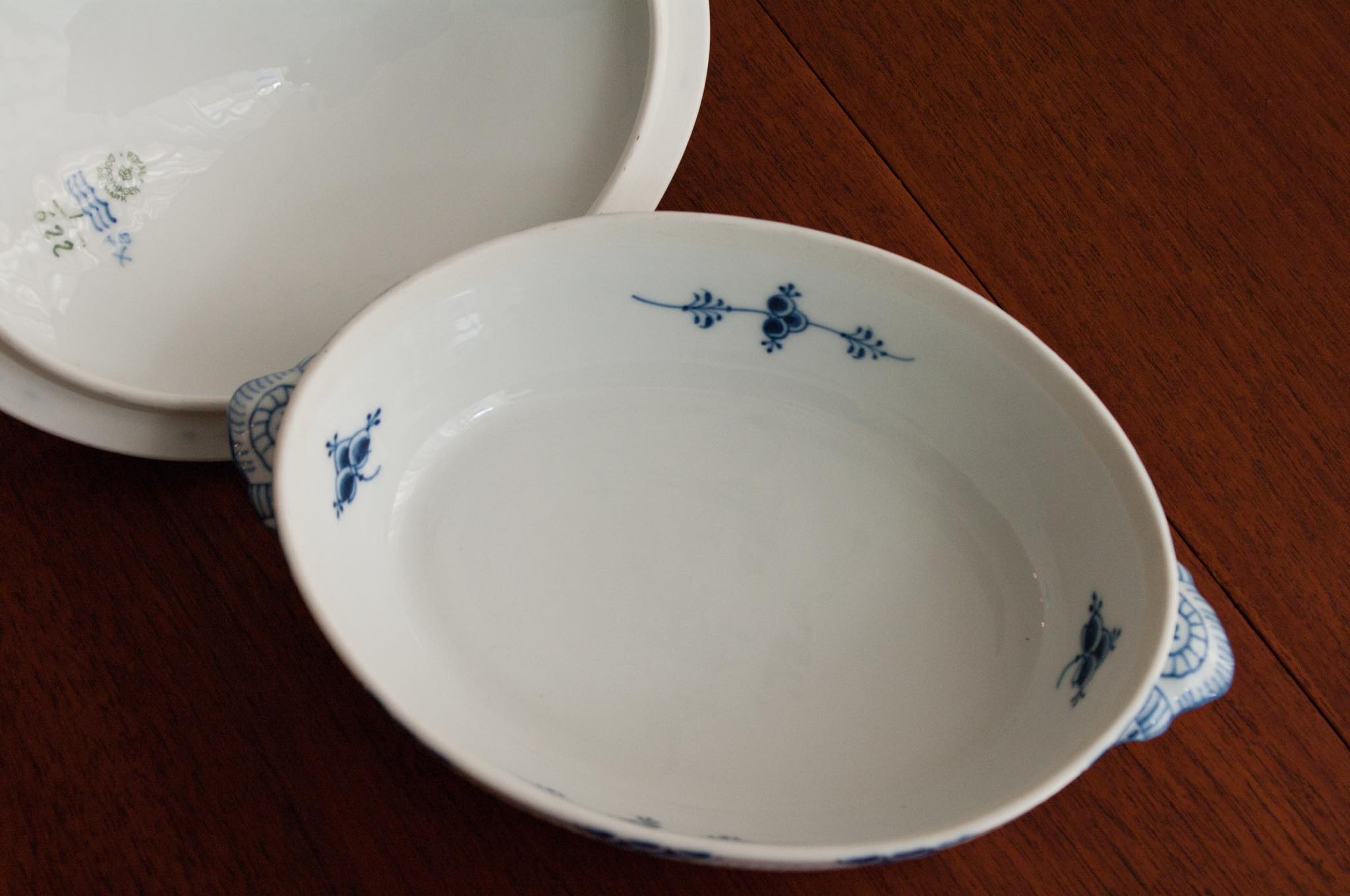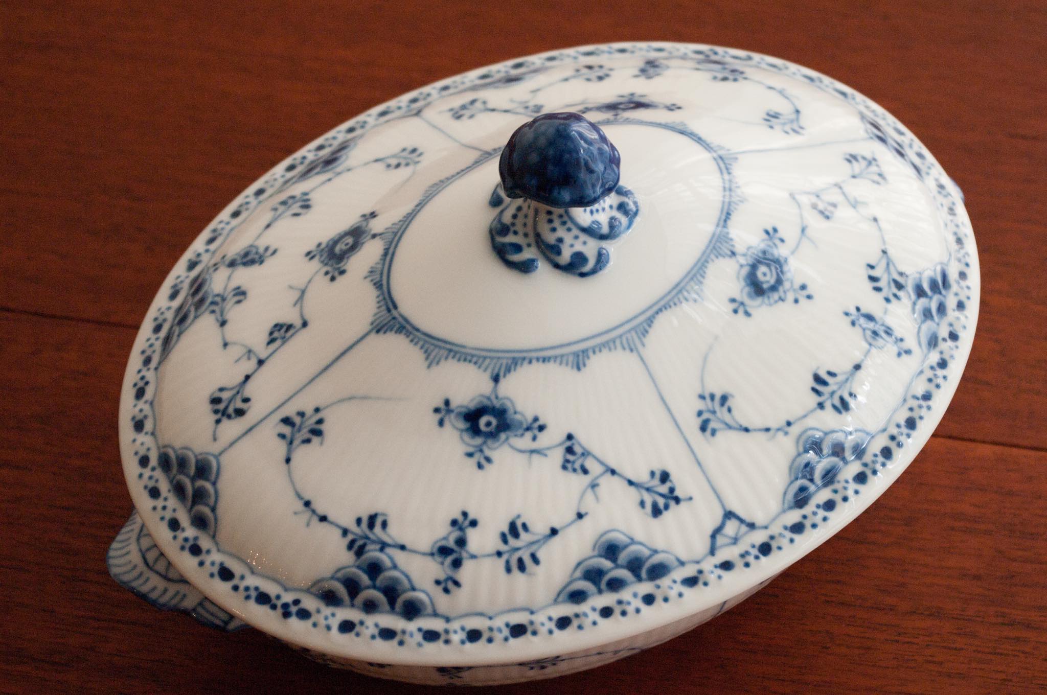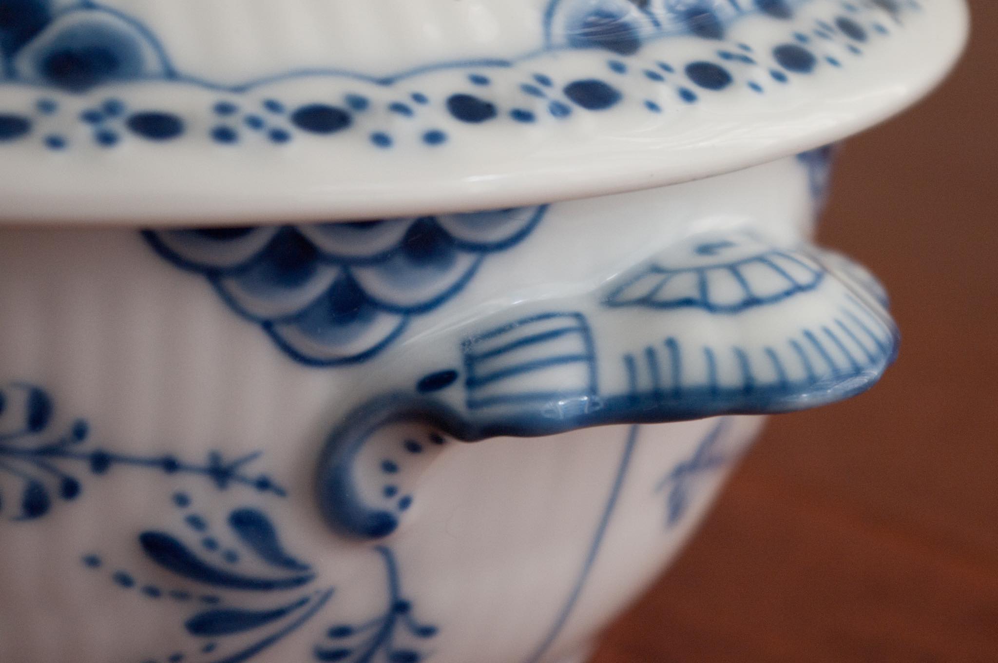 Royal Copenhagen/ロイヤル・コペンハーゲン窯、Blue fluted/ブルーフルーテッドシリーズ、Half lace/ハーフレースのチューリンで、1922~34年の間に焼成されたものです。小ぶりなサイズ感で、華麗な雰囲気でありながらレースの繊細な模様が相まって可愛らしさも合わせもっています。オブジェとして飾りたくなる佇まいです。