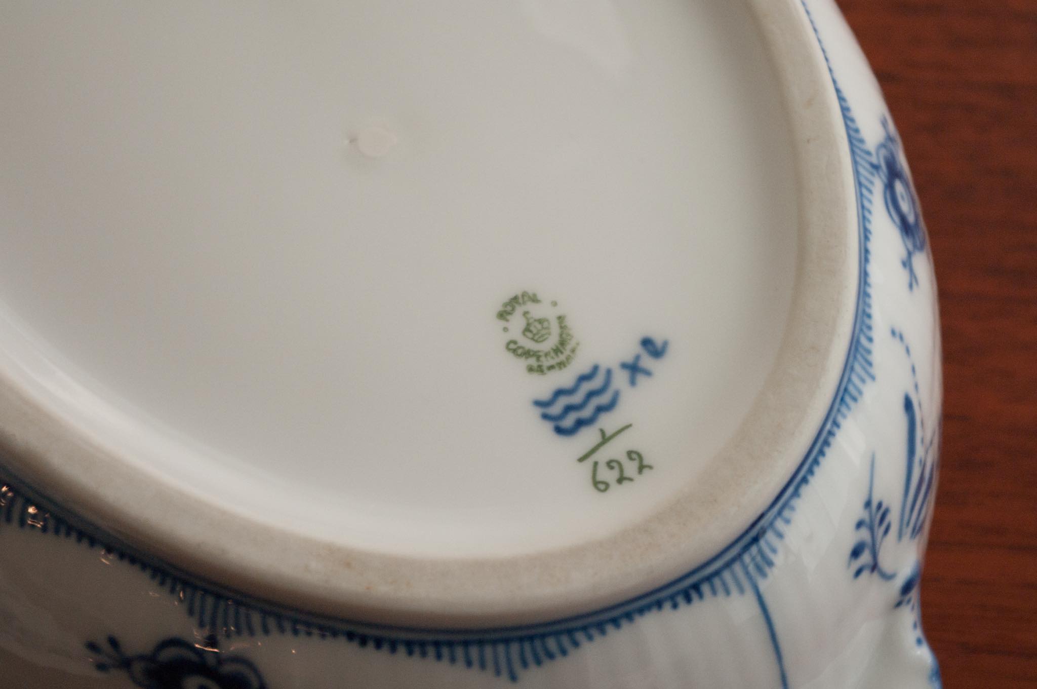ロイヤルコペンハーゲンの歴史は1773年に遡り、ボーンホルム島で良質の磁石カオリンが発見され、フランツ・ヘンリック・ミュラーによってデンマークで初の硬質磁器が完成したことに始まります。1775年にクリスチャン7世国王とユリアナ・マリア王太后との援助によって設立された「デンマーク磁器工場」は王室御用達窯となります。1779年、ユリアナ・マリア王太后がドイツの古窯、マイセン窯より技術者を集め、それまで民間企業だったデンマーク磁器工場は王室が株を買い占めたことで、王立デンマーク磁器製陶所 (Kongelig Porcelæn/Royal Copenhagen) が樹立されます。1868年、デンマーク王室は”ROYAL”の称号を残すことを条件に、製陶所の株式を売却し民間企業へと移します。2012年以降はフィンランドのFiskars社が現オーナーとなります。