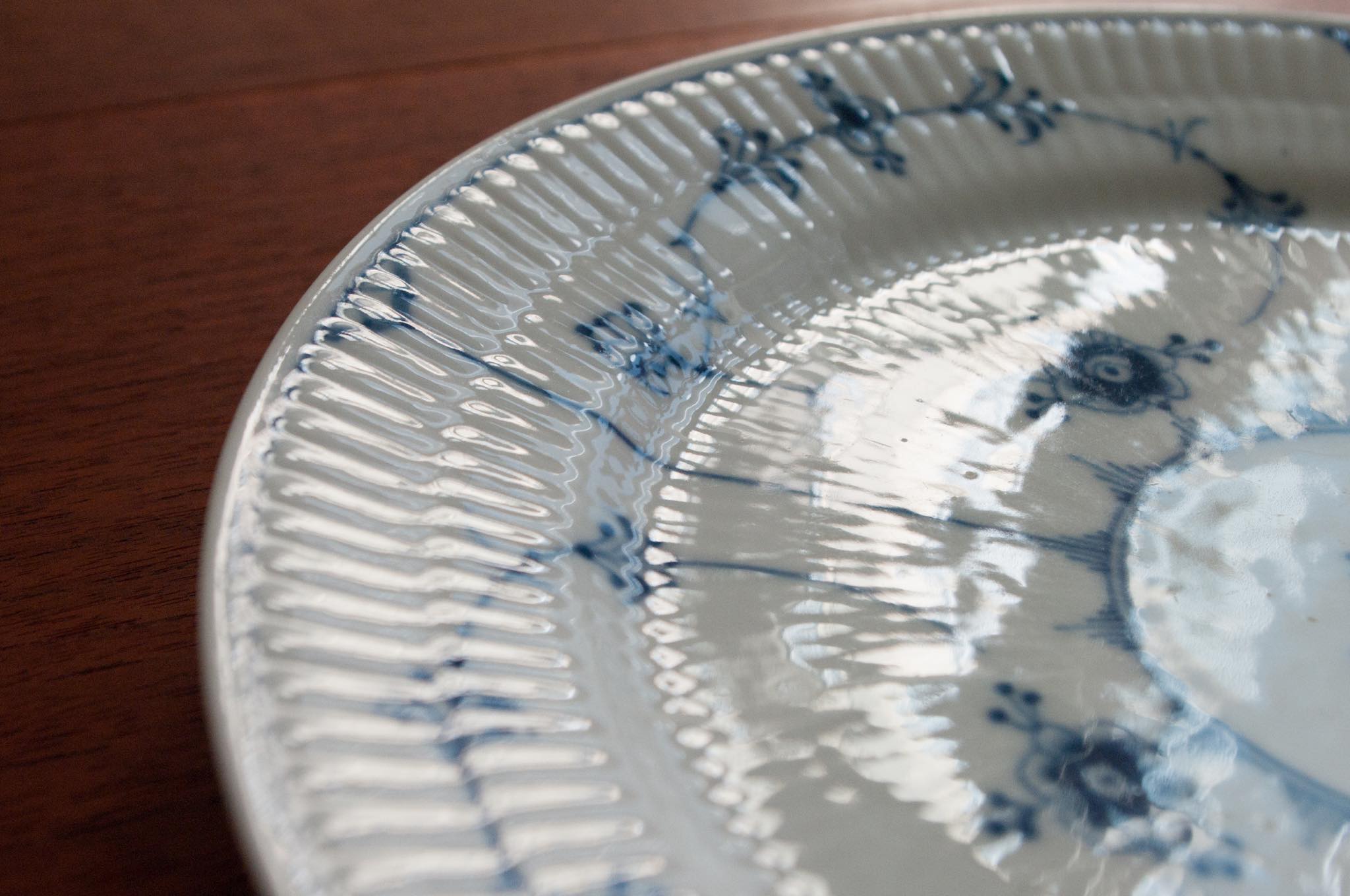 ブルーフルーテッドシリーズは1775年の開発以降、現在も作り続けられているロングセラー作品です。ムール貝に見られる「鎬」を意味する “フルーテッド” に、天然コバルトを用いた染付けの ”ブルー” は多くの人々の食卓に華を添えてきました。スタンダードで初期モデルの”プレイン”、透かしのレースが施された”フルレース”、レースの透かしを埋め強度を増した”ハーフレース”の3タイプがシリーズ化されています。