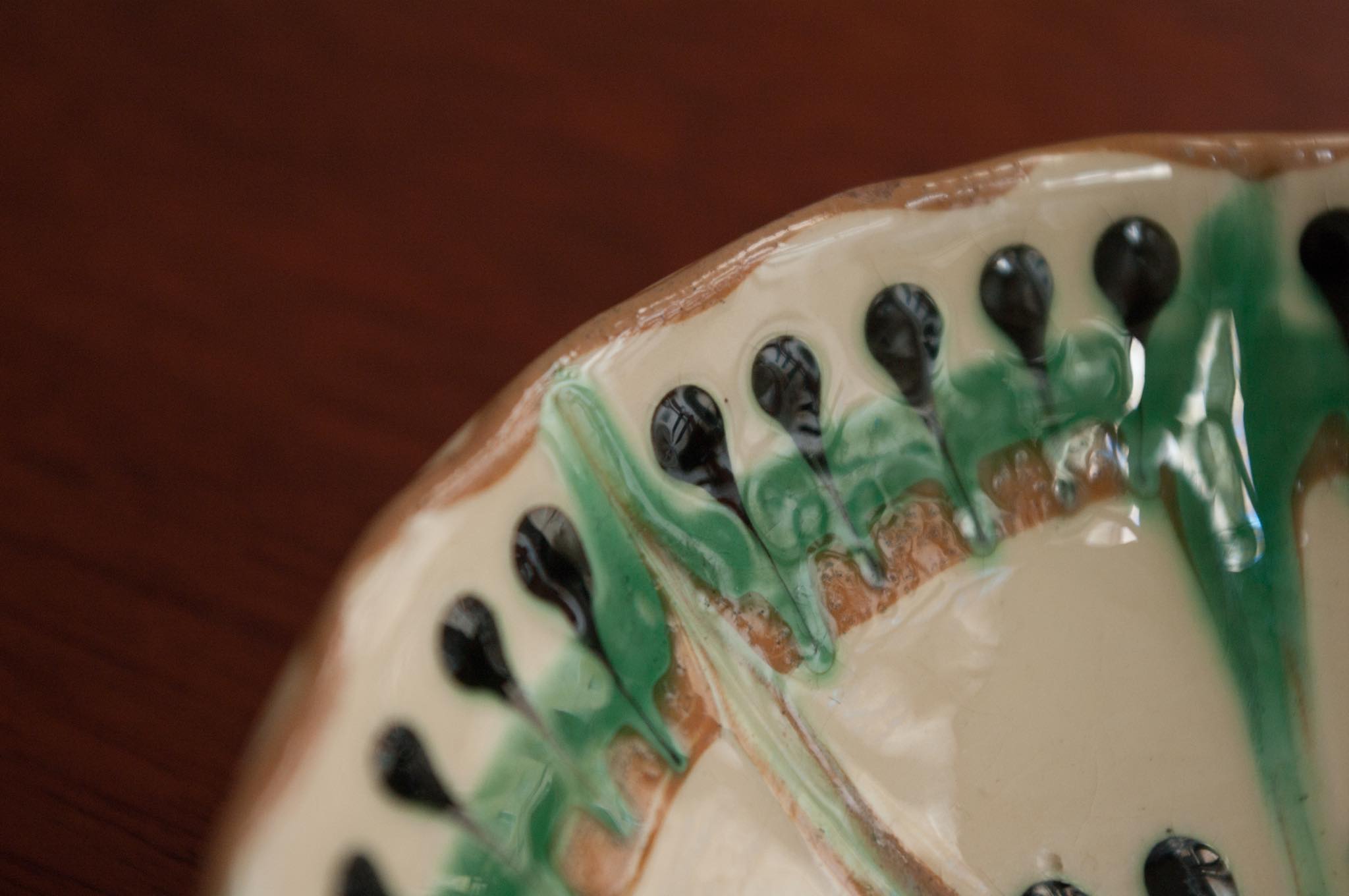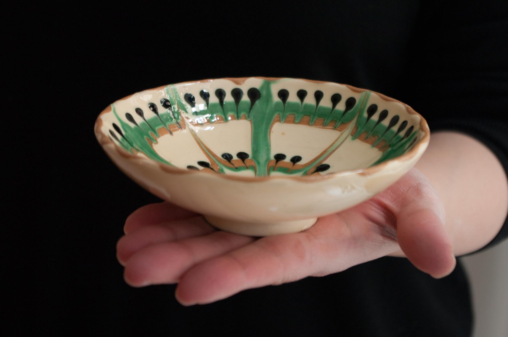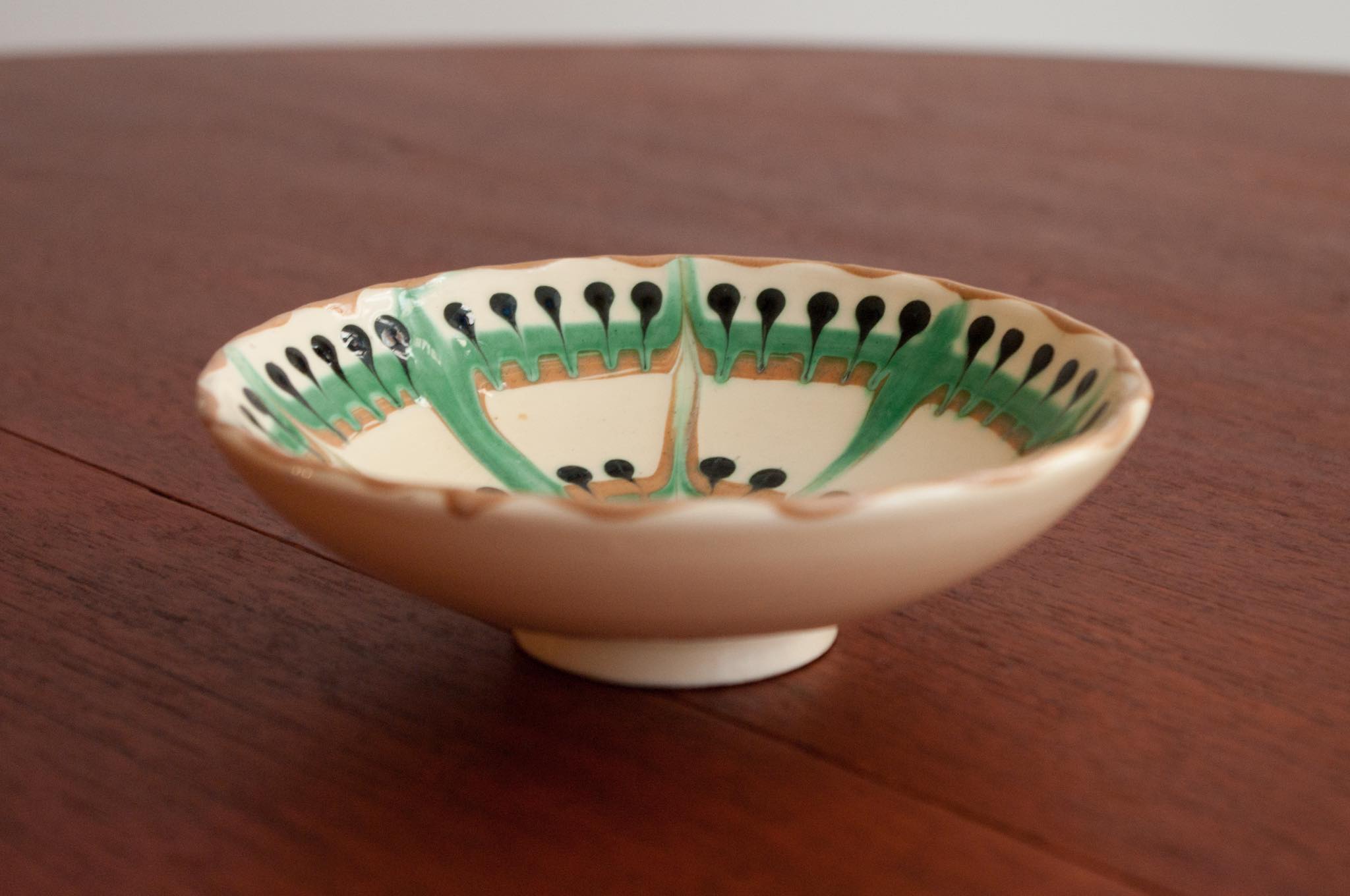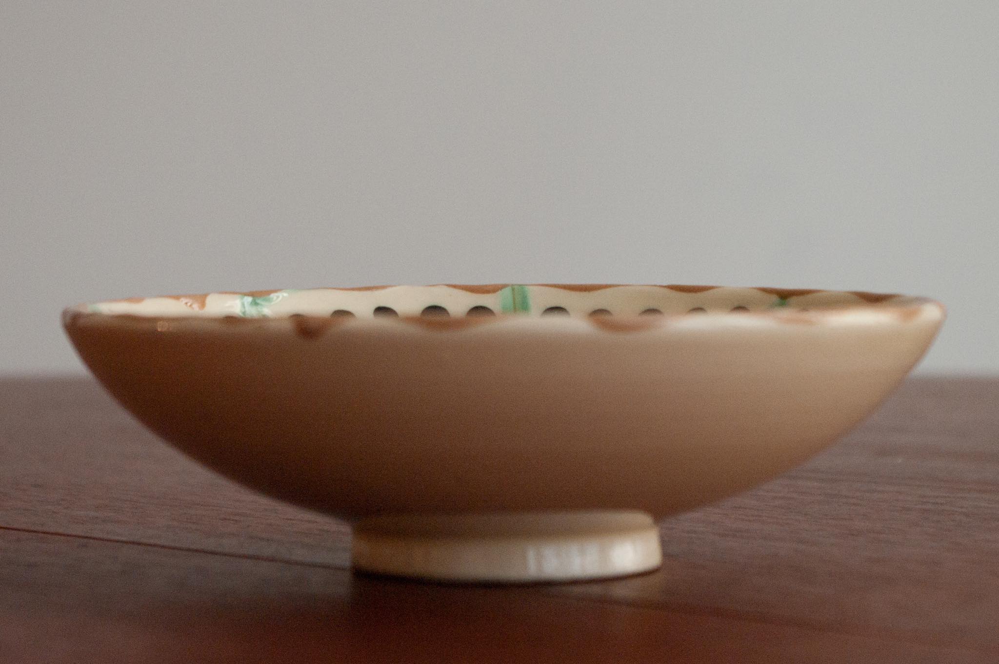 デンマークのケーラー窯、1950年代頃に焼成されたボウル、Niels Kähler/ニルス・ケーラーによるものと思われます。見込みにケーラー窯特有の幾何学文様が筒書きされています。手のひらサイズで、卓上のアクセサリー入れやナッツボウルなど便利そうなサイズ感です。