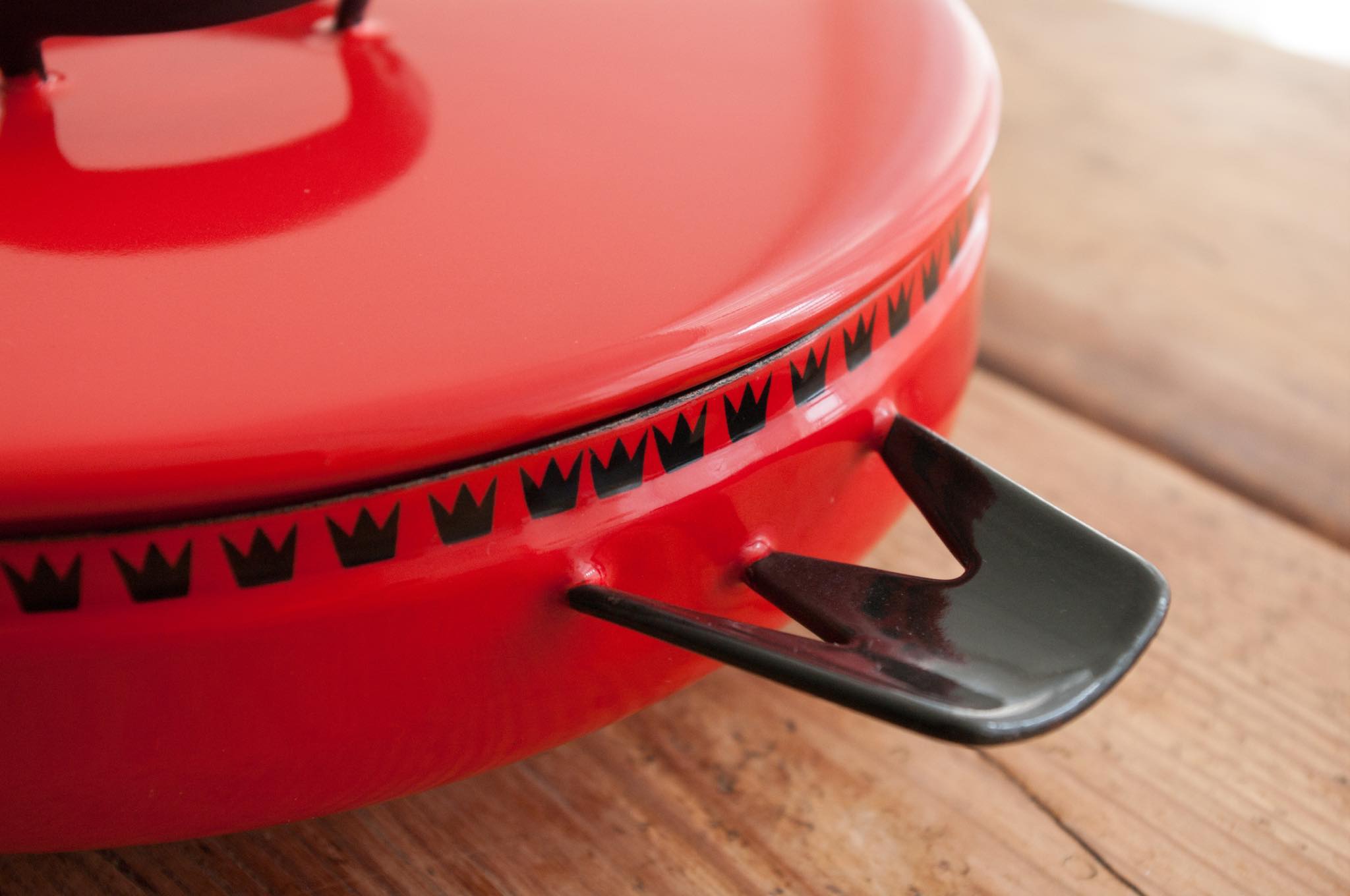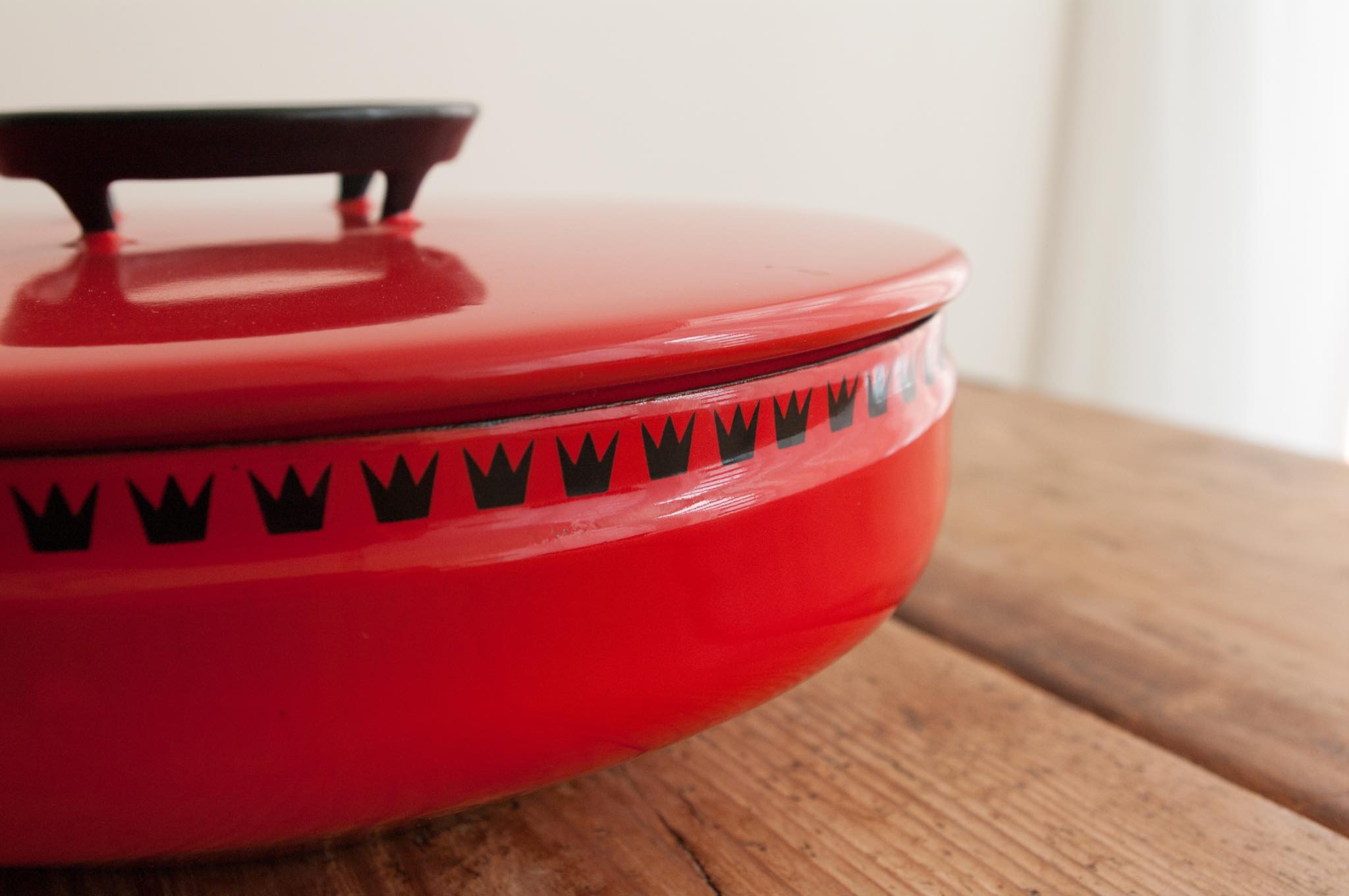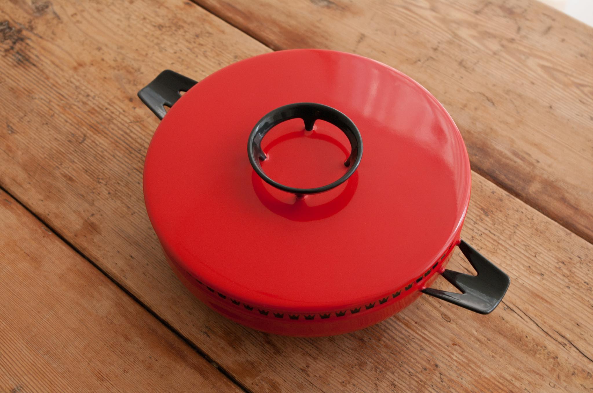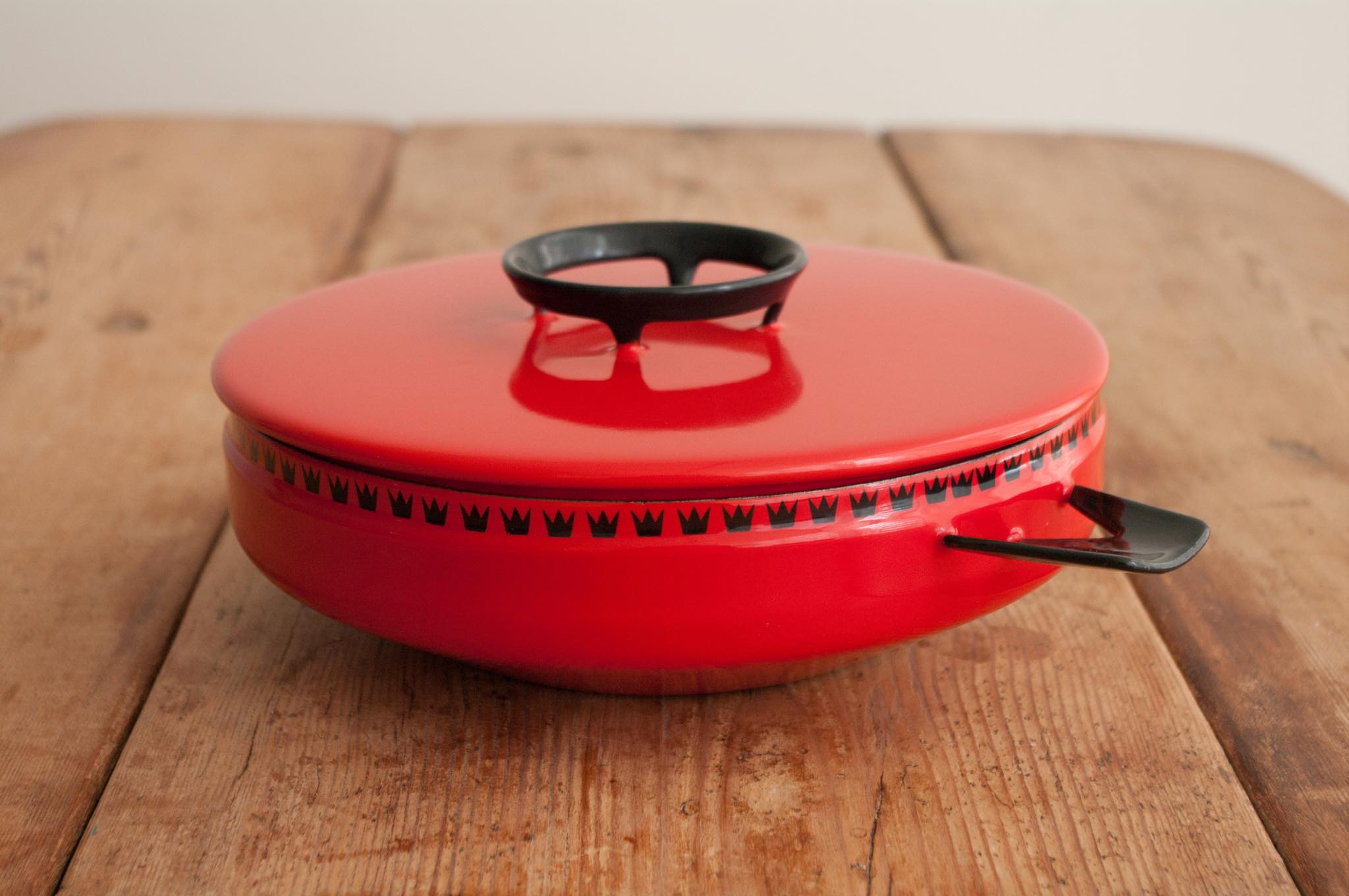 デンマークのGlud & Marstrand社によるDANKOKシリーズの蓋付きお鍋。可愛らしい王冠模様が縁取りされたDANKOKシリーズは、ポットやピッチャーなども展開され当時人気を博しました。この底の浅いデザインのお鍋を北欧ではよく見かけますが、オーヴン料理でも使うのでしょう。