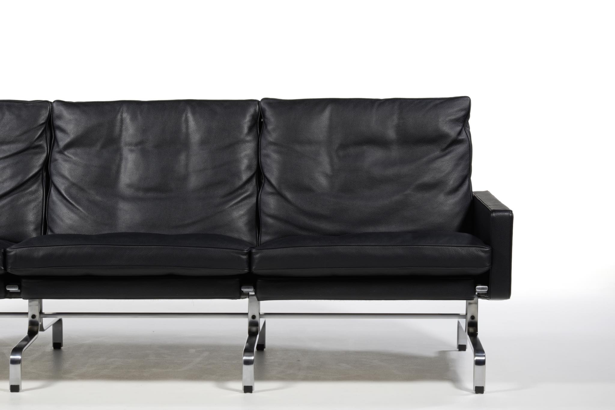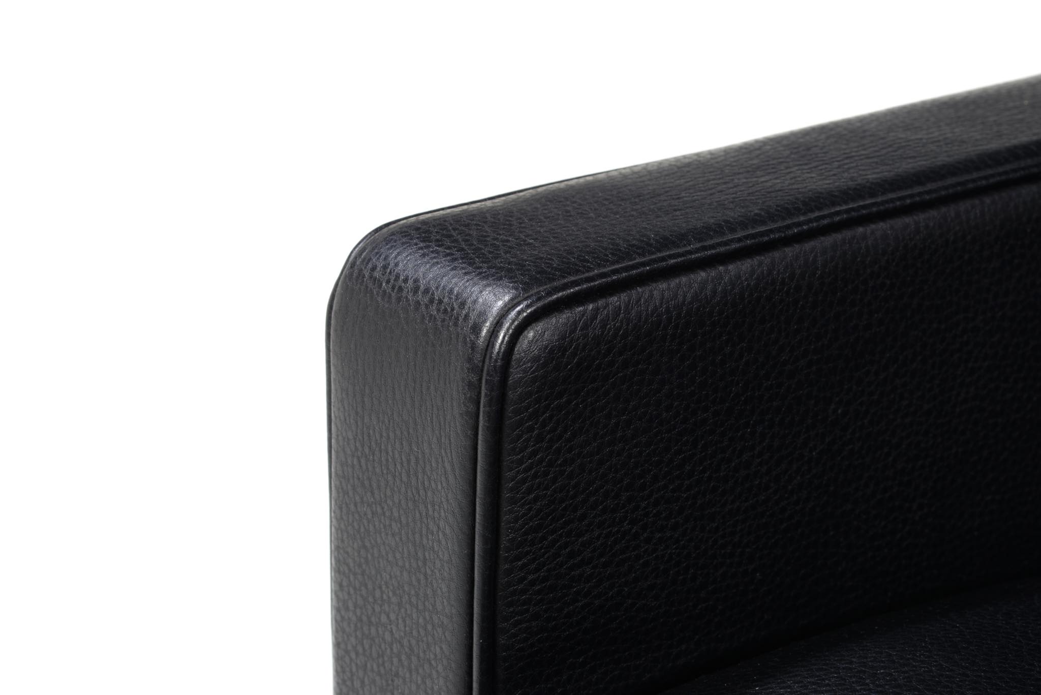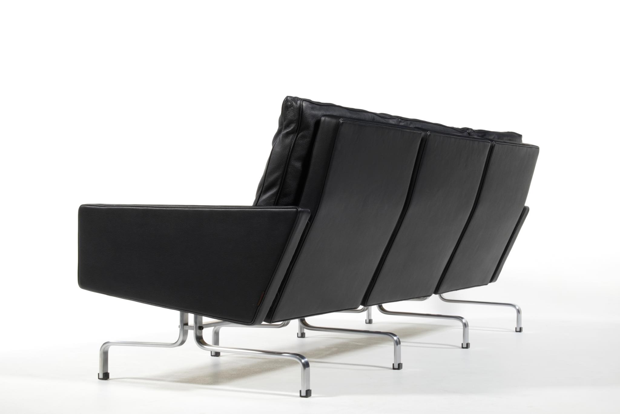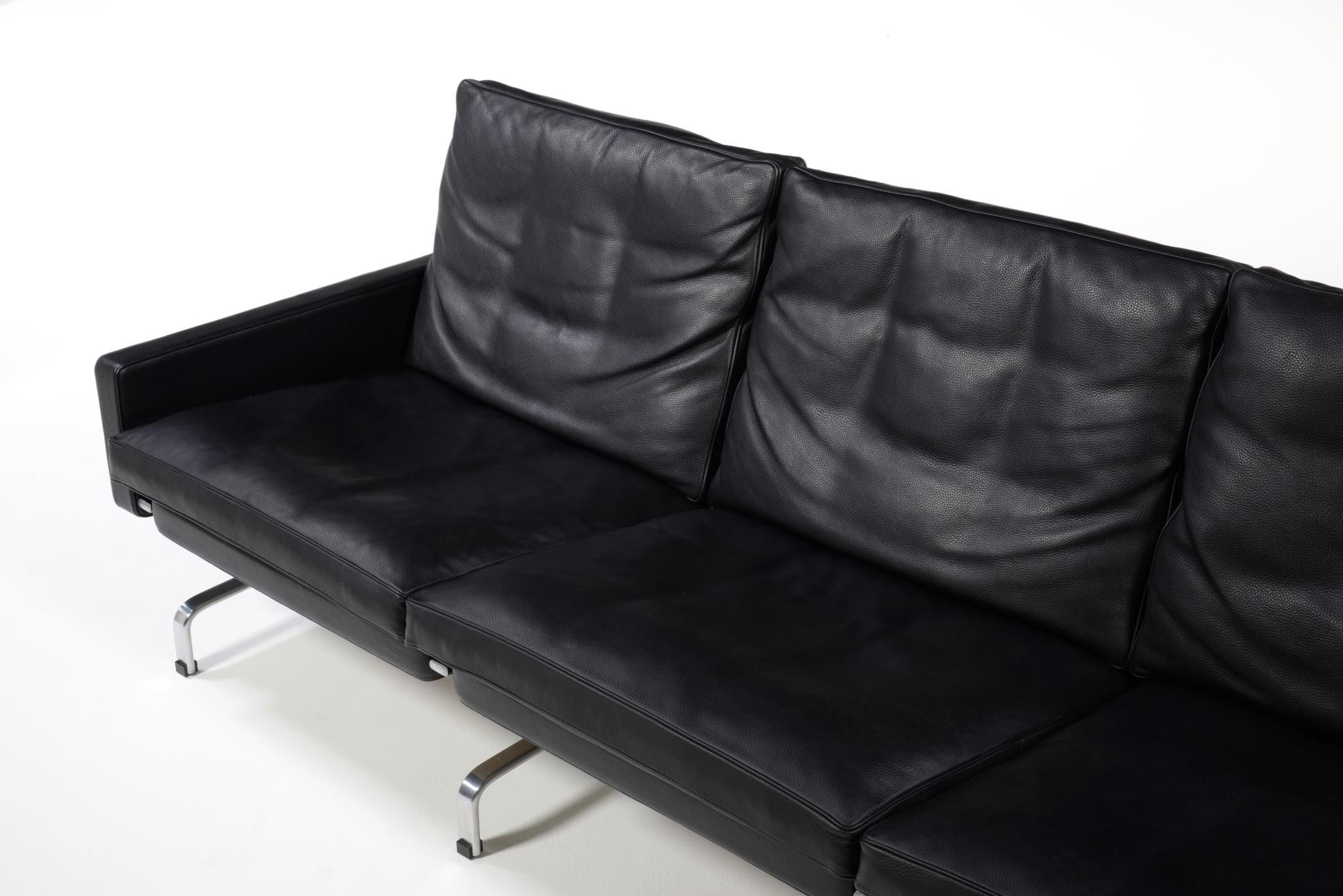 Poul Kjærholm/ポール・ケアホルムによる "PK31" ソファです。Fritz Hansen社によって2011年に作られたものですが、使用頻度はそれほど多くはなかったようです。皮革は黒色のレザー、SØRENSEN leather社の"CLASSIC" が張られています。コンディションにつきまして、本体座面と背もたれのリネン部分に染みが見られます。また、クッション下のスチール部分に若干の錆が見られます。全体にとても綺麗な状態です。
