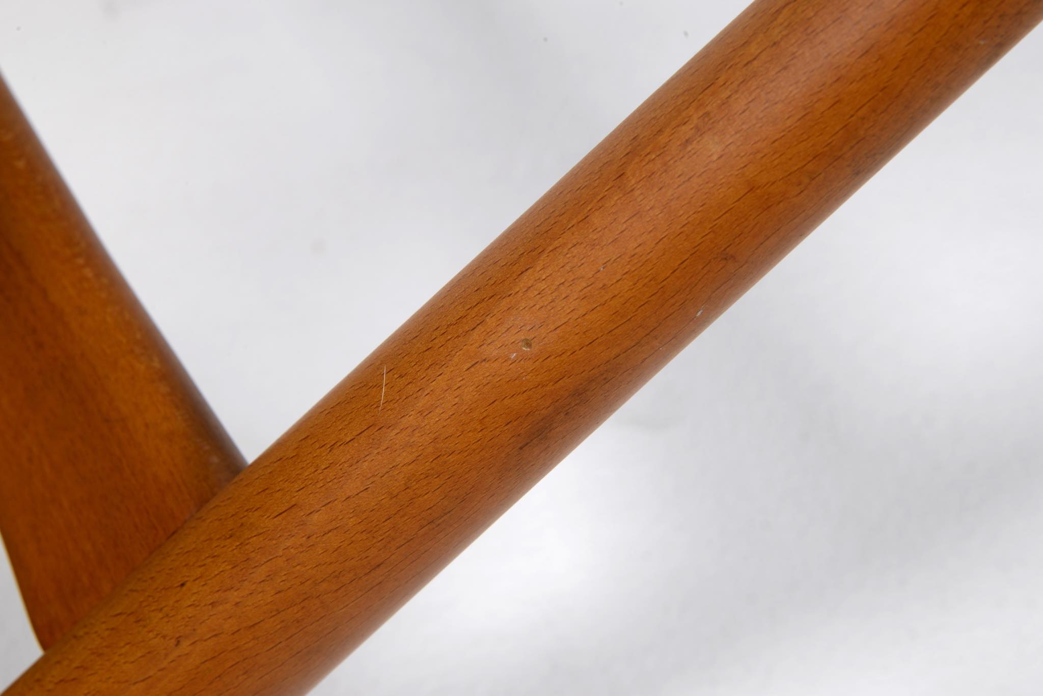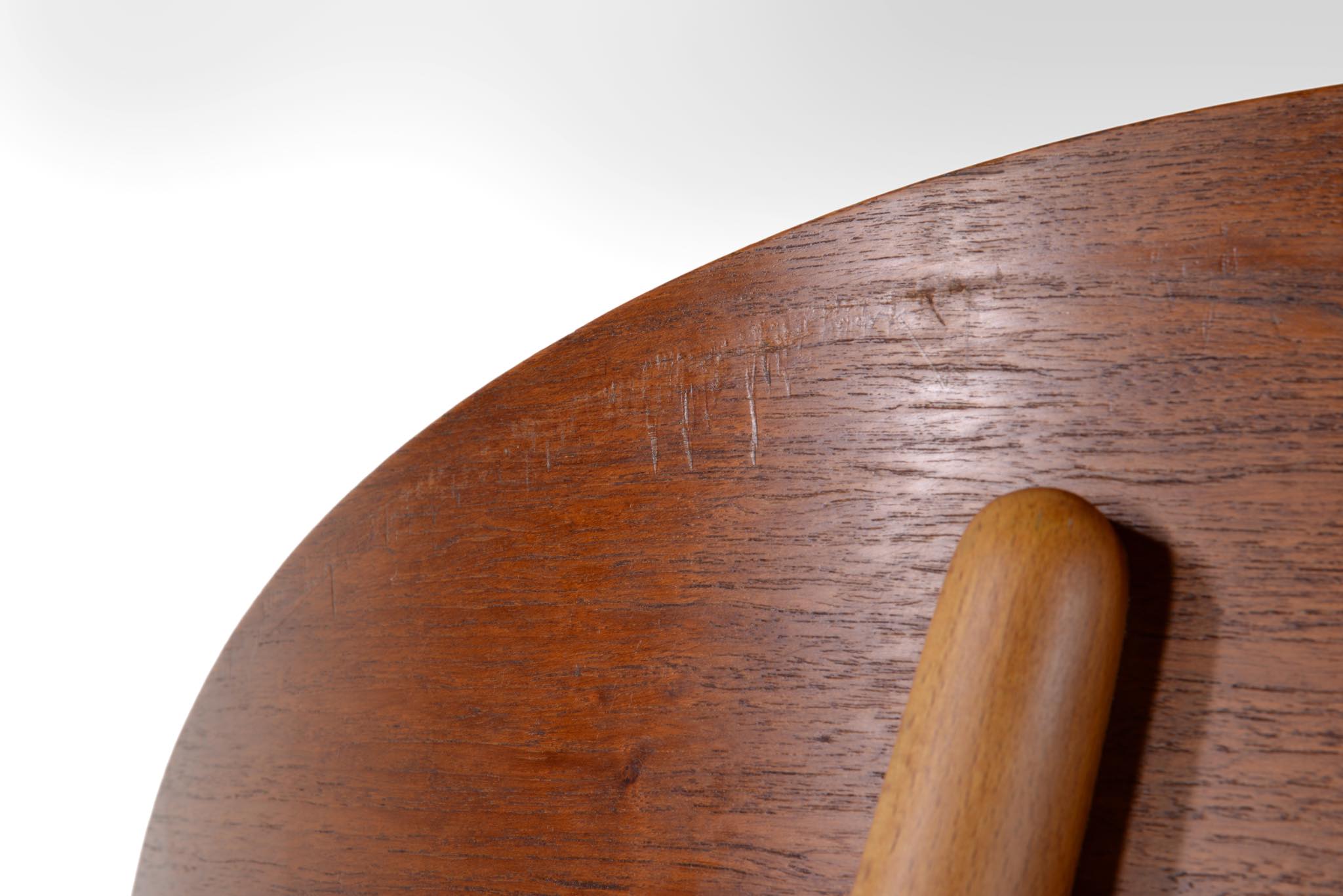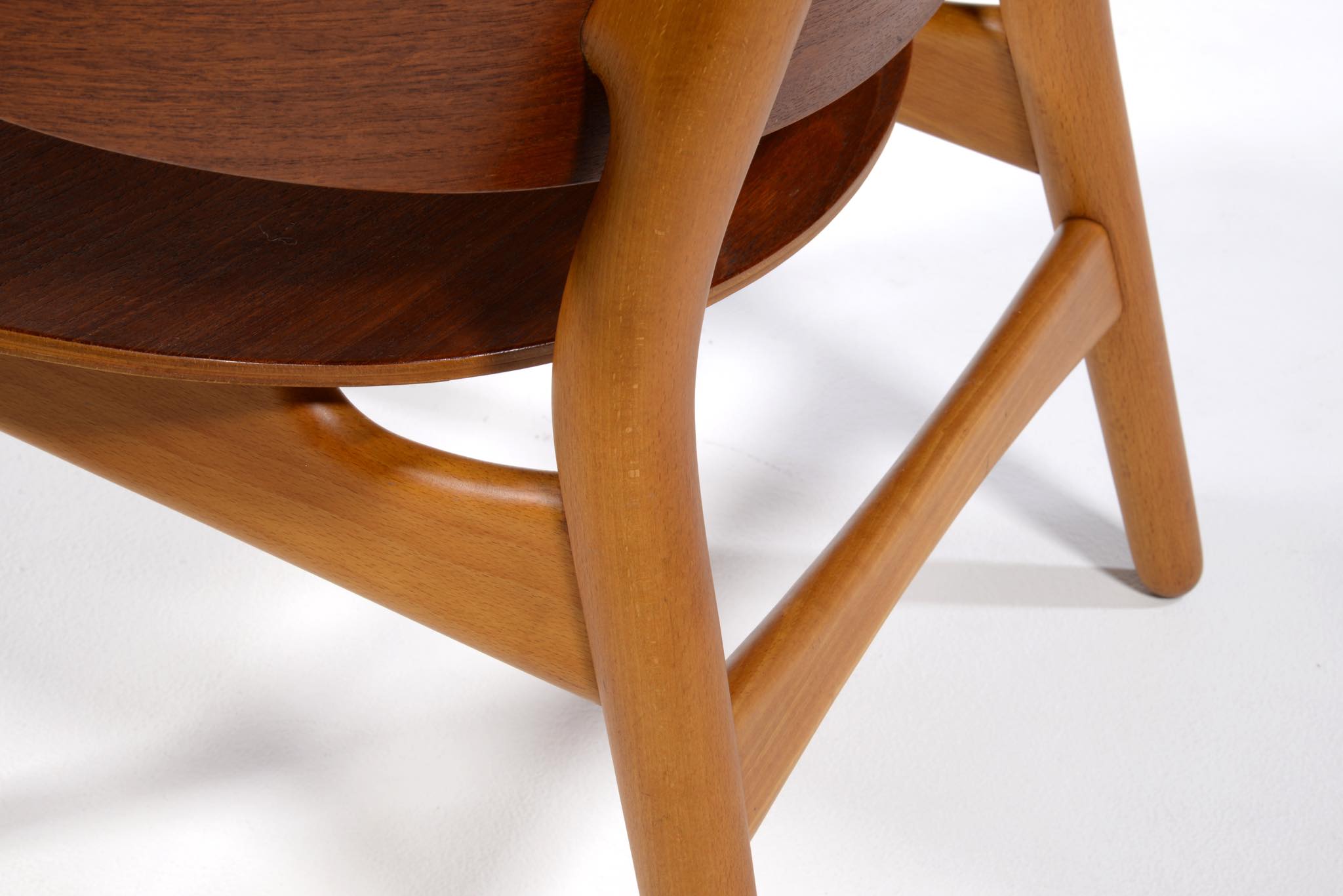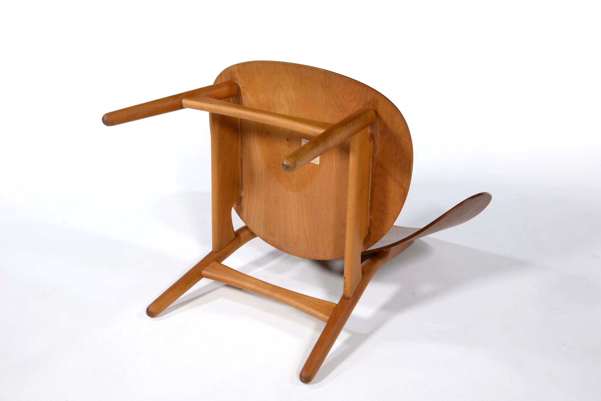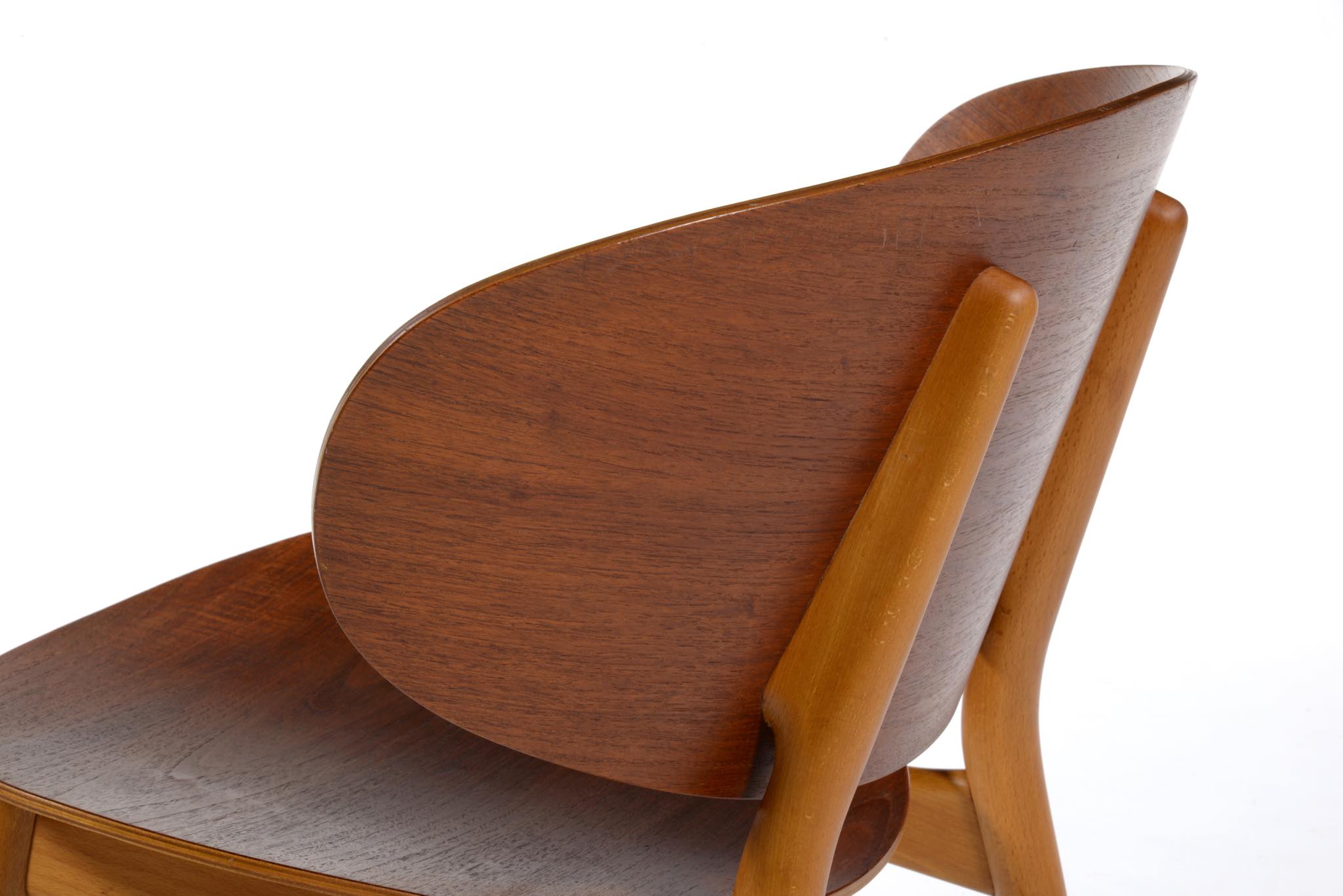 Hans J. Wegner/ハンス・ウェグナーによる、FH1936 "シェルチェア" です。発表年は1948年と古く、薄いプライウッドを大きく湾曲させた背と座は、40年代の椅子としては極めて特徴的で、座の低さもこの頃のスタイルとしては異例だったようです。その姿は、古代ギリシャの遺跡のレリーフでしか知ることのできない「クリスモス椅子」に座っている人物を表しているとも云われています。肘をのせるための「アームレスト」は、それまでデンマークのイージーチェアには不可欠なものでしたが、ウェグナーはこのモデルからアームレストを大胆にも排除し、やがてそれはひとつのスタイルとして確立されます。こちらの椅子は状態もよく、大きなダメージは見当たりません。2脚セットでの販売となります。