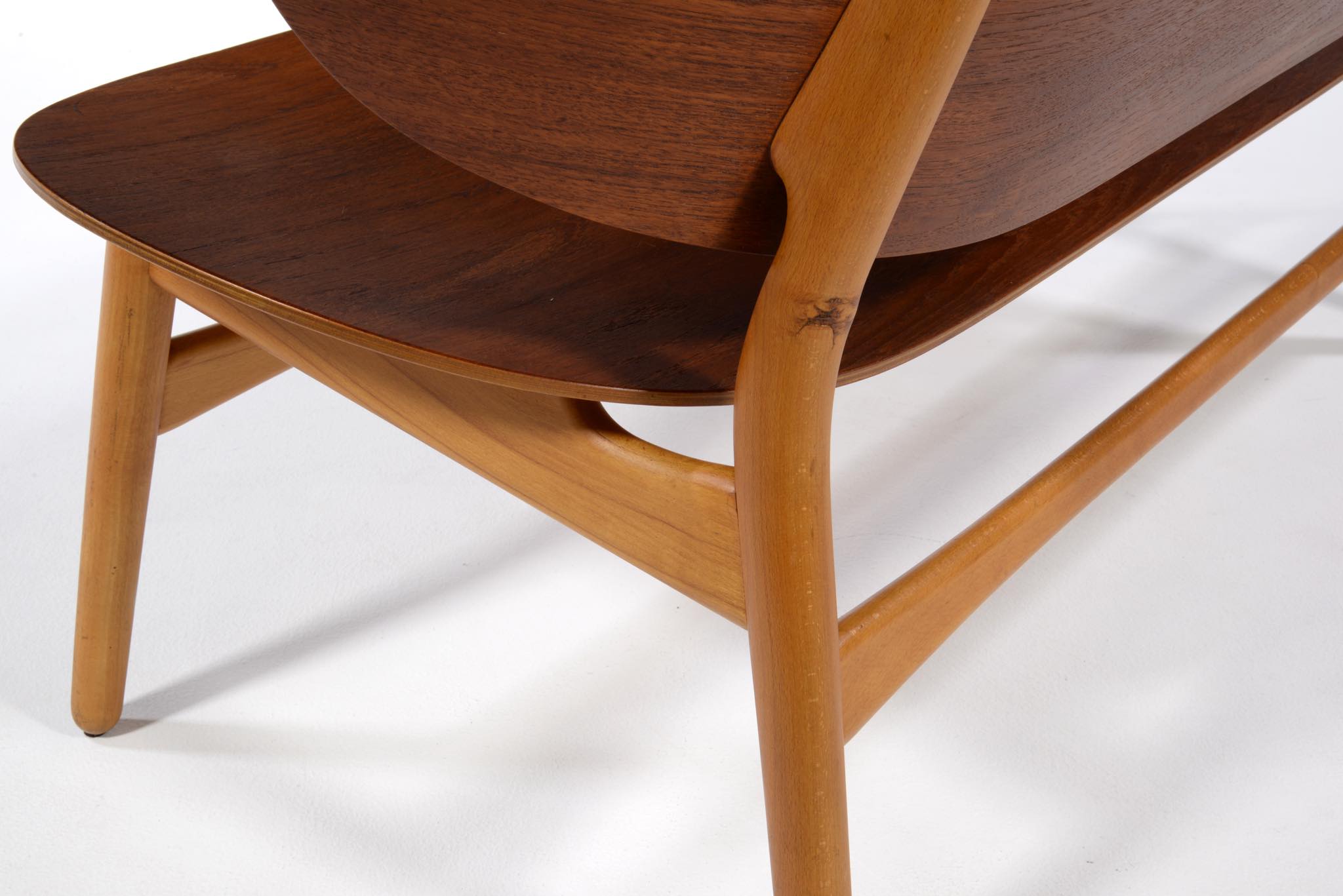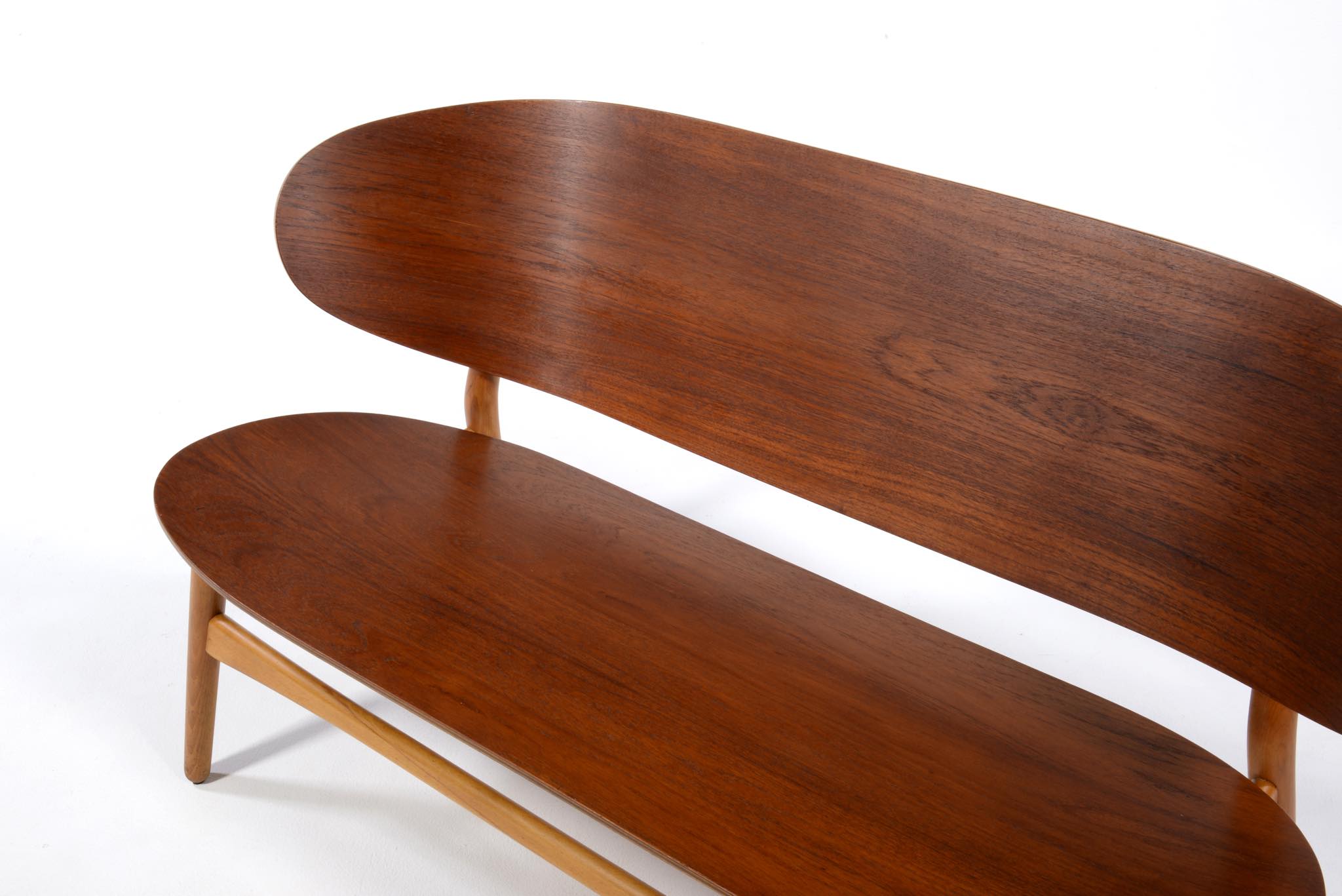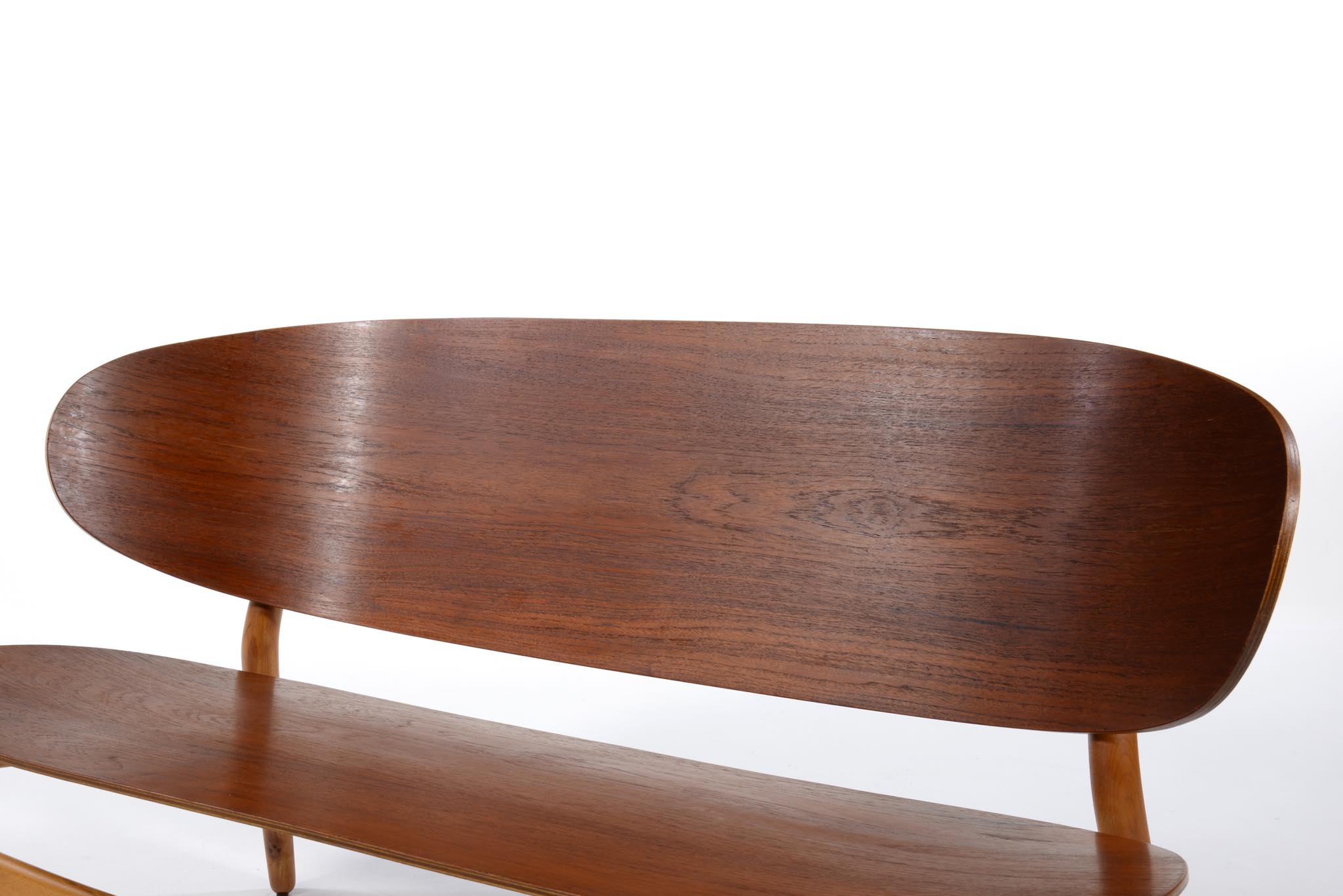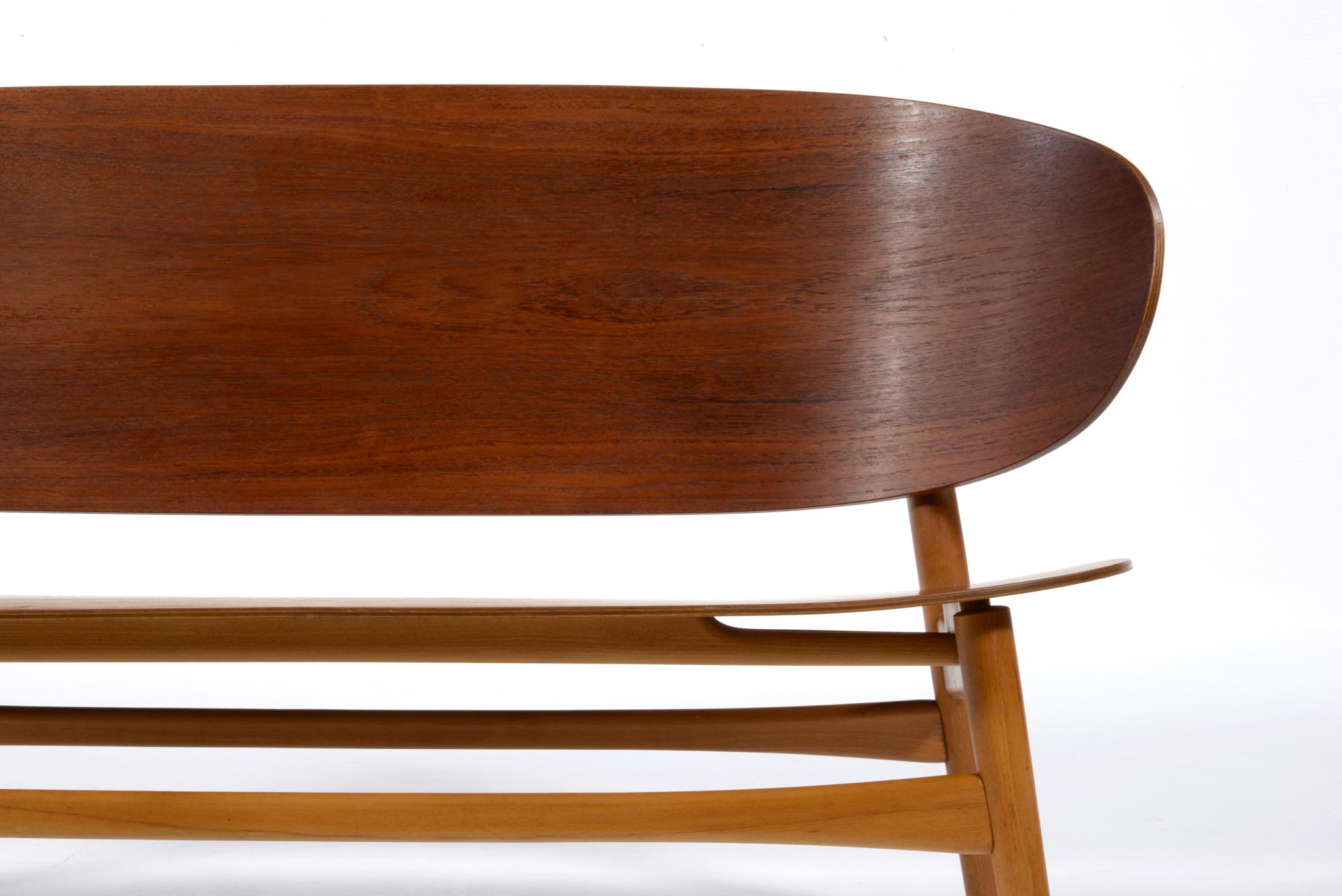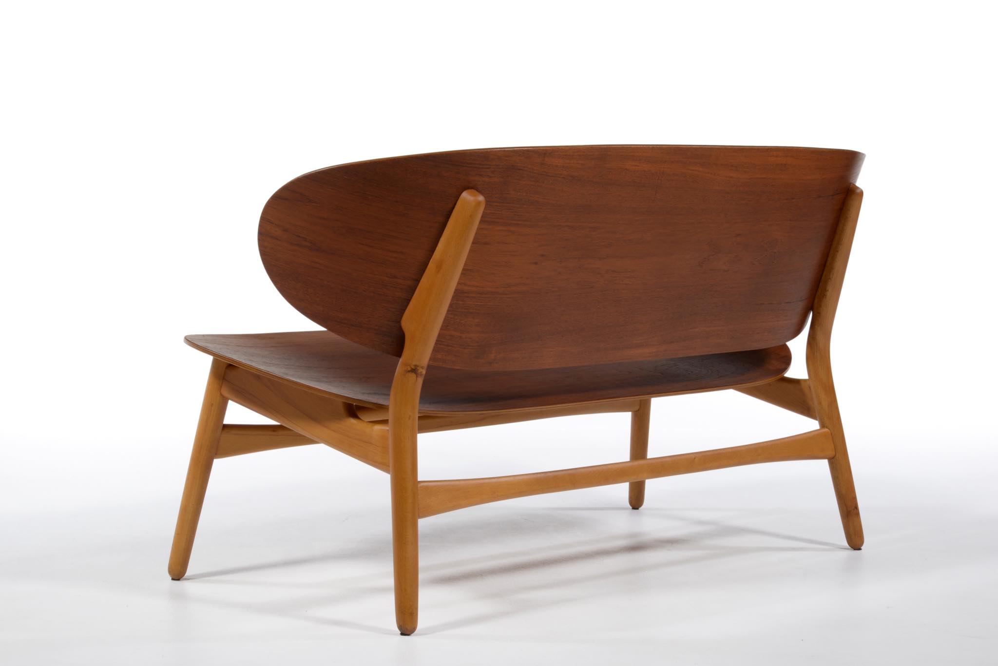 Hans J. Wegner/ハンス・ウェグナーによる、FH1935 "シェルベンチ" です。二人掛けの "シェル" は希少なようであまり見かけません。発表年は1948年と古く、薄いプライウッドを大きく湾曲させた背と座は、40年代の椅子としては極めて特徴的で、座の低さもこの頃のスタイルとしては異例だったようです。その姿は、古代ギリシャの遺跡のレリーフでしか知ることのできない「クリスモス椅子」に座っている人物を表しているとも云われています。肘をのせるための「アームレスト」は、それまでデンマークのイージーチェアには不可欠なものでしたが、ウェグナーはこのモデルからアームレストを大胆にも排除し、やがてそれはひとつのスタイルとして確立されます。こちらの椅子のコンディションにつきまして、背の付け根のフレーム部分に天然の木の節がありますが、ゆるみなどはありません。状態もよくしっかりとしています。
