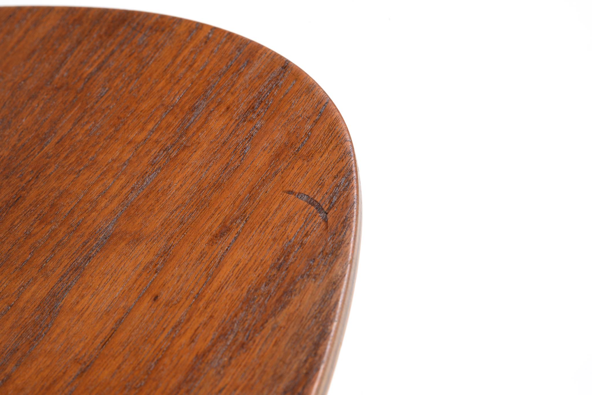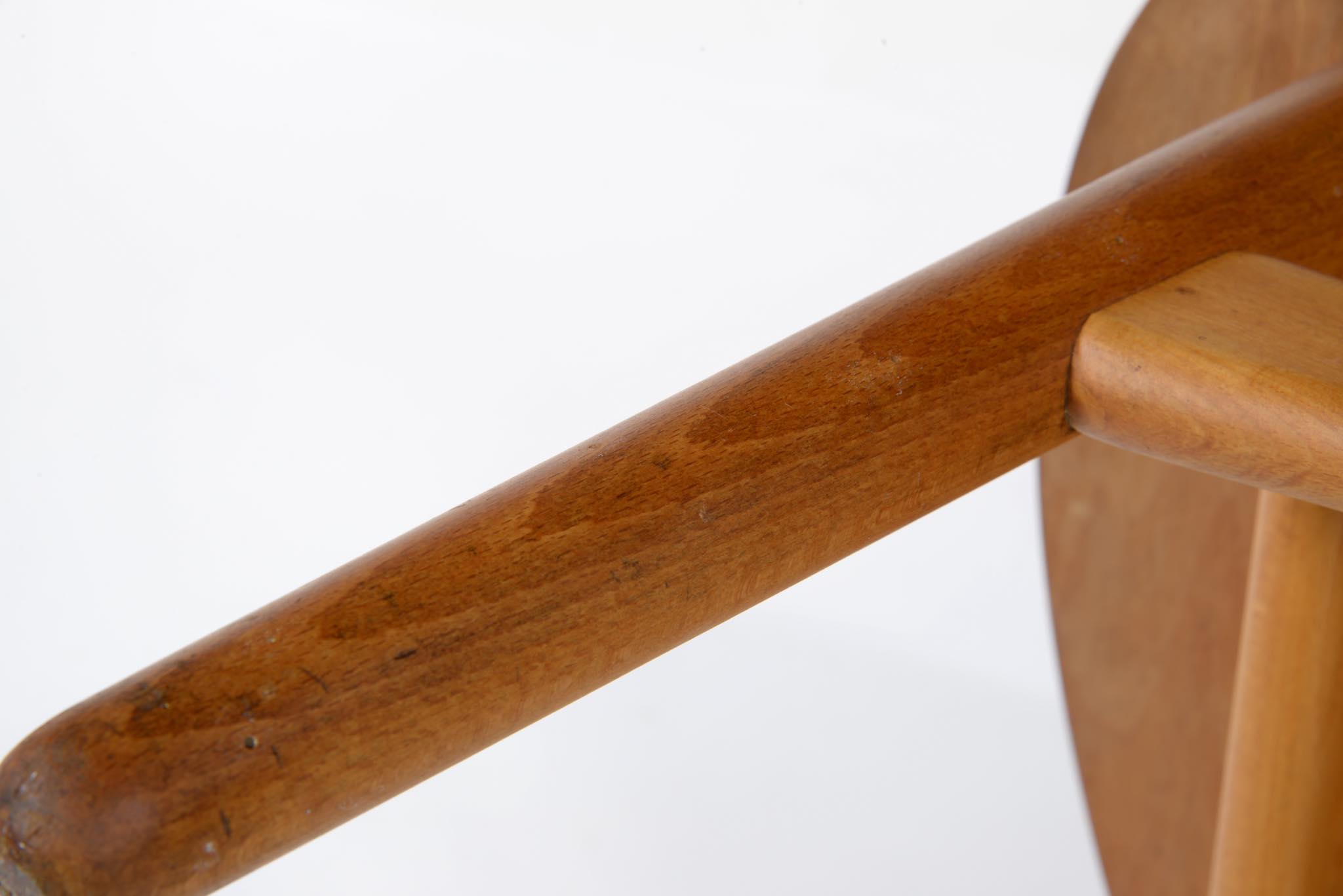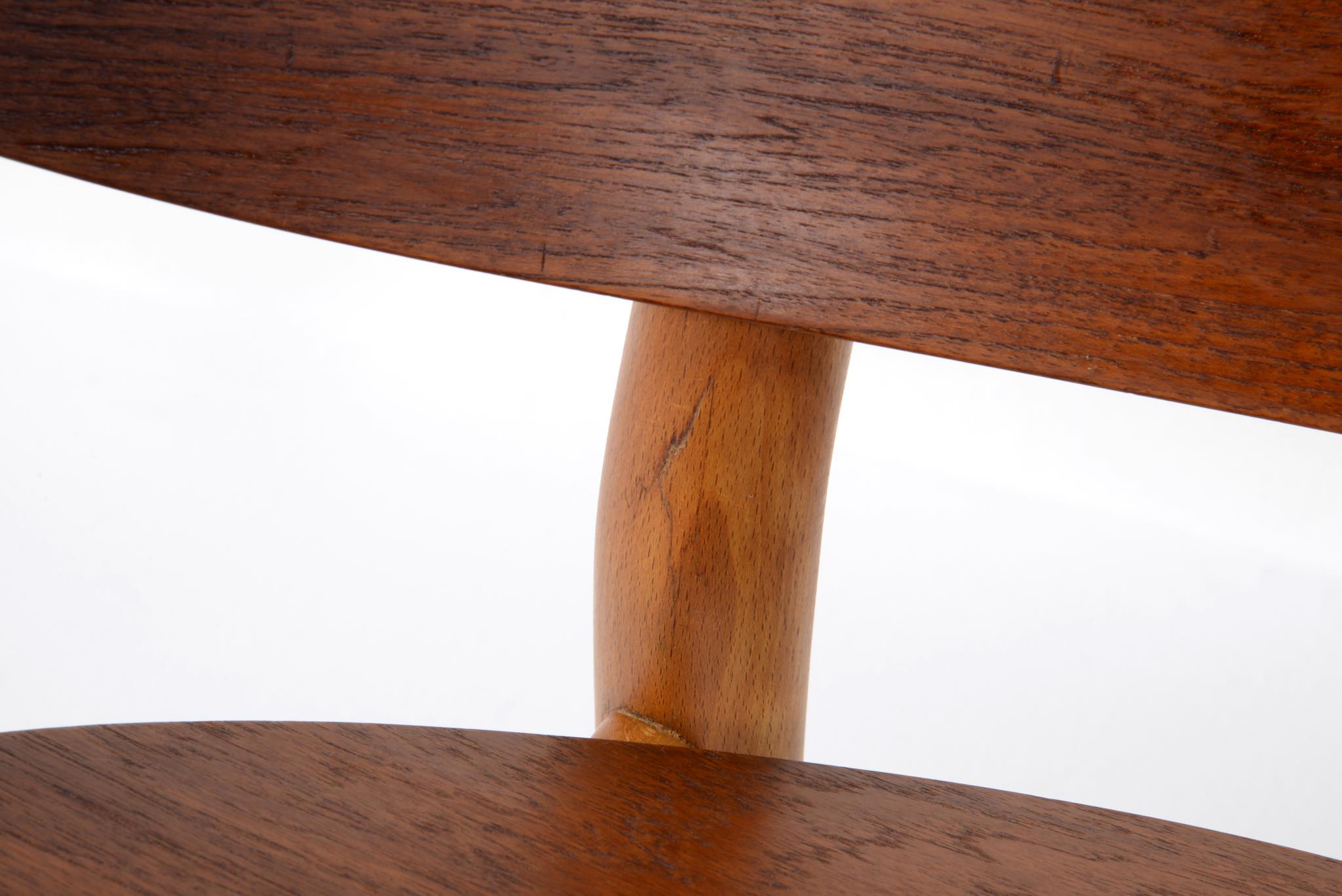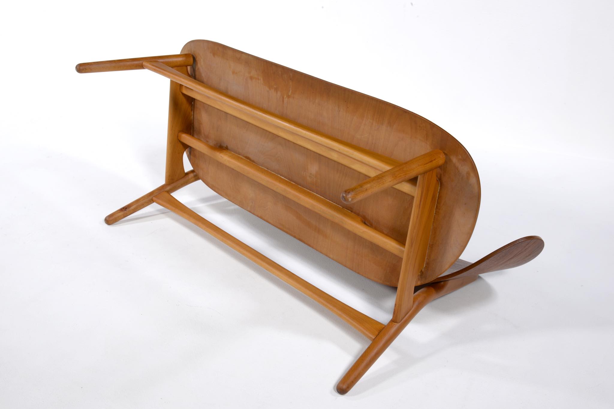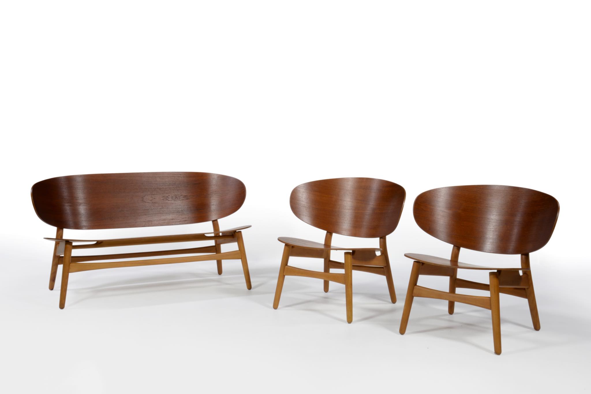 Hans J. Wegner/ハンス・ウェグナーによる、FH1935 "シェルベンチ" です。二人掛けの "シェル" は希少なようであまり見かけません。発表年は1948年と古く、薄いプライウッドを大きく湾曲させた背と座は、40年代の椅子としては極めて特徴的で、座の低さもこの頃のスタイルとしては異例だったようです。その姿は、古代ギリシャの遺跡のレリーフでしか知ることのできない「クリスモス椅子」に座っている人物を表しているとも云われています。肘をのせるための「アームレスト」は、それまでデンマークのイージーチェアには不可欠なものでしたが、ウェグナーはこのモデルからアームレストを大胆にも排除し、やがてそれはひとつのスタイルとして確立されます。こちらの椅子のコンディションにつきまして、背の付け根のフレーム部分に天然の木の節がありますが、ゆるみなどはありません。状態もよくしっかりとしています。