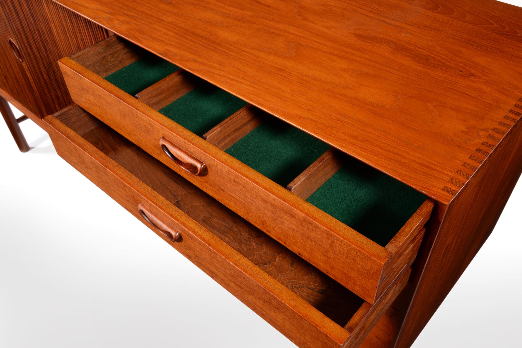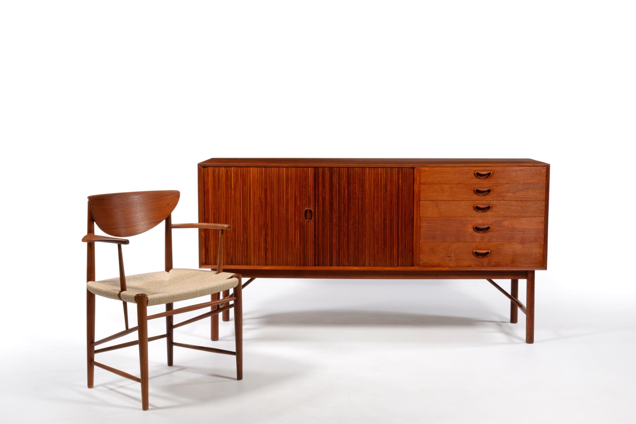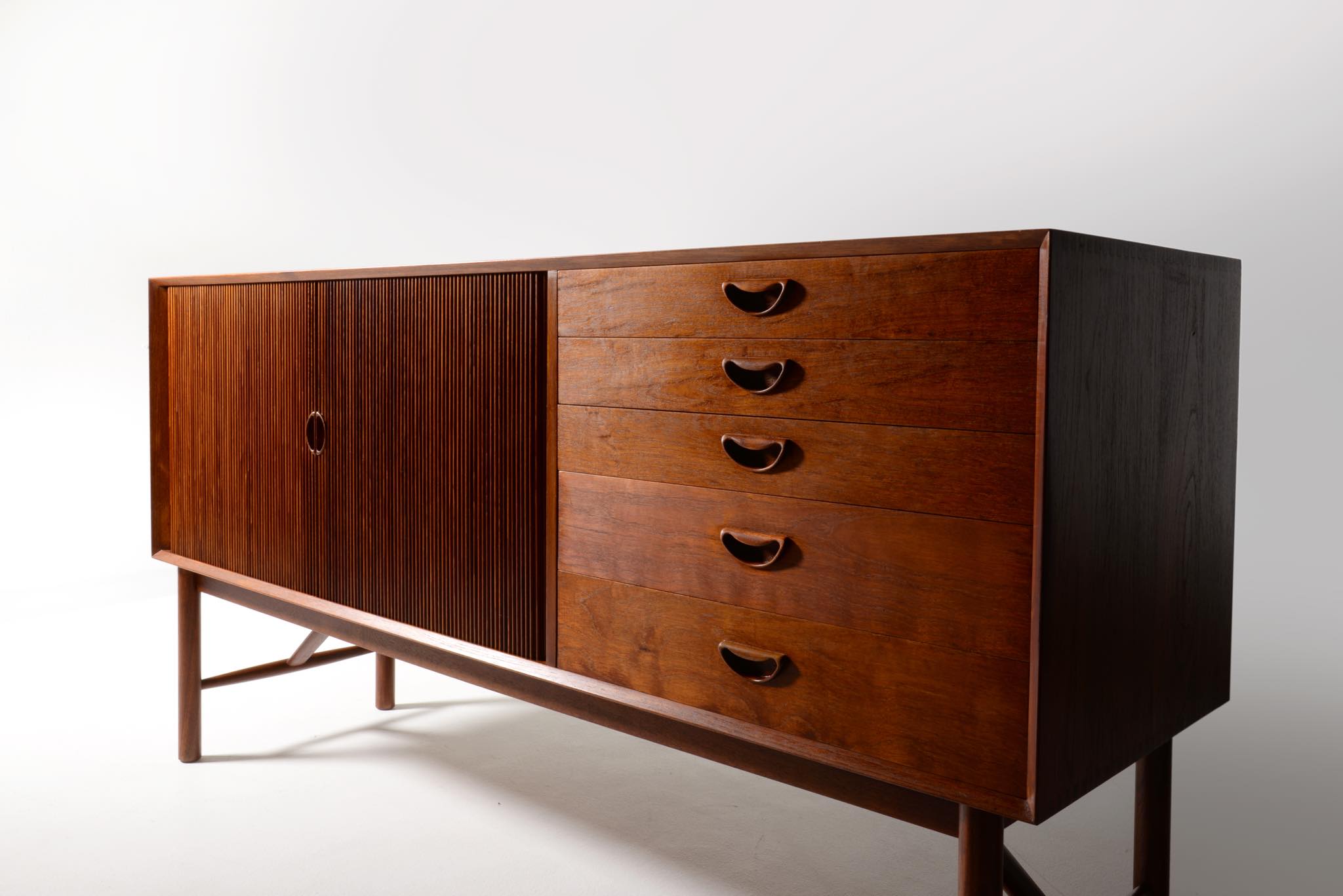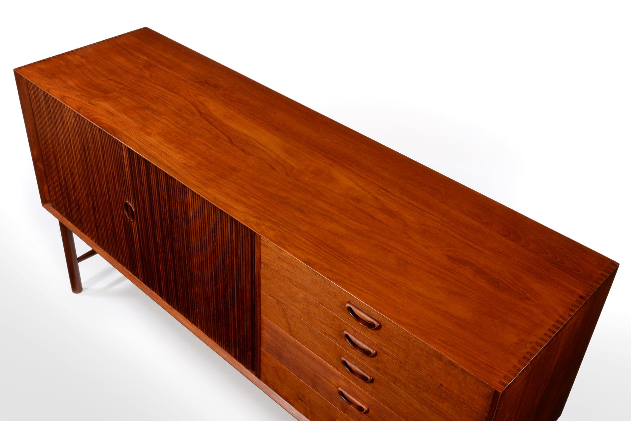 1950年代に活躍したデンマークのデザイナーユニット、Peter Hvidt/ピーター・ヴィッツとOrla Mølgaard Nielsen/オルラ・ミュルゴー・ニールセンによるサイドボードキャビネットです。チークの無垢材をふんだんに用いた、非常に贅沢な作りのサイドボードです。抽斗とロールフロント(蛇腹式の扉)の構成となり、ロールフロントは扉を開けた際にドア板が側面から背後にかけて隠れるように回りこみながら収納されるので空間の邪魔になりません。一部小傷の補修などございますが、とても綺麗な状態です。