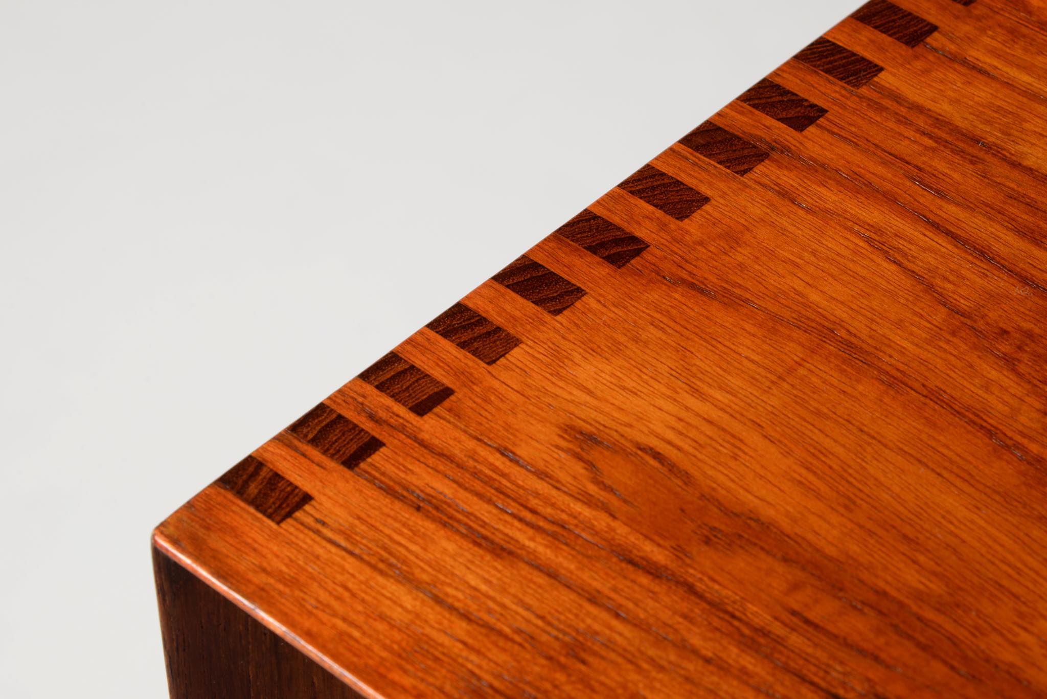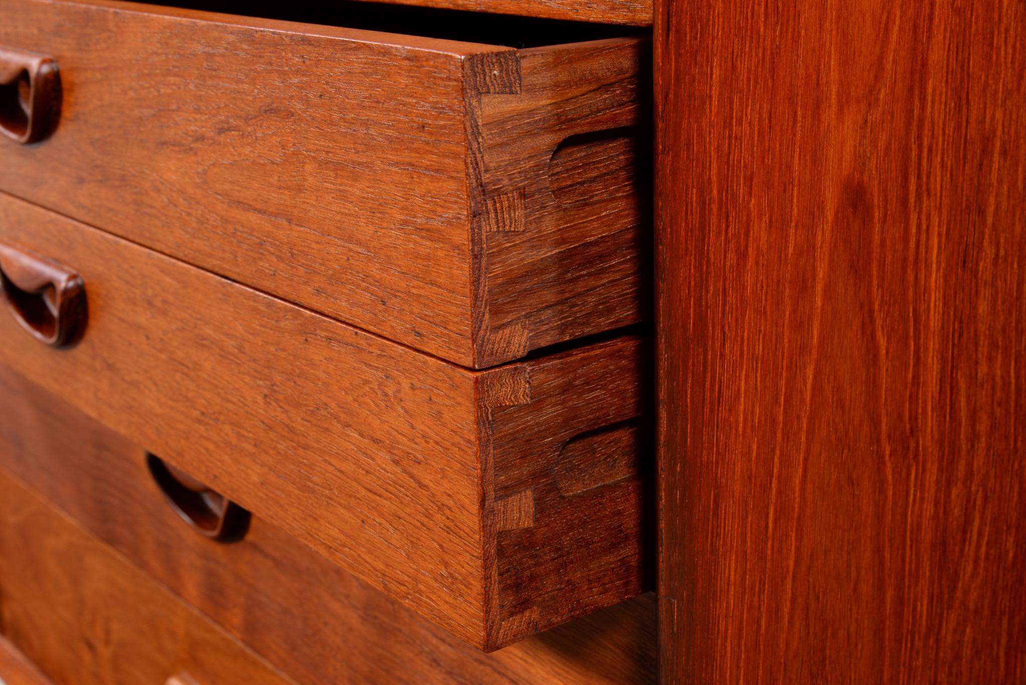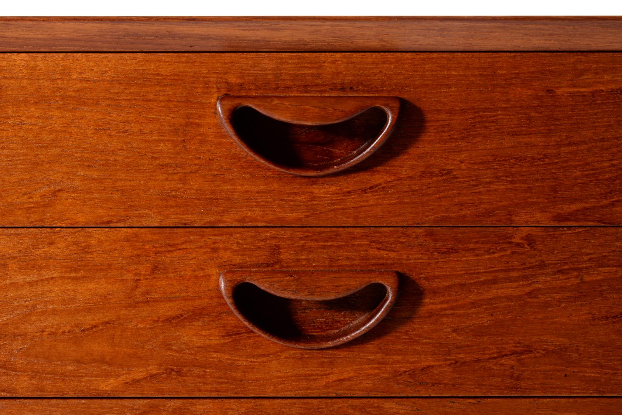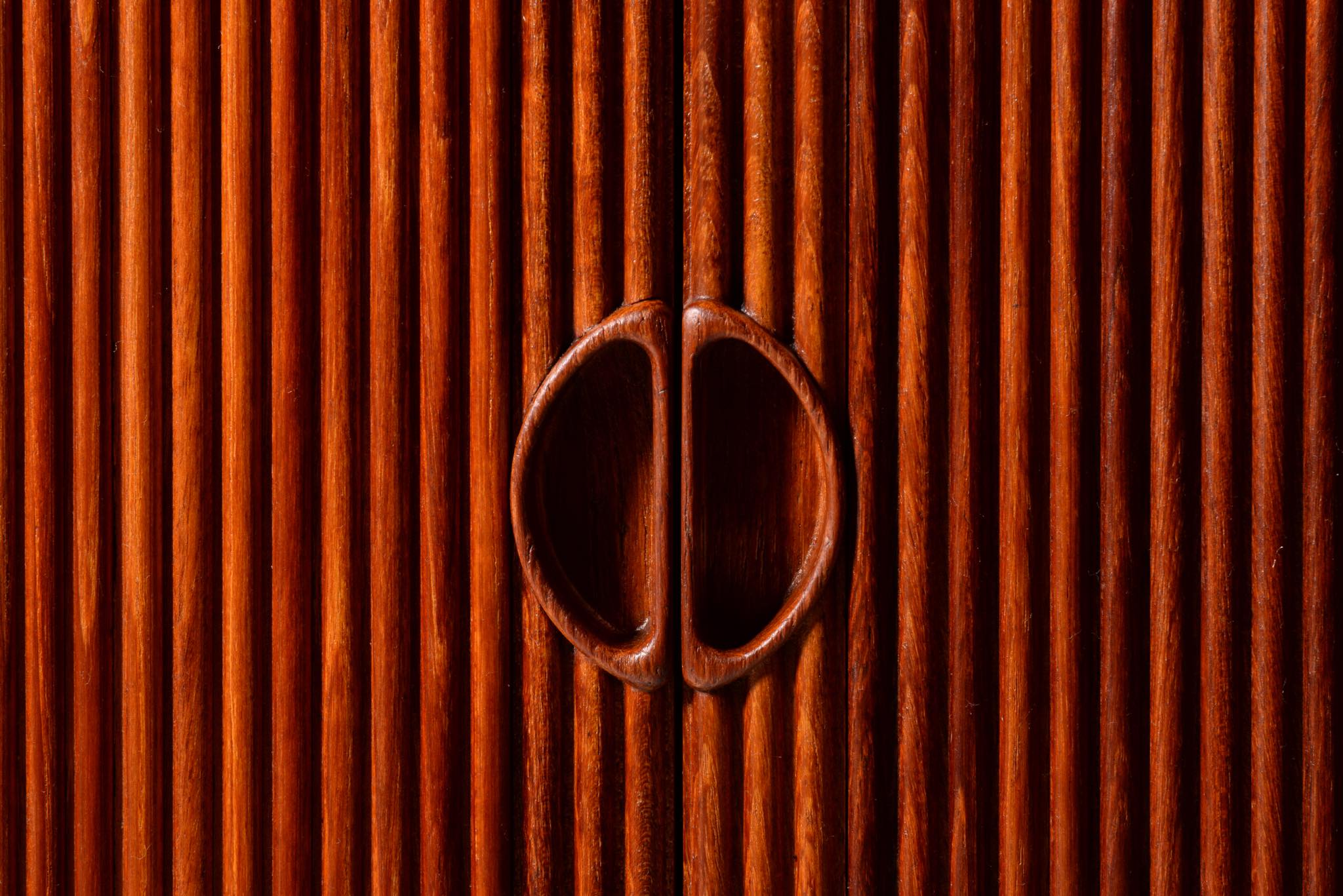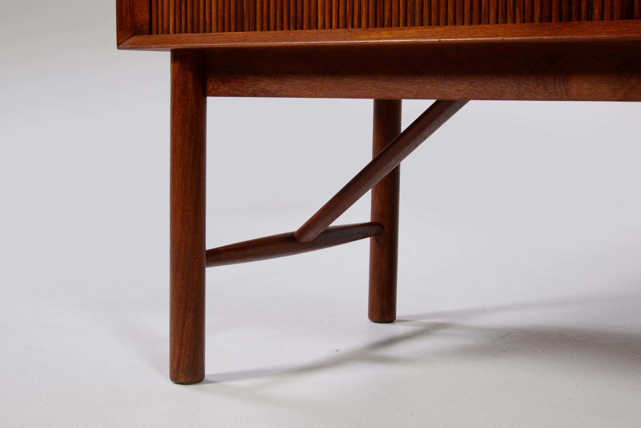 1950年代に活躍したデンマークのデザイナーユニット、Peter Hvidt/ピーター・ヴィッツとOrla Mølgaard Nielsen/オルラ・ミュルゴー・ニールセンによるサイドボードキャビネットです。チークの無垢材をふんだんに用いた、非常に贅沢な作りのサイドボードです。抽斗とロールフロント(蛇腹式の扉)の構成となり、ロールフロントは扉を開けた際にドア板が側面から背後にかけて隠れるように回りこみながら収納されるので空間の邪魔になりません。一部小傷の補修などございますが、とても綺麗な状態です。