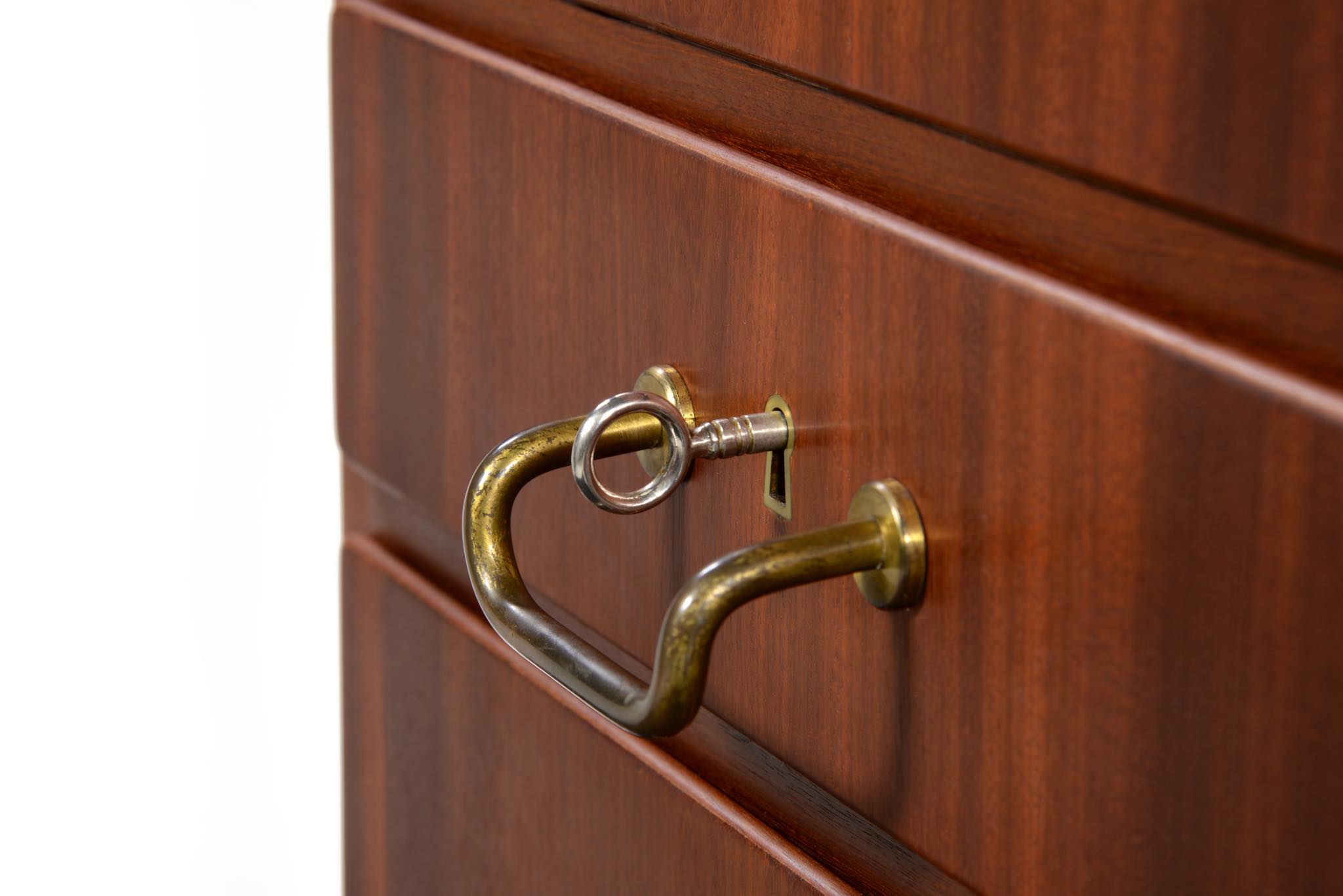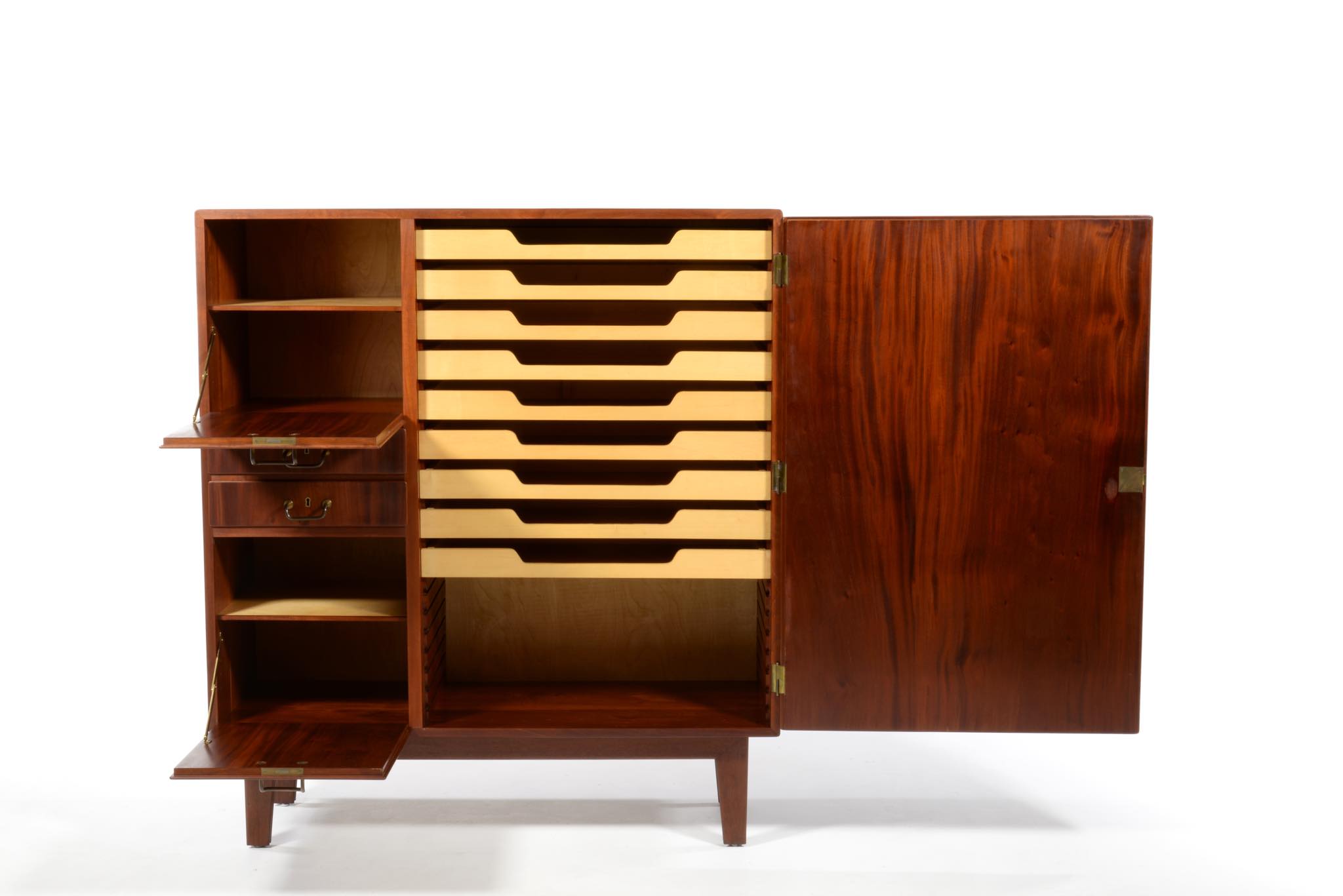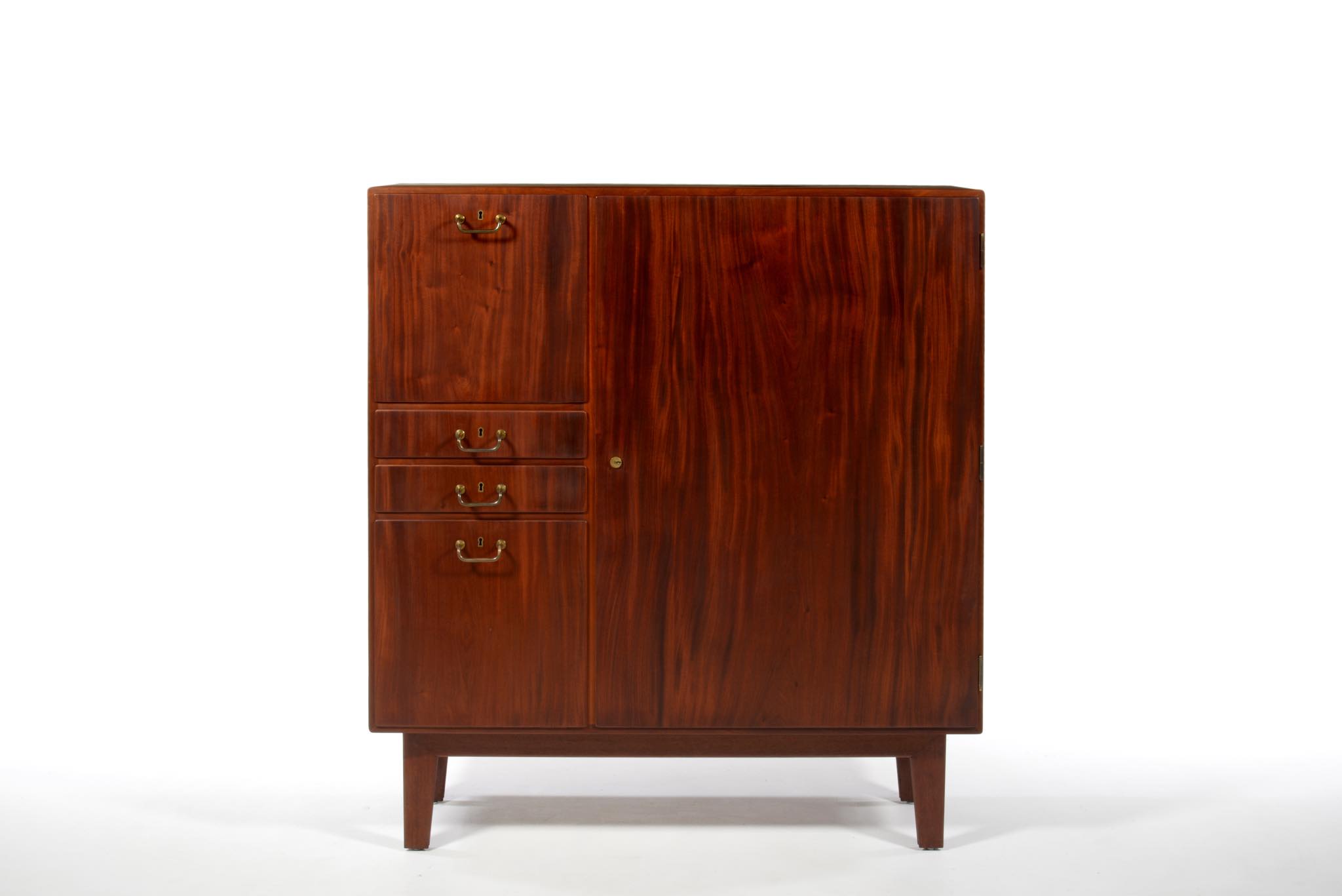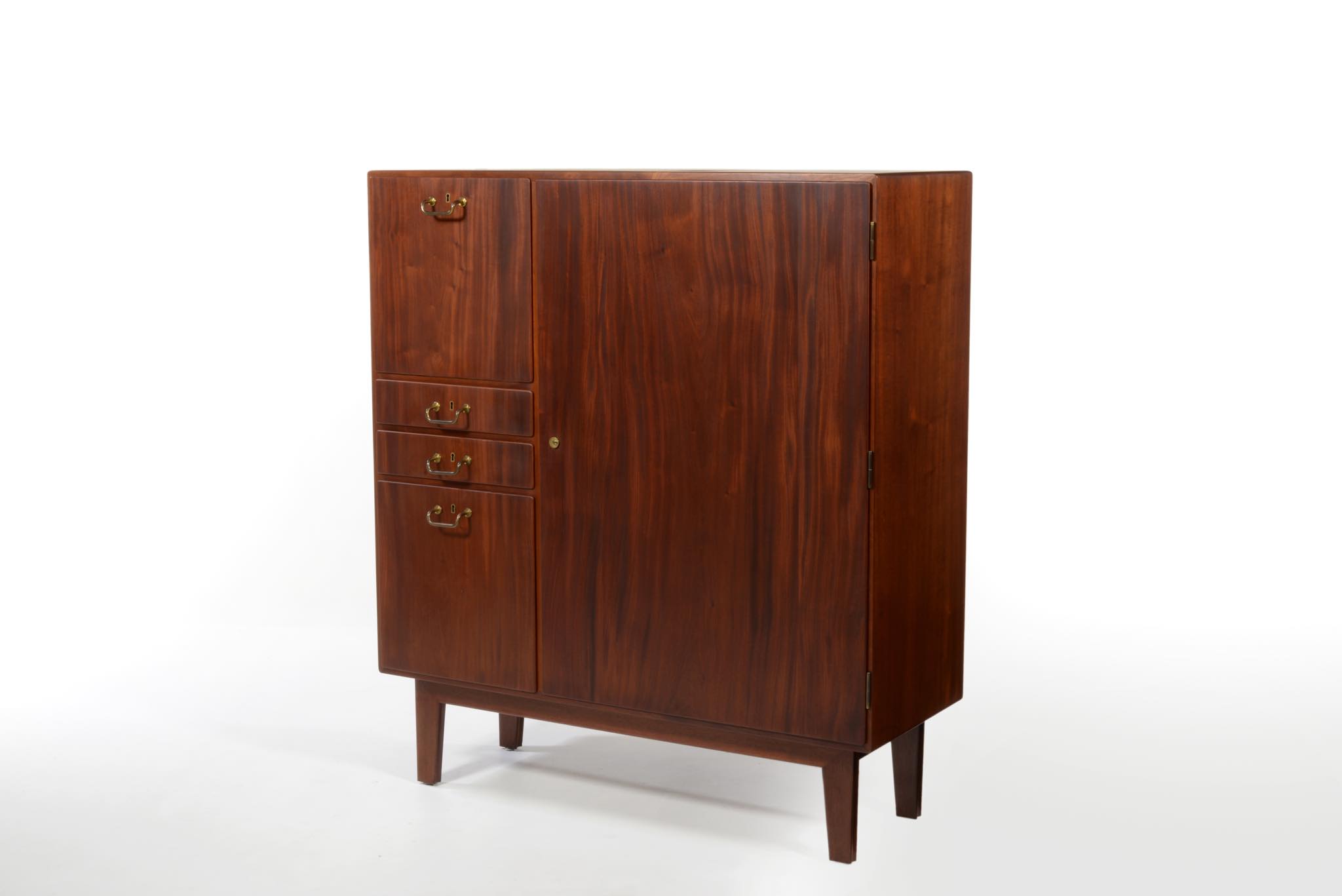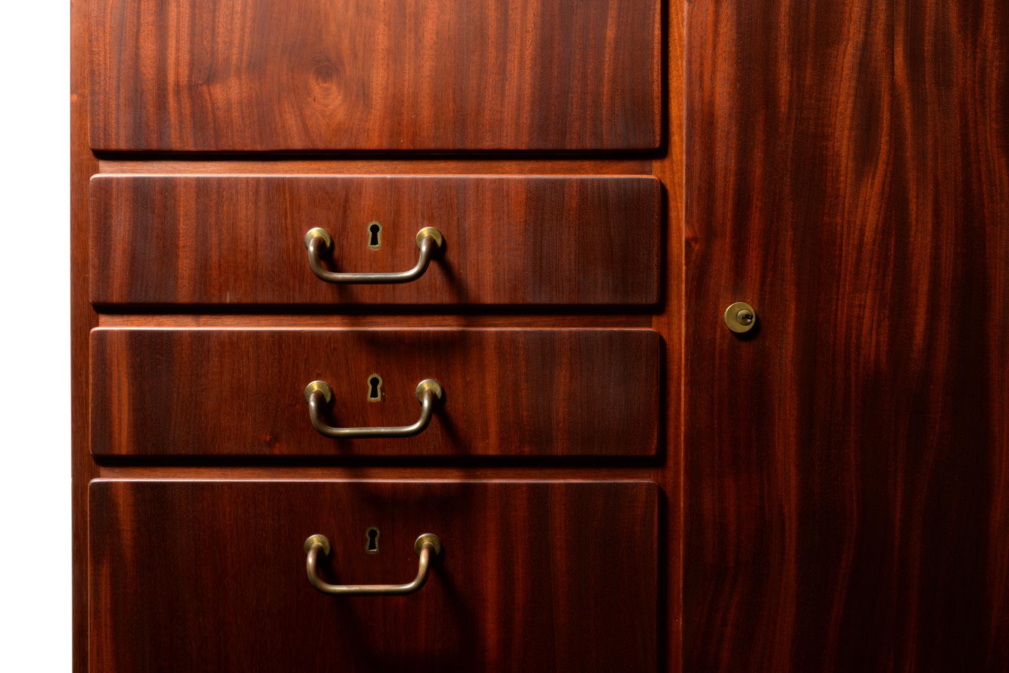 デンマークを代表するデザイナーのFinn Juhl/フィン・ユールよるカップボードキャビネットとして求めました。1938年、フィンユールが若干26才の頃の最初期にデザインしたとされ、キャビネットメーカーのニールス・ボッダーと組み、キャビネットメーカーズギルド展へ出展した時の作品です。このキャビネットは1938年の展示会に出されたそのものとなり、当時の写真と同じ木目文様がその証となるでしょう。本体は幻の銘木と云われるキューバンマホガニー材の無垢材を用いており、非常に重量があります。引手は真鍮を用いており、脚の形状も極めて独特な作りをしています。このキャビネットはお客様のご要望により当店にてお取り扱いさせていただきました。稀に見る非常に貴重なアイテムとなるため、皆様にもご覧頂きたく、ご本人にも許可を頂き、当店の企画展「Klassik Kollektion 2020」 (7/23~8/2)の期間、銀座の店頭にて特別に展示させて頂いております。機会がございましたら是非ご覧ください。