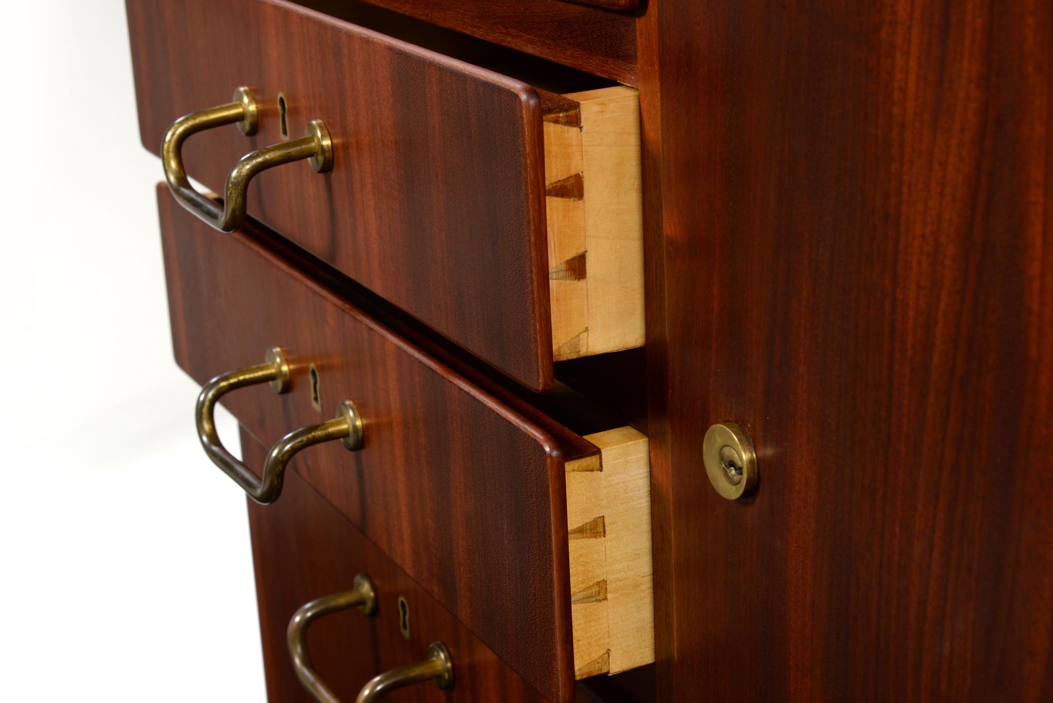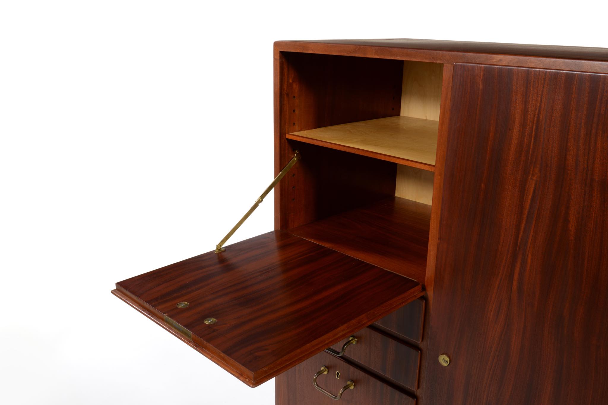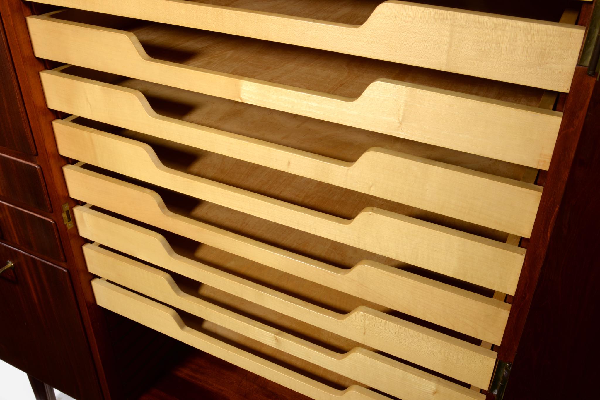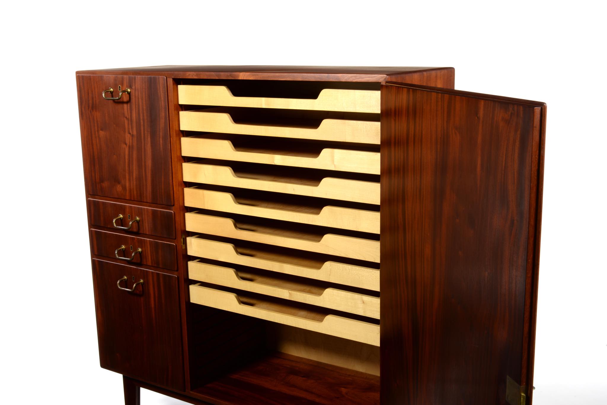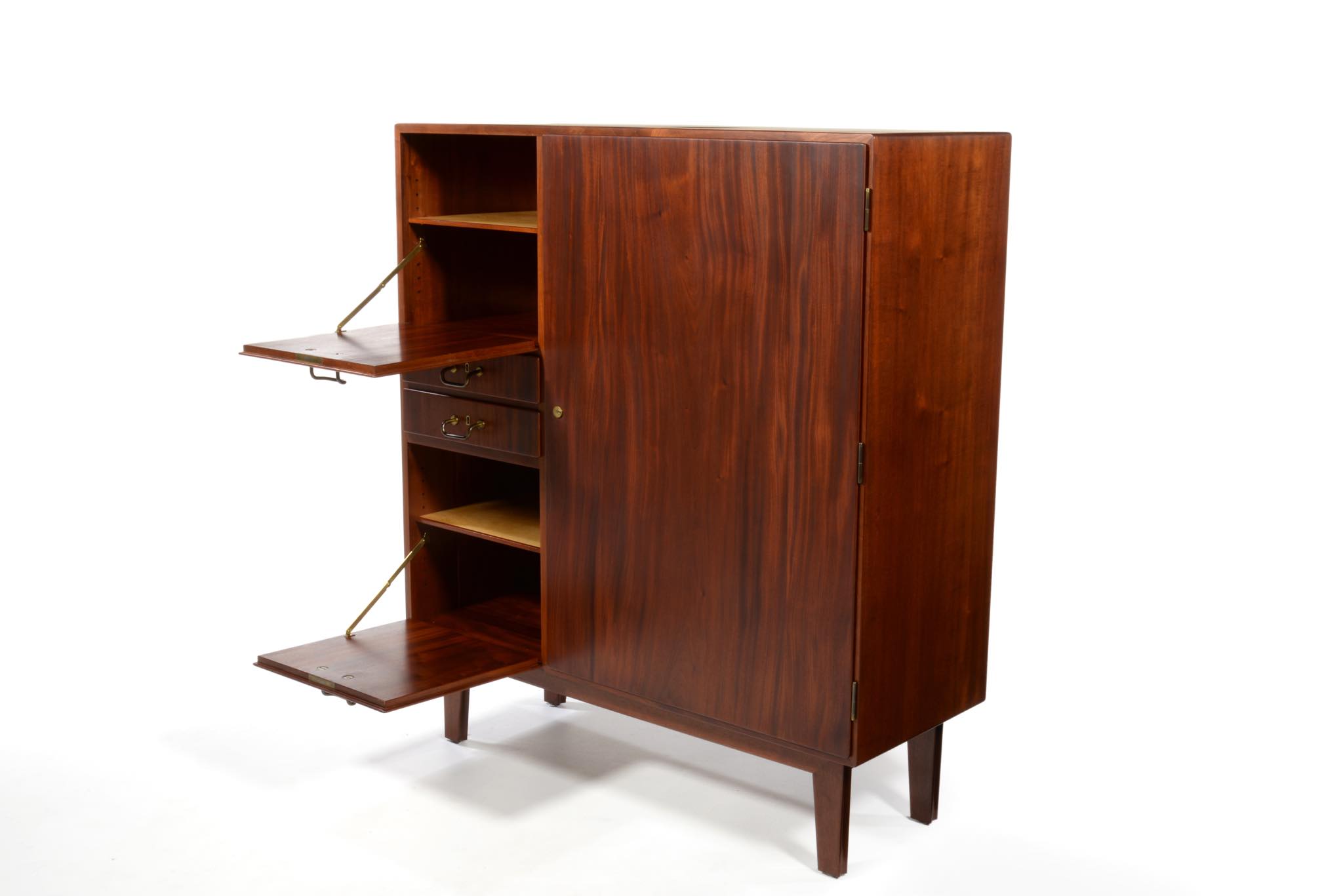 デンマークを代表するデザイナーのFinn Juhl/フィン・ユールよるカップボードキャビネットとして求めました。1938年、フィンユールが若干26才の頃の最初期にデザインしたとされ、キャビネットメーカーのニールス・ボッダーと組み、キャビネットメーカーズギルド展へ出展した時の作品です。このキャビネットは1938年の展示会に出されたそのものとなり、当時の写真と同じ木目文様がその証となるでしょう。本体は幻の銘木と云われるキューバンマホガニー材の無垢材を用いており、非常に重量があります。引手は真鍮を用いており、脚の形状も極めて独特な作りをしています。このキャビネットはお客様のご要望により当店にてお取り扱いさせていただきました。稀に見る非常に貴重なアイテムとなるため、皆様にもご覧頂きたく、ご本人にも許可を頂き、当店の企画展「Klassik Kollektion 2020」 (7/23~8/2)の期間、銀座の店頭にて特別に展示させて頂いております。機会がございましたら是非ご覧ください。