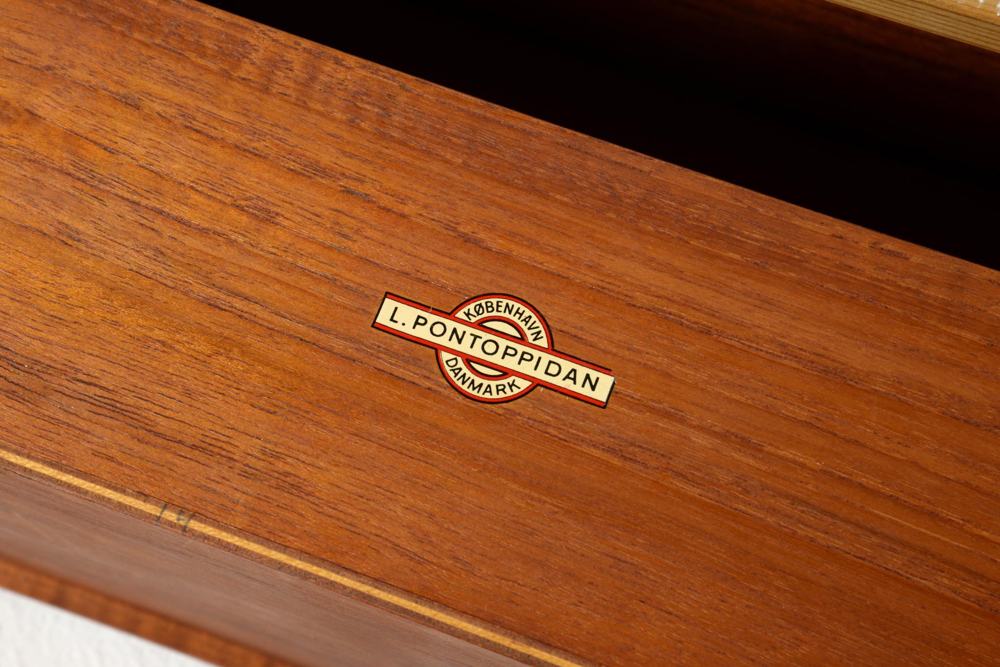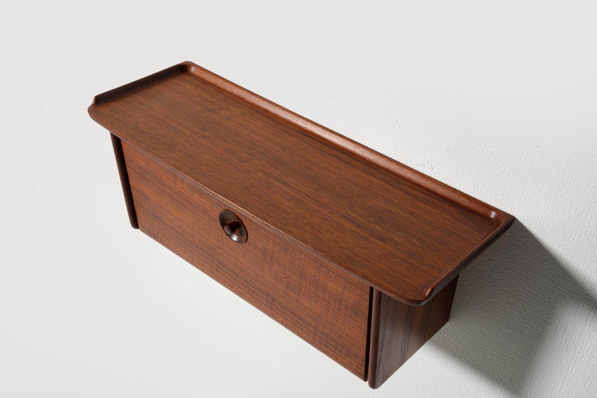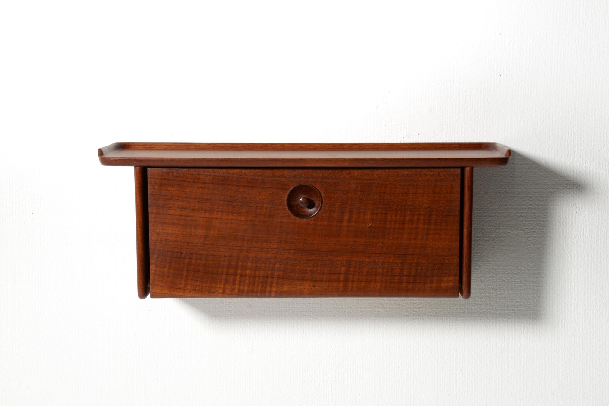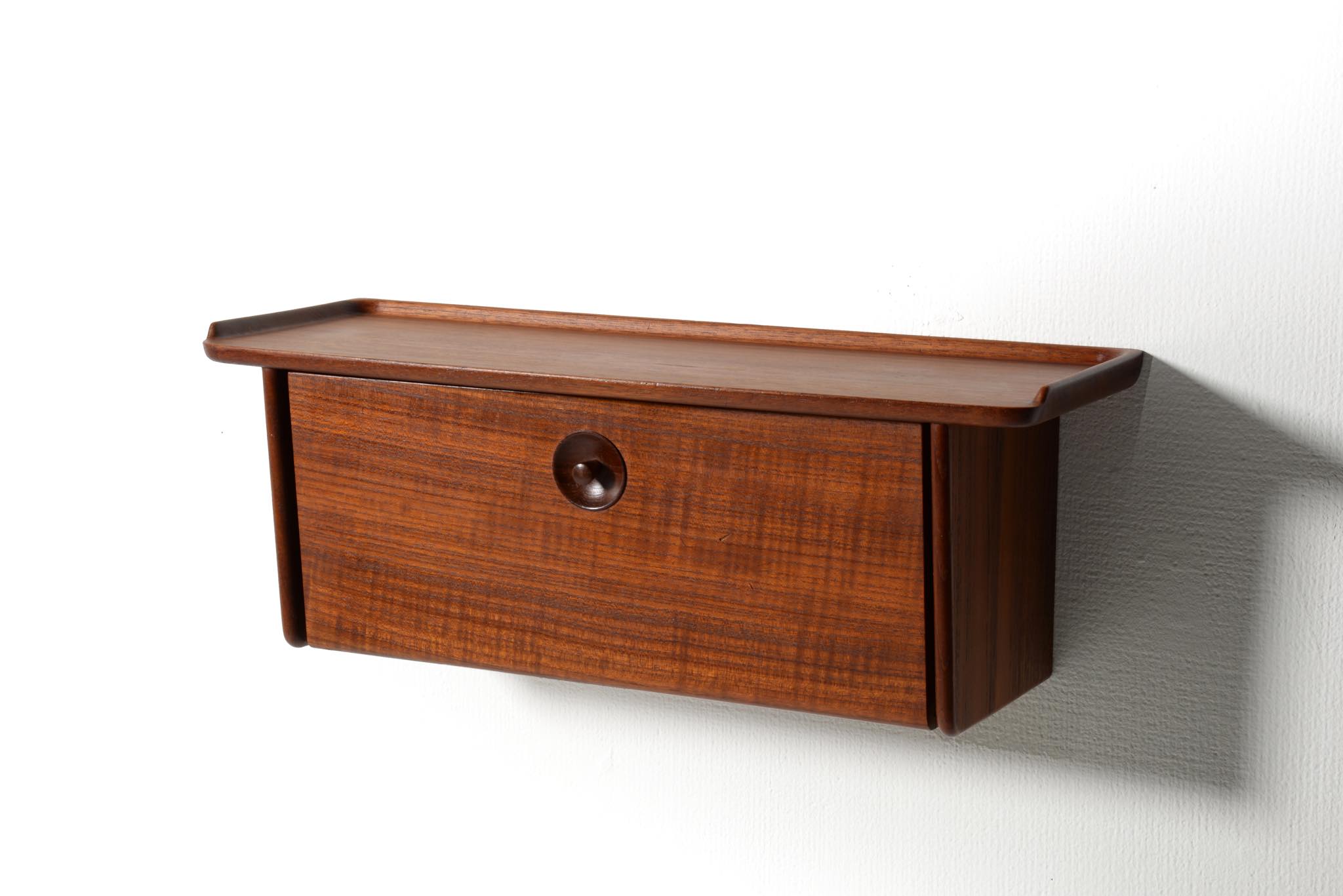 上質な家具を手がける工房として知られる、ポントピダンによるコンソールボックスです。1950年代頃に作られたものでしょう。タイ国原産と思しき良質なチーク材が用いられています。玄関に設え、衣類ブラシや家の鍵などを収納したものでしょう。コンディションは良好ですが、正面扉の一部に打痕がみられます。