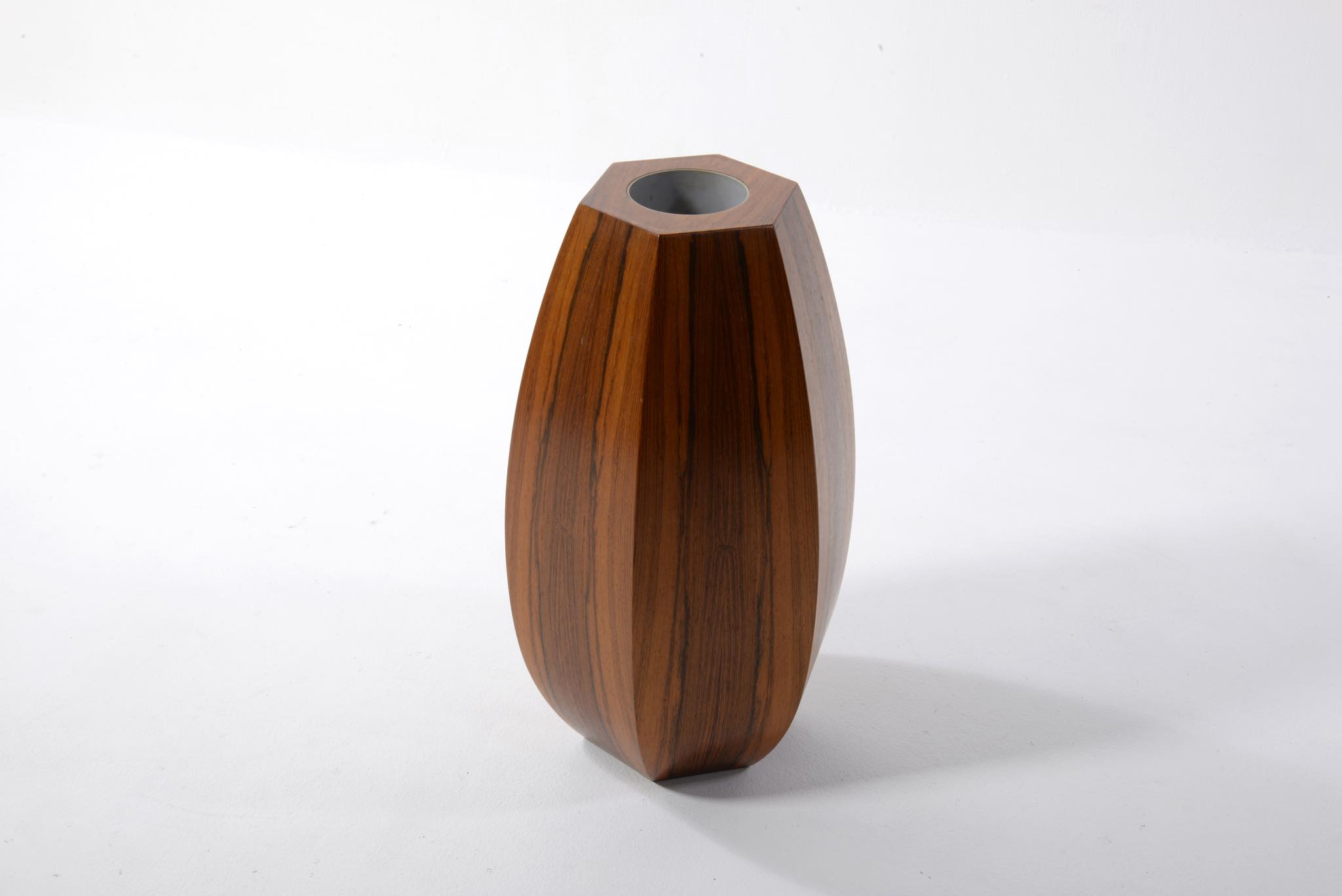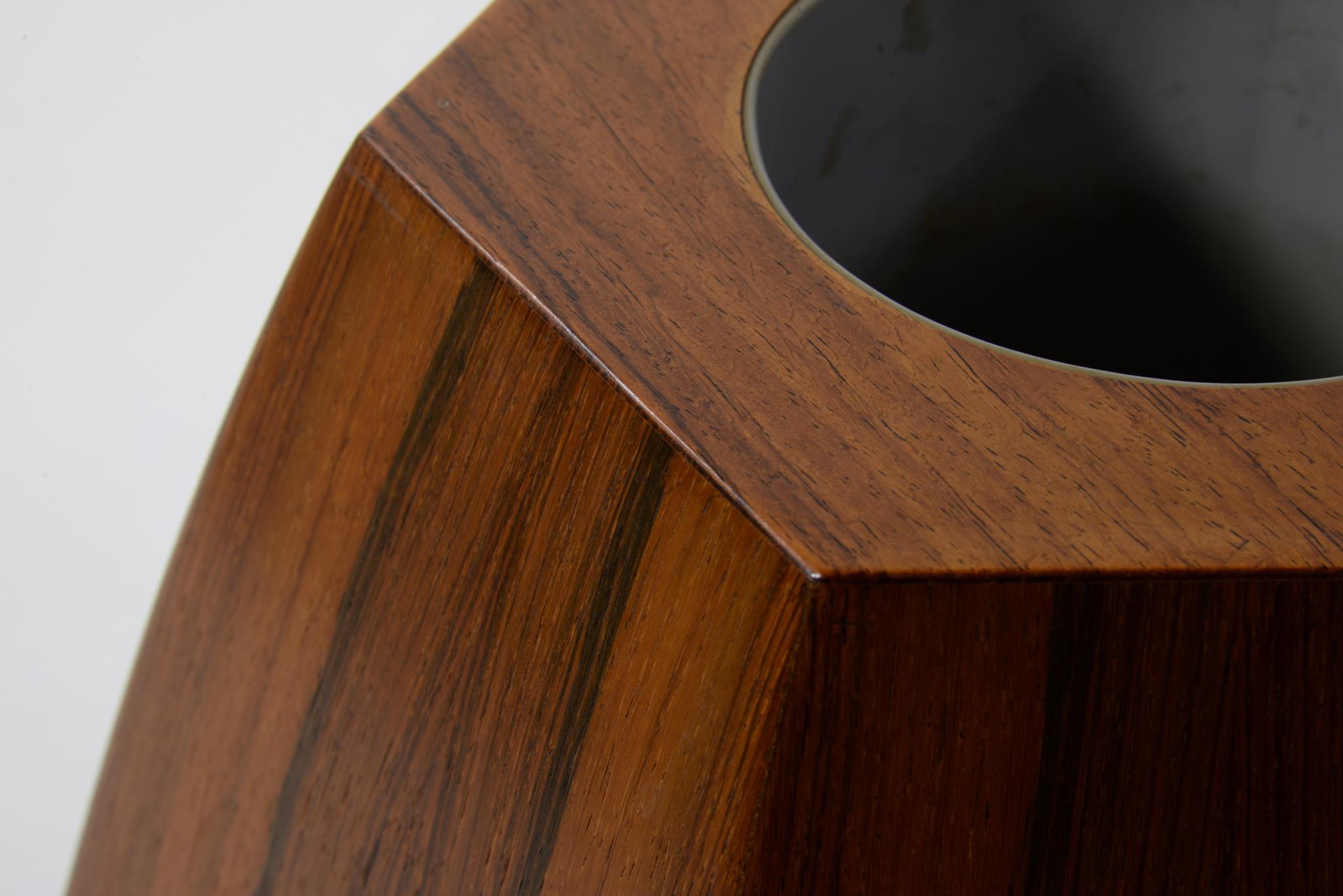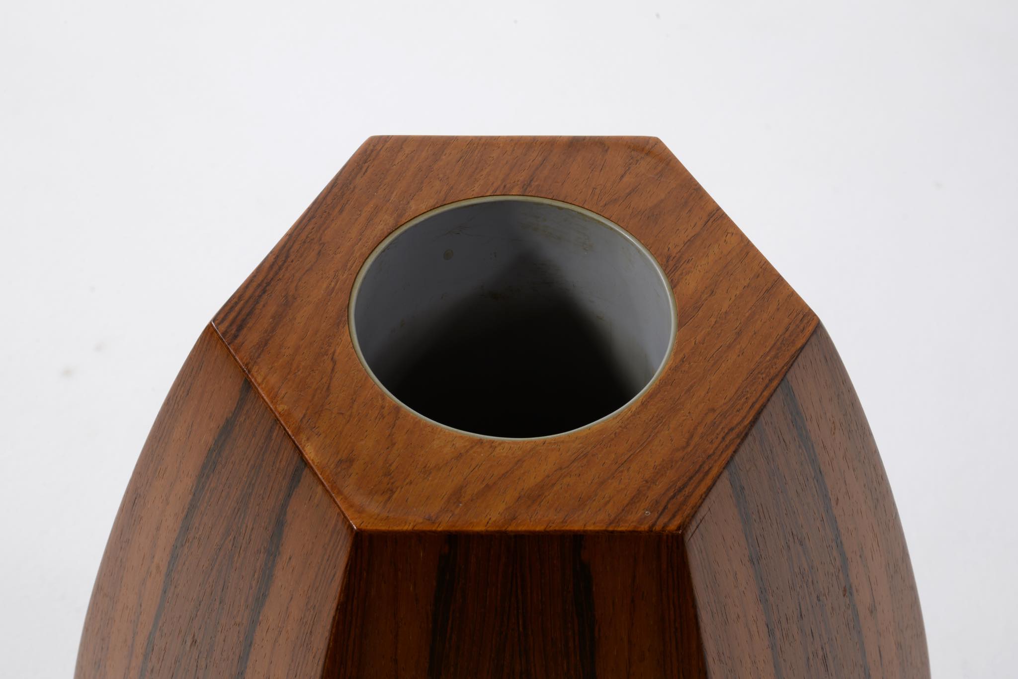 ローズウッドの突き板で作られた大きなベースです。1960年代のデンマークで作られたものでしょう。工房など詳細はわかっておりませんが、床に置いても映える大きなサイズ感と、見ごたえのある木目文様が特徴的です。落しは樹脂で作られているようで、今のところ水漏れはありません。目立ったダメージはなく綺麗な状態です。