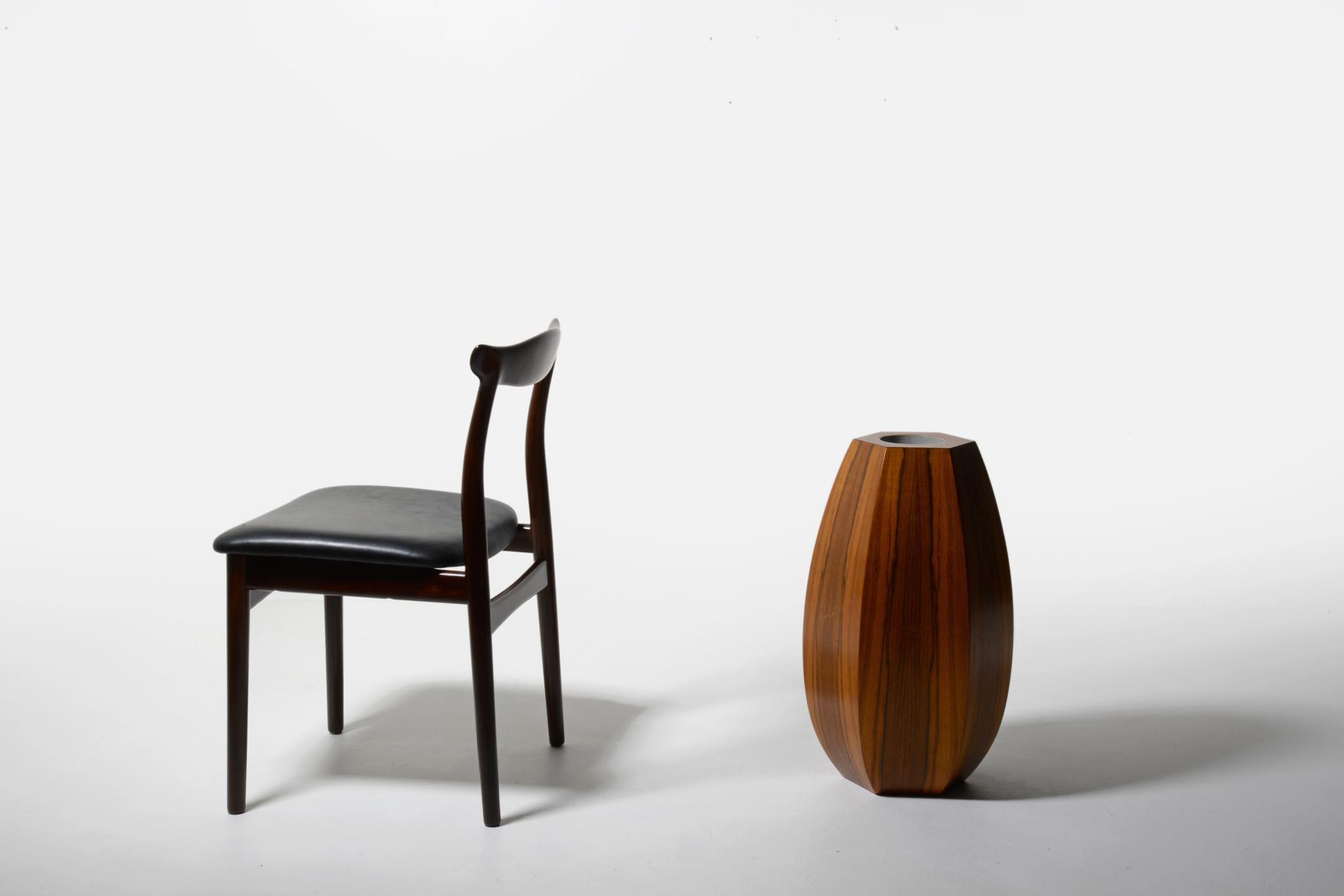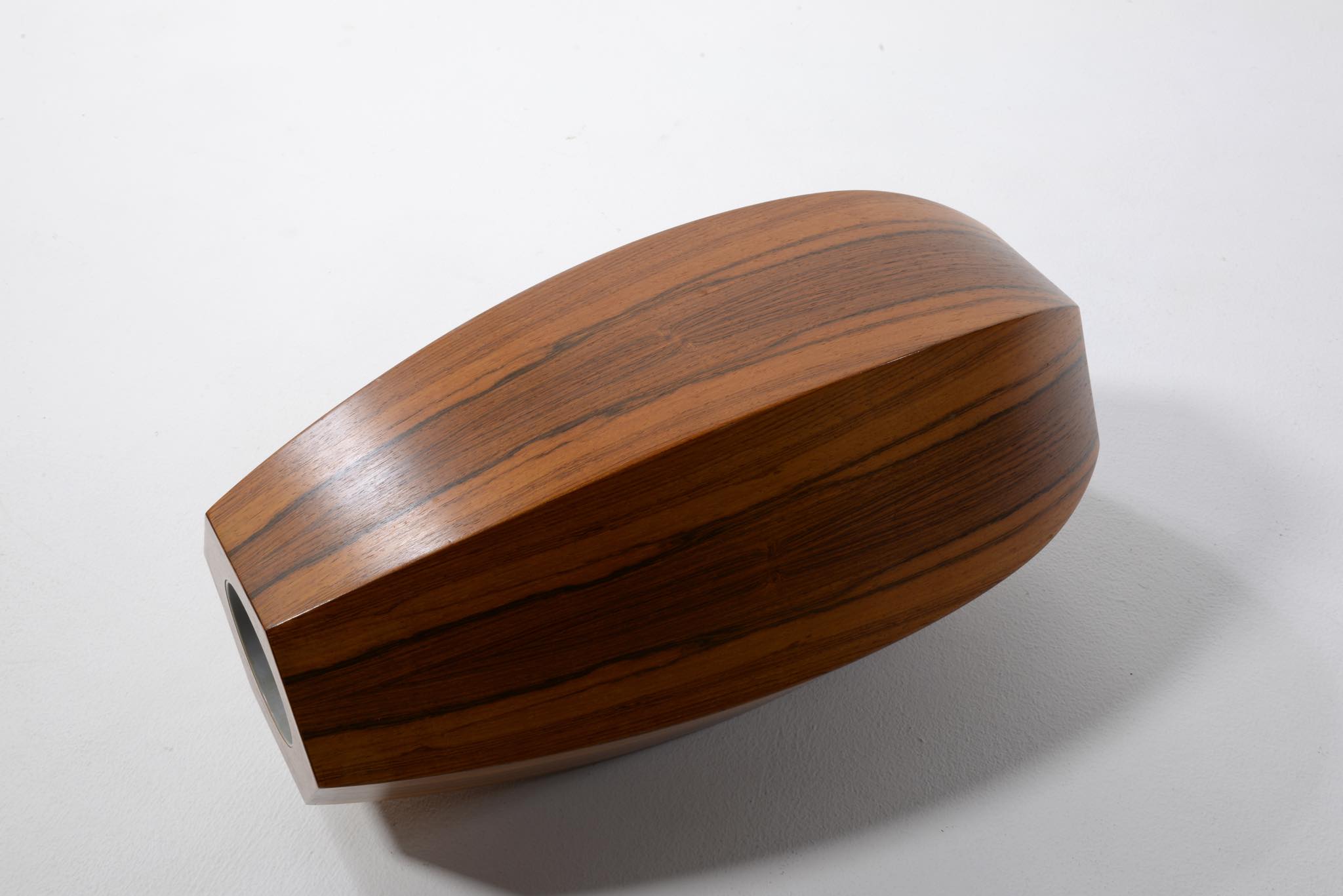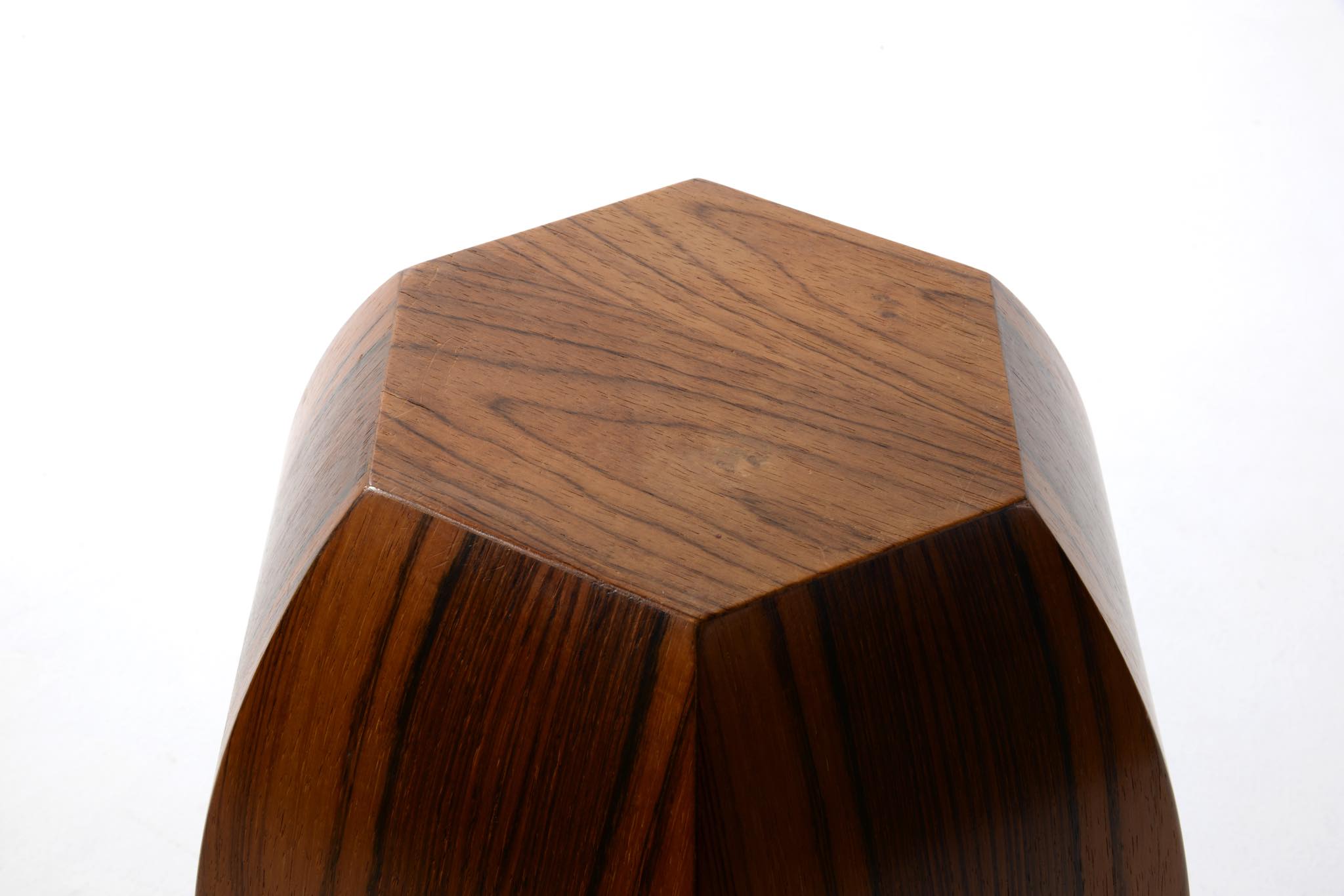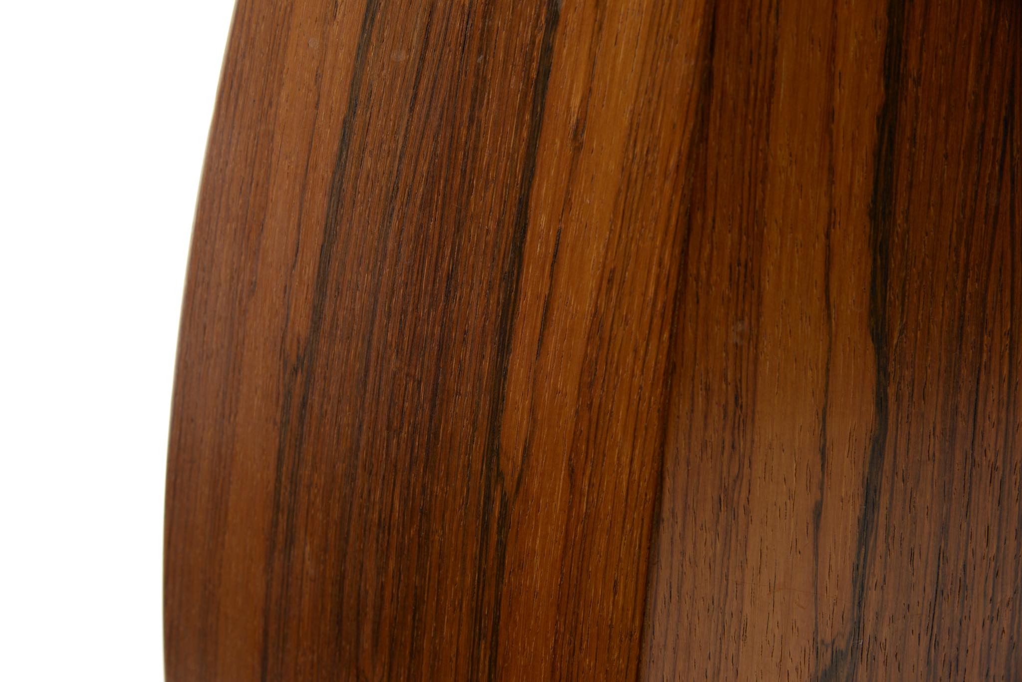 ローズウッドの突き板で作られた大きなベースです。1960年代のデンマークで作られたものでしょう。工房など詳細はわかっておりませんが、床に置いても映える大きなサイズ感と、見ごたえのある木目文様が特徴的です。落しは樹脂で作られているようで、今のところ水漏れはありません。目立ったダメージはなく綺麗な状態です。