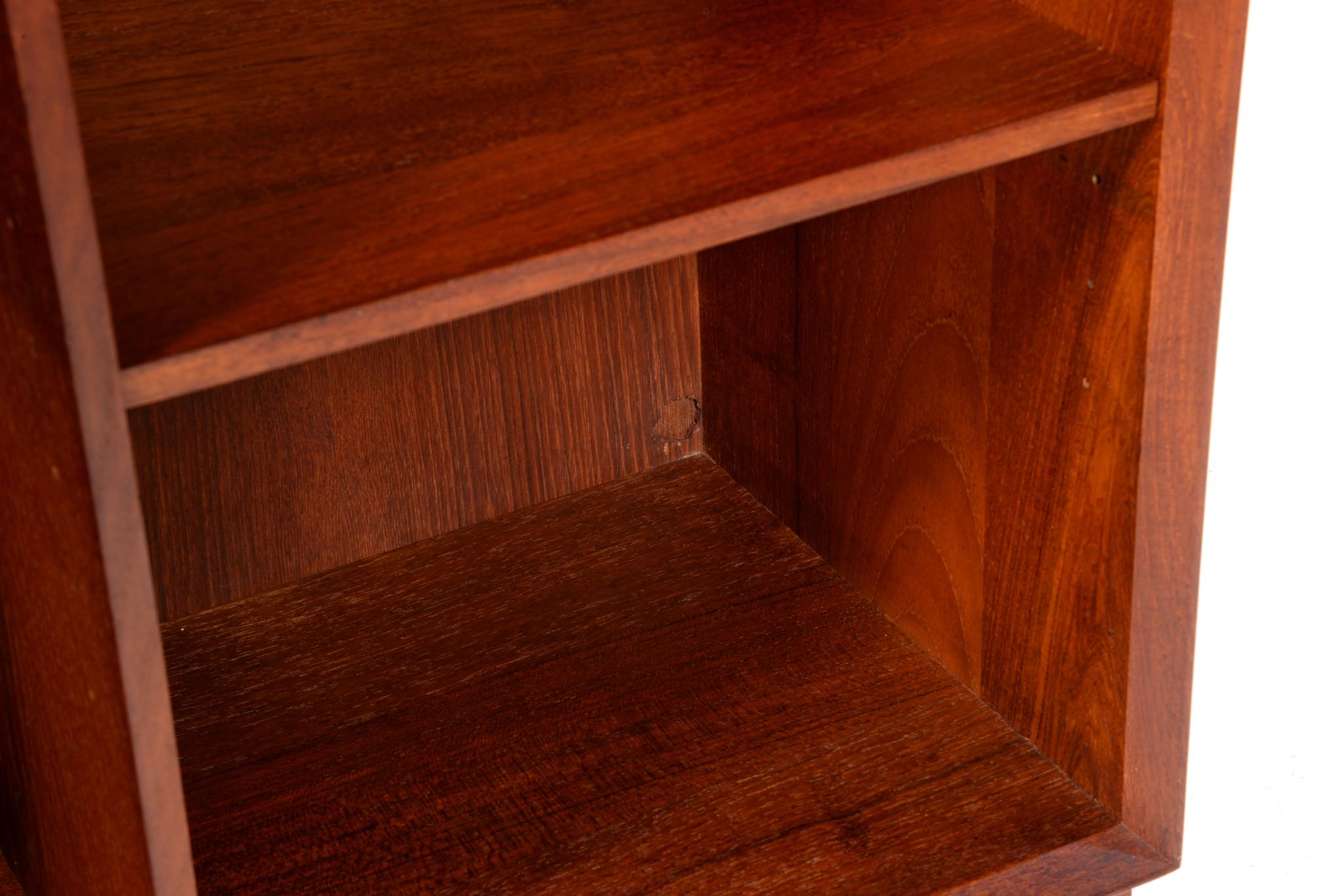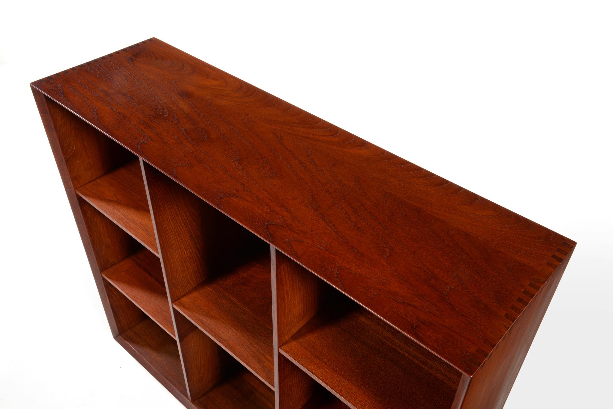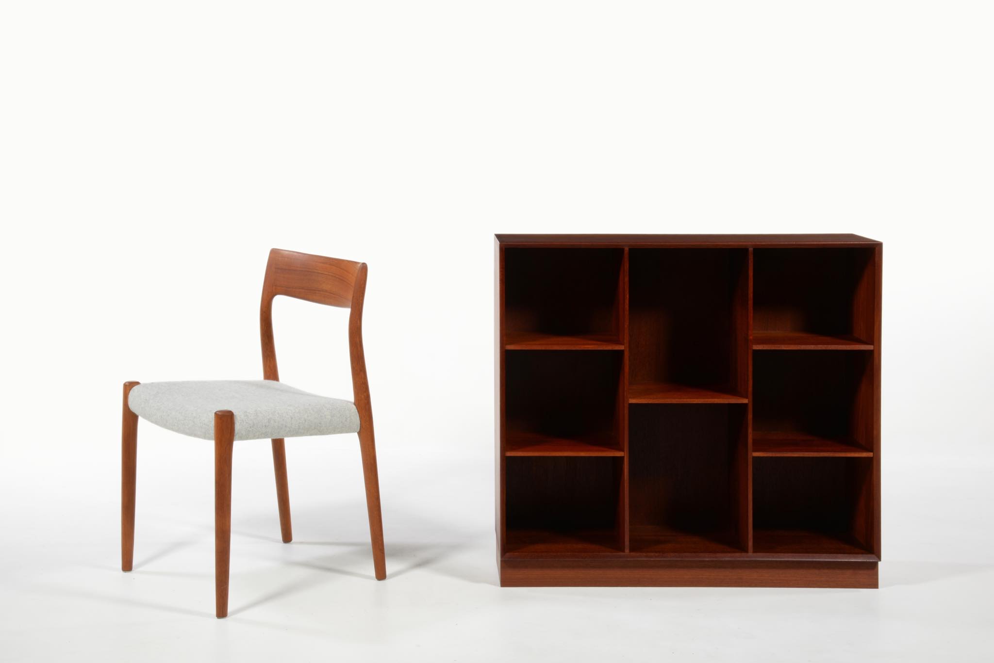 1950年代に活躍したデザイナーユニット、Peter Hvidt/ピーター・ヴィッツと、Orla Mølgaard Nielsen/オルラ・ミュルゴー・ニールセンによるブックシェルフです。無垢のチーク材が用いられたシリーズで、キャビネットなども展開されていました。こちらのブックケースも1950年代頃に作られたものでしょう。深い色の無垢のチーク材が魅力です。コンディションにつきまして、背板の一部に配線を通す穴が開けられています。ベースを外せば前掲のキャビネットの上に乗せることも可能です。