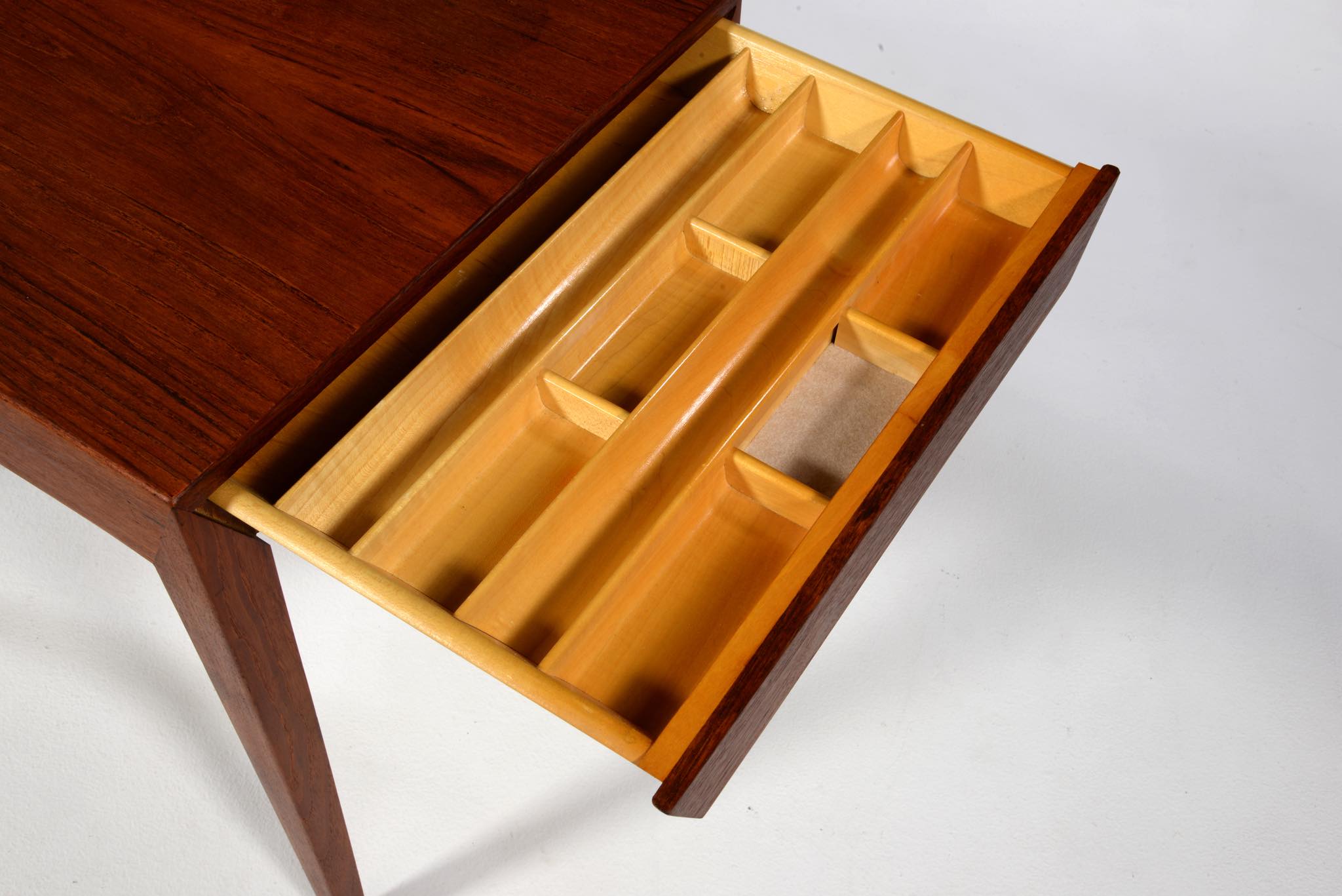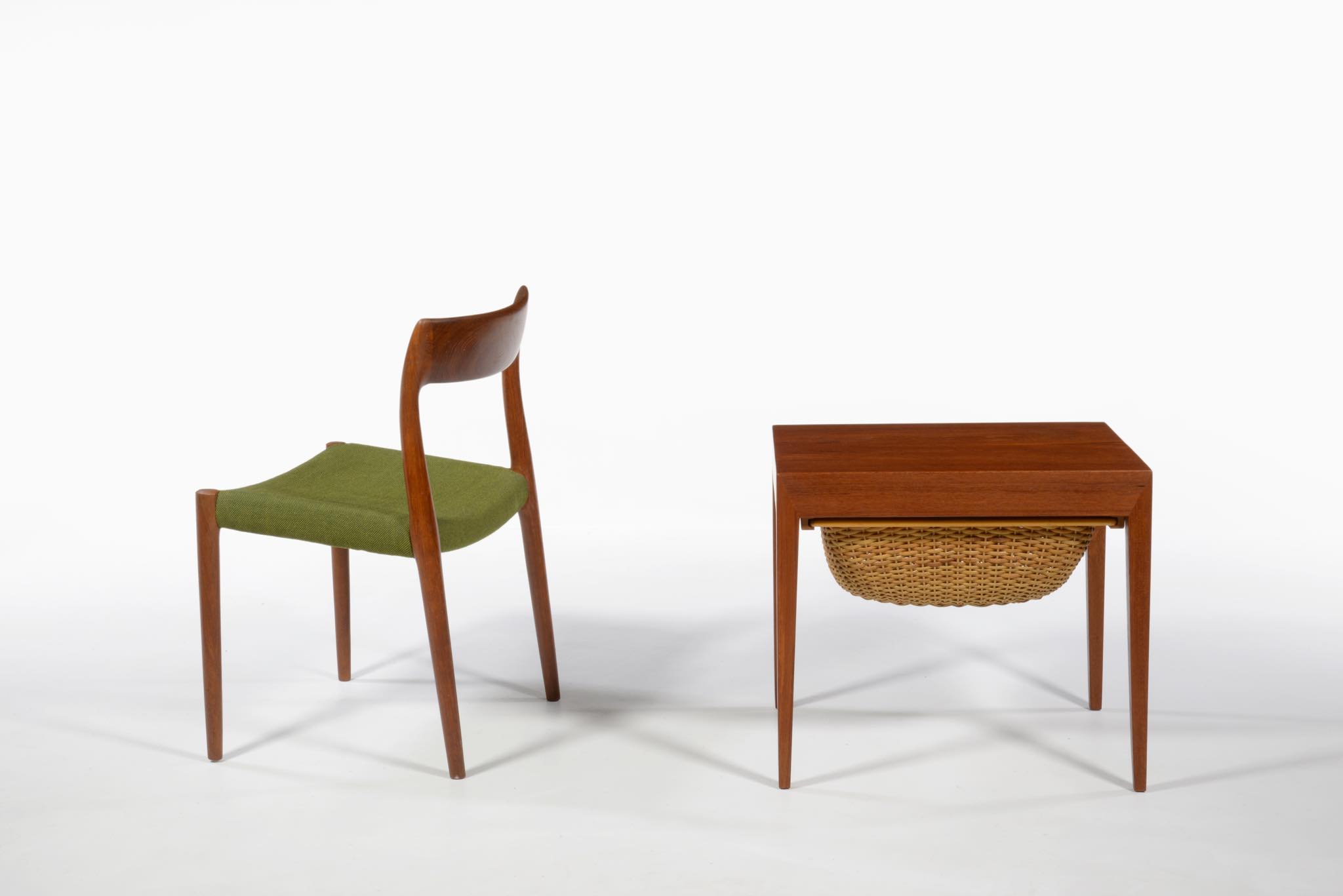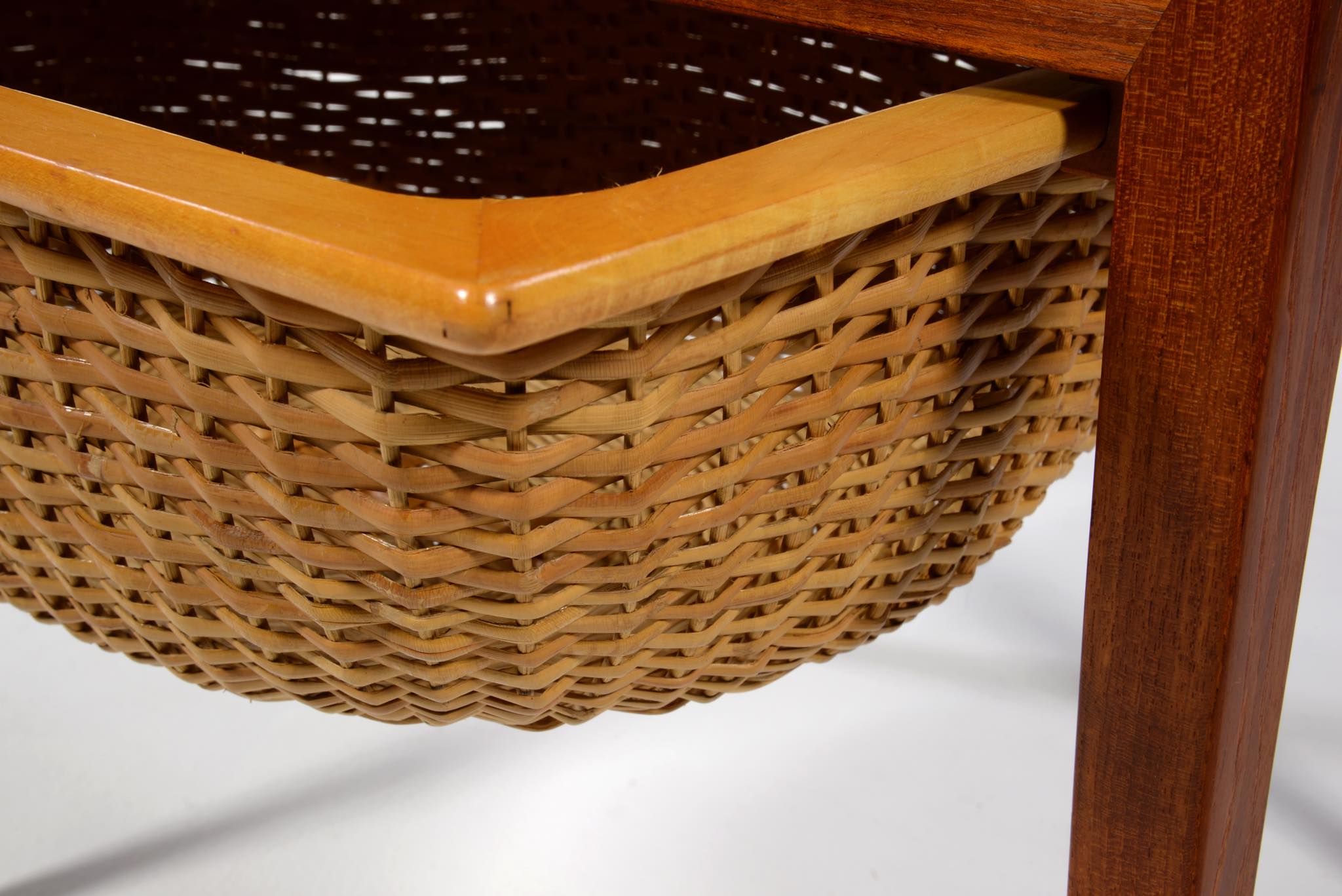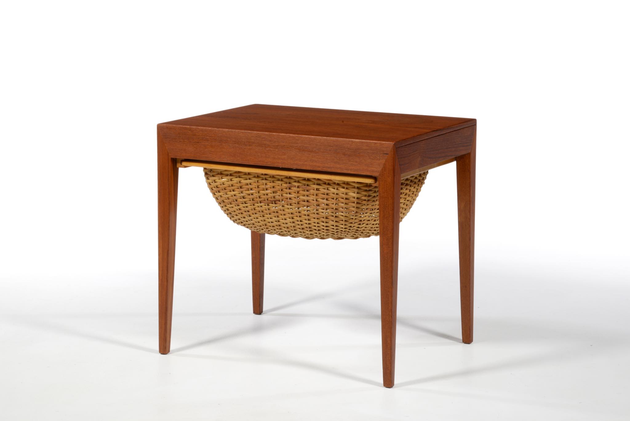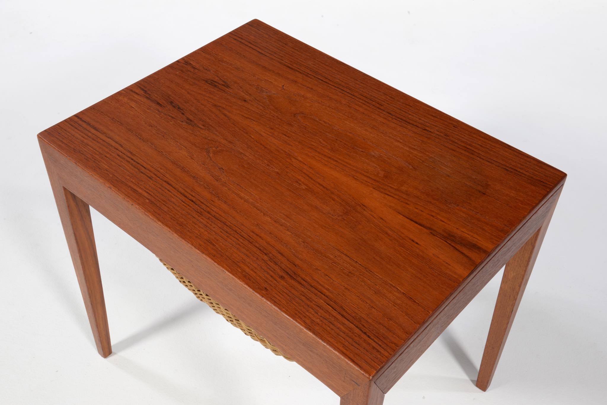 Haslev/ハスレヴ家具工房によるソーイングテーブルです。1950~60年代頃に作られたものでしょう。手芸につかう道具類を仕舞うためのテーブルで、下部には毛糸玉を入れる篭が備わります。コンディションはまずまずで、天板や抽斗内には経年やこれまでの使用による染みが見られます。クリーニングを行いチークオイルにて仕上げております。