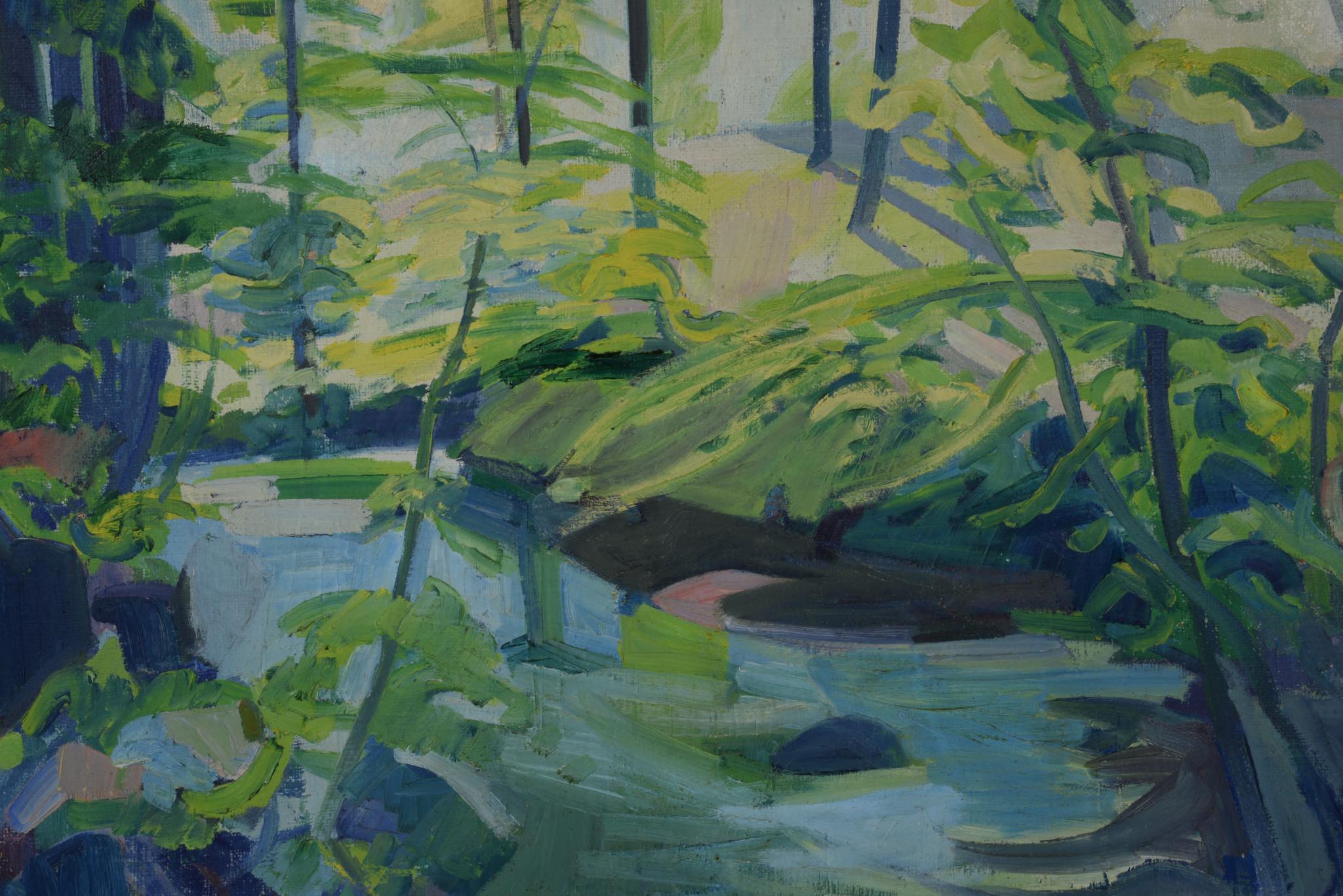 戦前〜戦後頃にかけて活躍したデンマークの画家、Axel Bentzen/アクセル・ベンツェンによる風景画油彩作品です。初夏の頃でしょうか。ユトランド半島、モースゴーの森林の情景が描かれています。ラフにペイントされたフレームはオリジナルで、大振りなサイズ感の作品です。キャンバスに若干の緩みが生じており、また、僅かですが絵の具の剥離が見られる箇所があります。