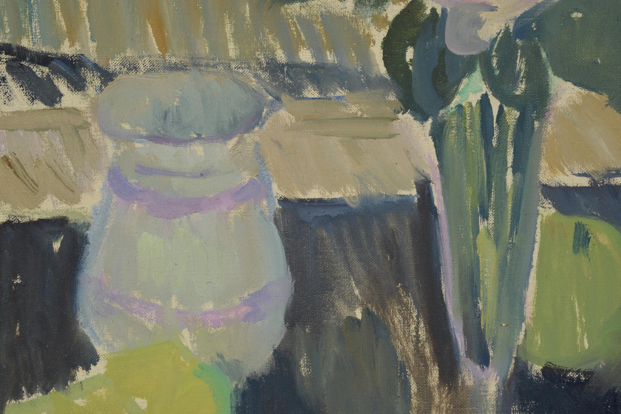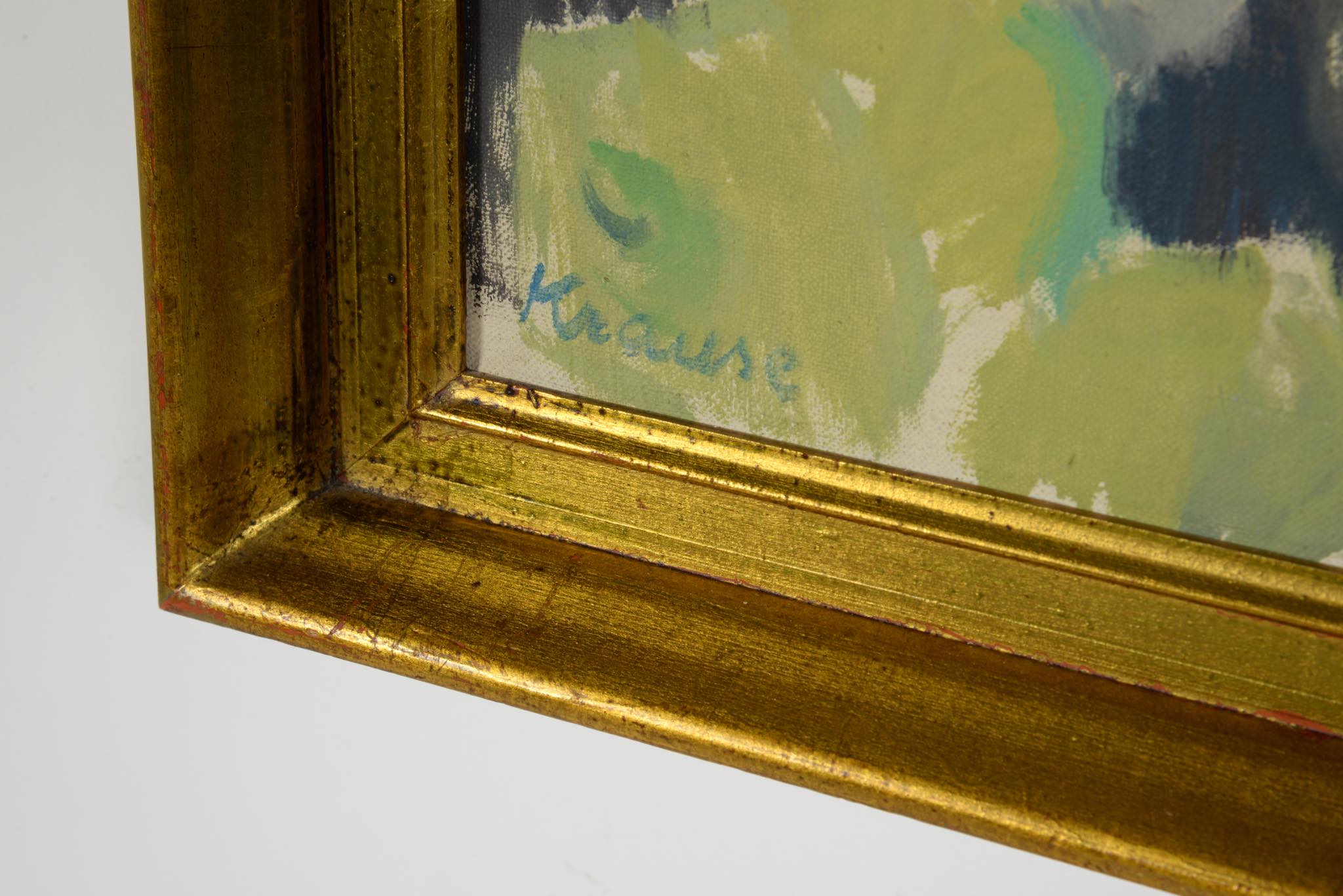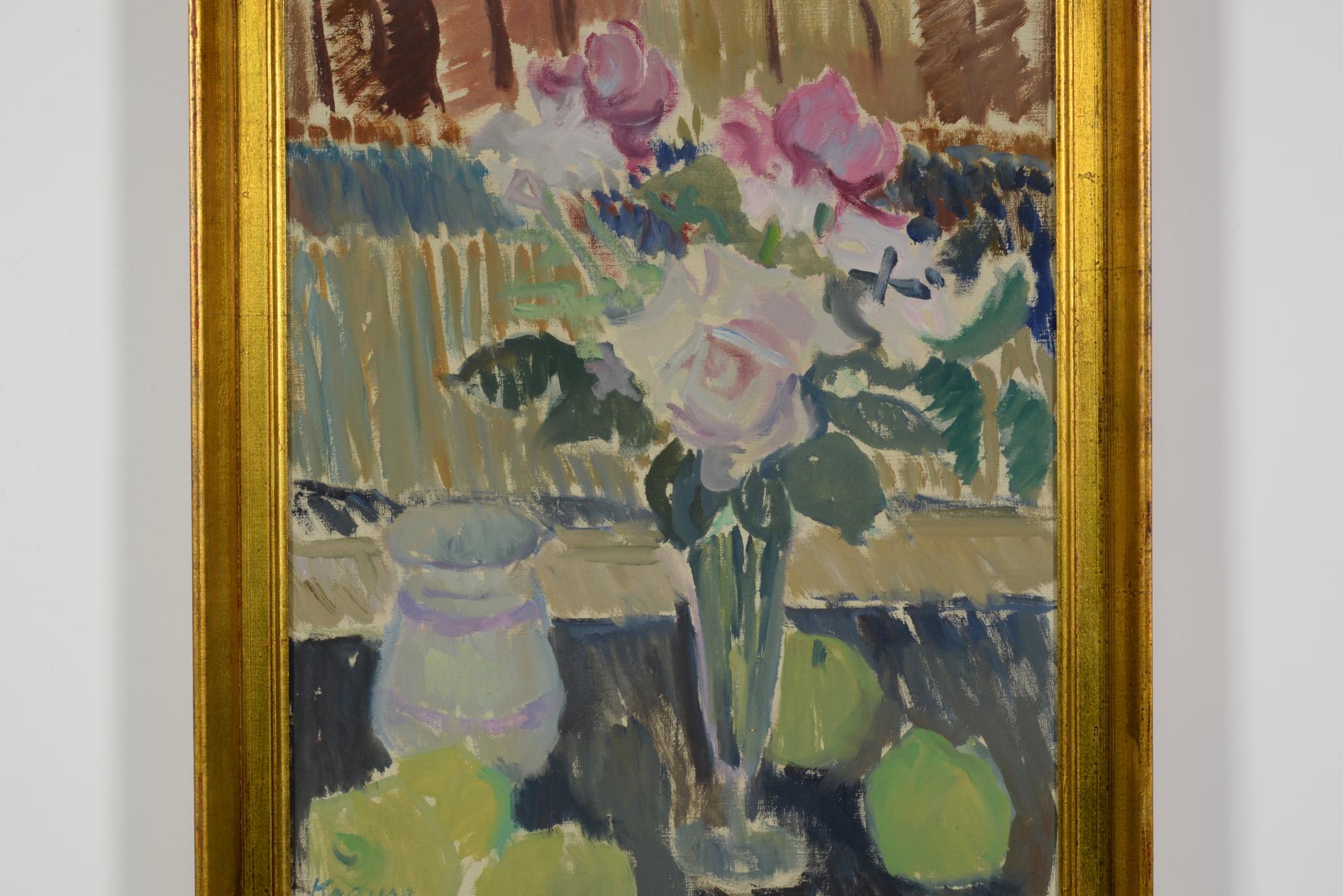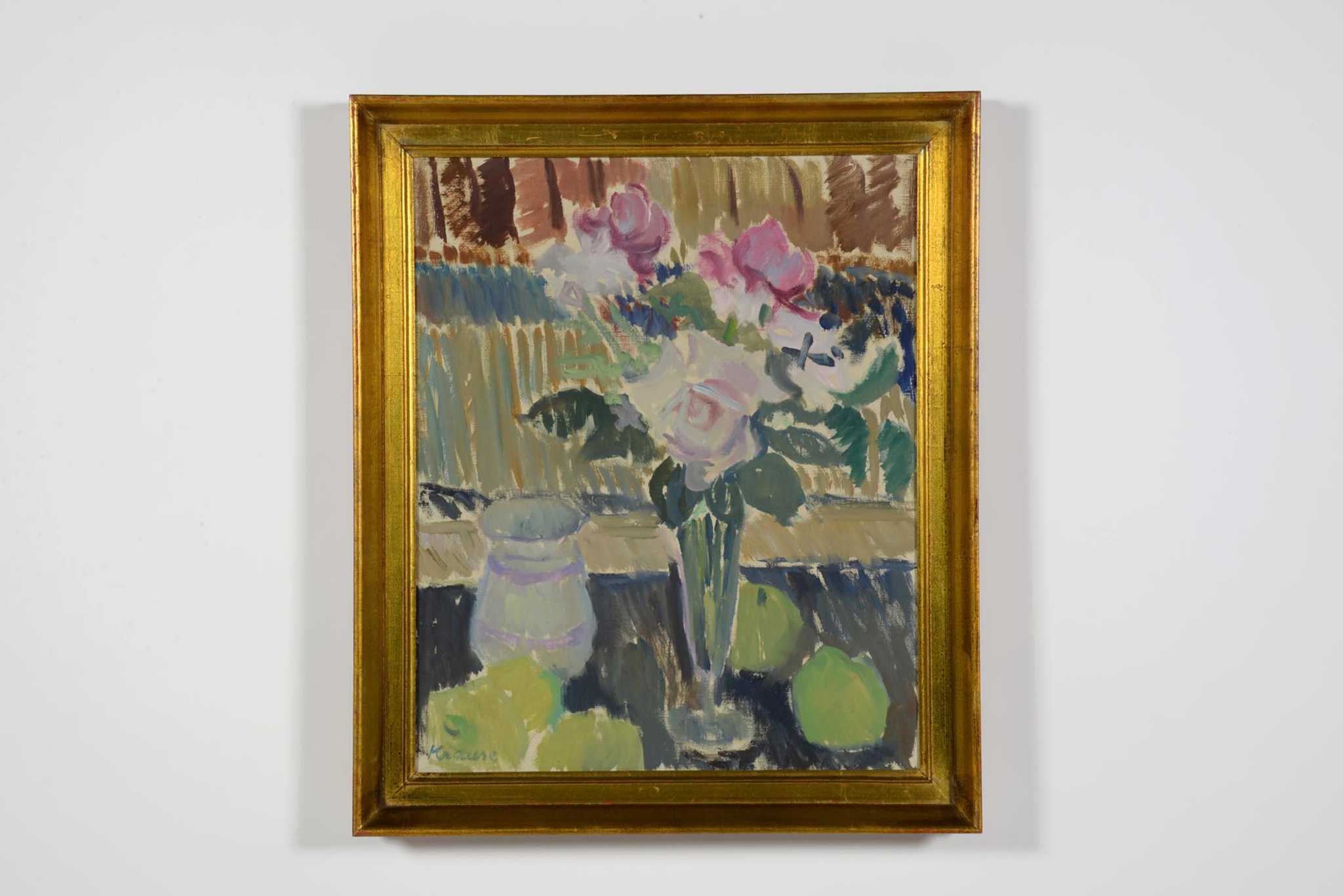 デンマークの女流画家、Ellen Krause Rørup/エレン・クラウセ・ロイルップによる静物画油彩作品です。卓上で咲く乱れる花や果物、ベースなどが描かれています。額はオリジナルでコンディションは良好です。