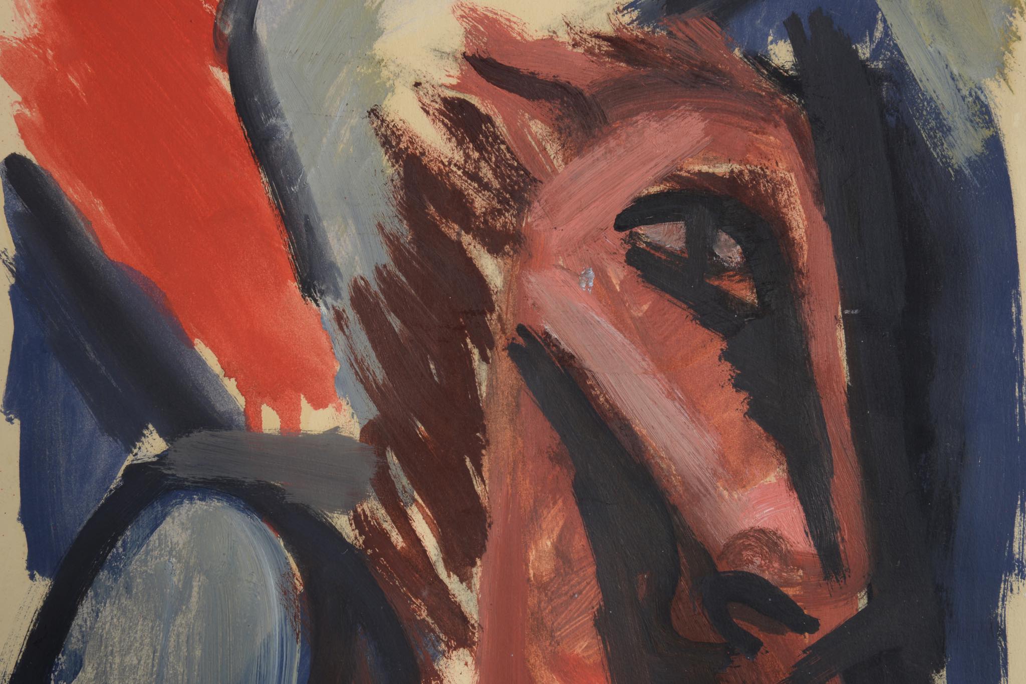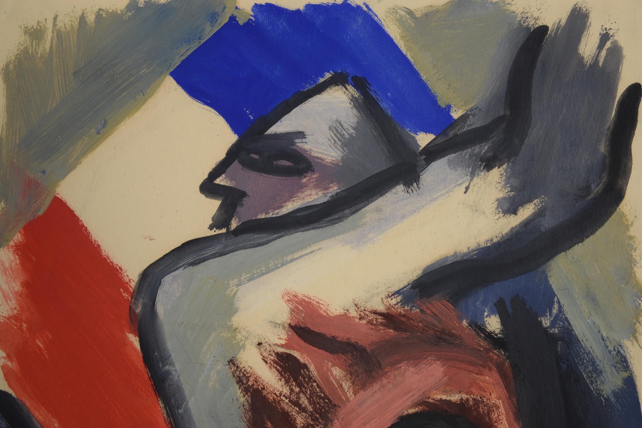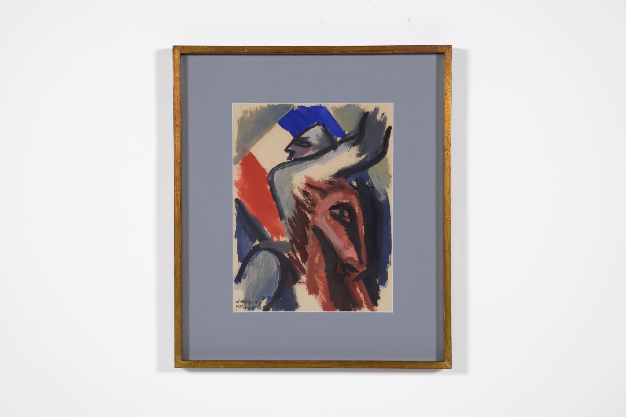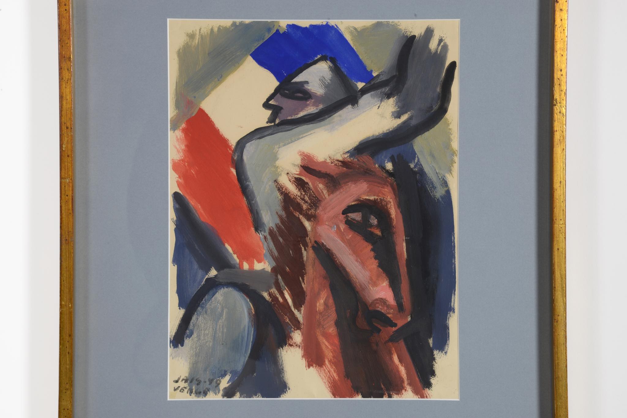 デンマークの芸術家、Jais Nielsen/ヤイス・ニールセンによる水彩画作品です。馬に跨る精悍な顔つきの男、そして背景にトリコロールが描かれています。1949年に描かれた作品ですが、この年、氏は南フランスのヴァンスを訪れたようで、トリコロールを背景にした同年号の作品をいくつか描いています。オリジナルのフレームはそのままに、マットを新調しました。