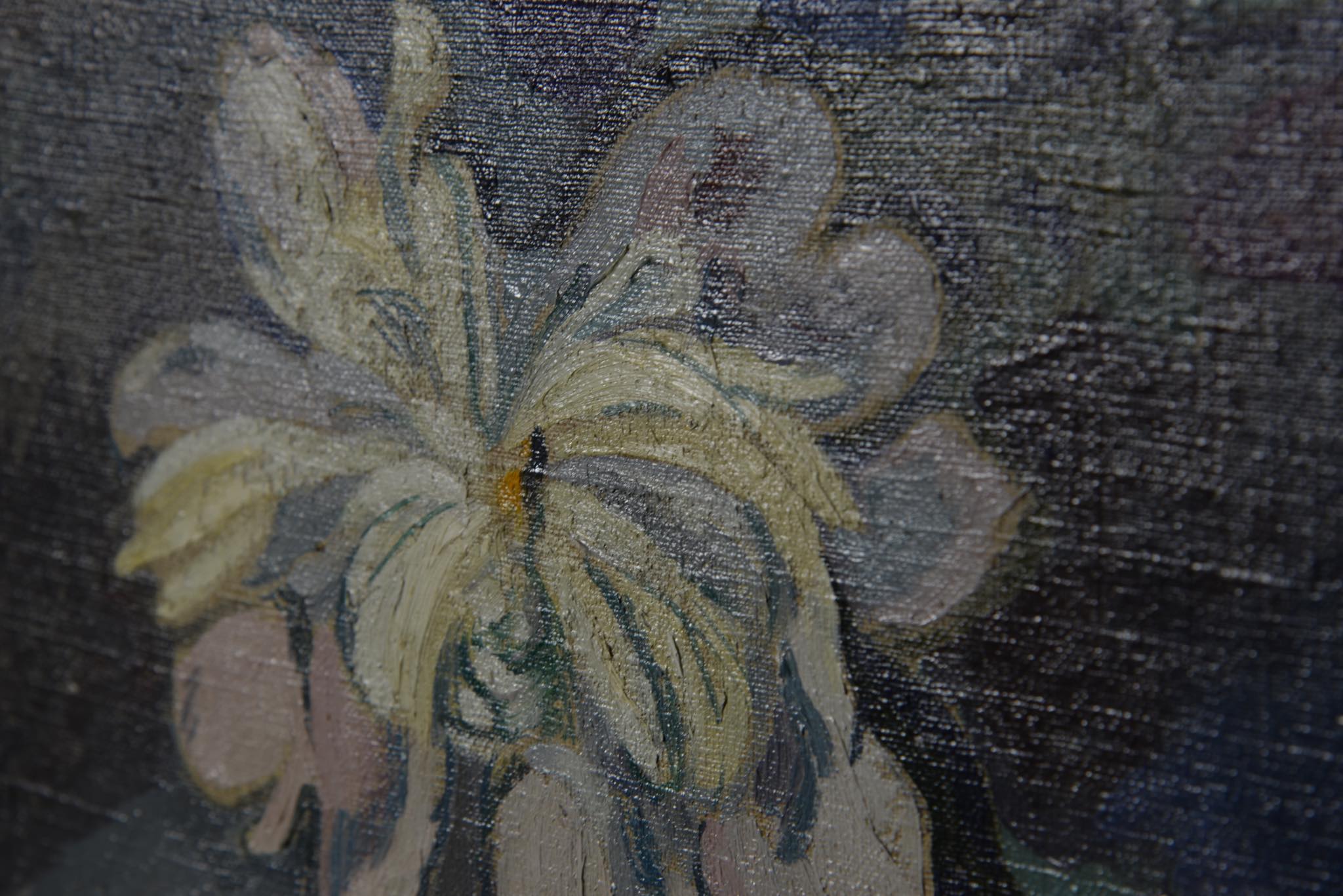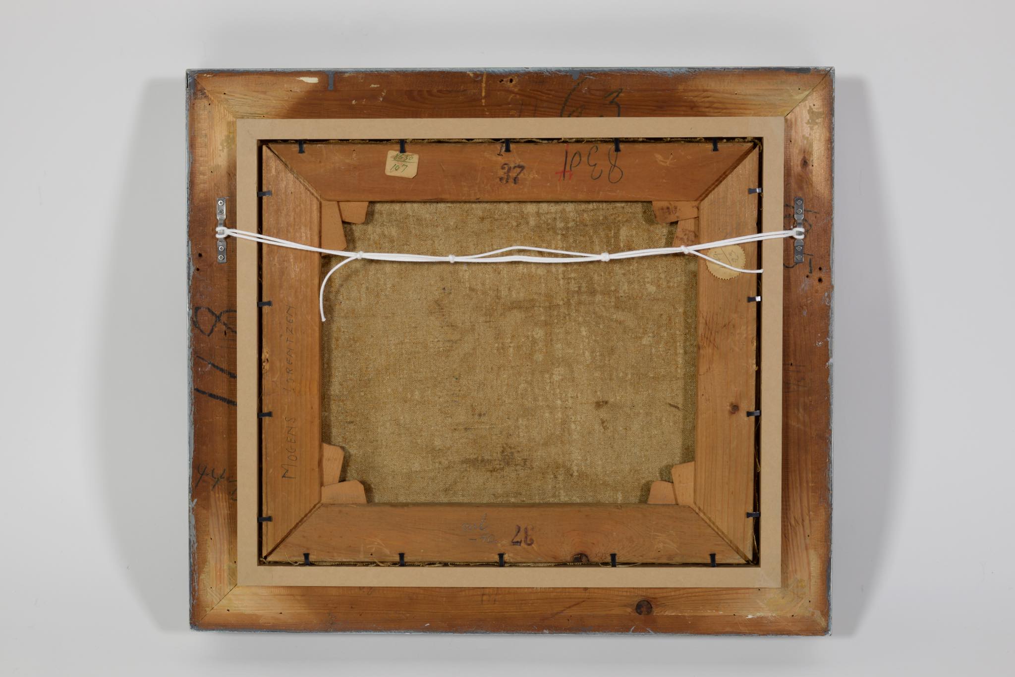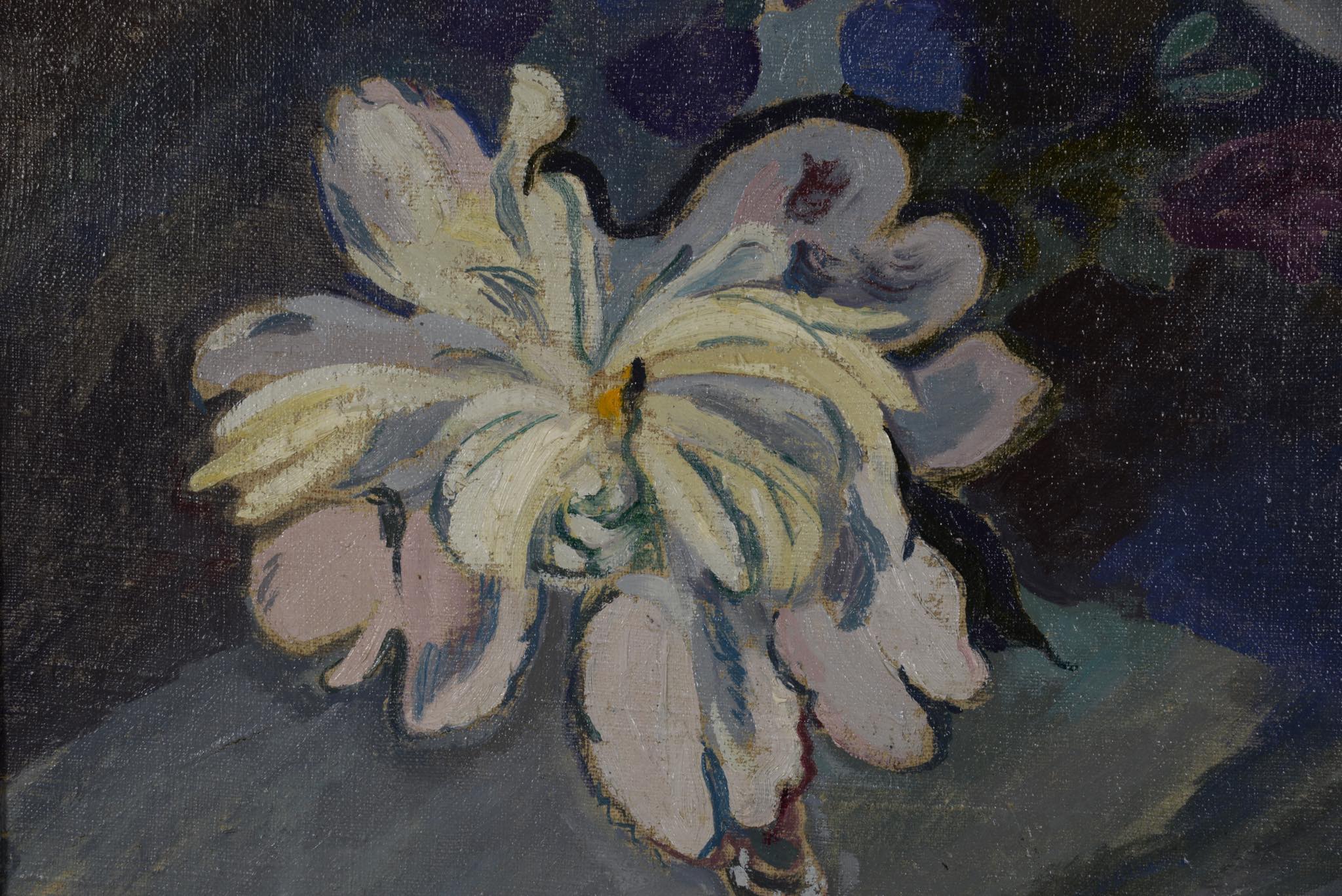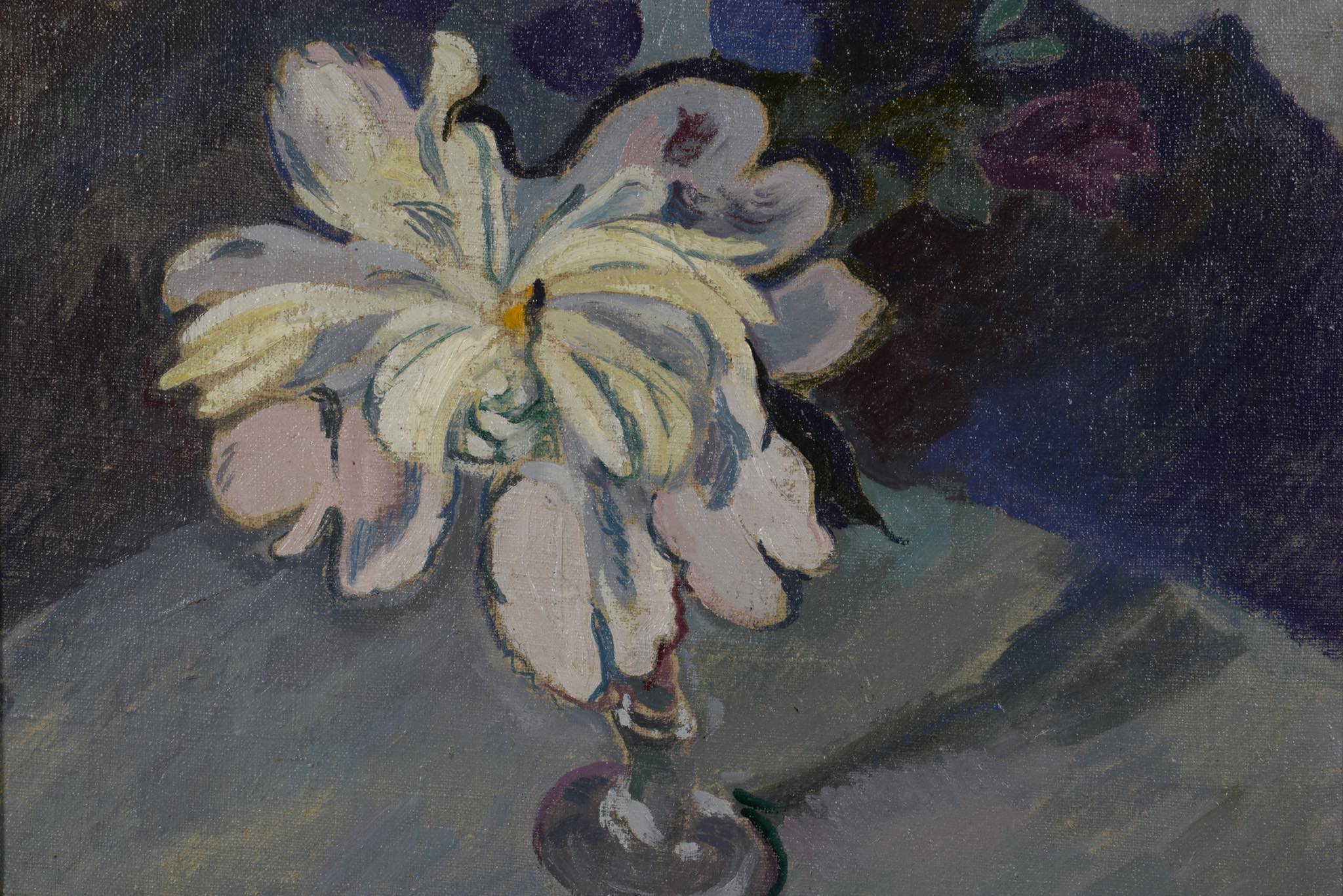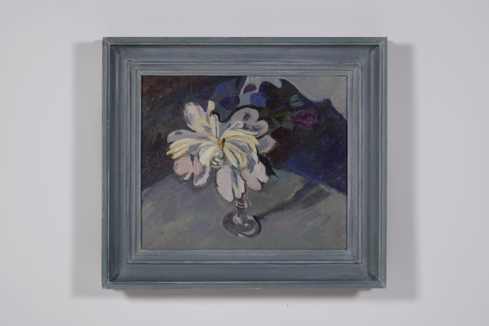 画家、作詞家、イラストレーターなど多彩な才能を持つデンマークのアーティスト、Mogens Lorentzen/モーエンス・ローレンツェンによる静物画油彩作品です。卓上に咲く一輪の花がやや強く、かつ、滑らかなタッチで描かれています。フレームの塗装面に経年による劣化が見られたため、専門職に依頼し塗装の復元を行いました。とてもきれいな状態です。1939年、モーエンスが47歳の頃、フィン・ユールによる応接家具を自宅用に購入。その後、最近まで家族によって長らく所有されていたその応接家具が幻の “The Elephant Furniture” であったことが判明し、2020年末に行われたデンマークのオークションに出品され、事実上フィン・ユールのヴィンテージ市場これまでの最高落札額を記録し話題を呼びました。